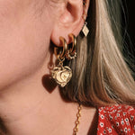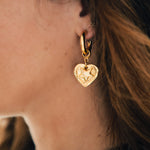 - 24k antique gold plated two sided heart charms etched with stars and moons hang from gold plated hoops on stainless steel hypoallergenic posts