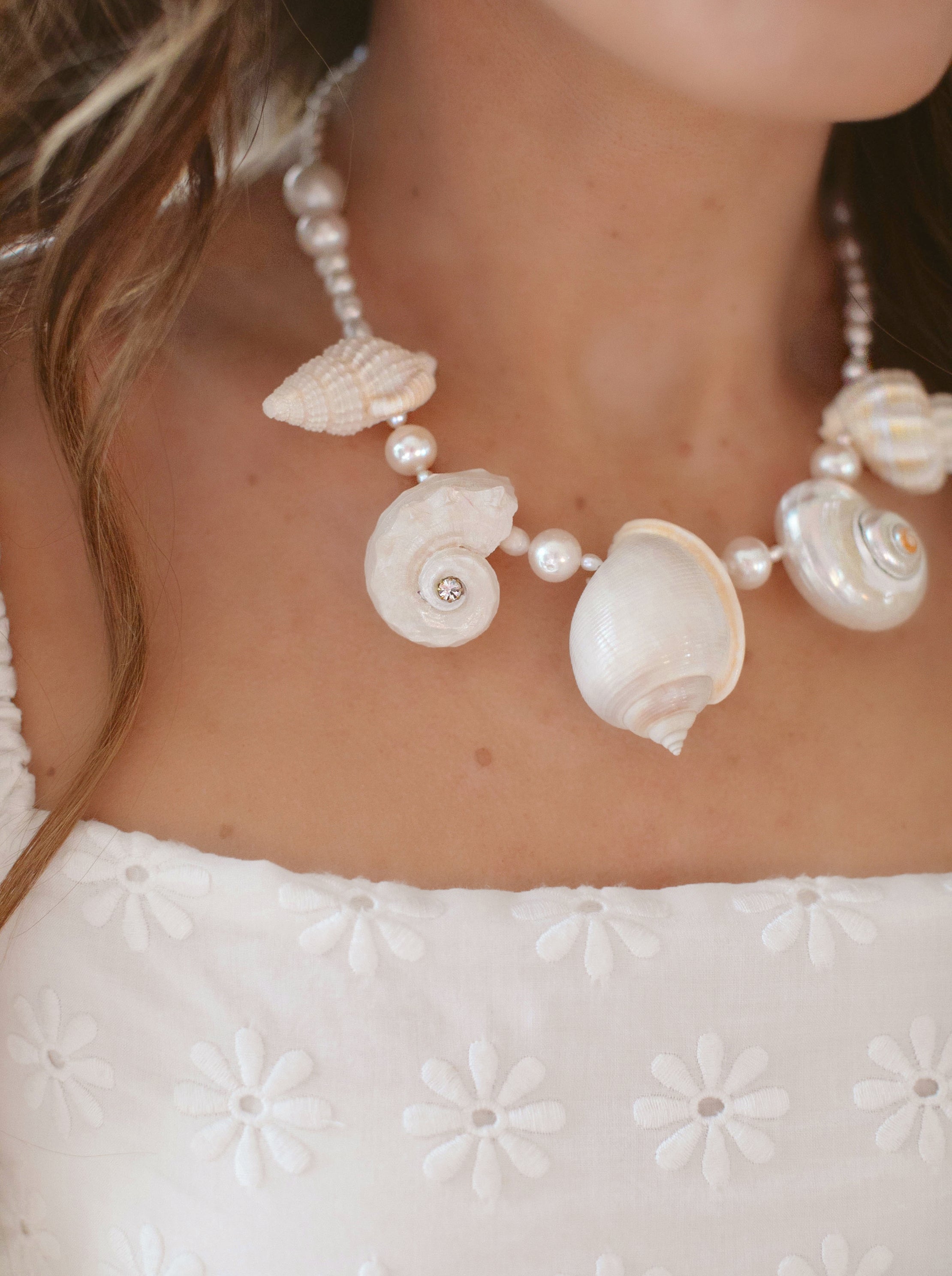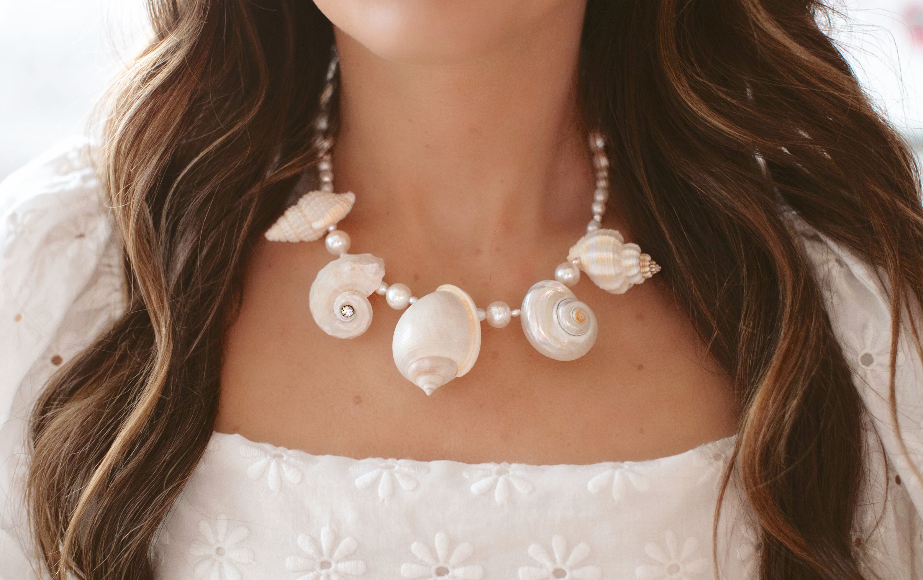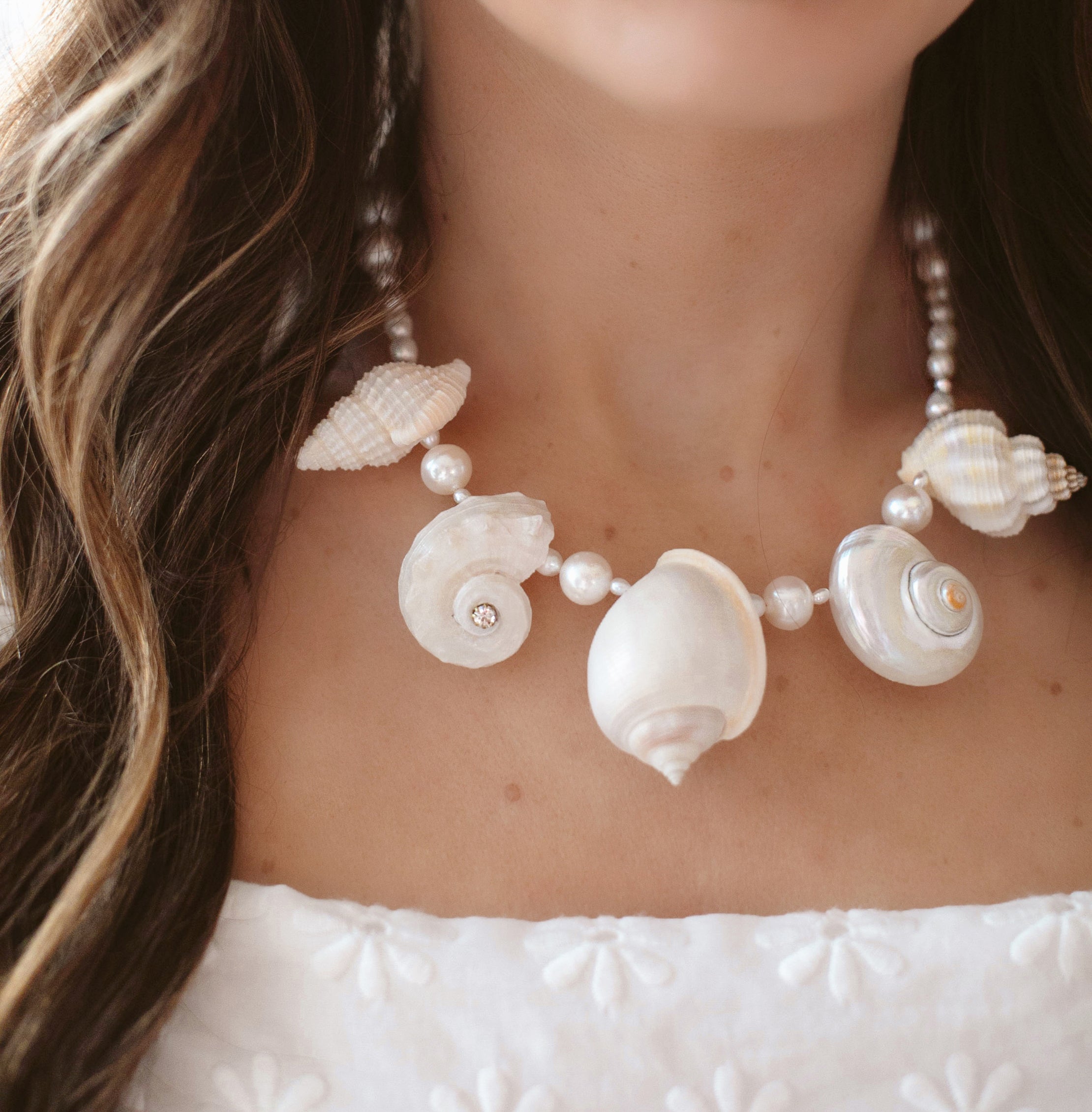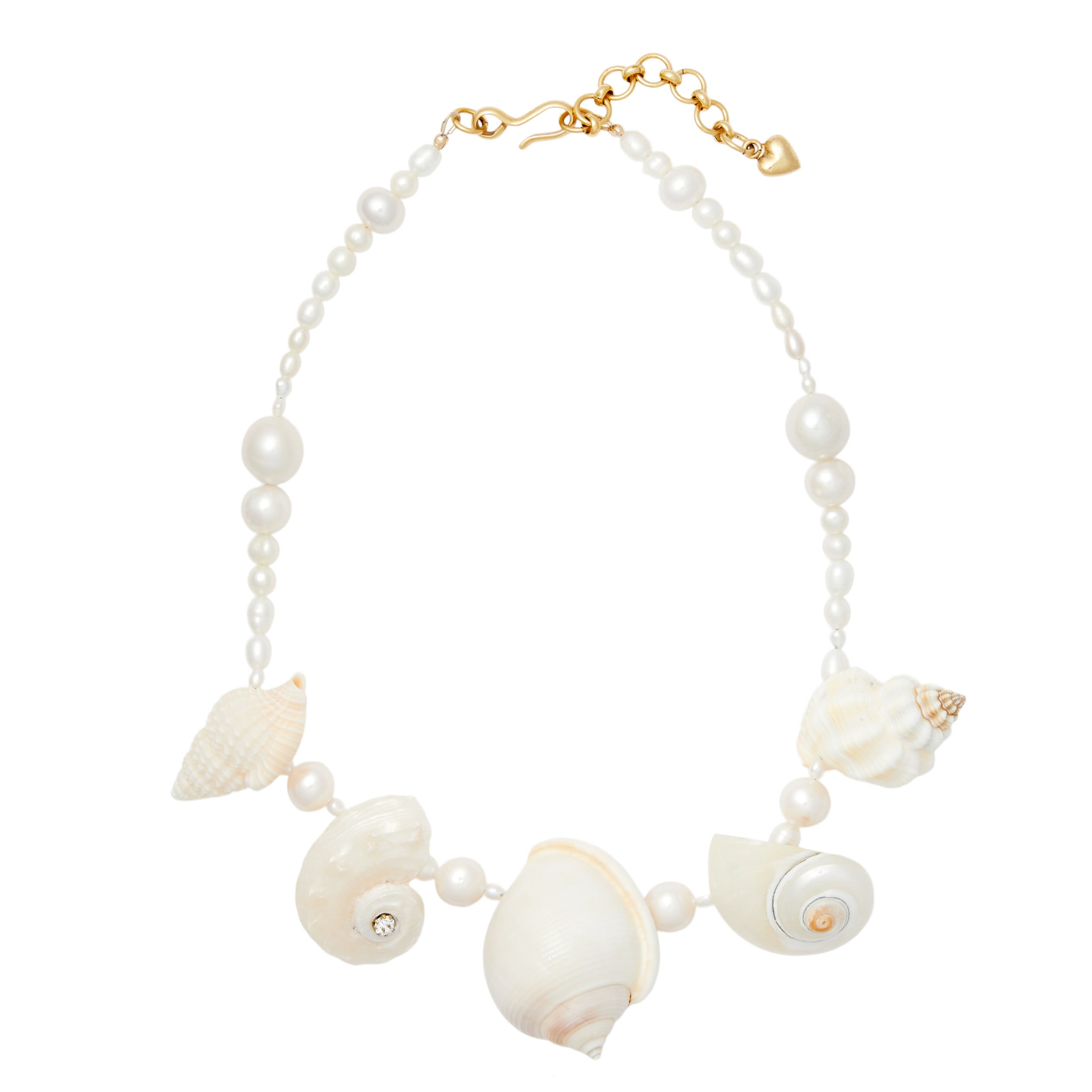 - An assortment of natural shells - one is adorned with a Swarovski crystal - hang from a strand of freshwater pearls