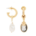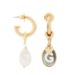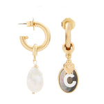 - A Mother of Pearl letter charm, 24k antique gold plated brass heart charm and a 2-sided black lip shell cabochon charm hang from a 24k antique gold plated brass hoop on stainless steel hypoallergenic posts