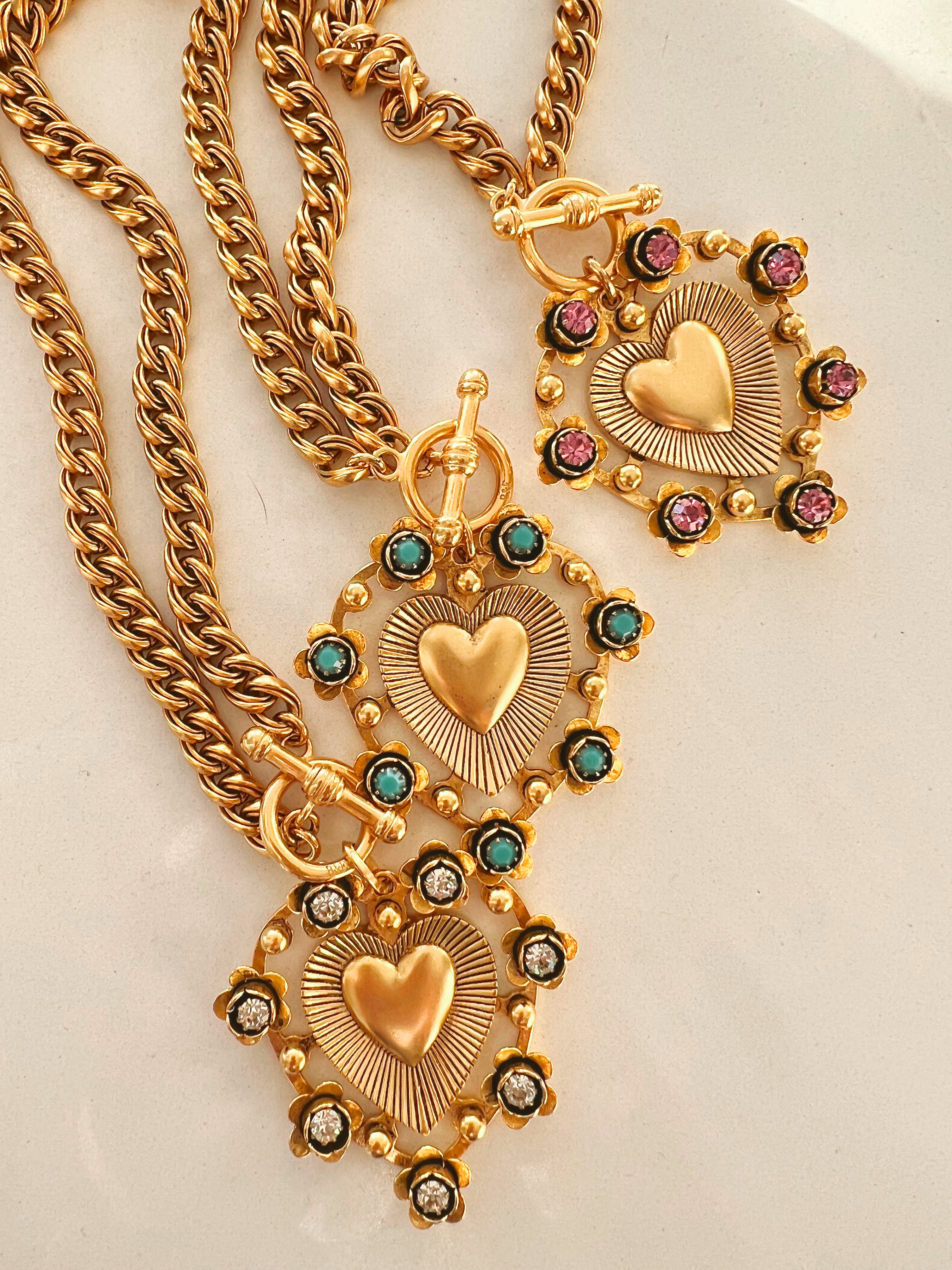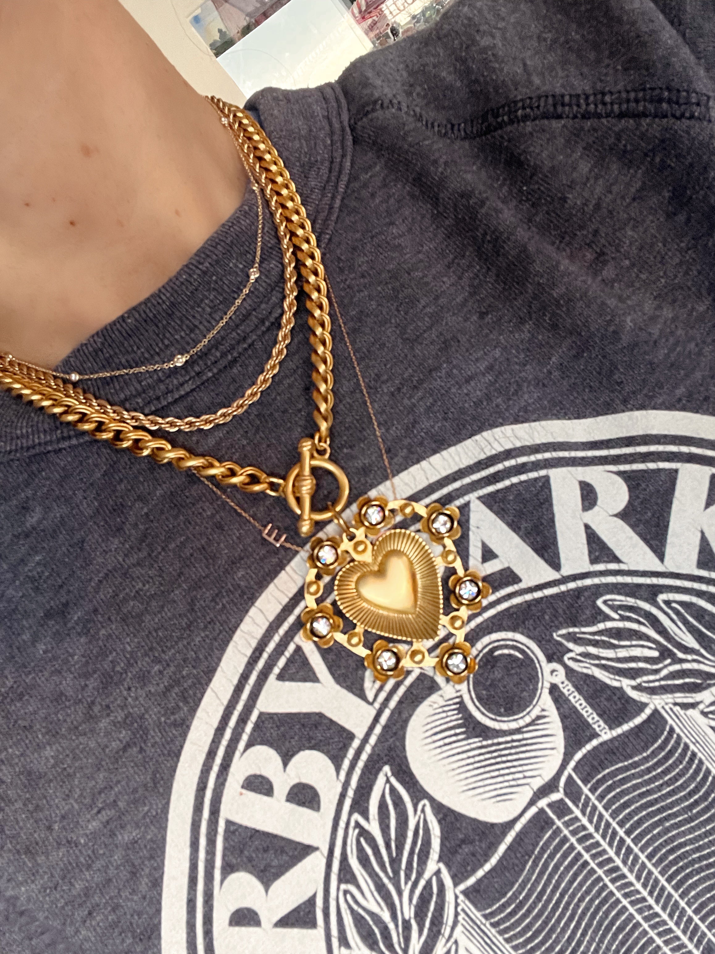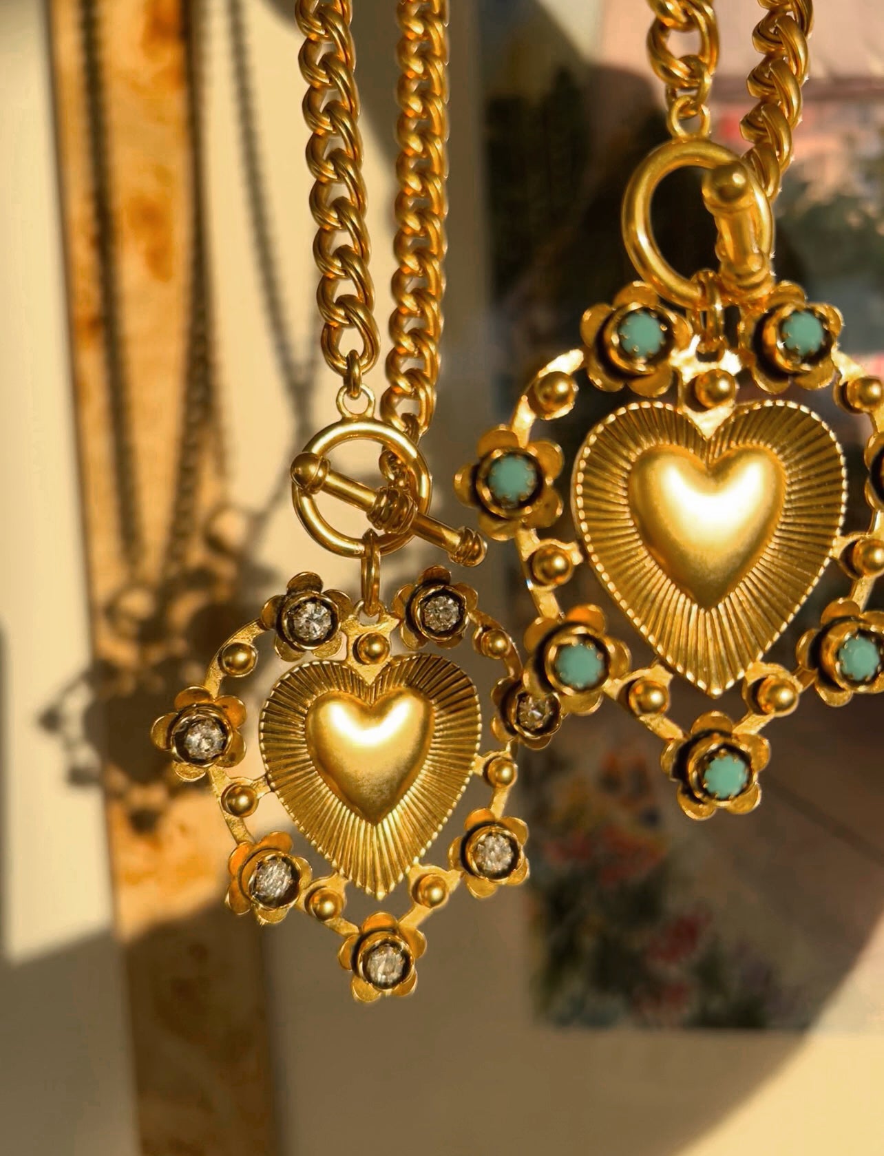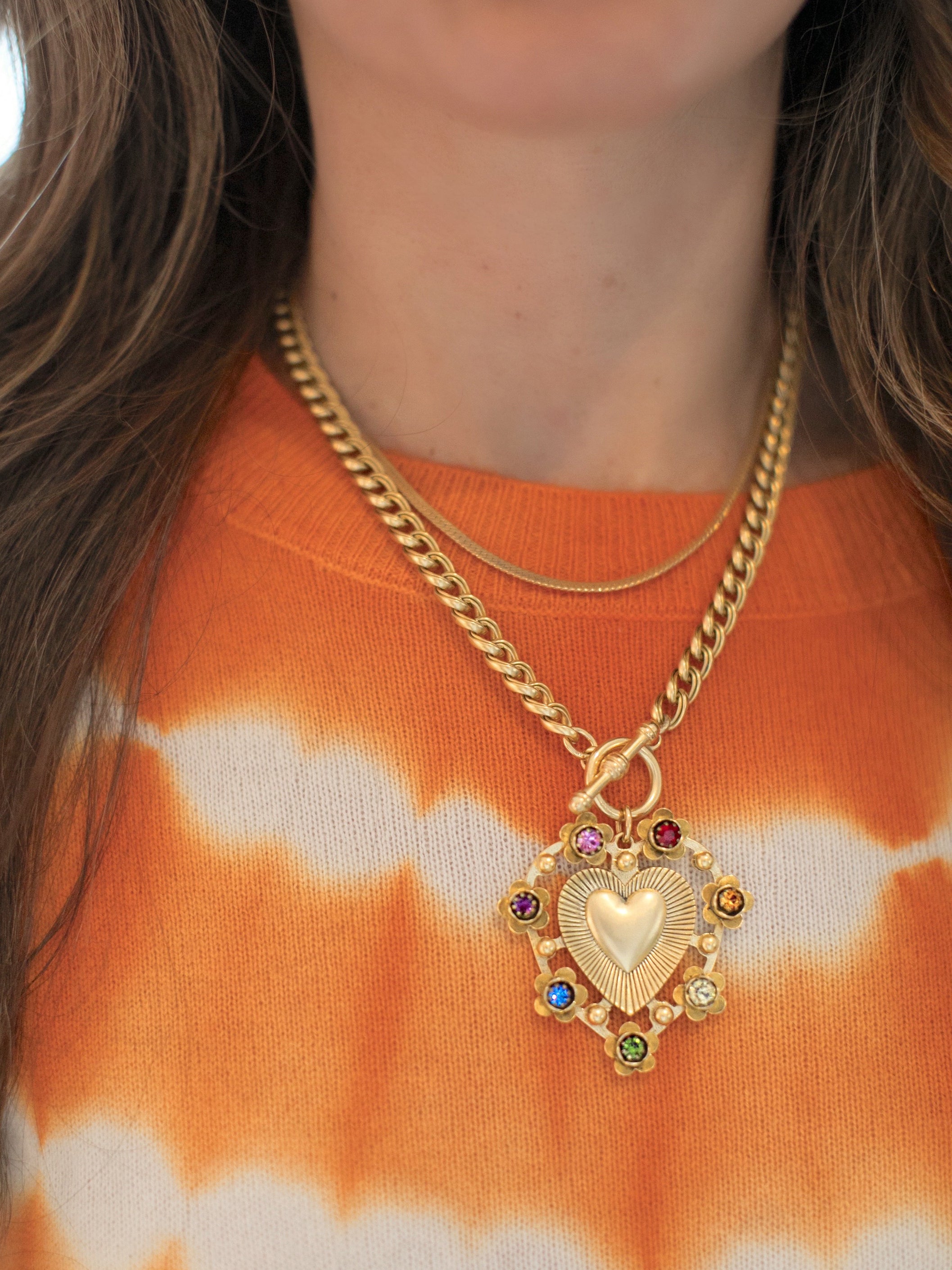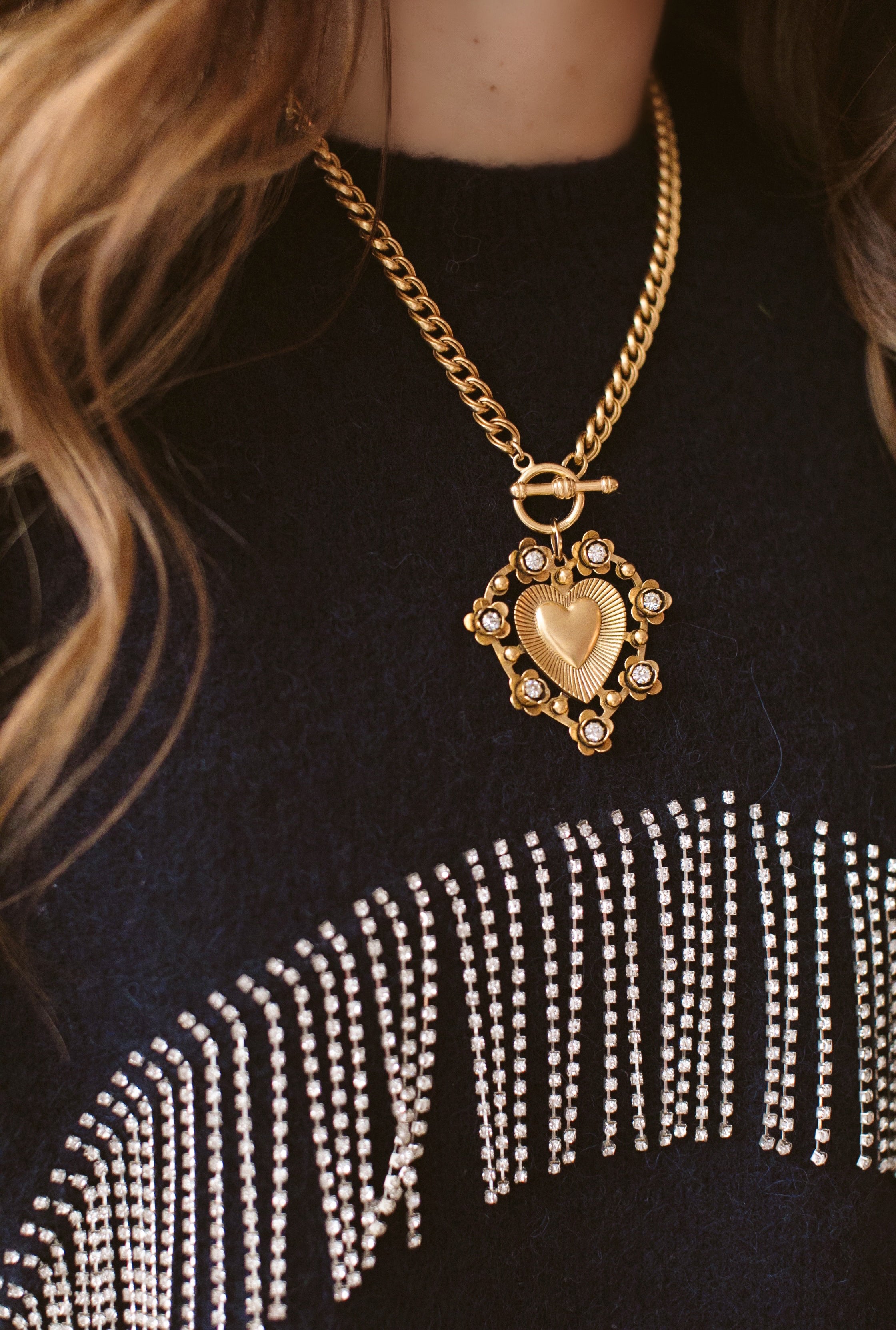 - 24k antique gold plated chunky link chain with a gold plated heart medallion set with crystals.