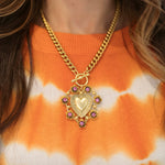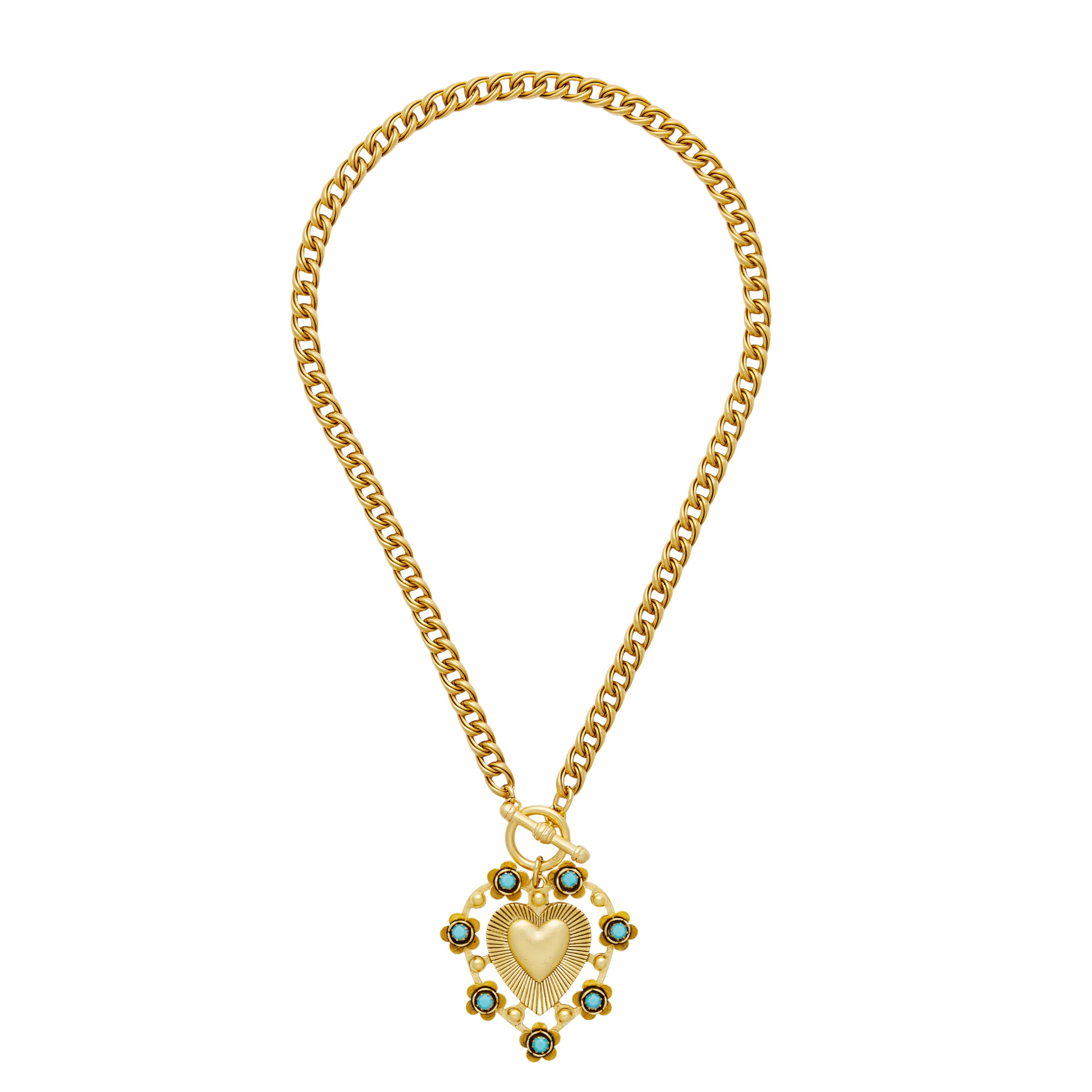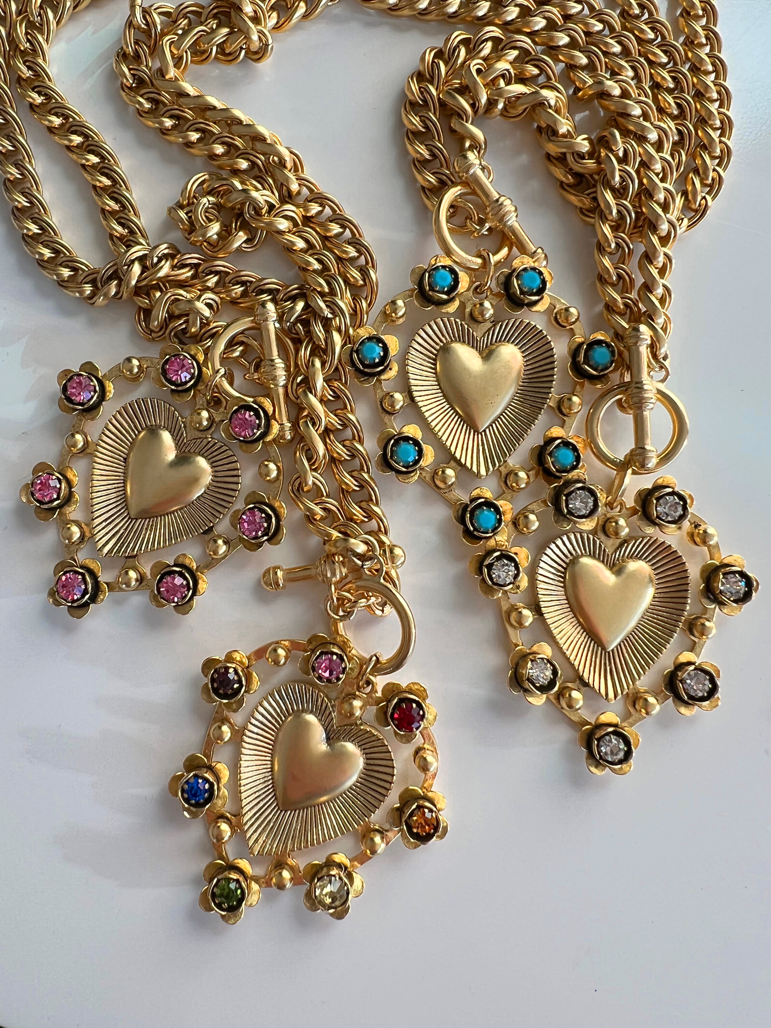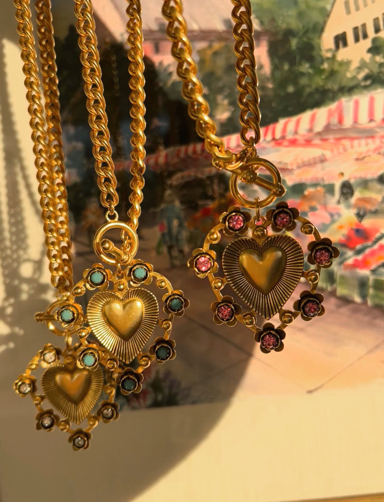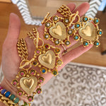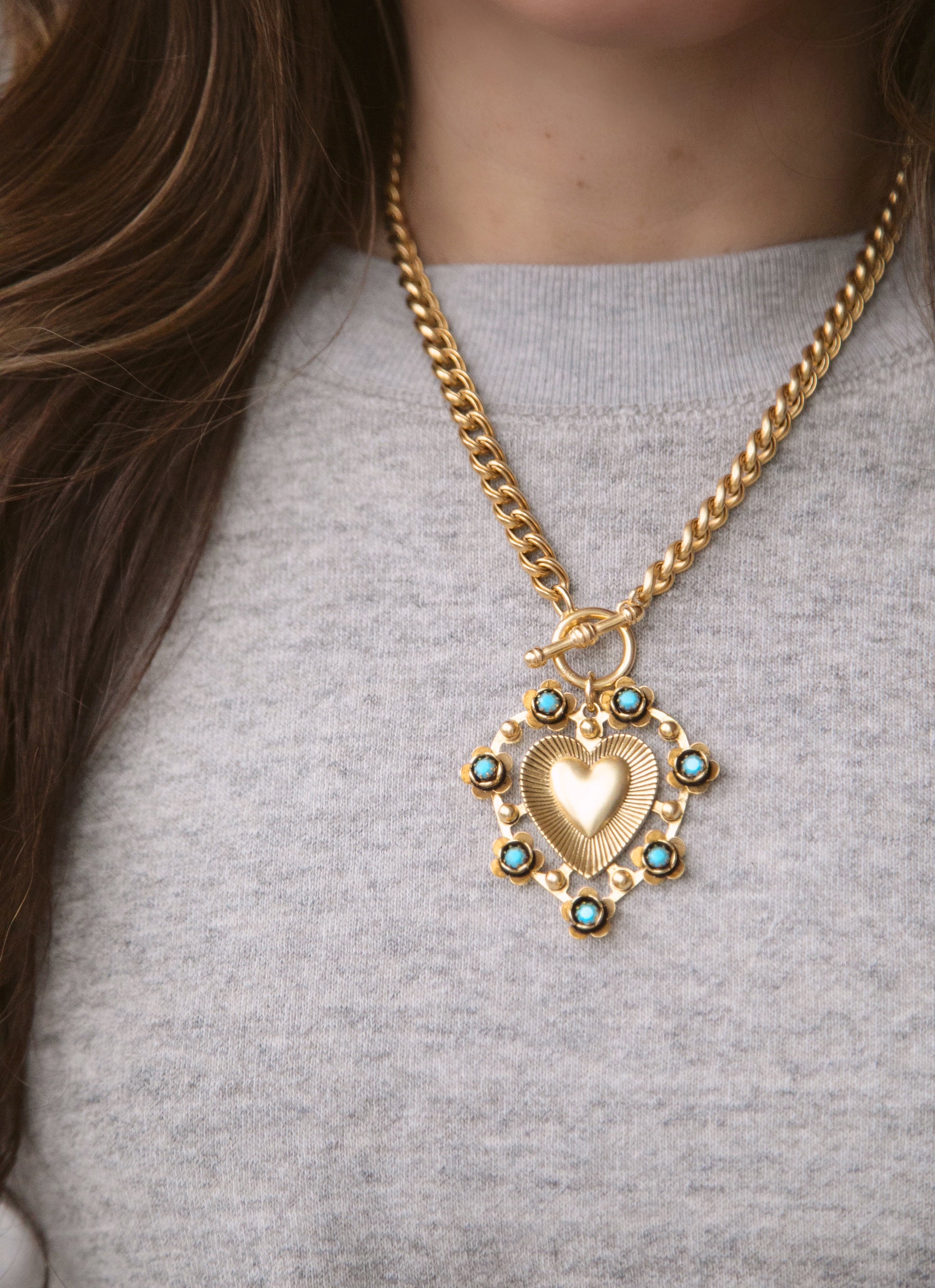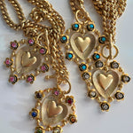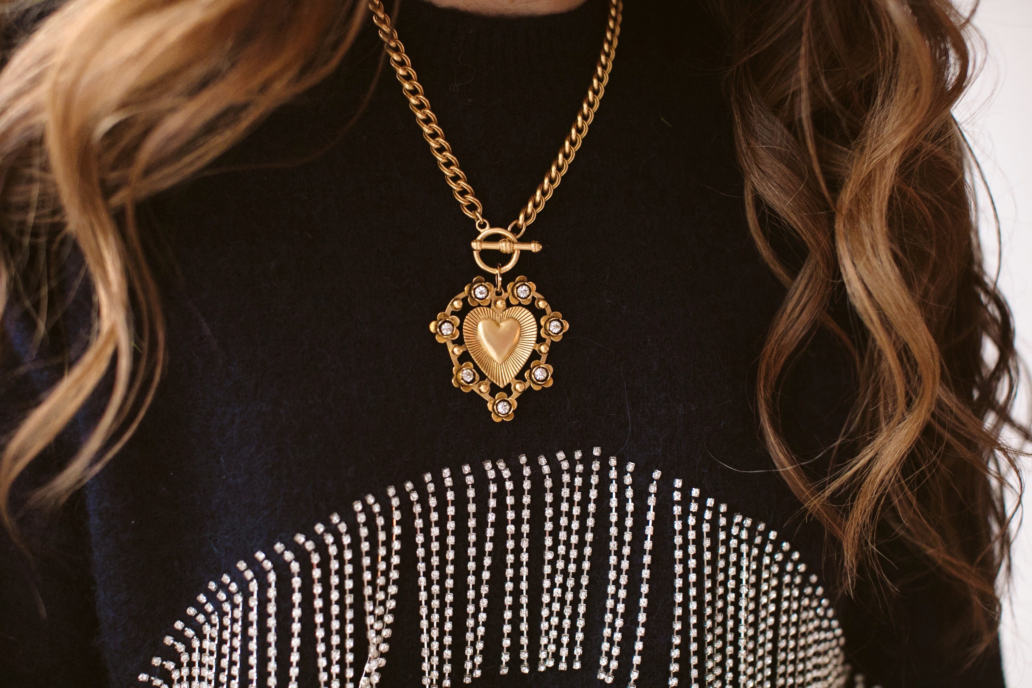 - 24k antique gold plated chunky link chain with a gold plated heart medallion set with crystals.