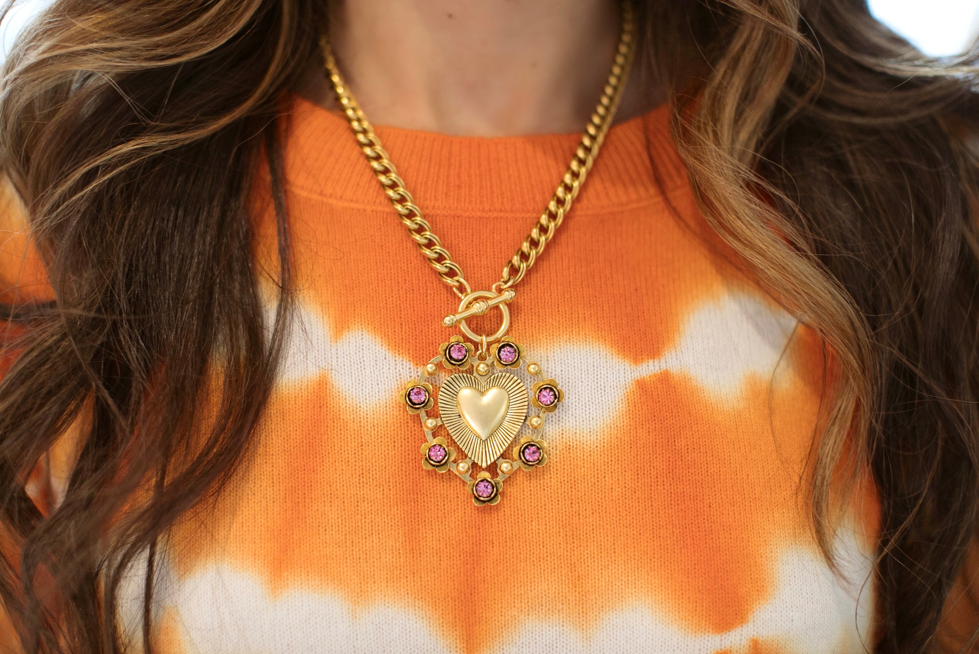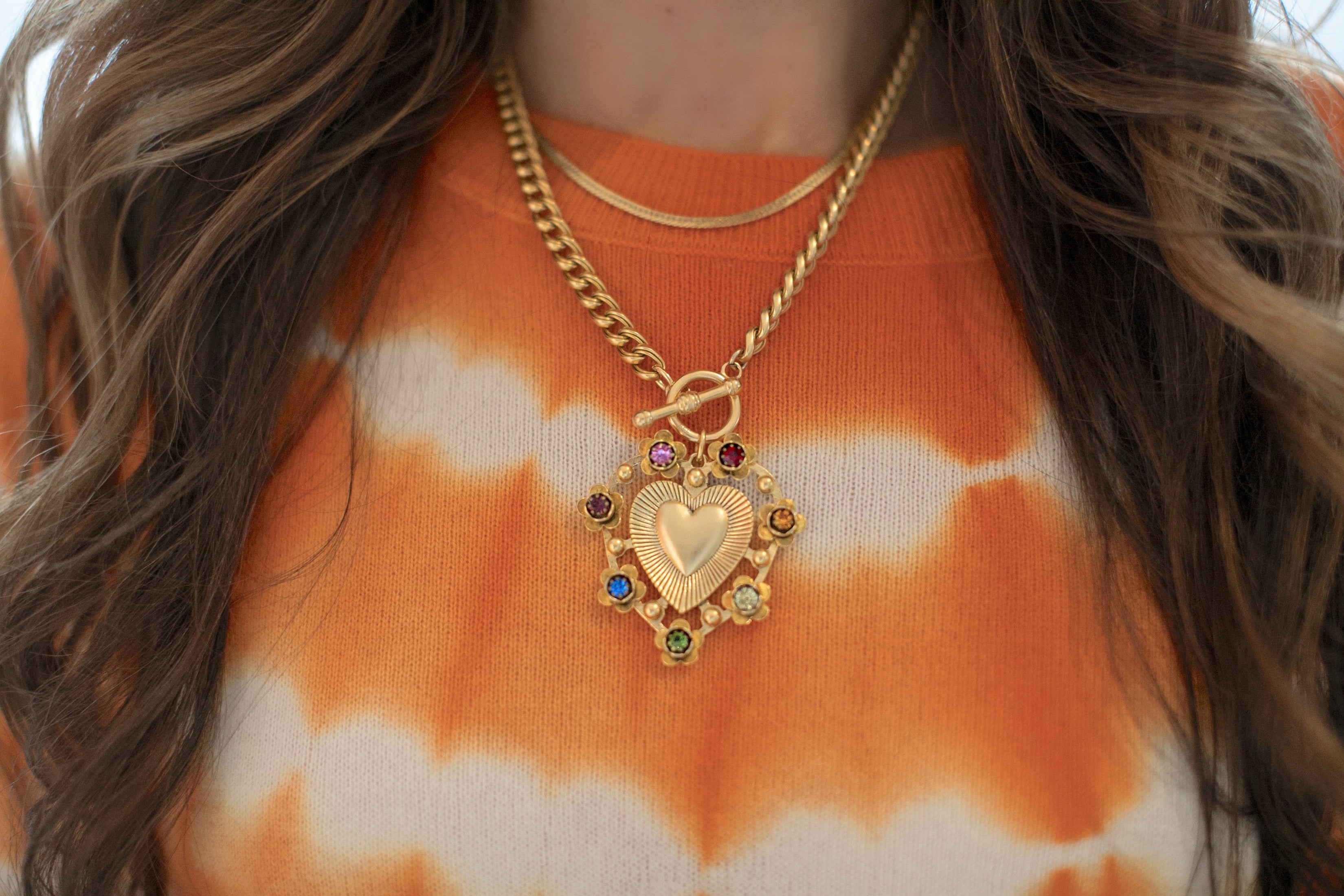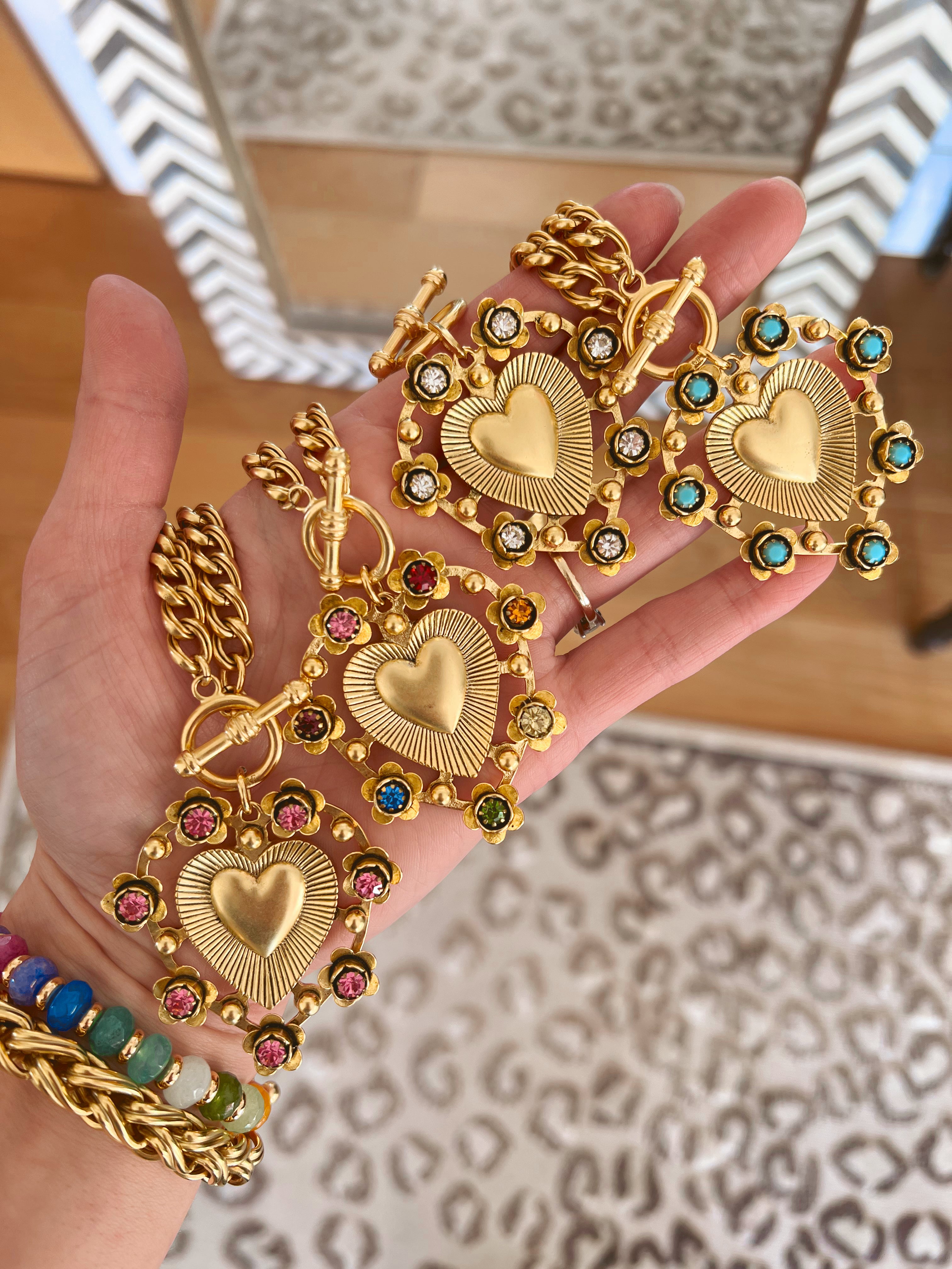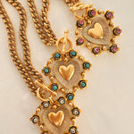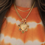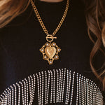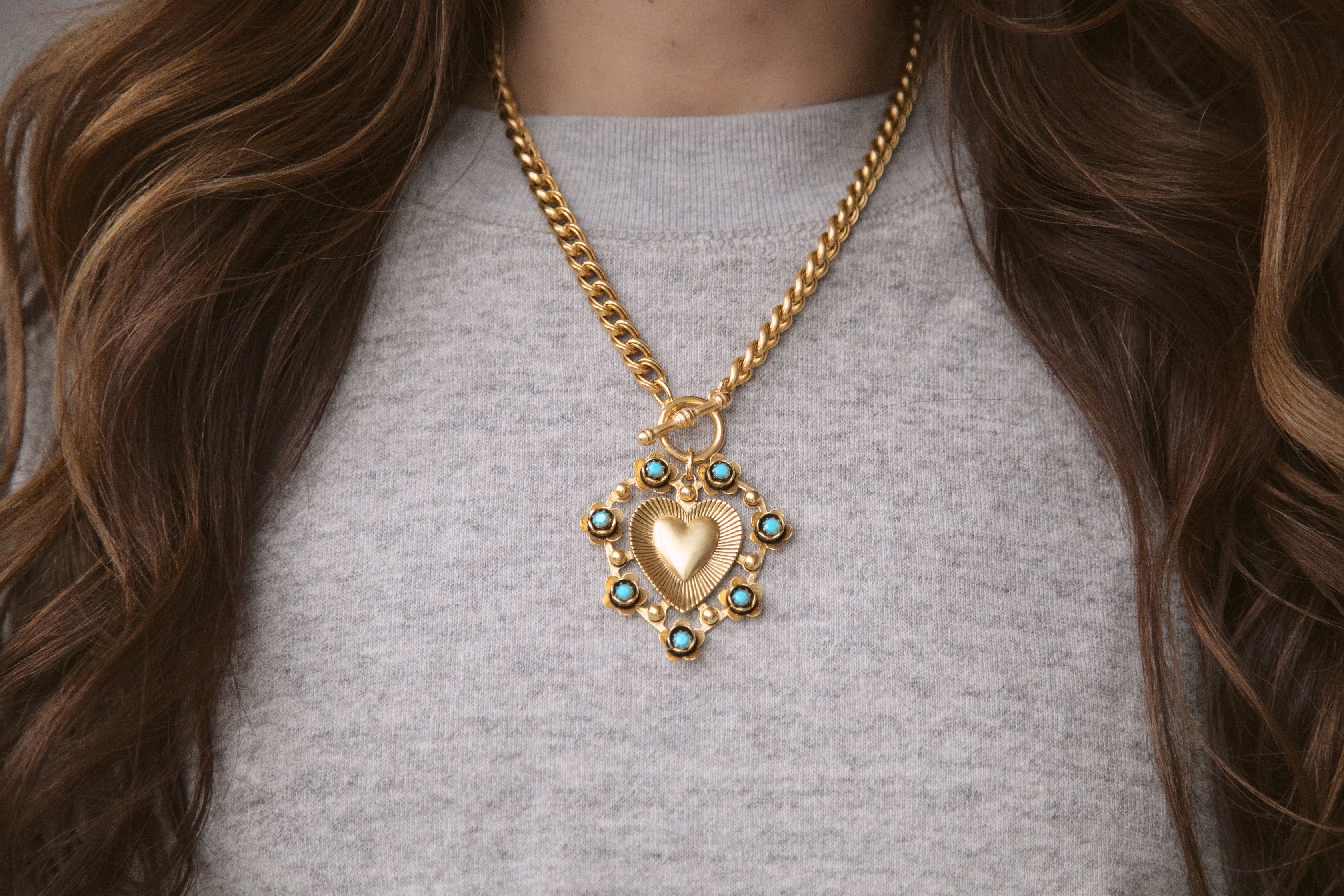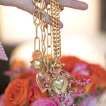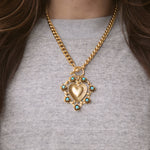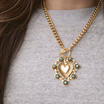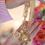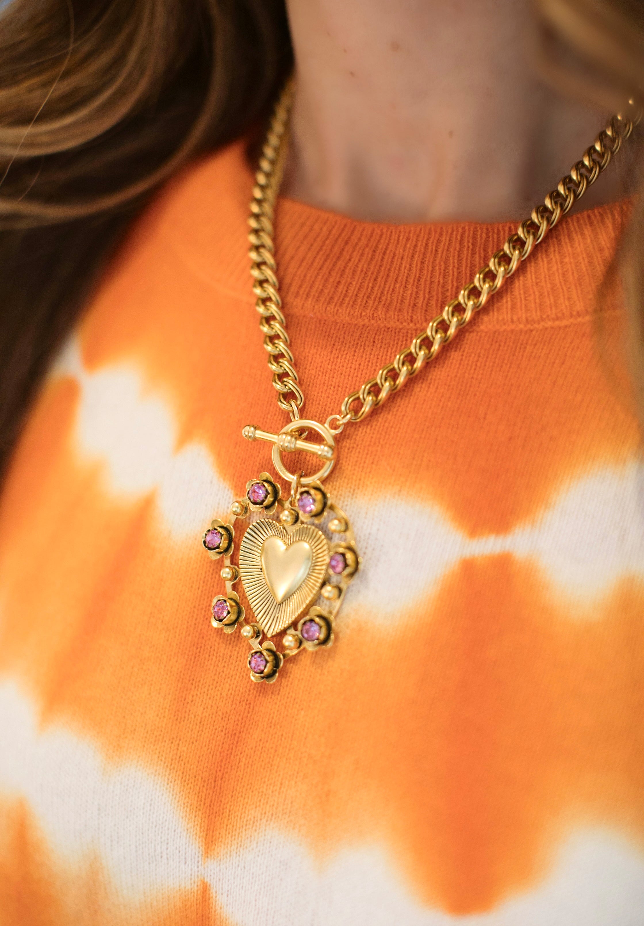- 24k antique gold plated chunky link chain with a gold plated heart medallion set with crystals.