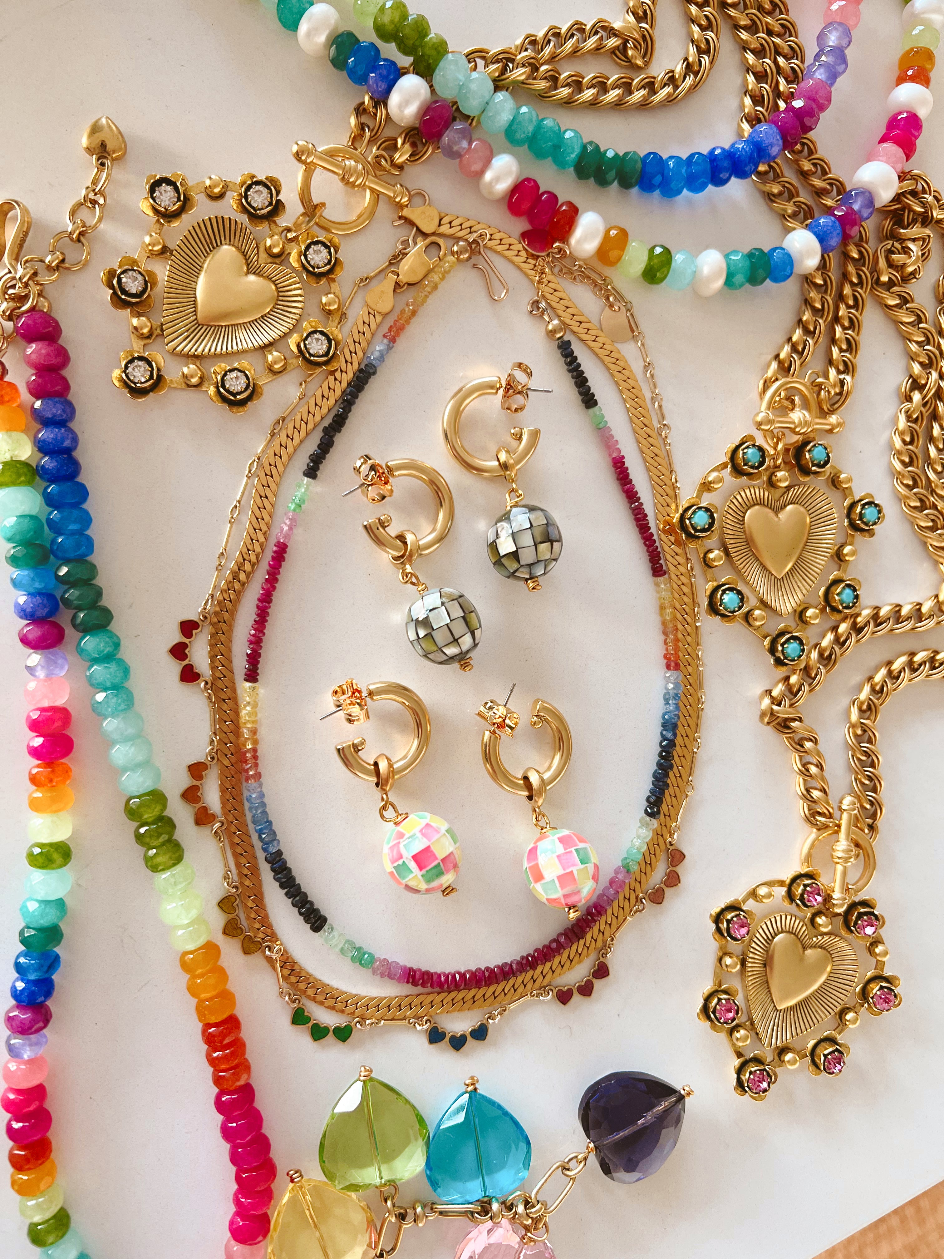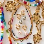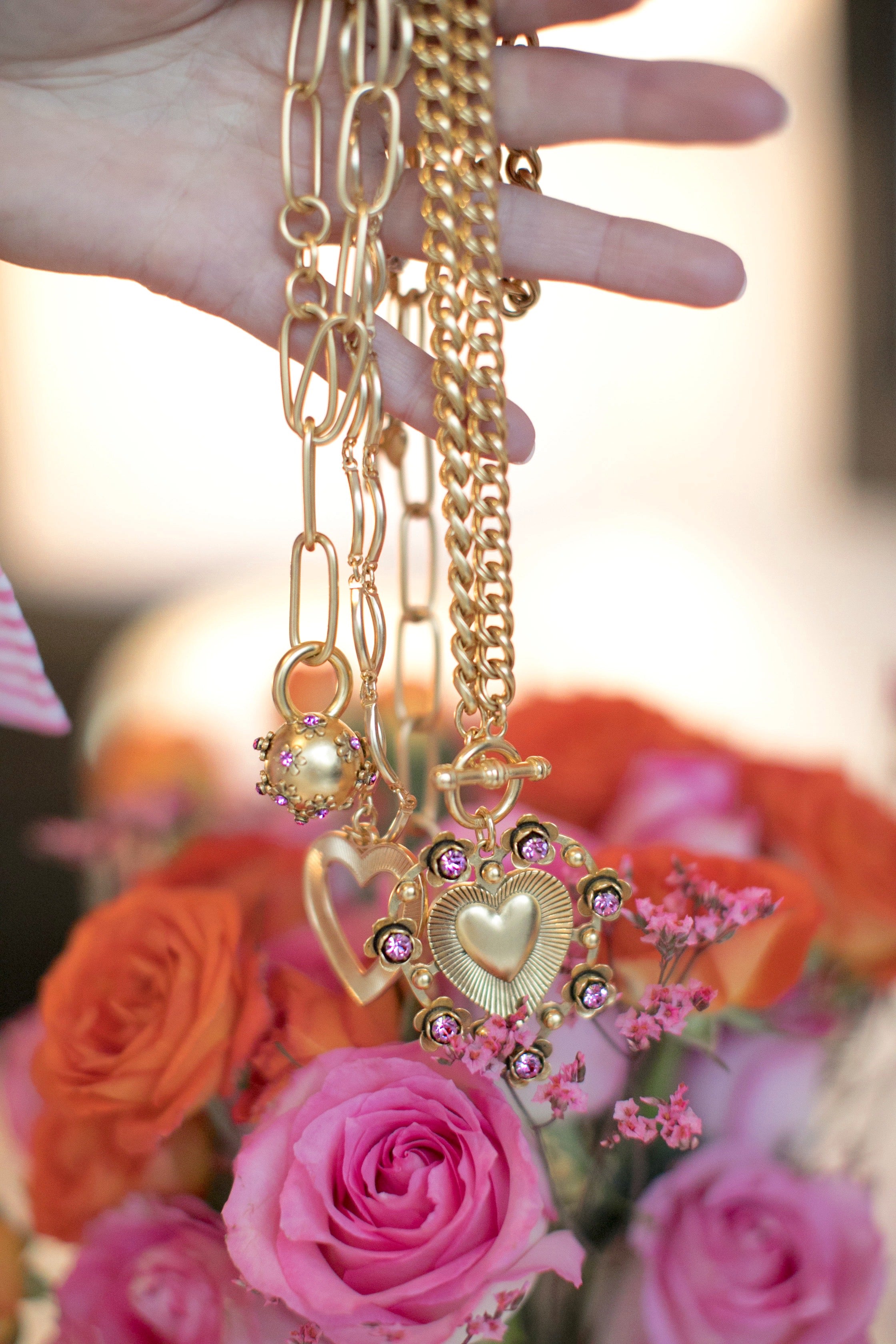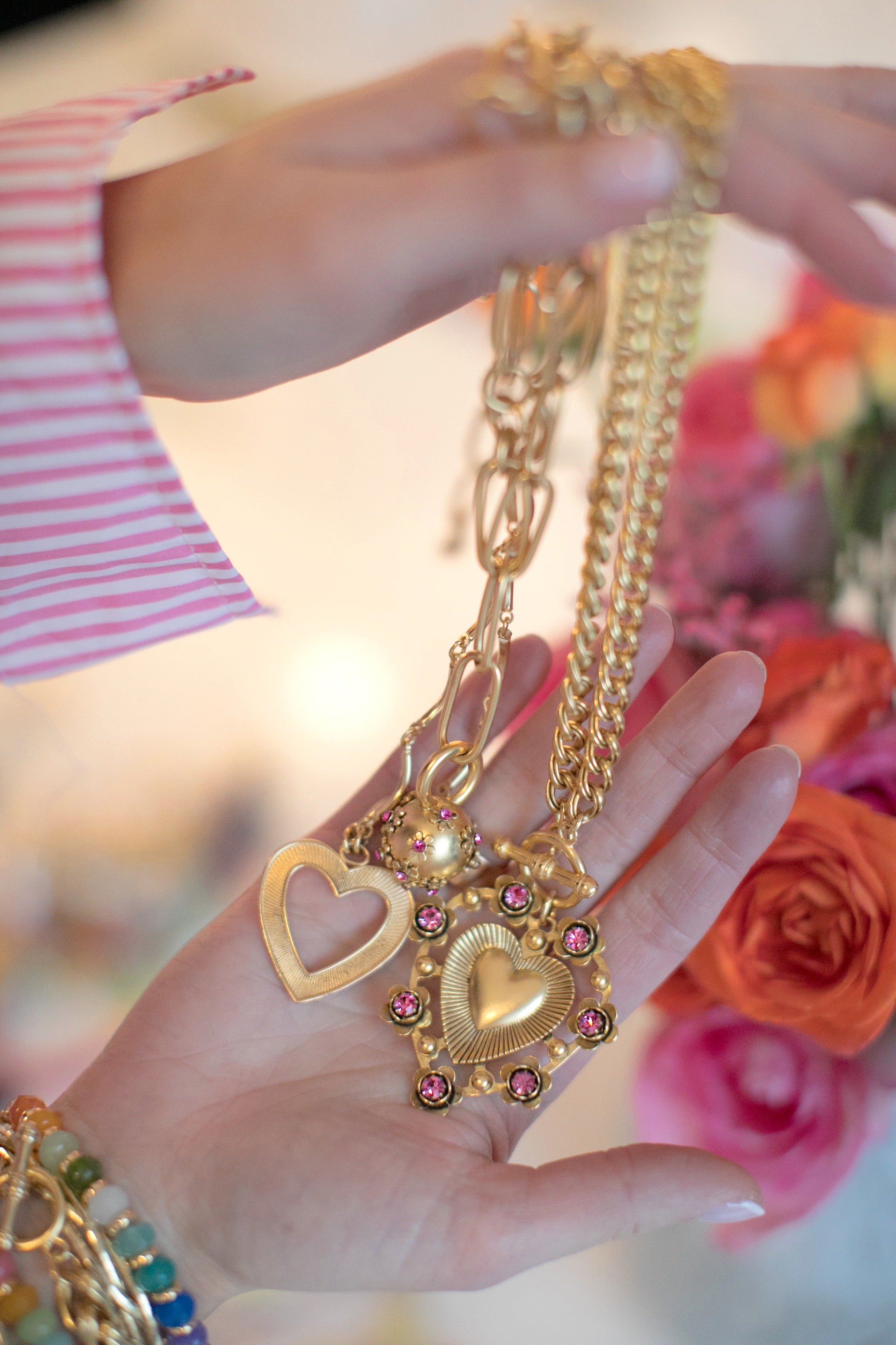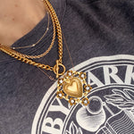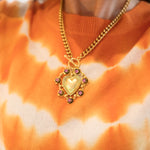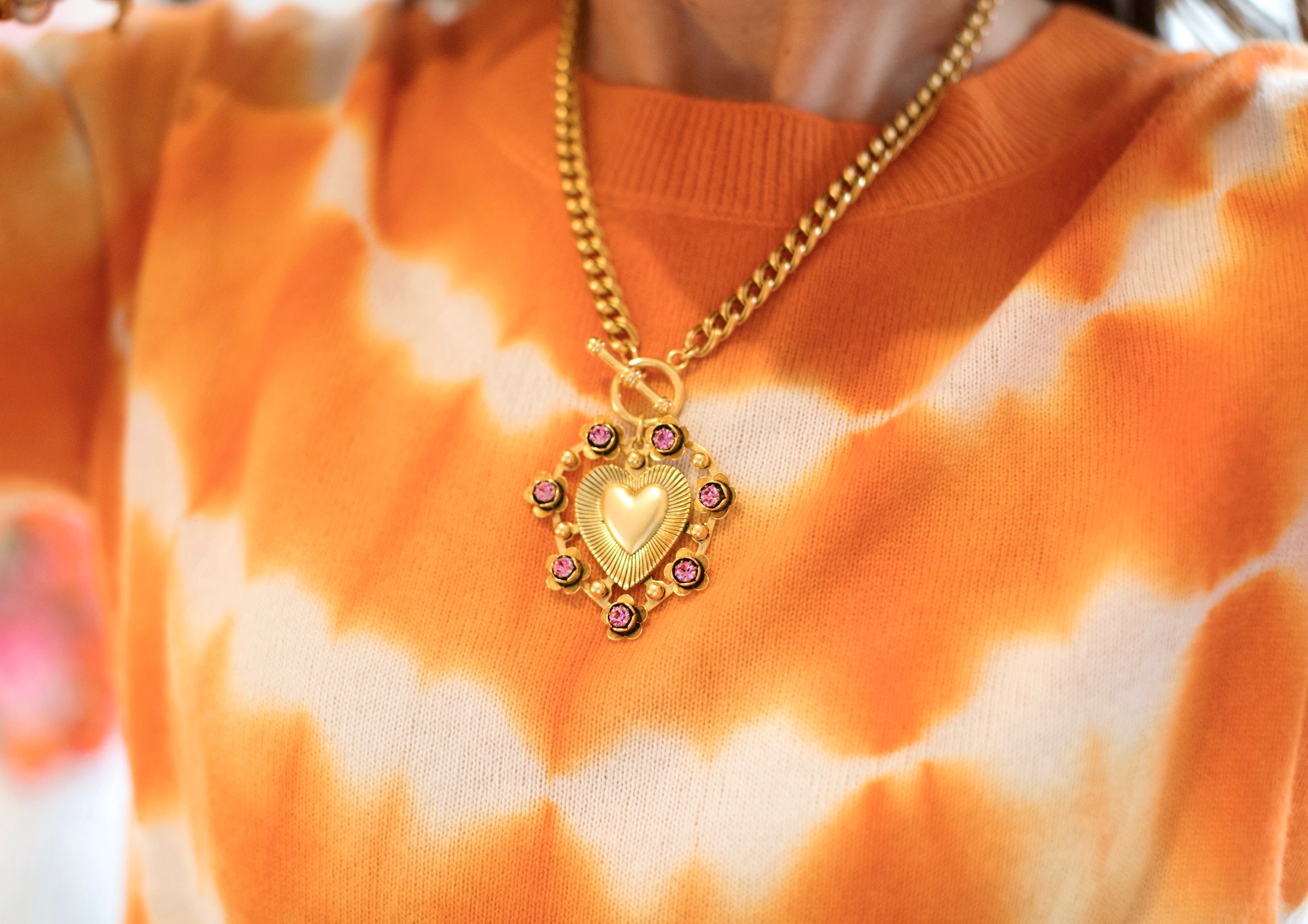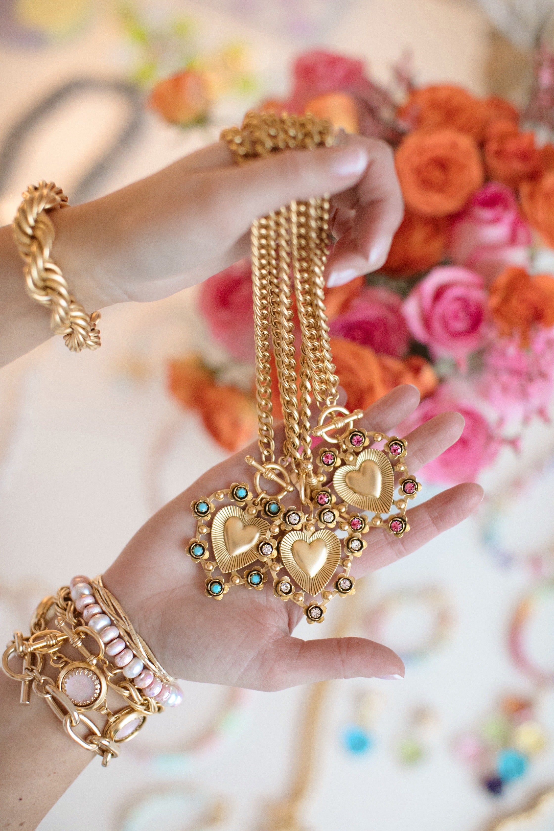 - 24k antique gold plated chunky link chain with a gold plated heart medallion set with crystals.