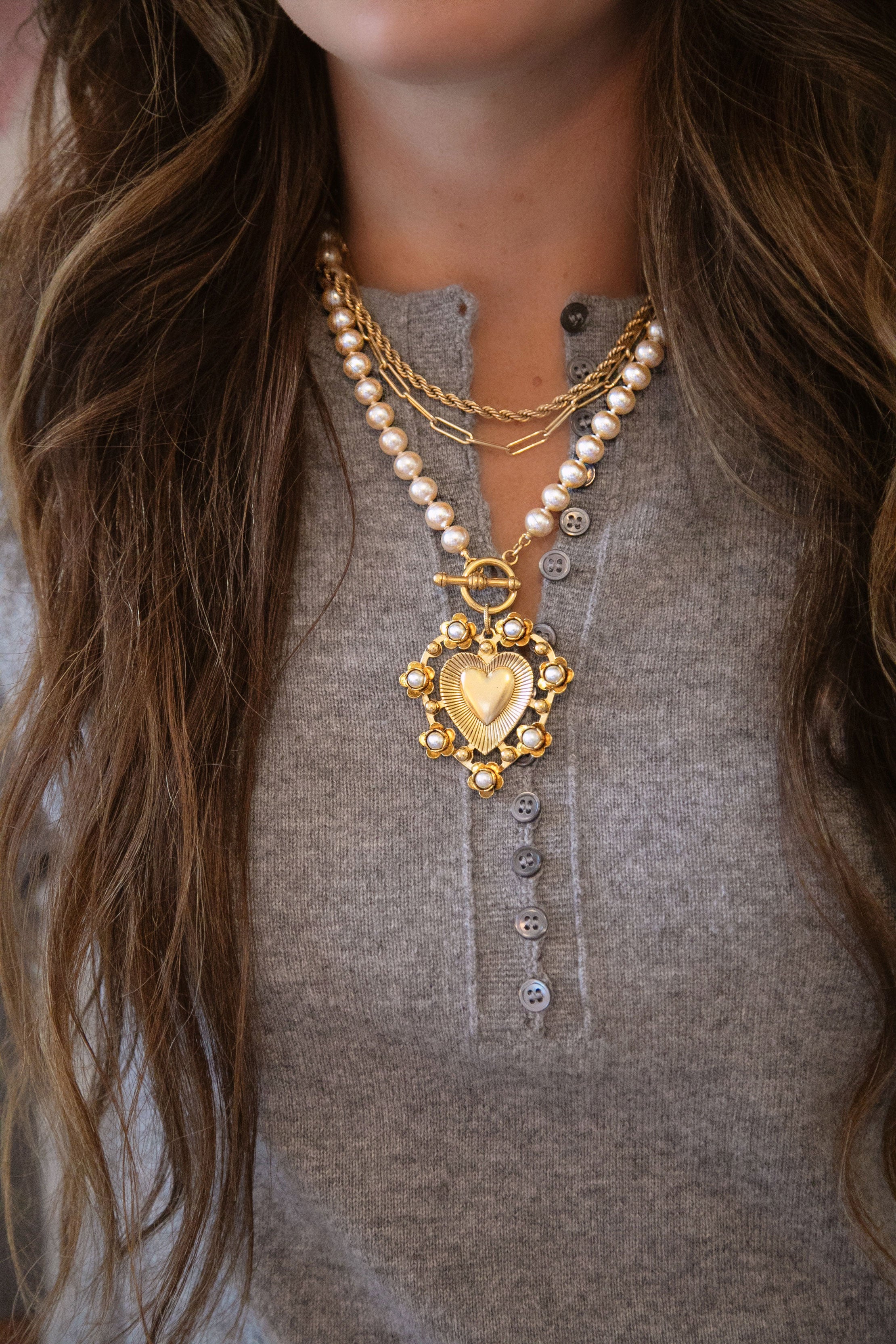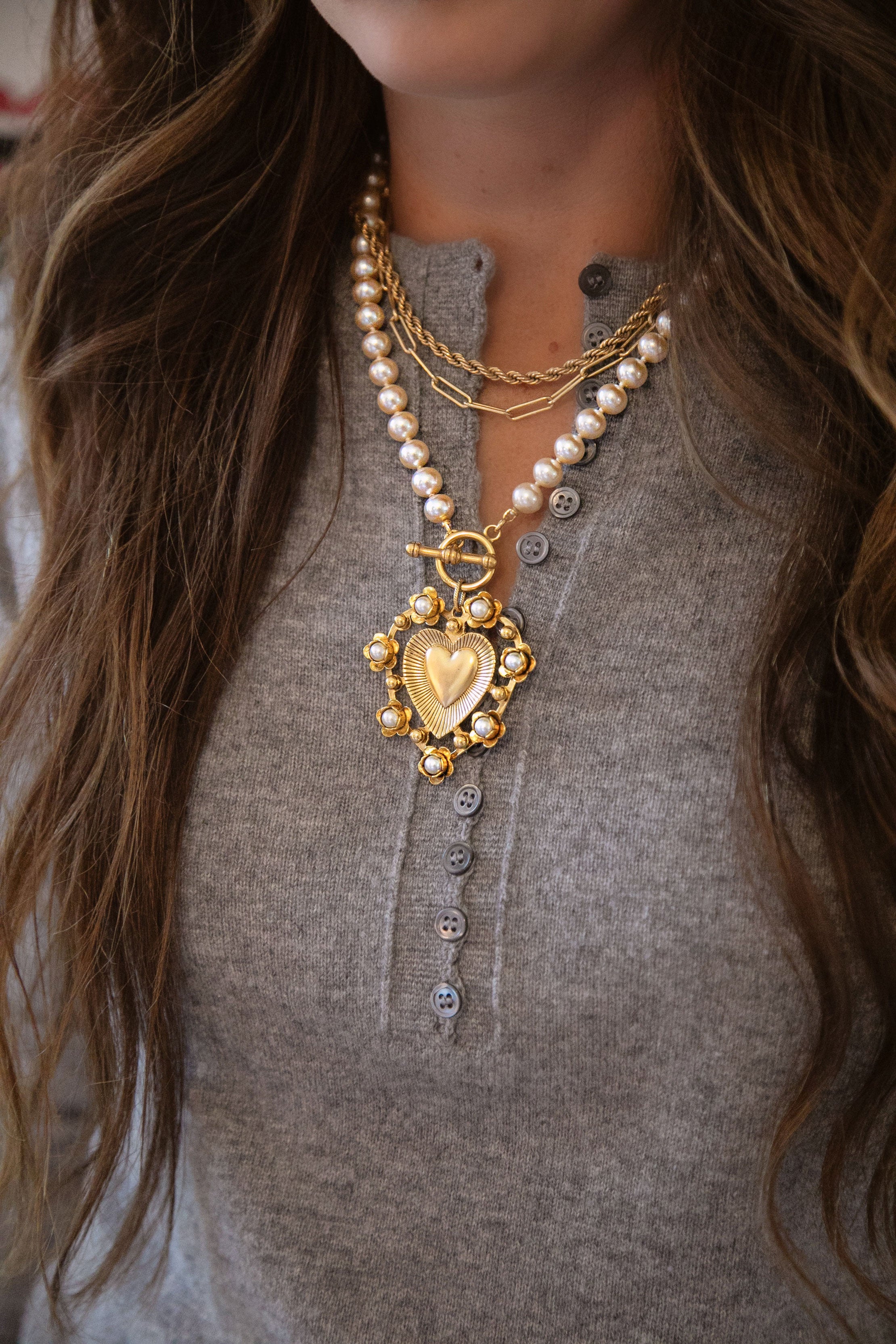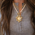 - A strand of knotted glass pearls with a gold plated heart medallion set with freshwater pearls