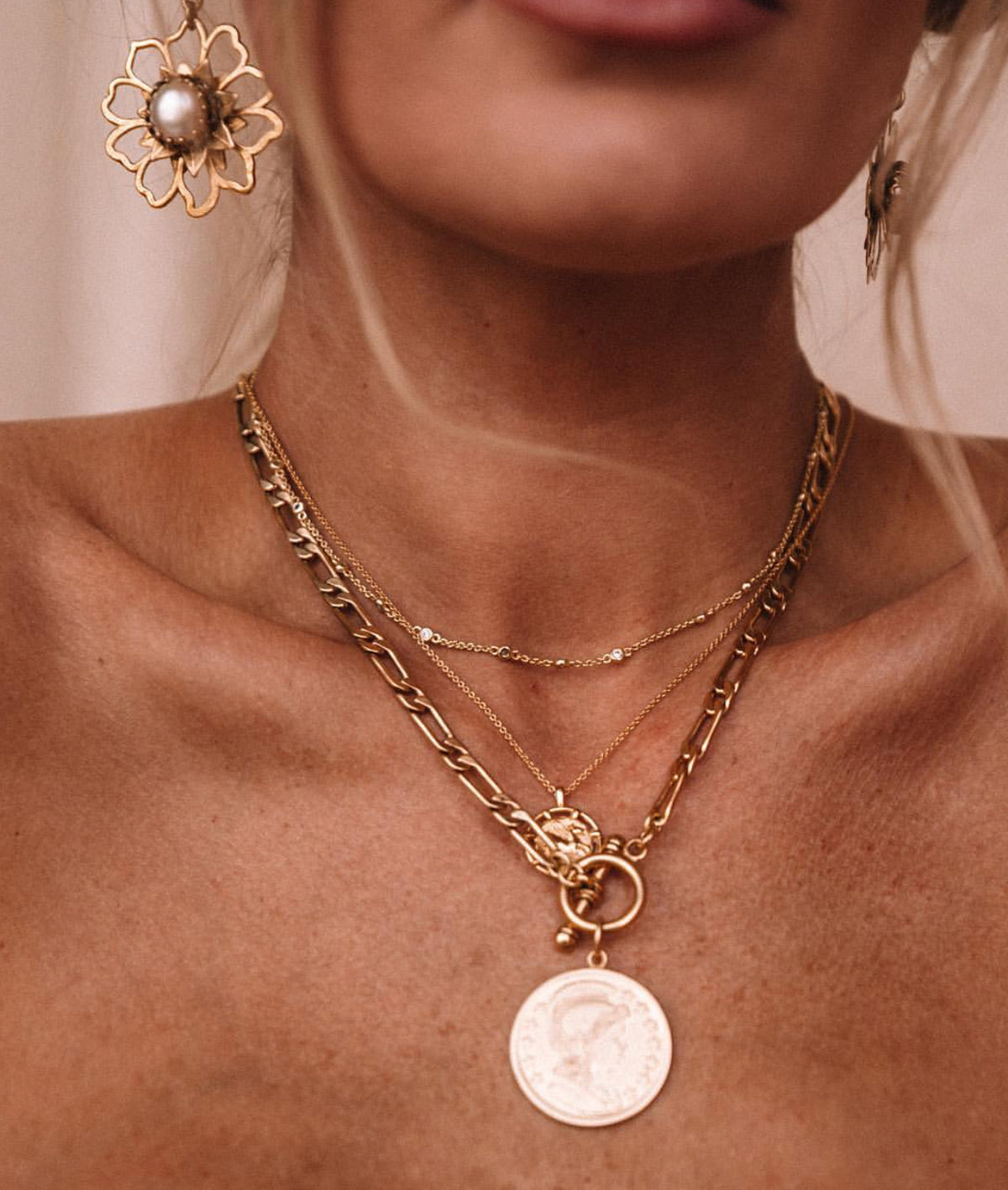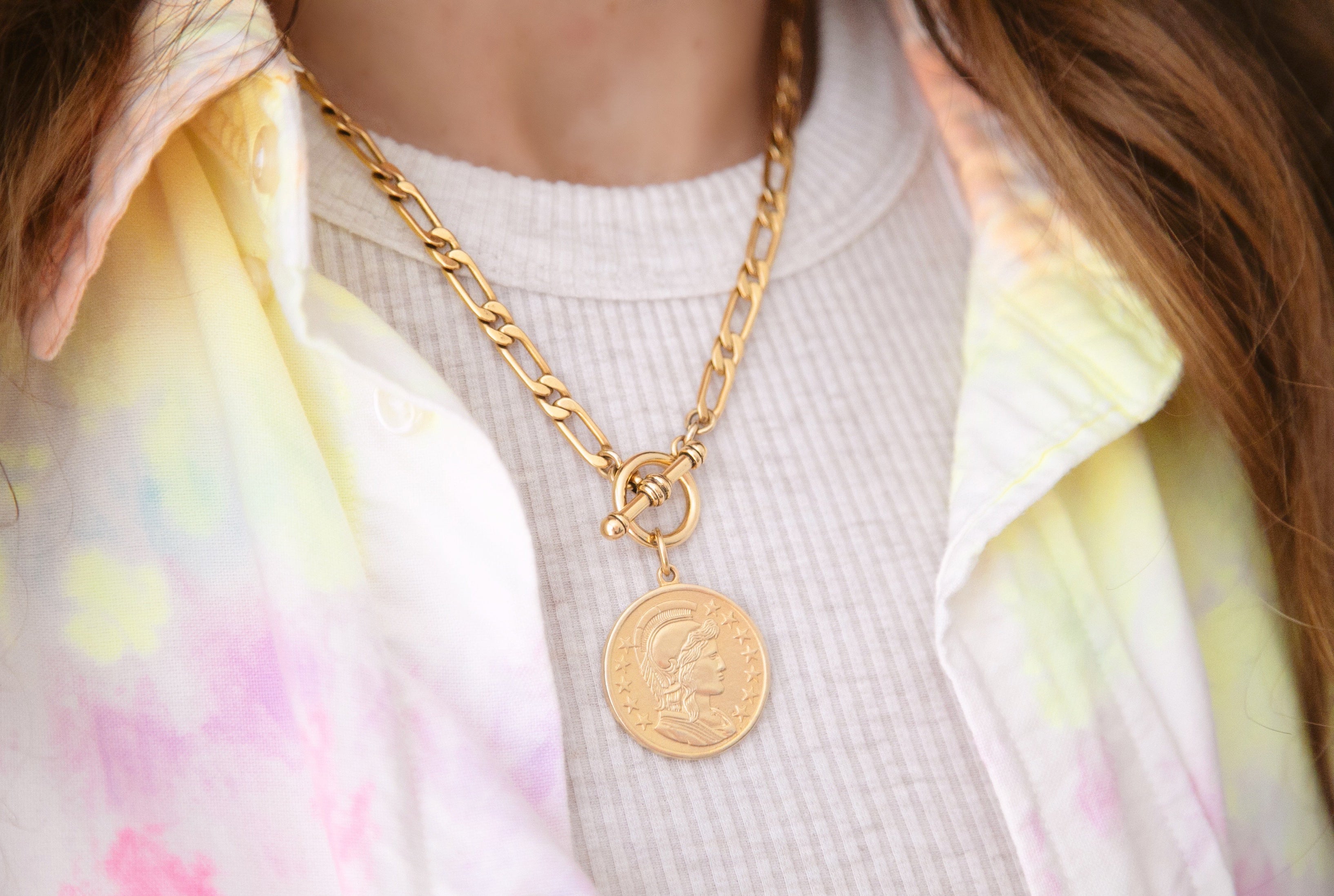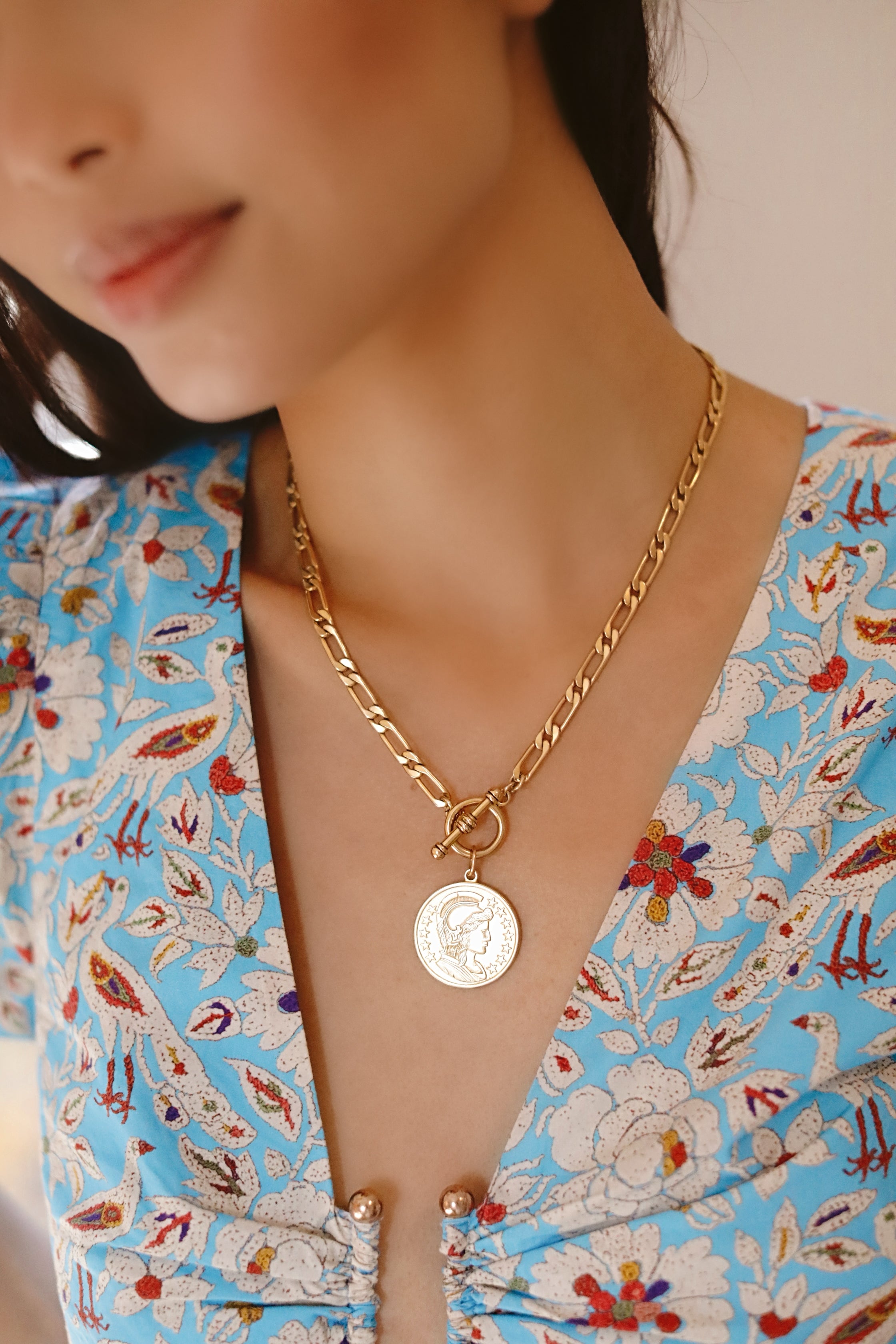 - 24k antique gold plated Figaro Chain adorned with a coin