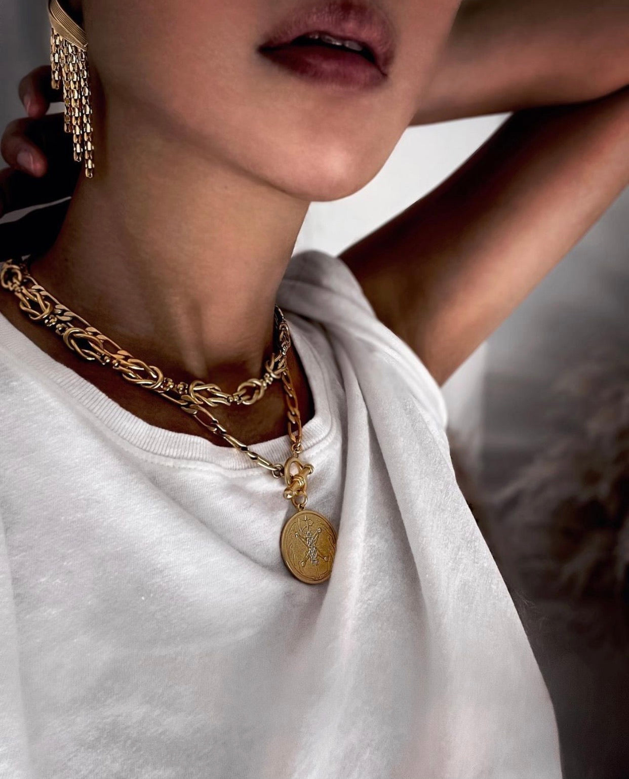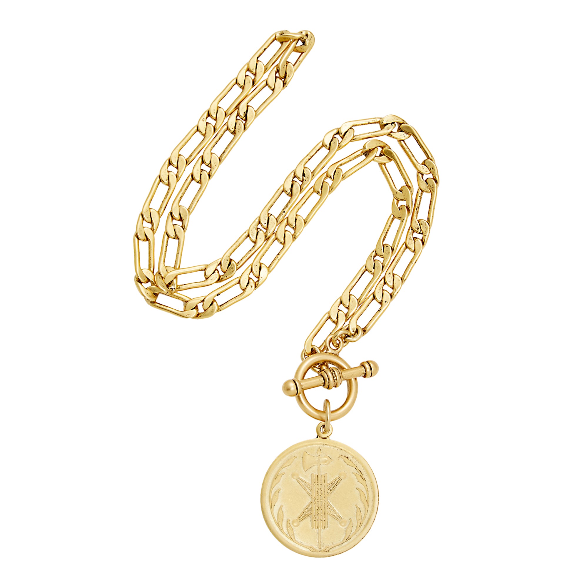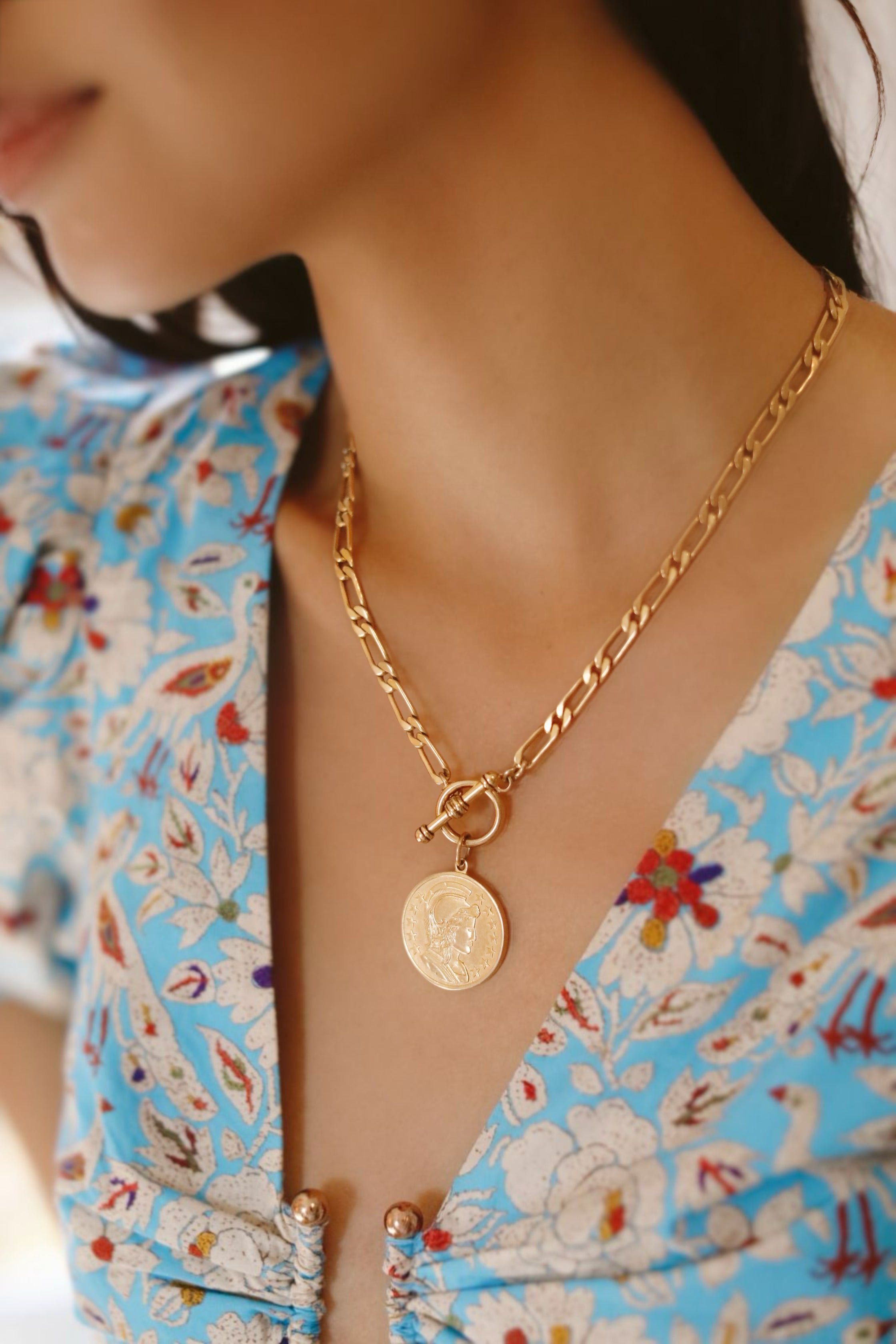 - 24k antique gold plated Figaro Chain adorned with a coin