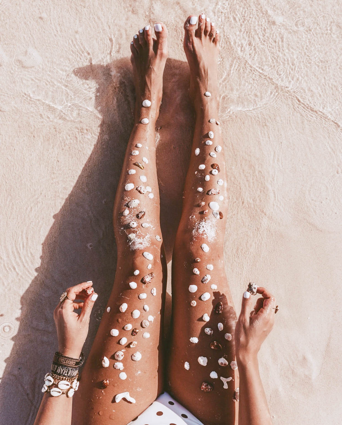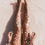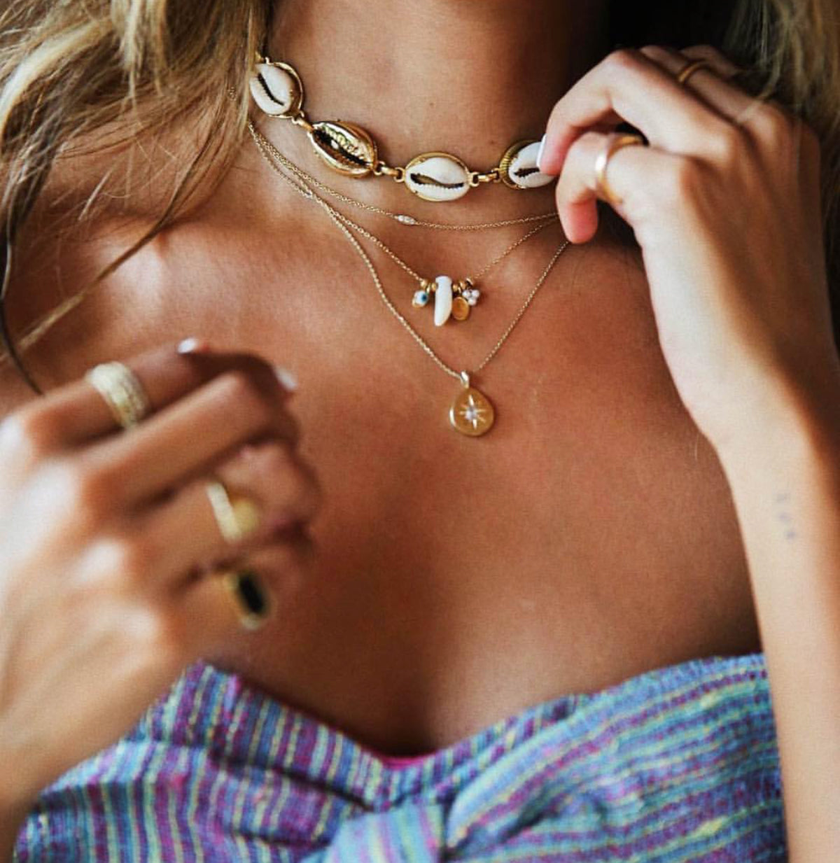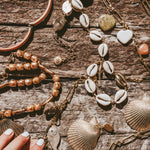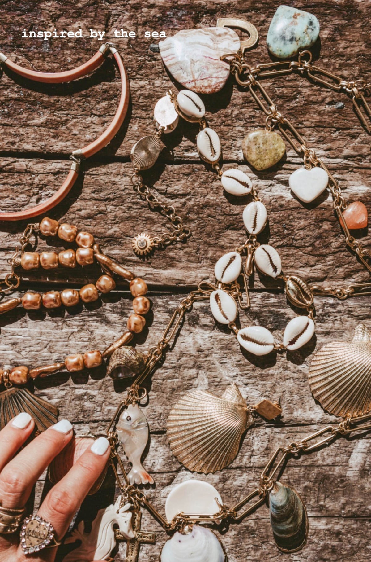 - Cowrie shells - one is gold plated! - sit in 4-prong settings on 24k antique gold plated steel links.