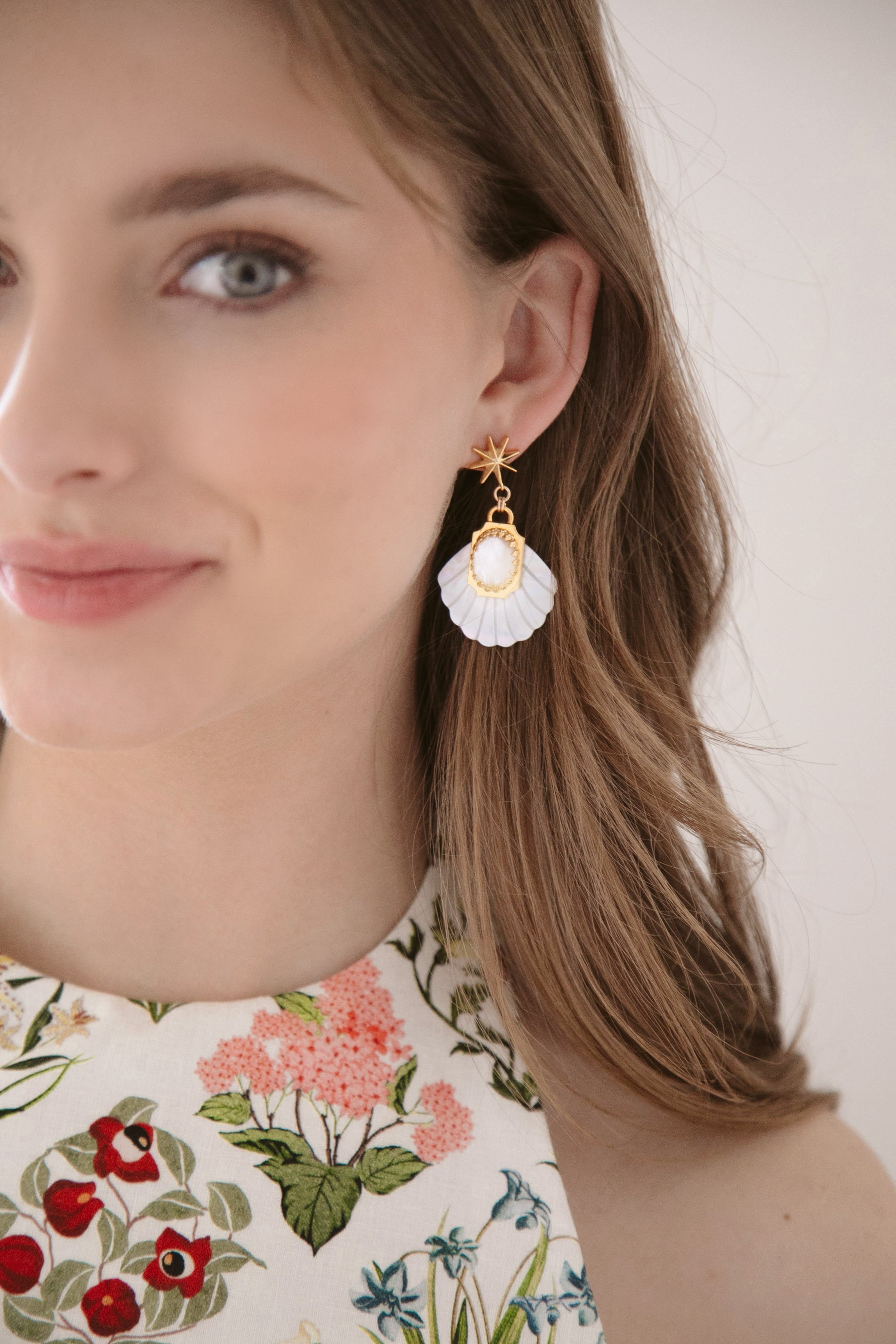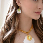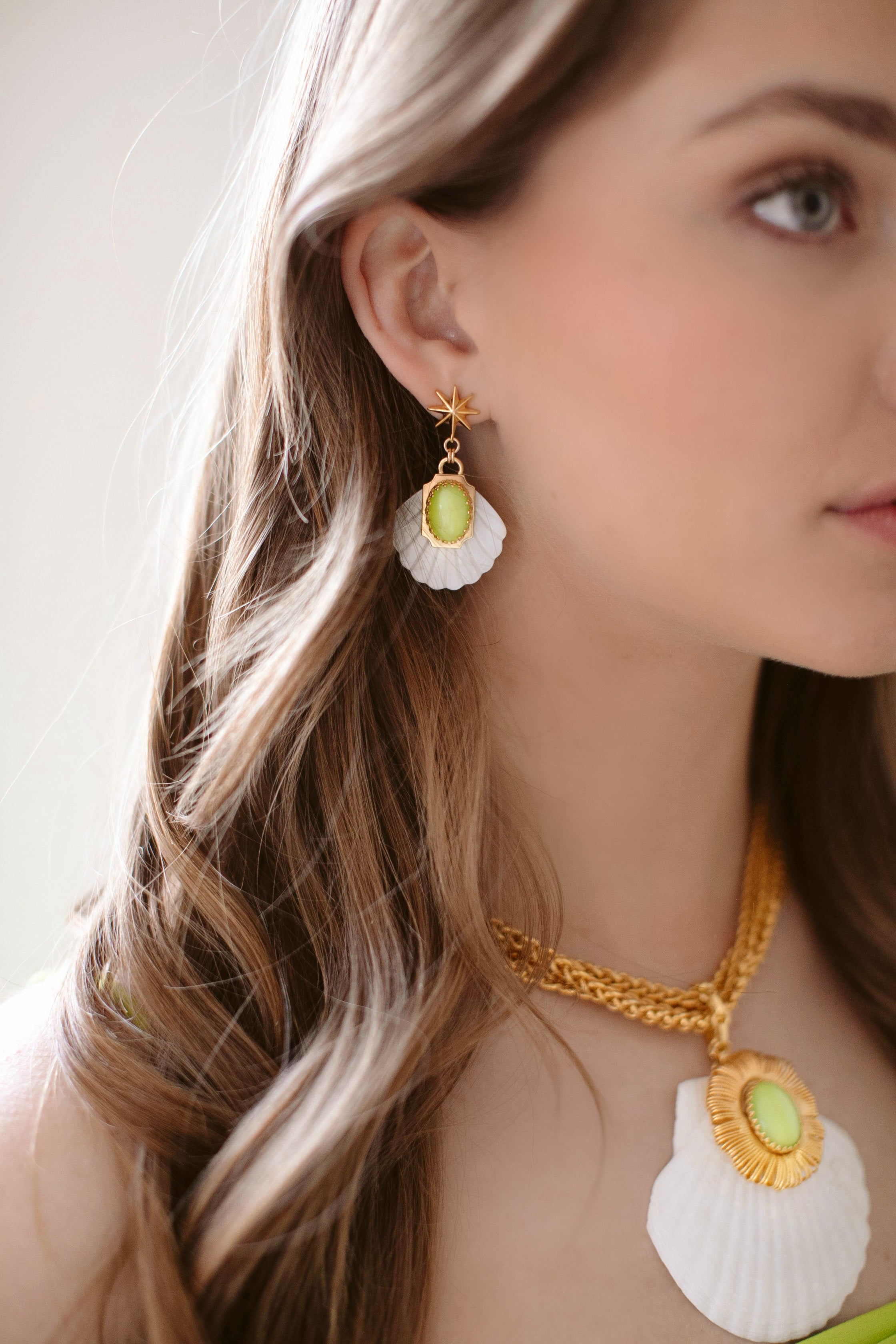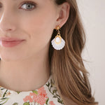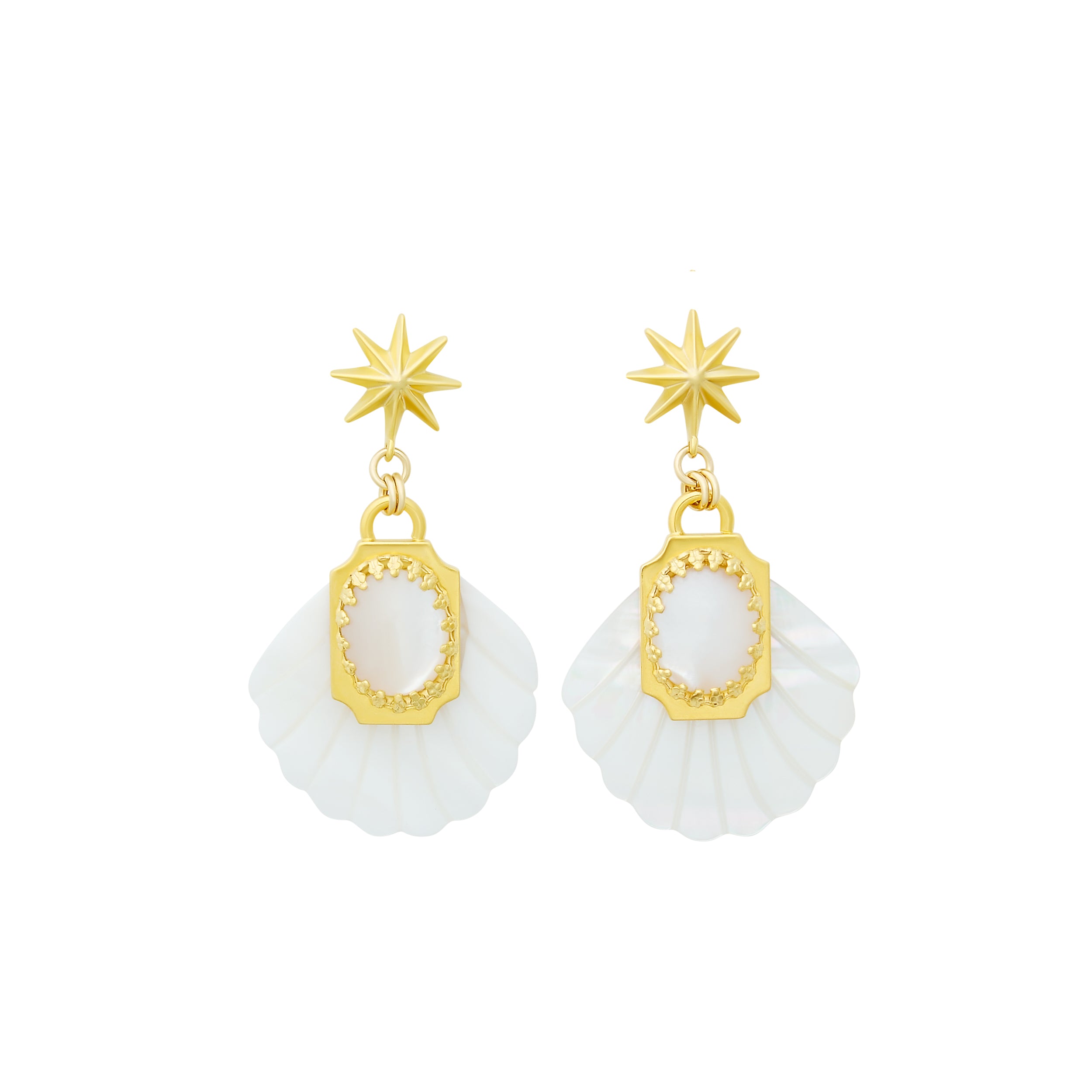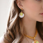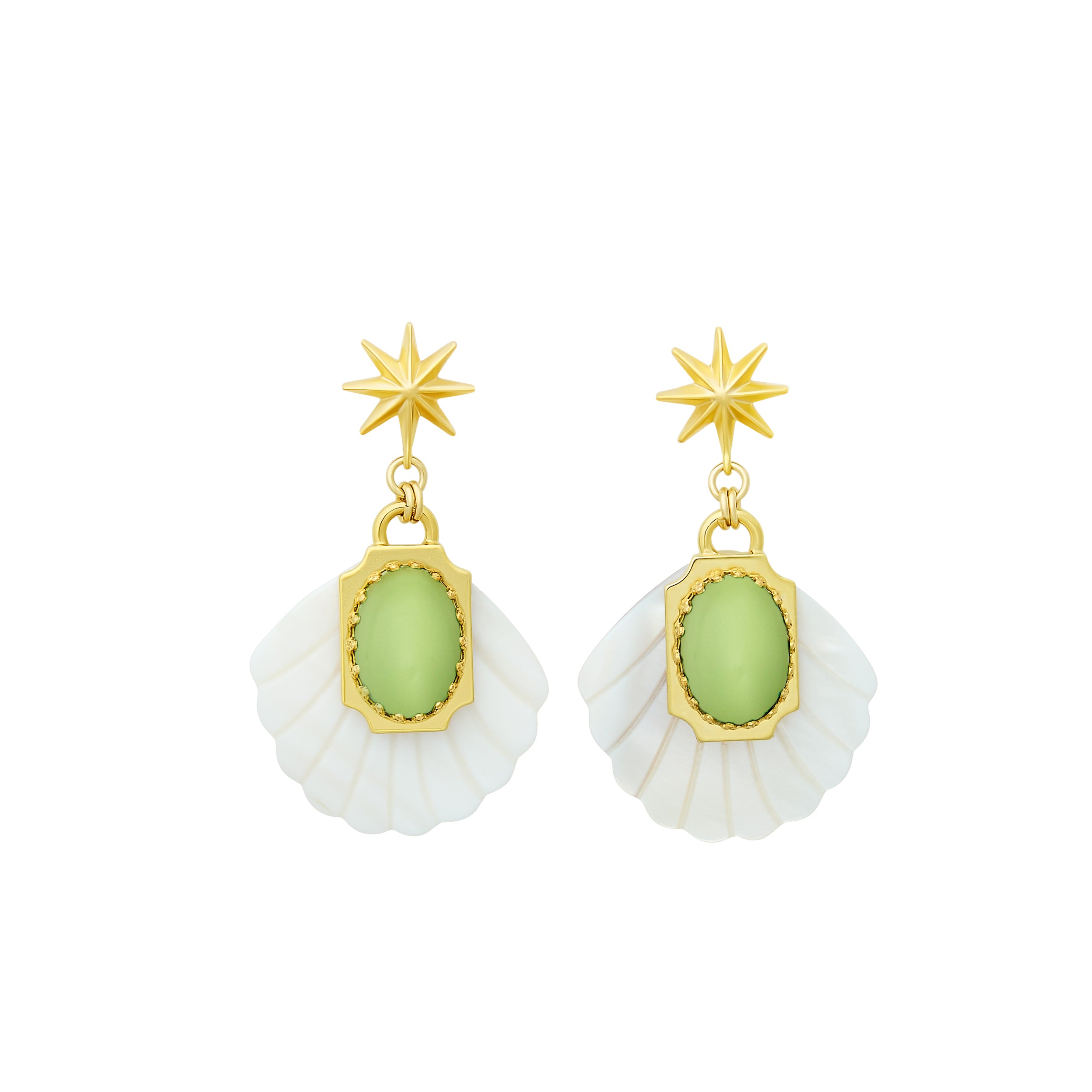 - Mother of Pearl etched fans adorned with Green Moonstone or Mother of Pearl cabochons and 24k antique gold plated detailing, hang from mariner's star toppers on stainless steel hypoallergenic posts