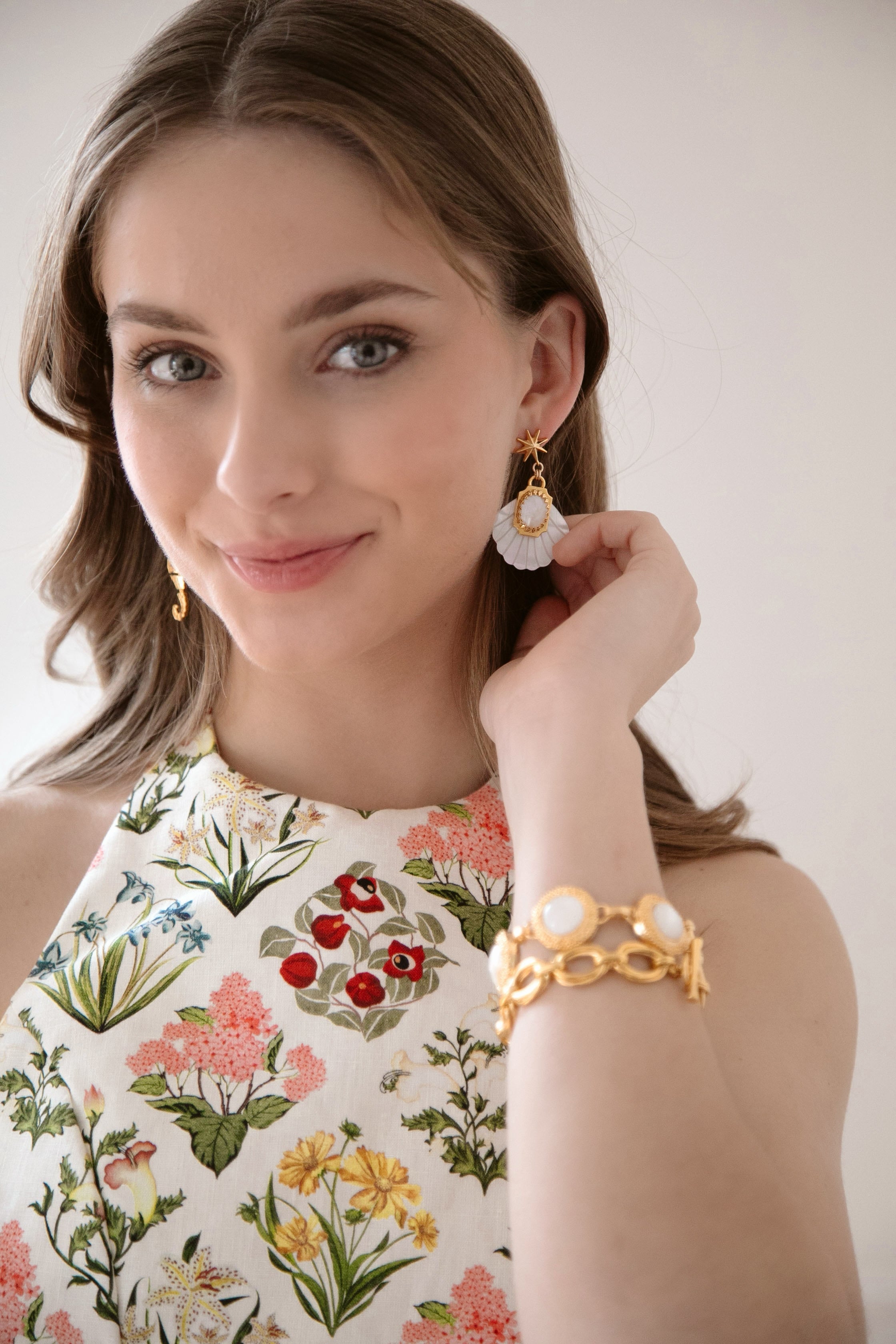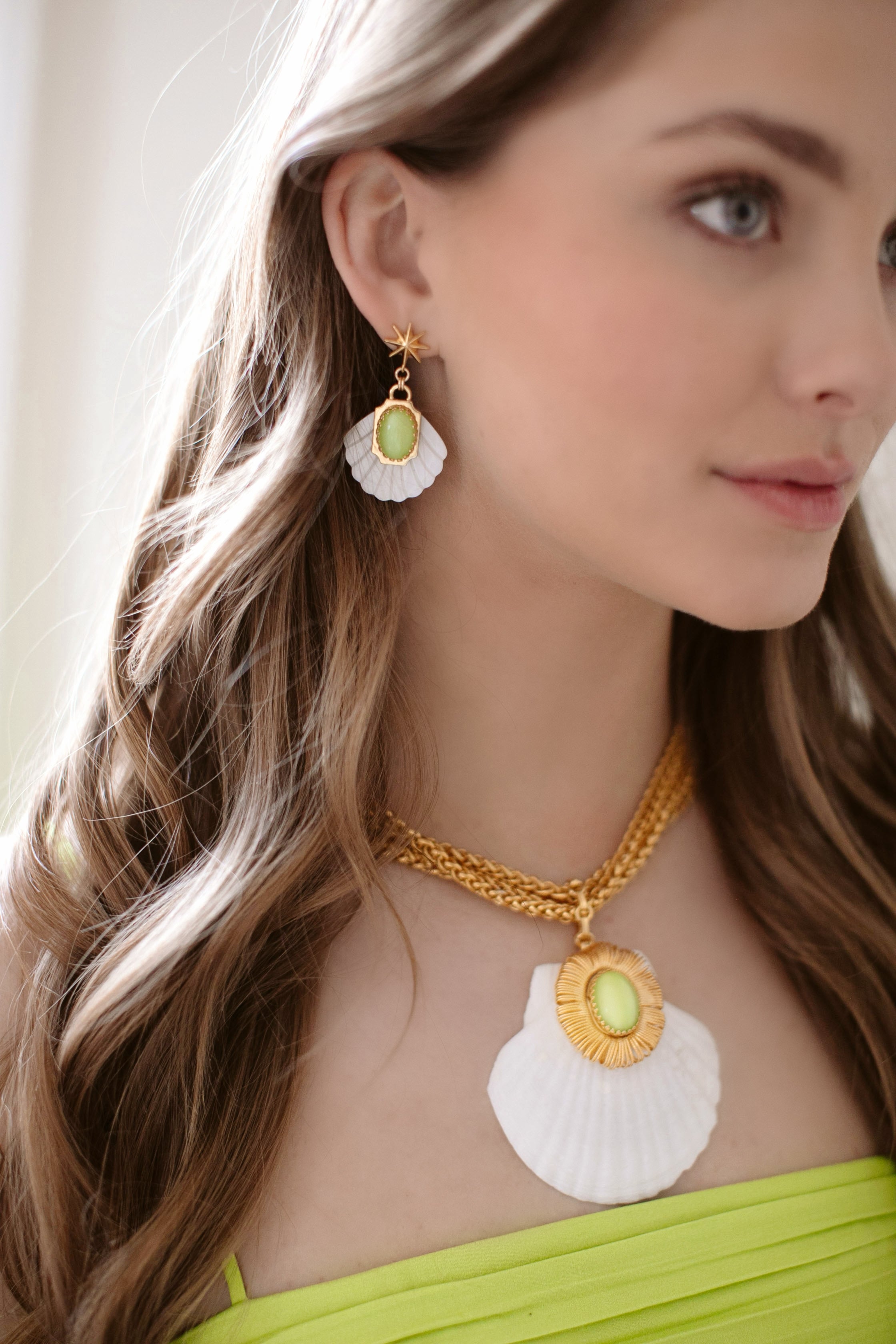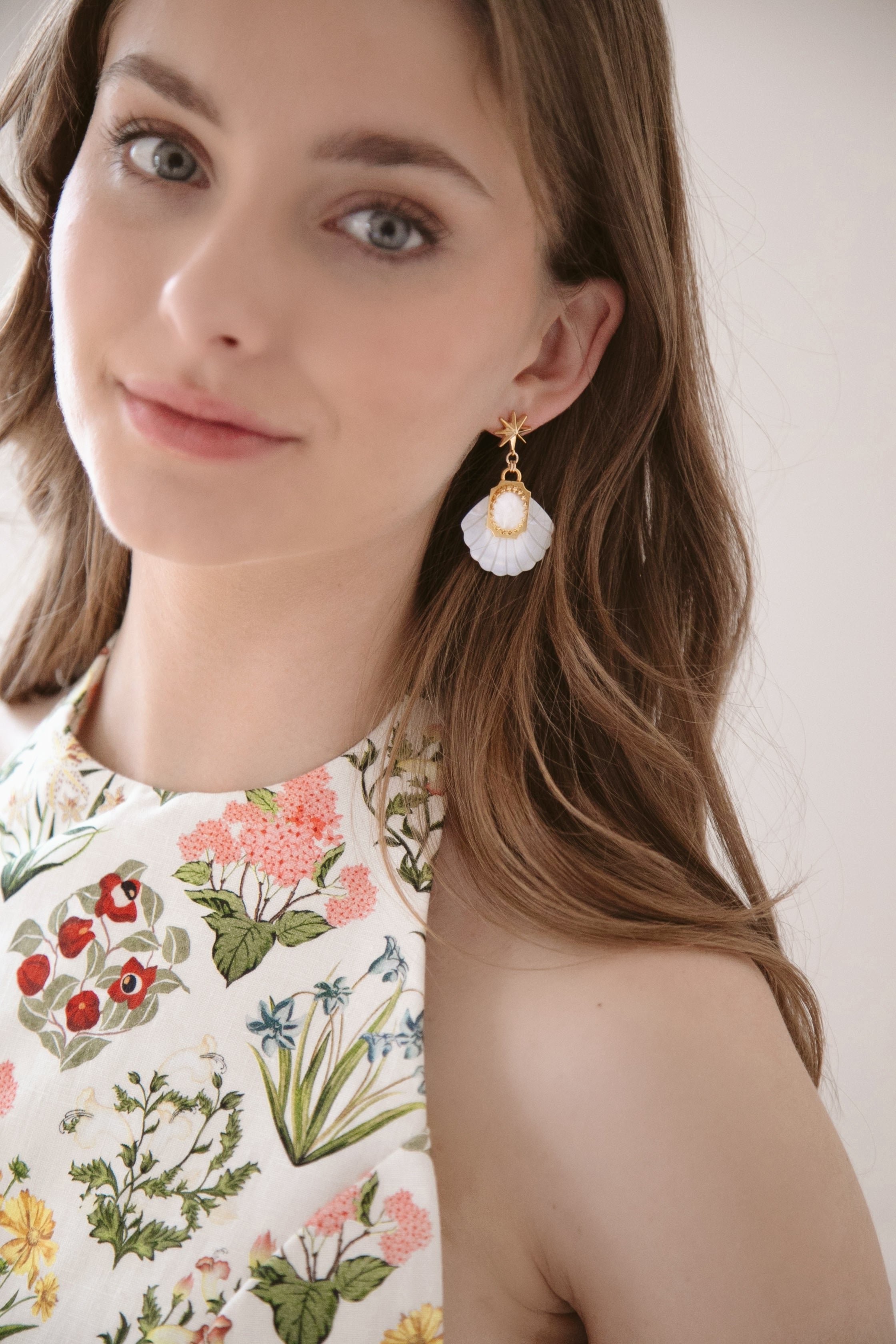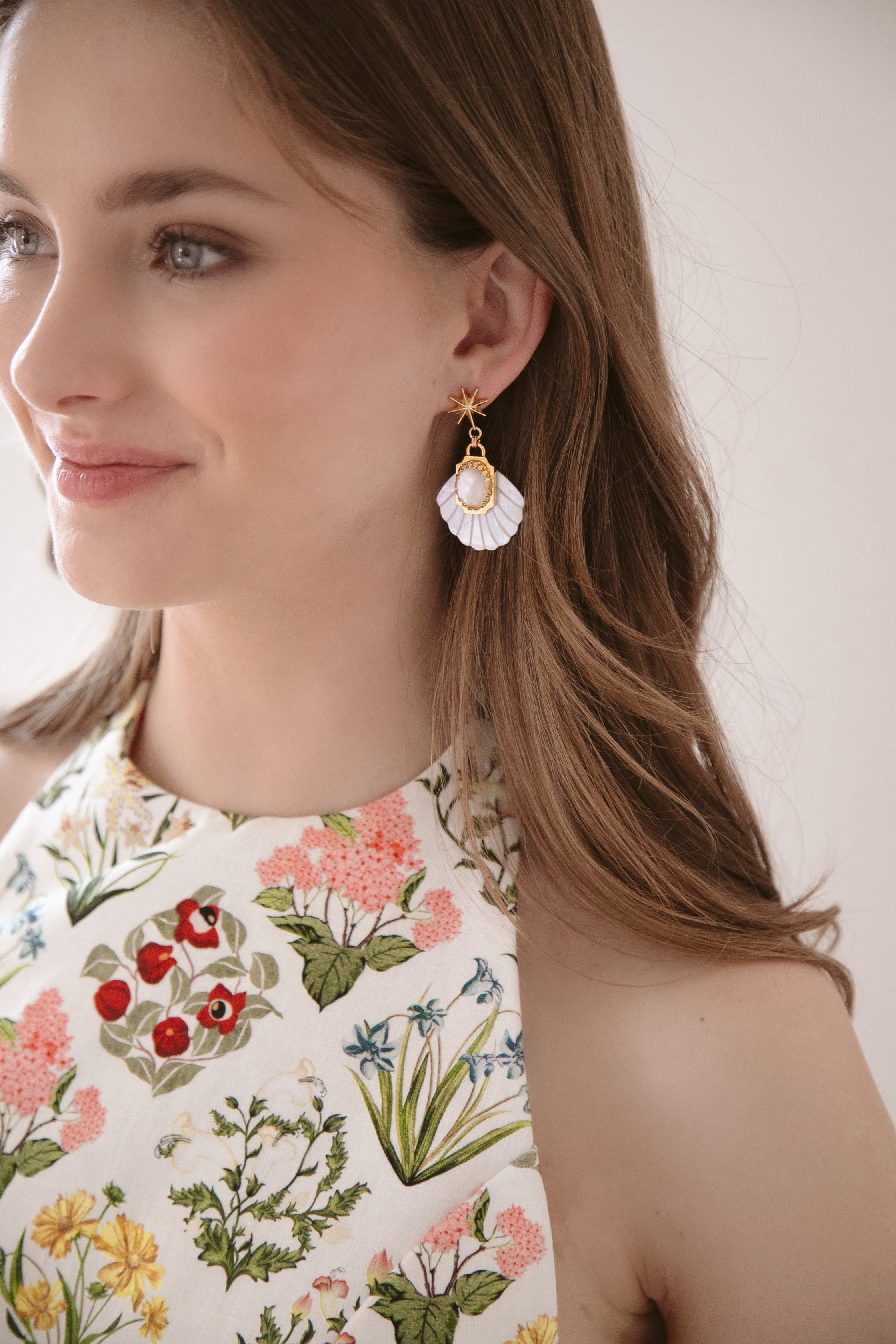 - Mother of Pearl etched fans adorned with Green Moonstone or Mother of Pearl cabochons and 24k antique gold plated detailing, hang from mariner's star toppers on stainless steel hypoallergenic posts