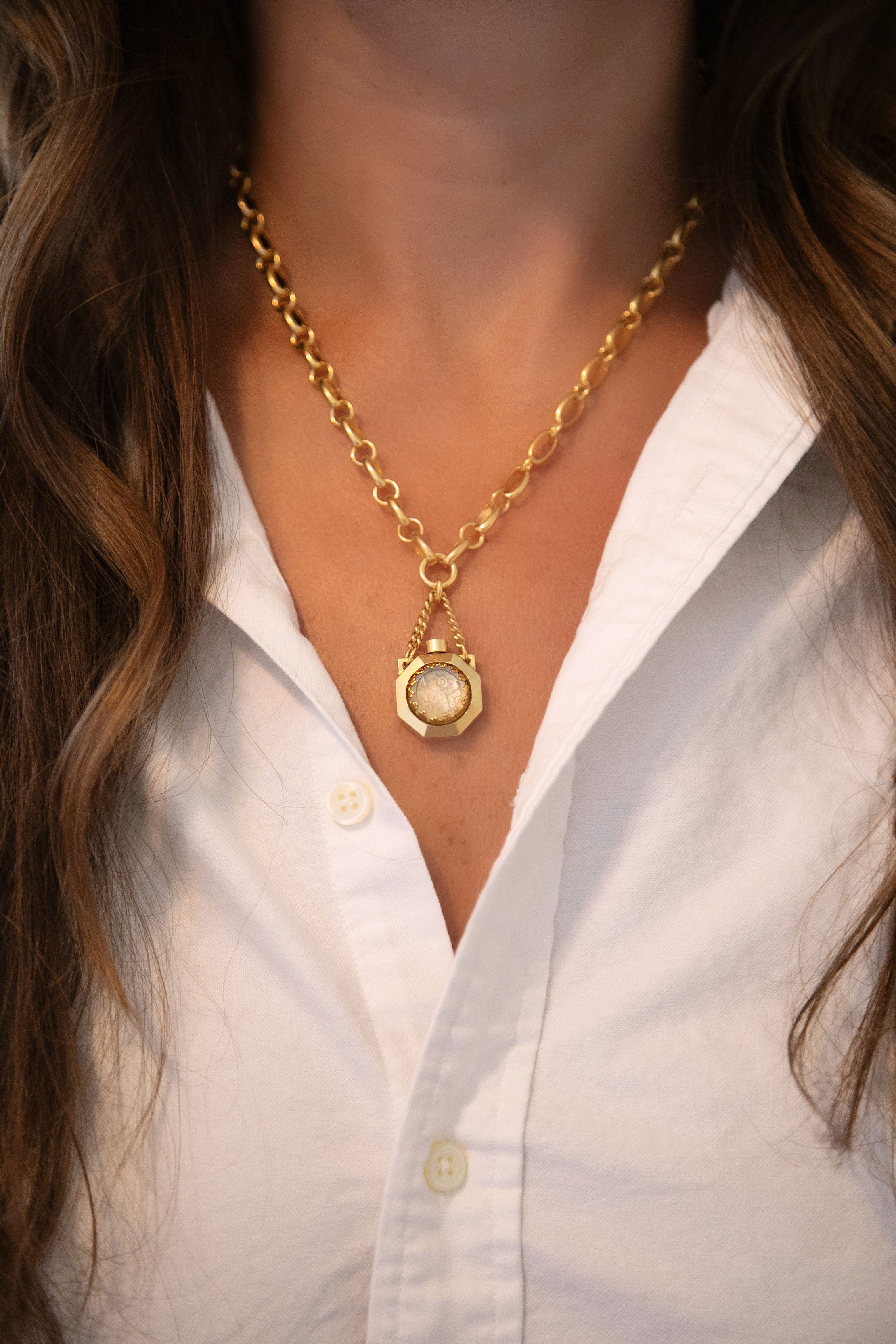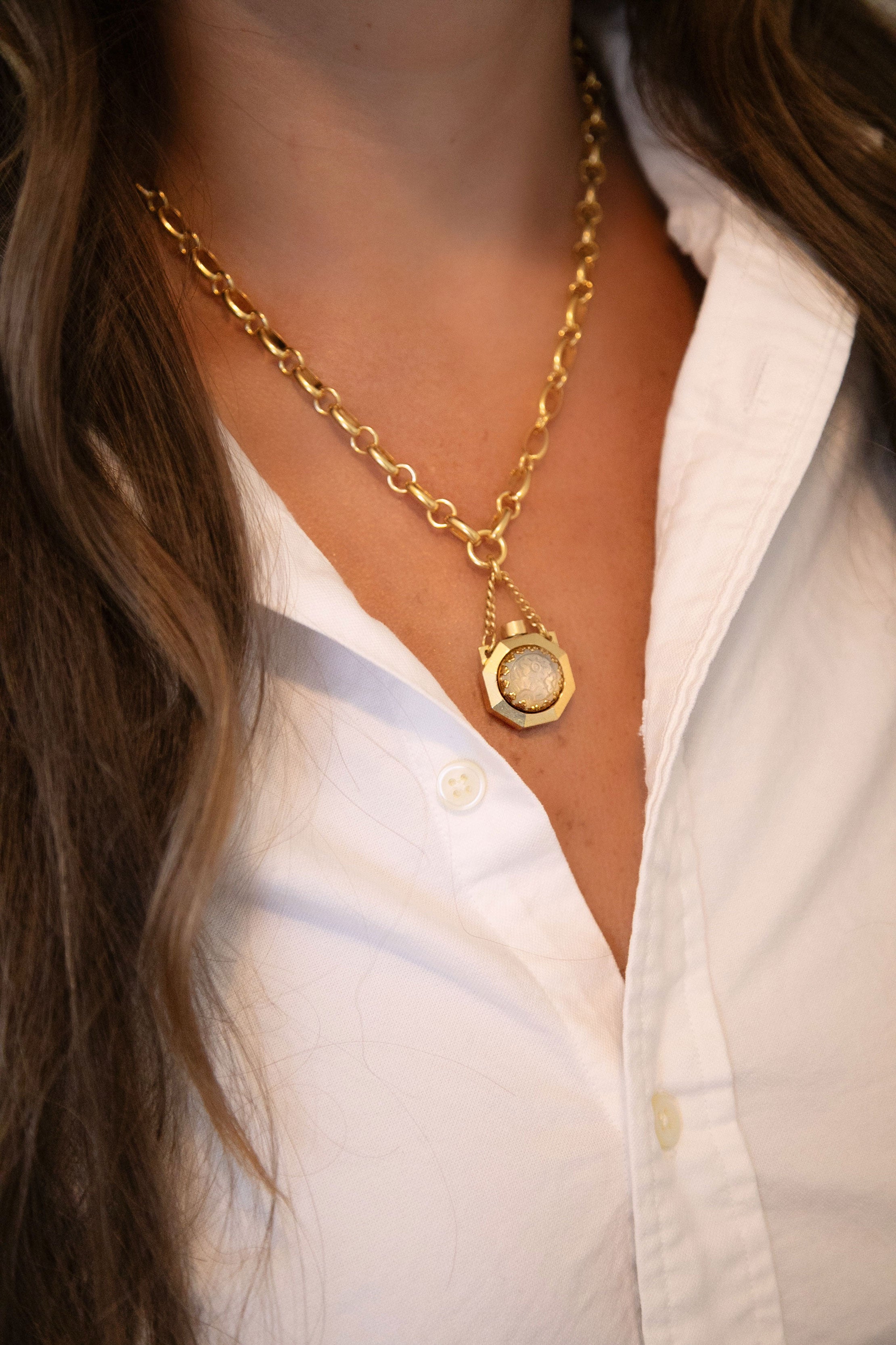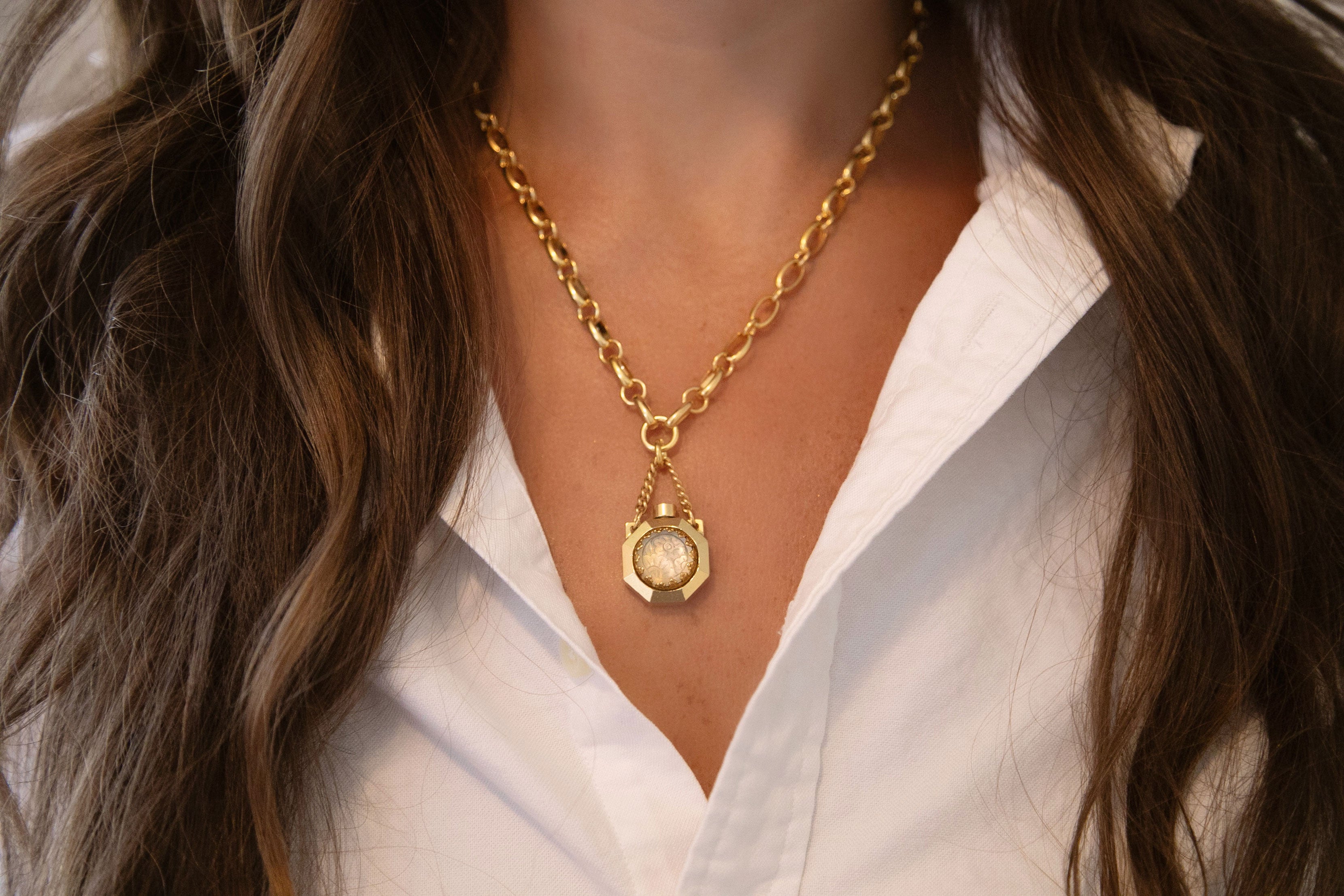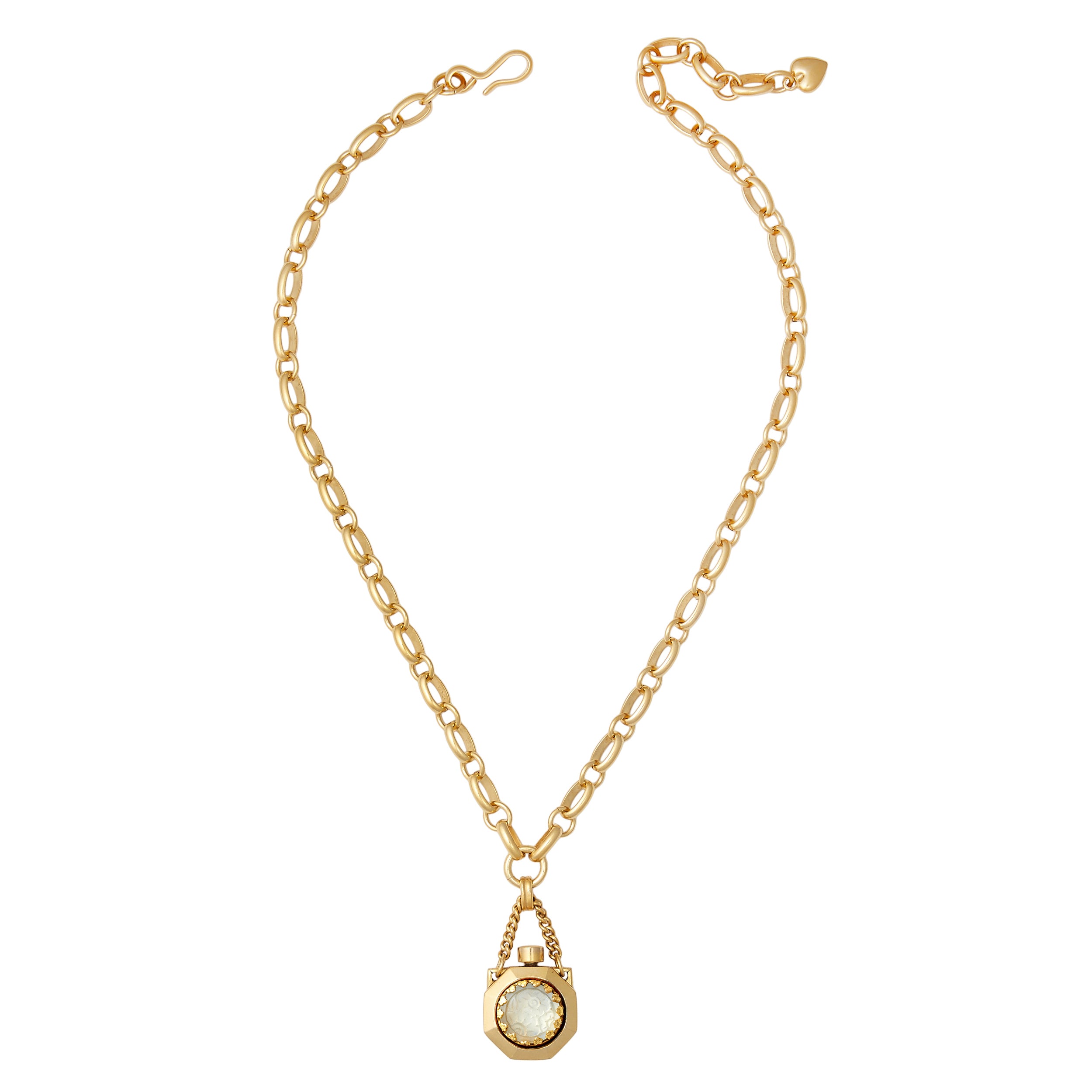 - 24k antique gold plated brass chain adorned with a 24k antique gold plated perfume bottle set with a vintage etched glass cabochon