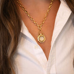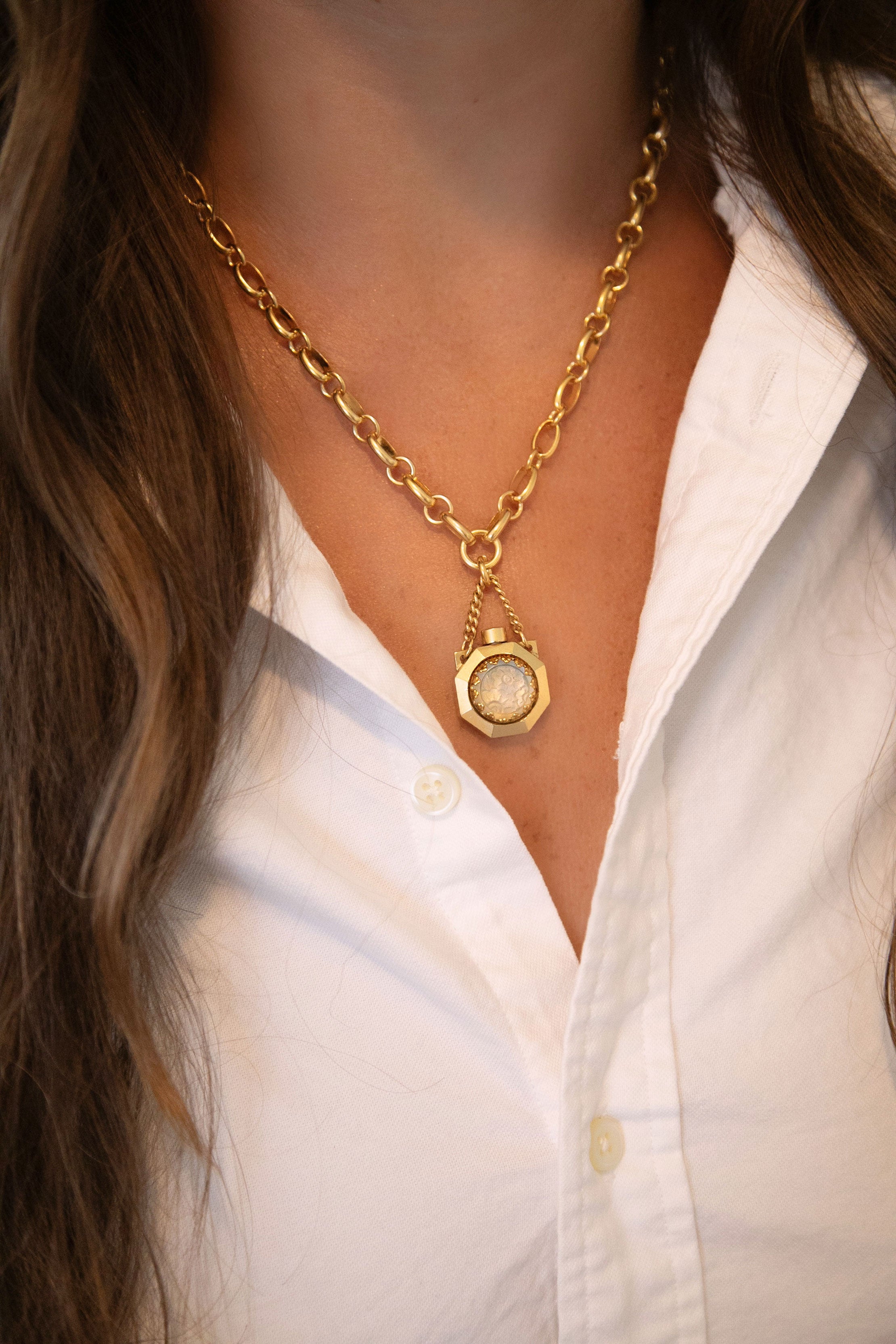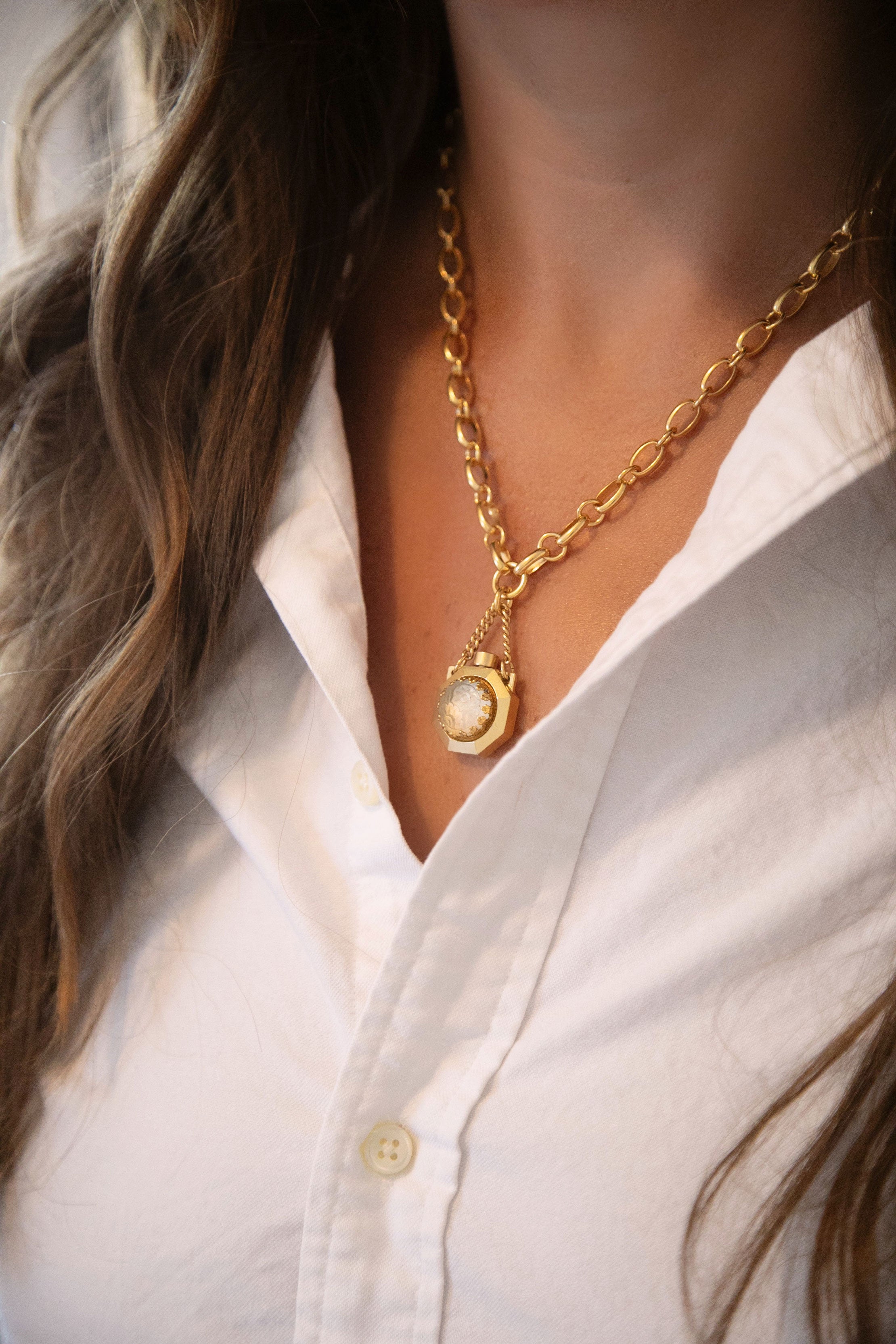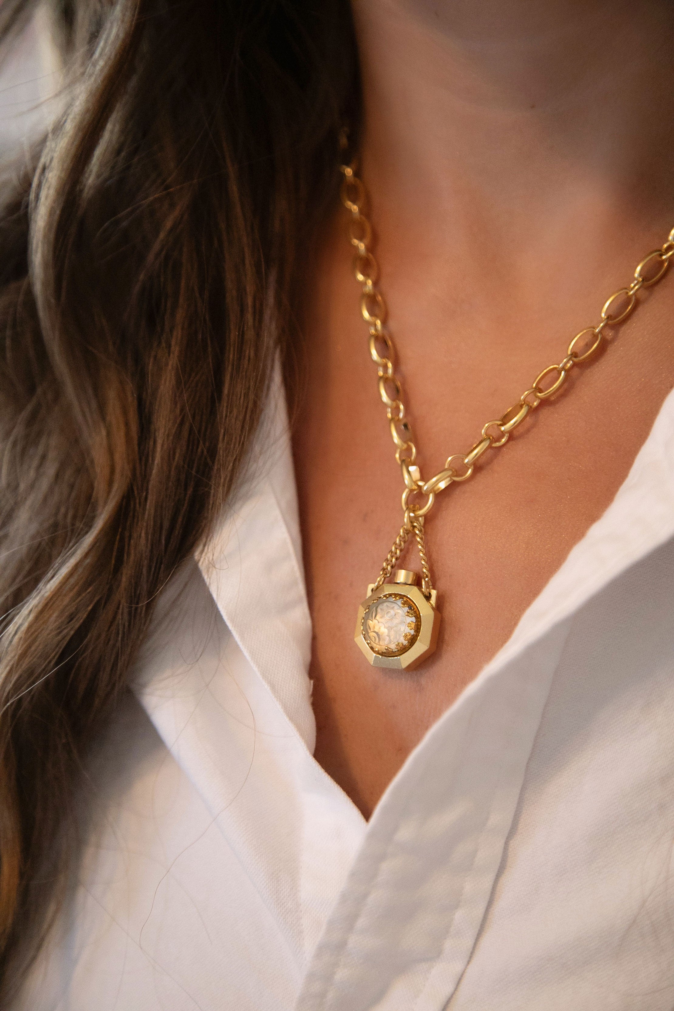 - 24k antique gold plated brass chain adorned with a 24k antique gold plated perfume bottle set with a vintage etched glass cabochon