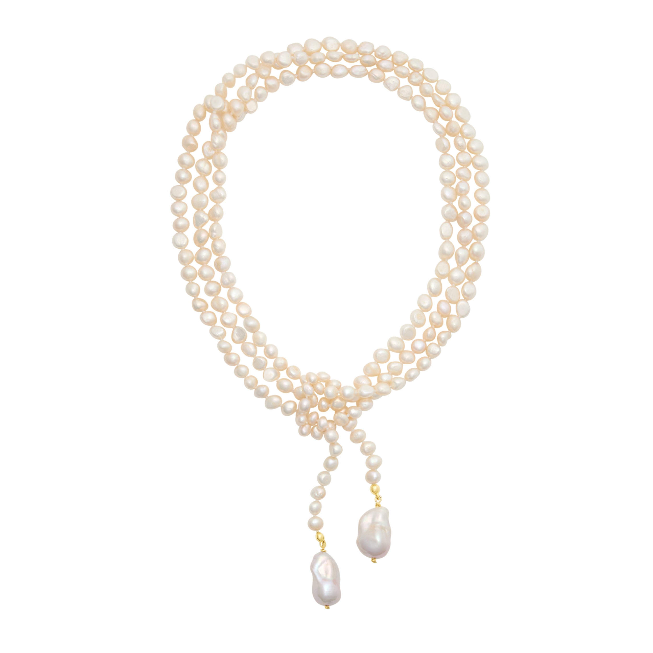 A lariat of knotted freshwater pearls with large baroque pearl ends