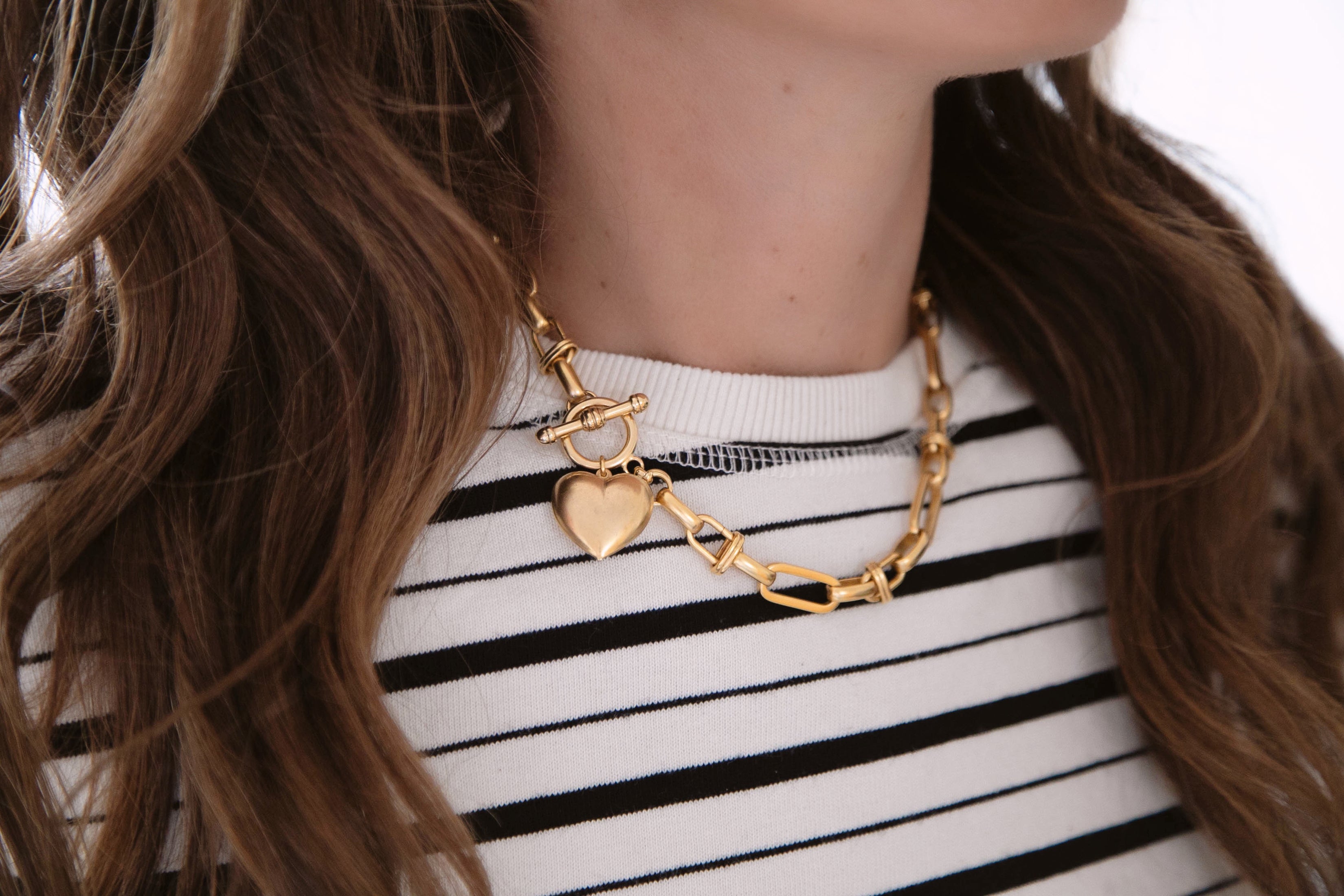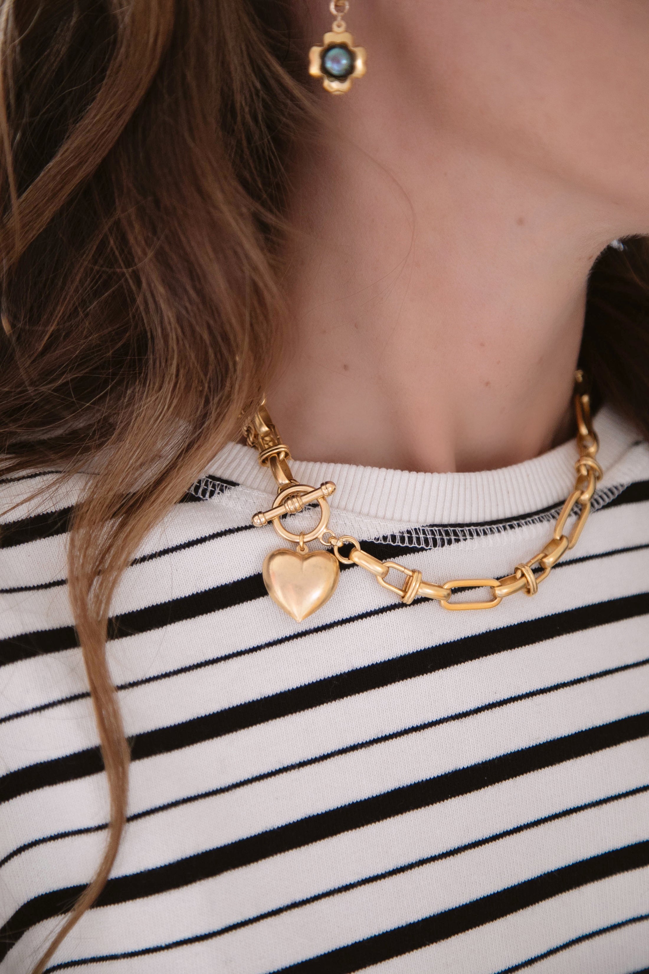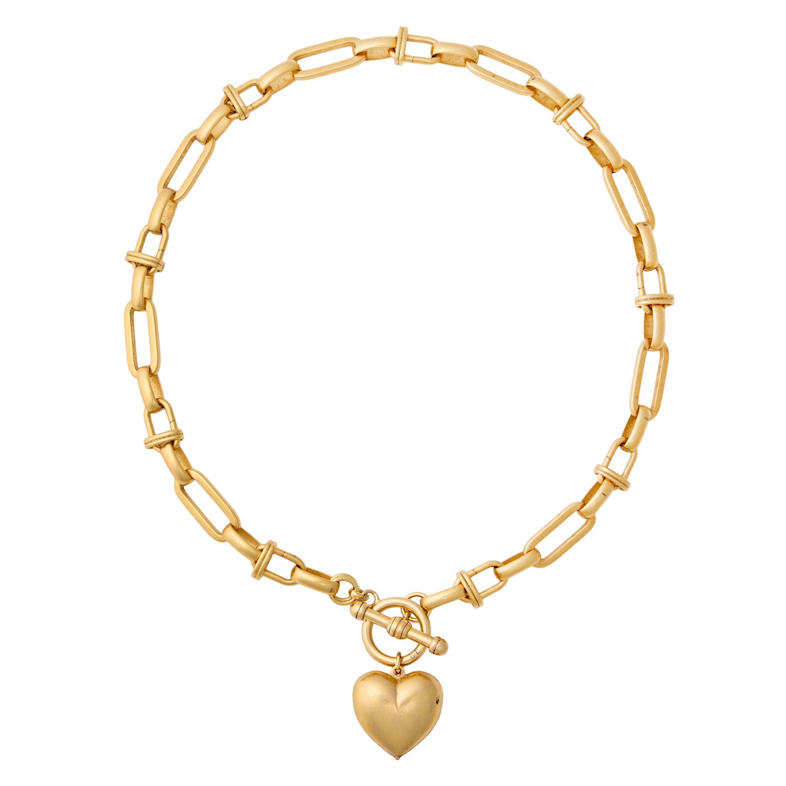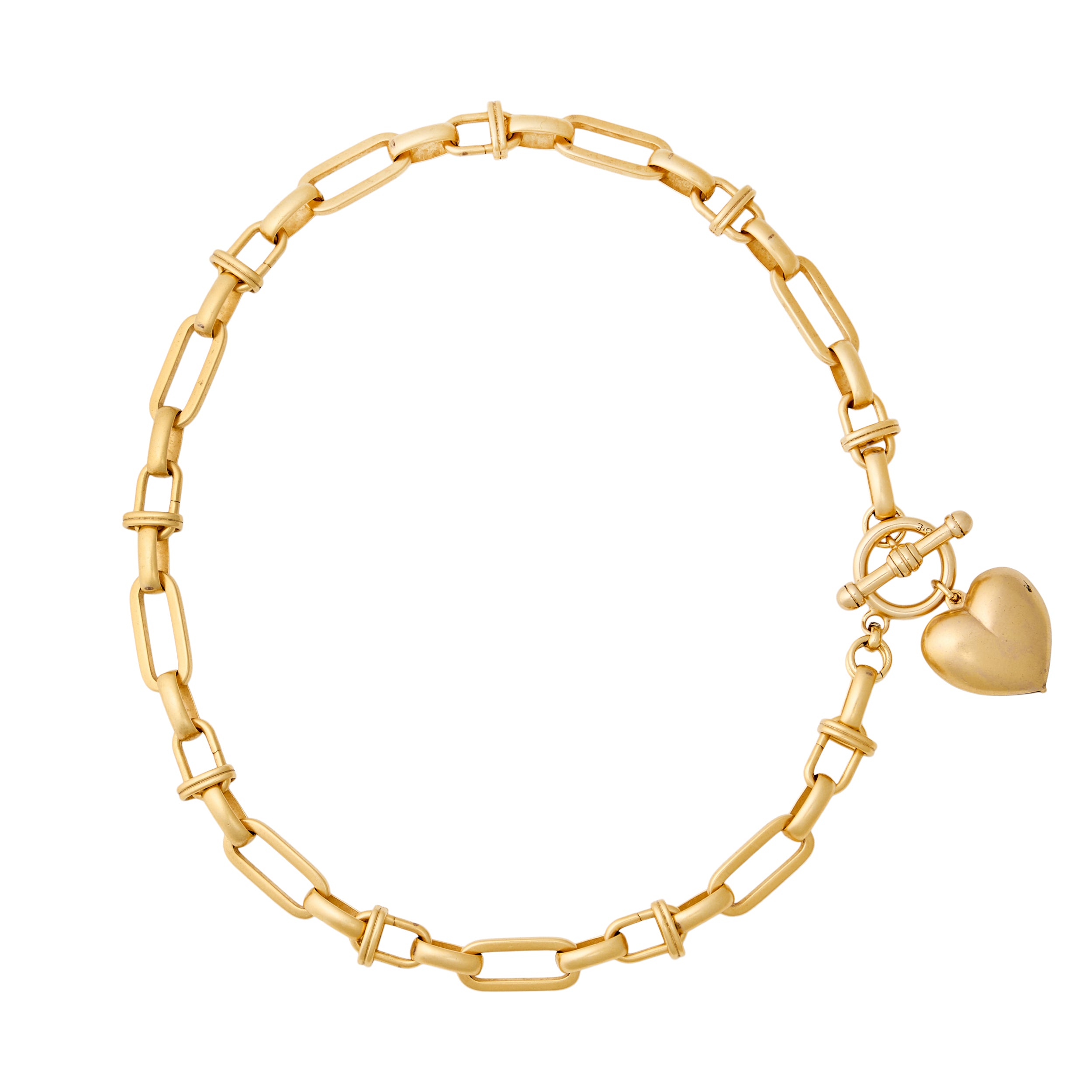 - 24k antique gold plated brass link chain adorned with a gold plated heart medallion
