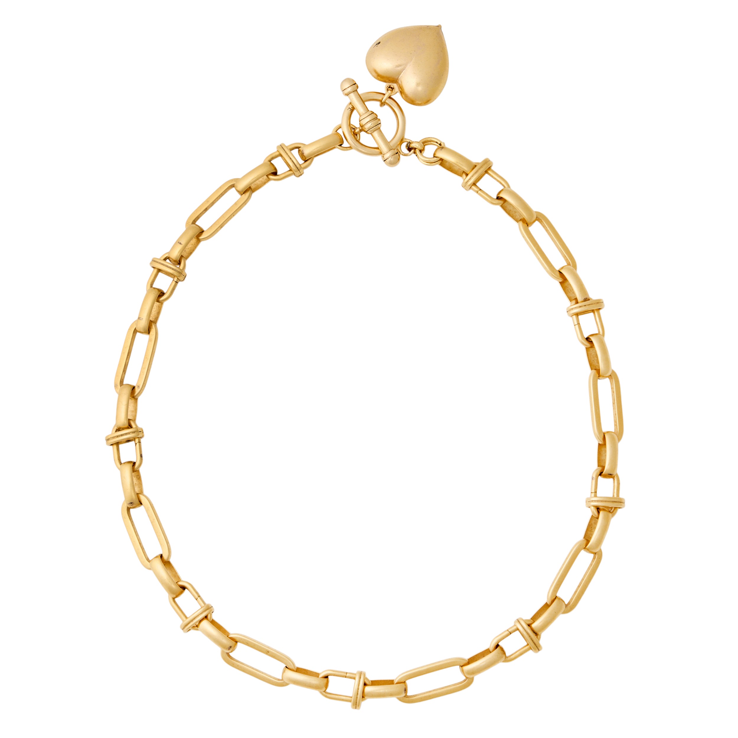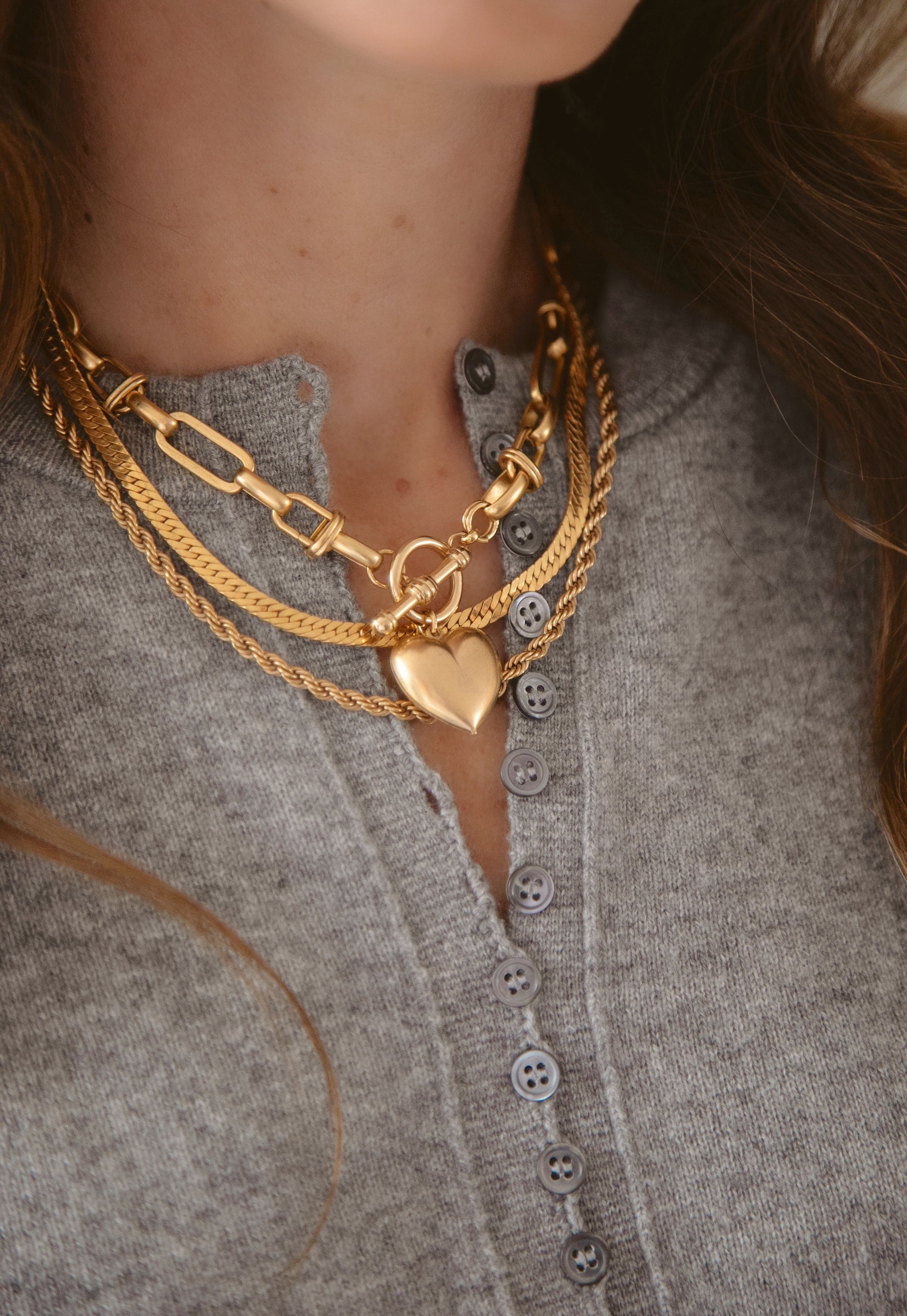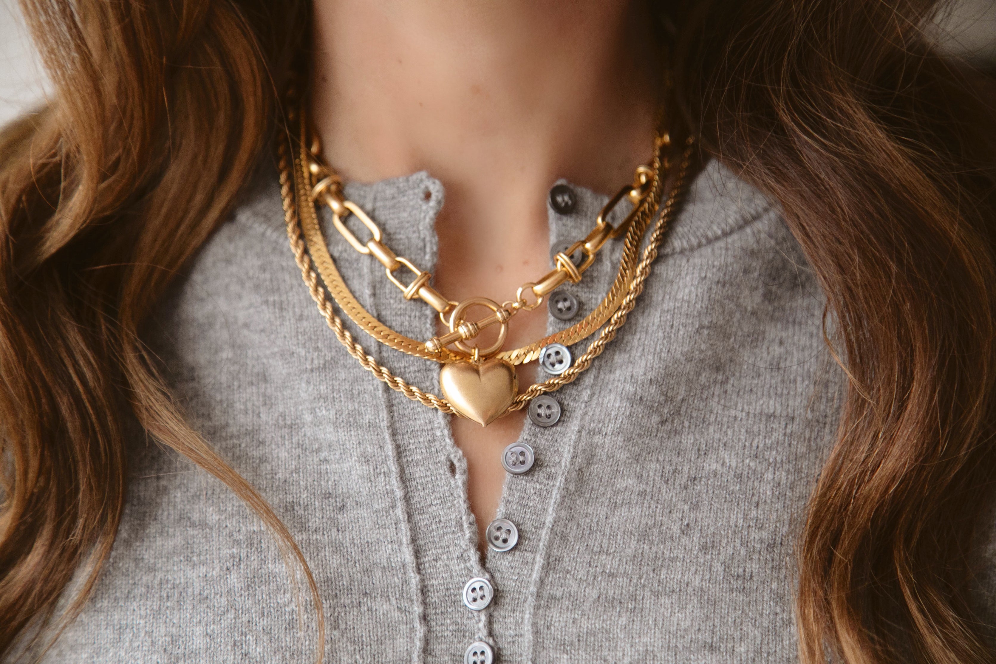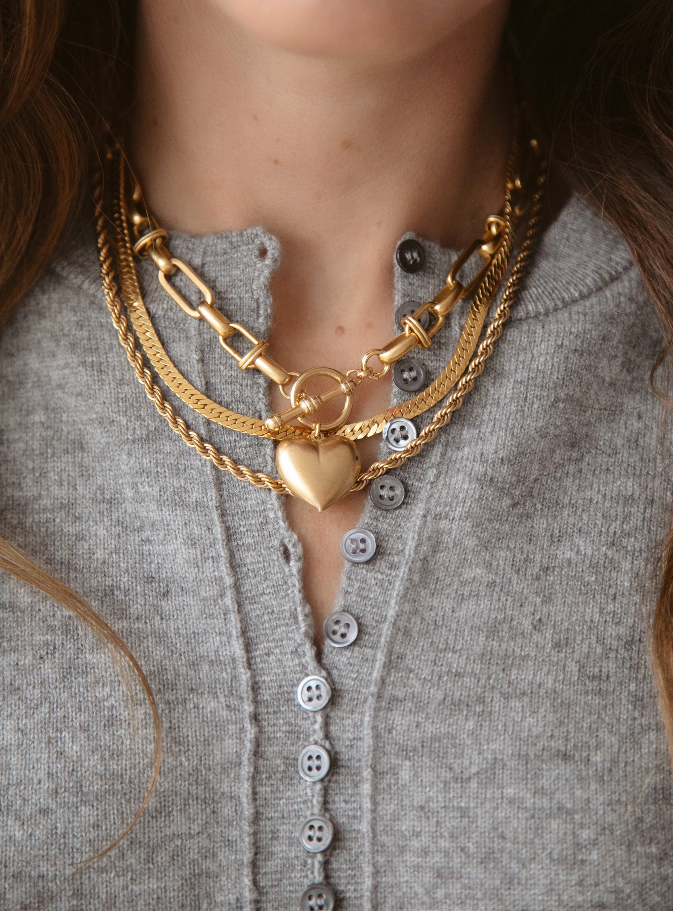 - 24k antique gold plated brass link chain adorned with a gold plated heart medallion