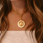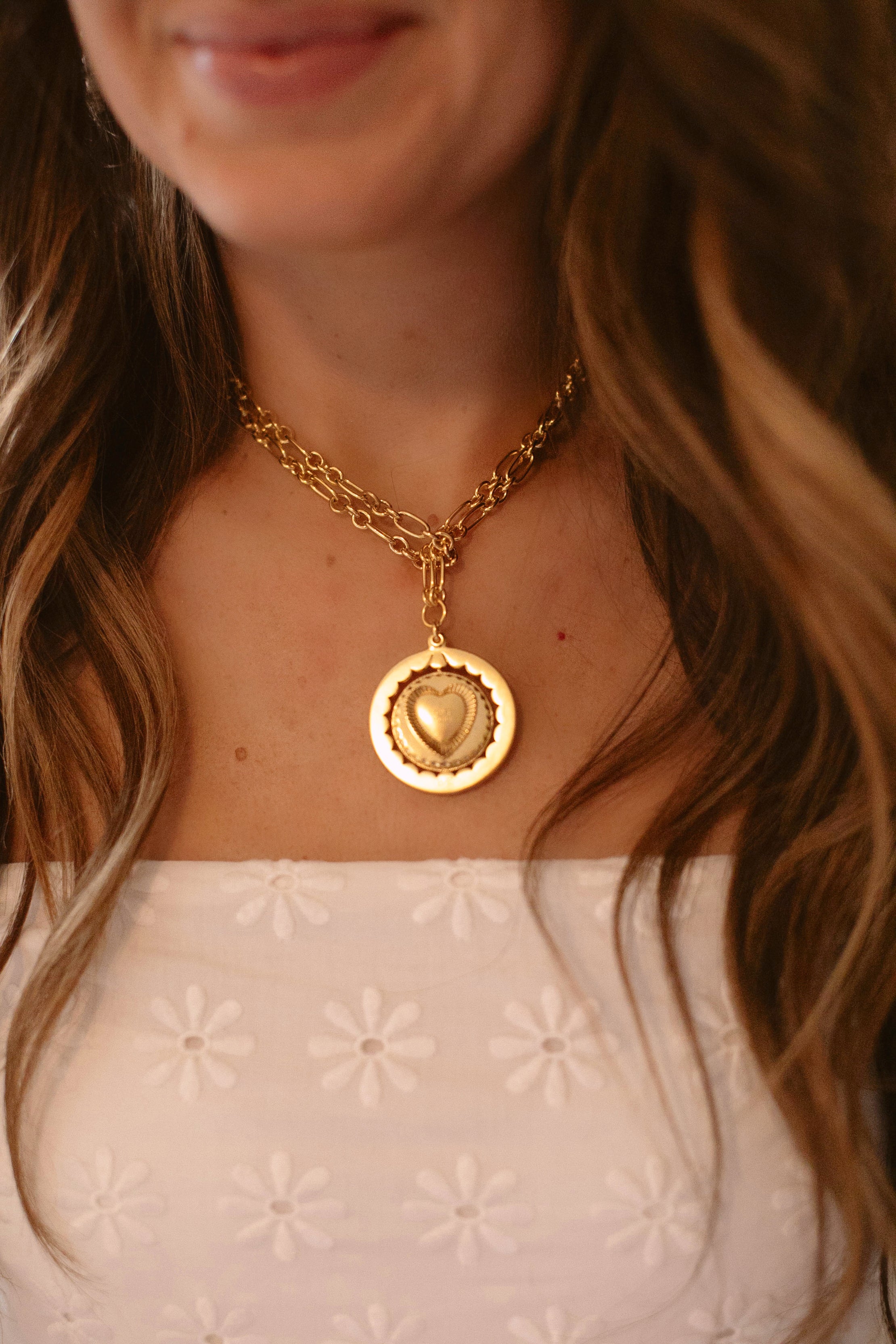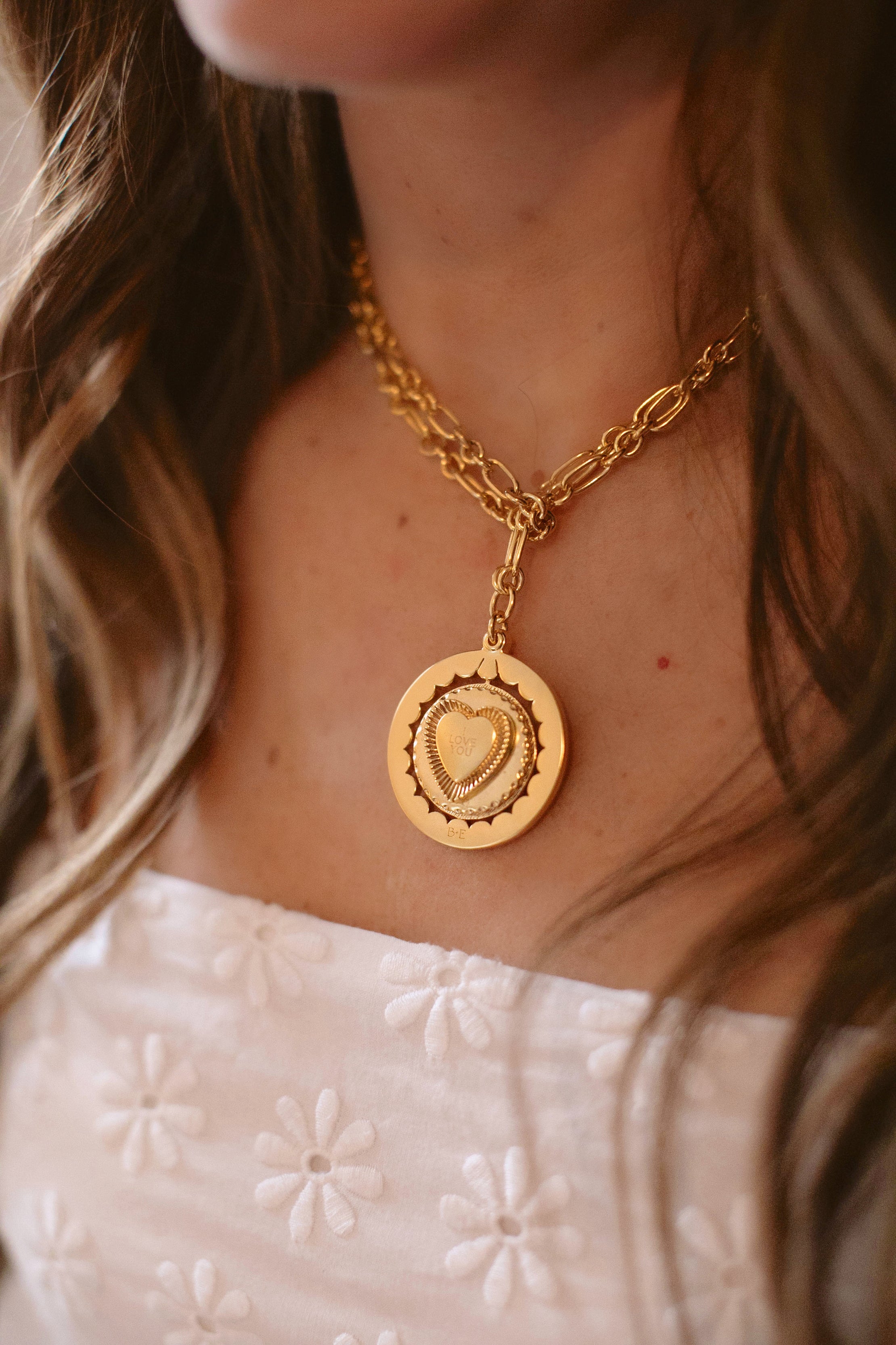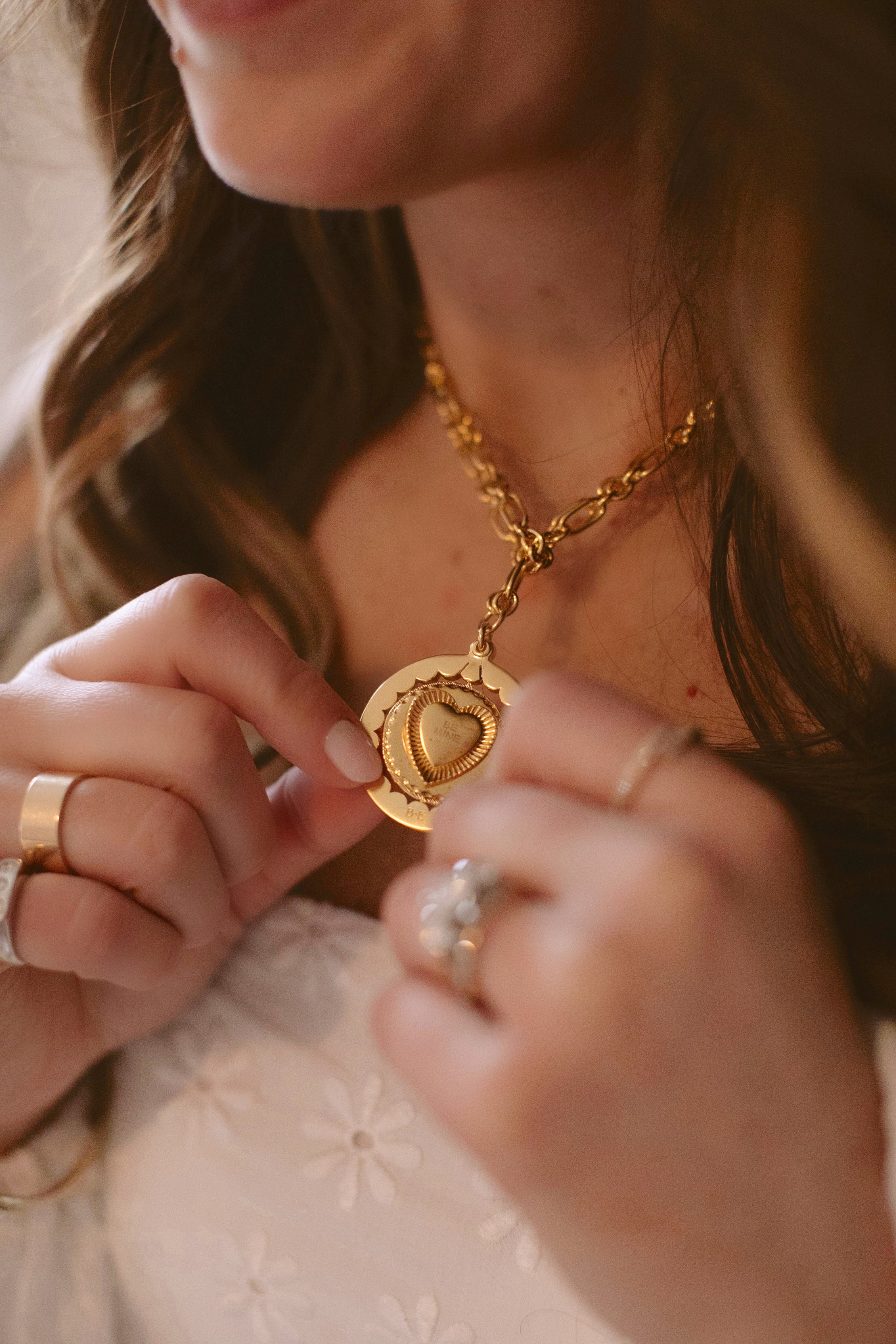 - 24k antique gold plated spinner medallion and chain. One side reads "I Love You", the other side reads "Be Mine"