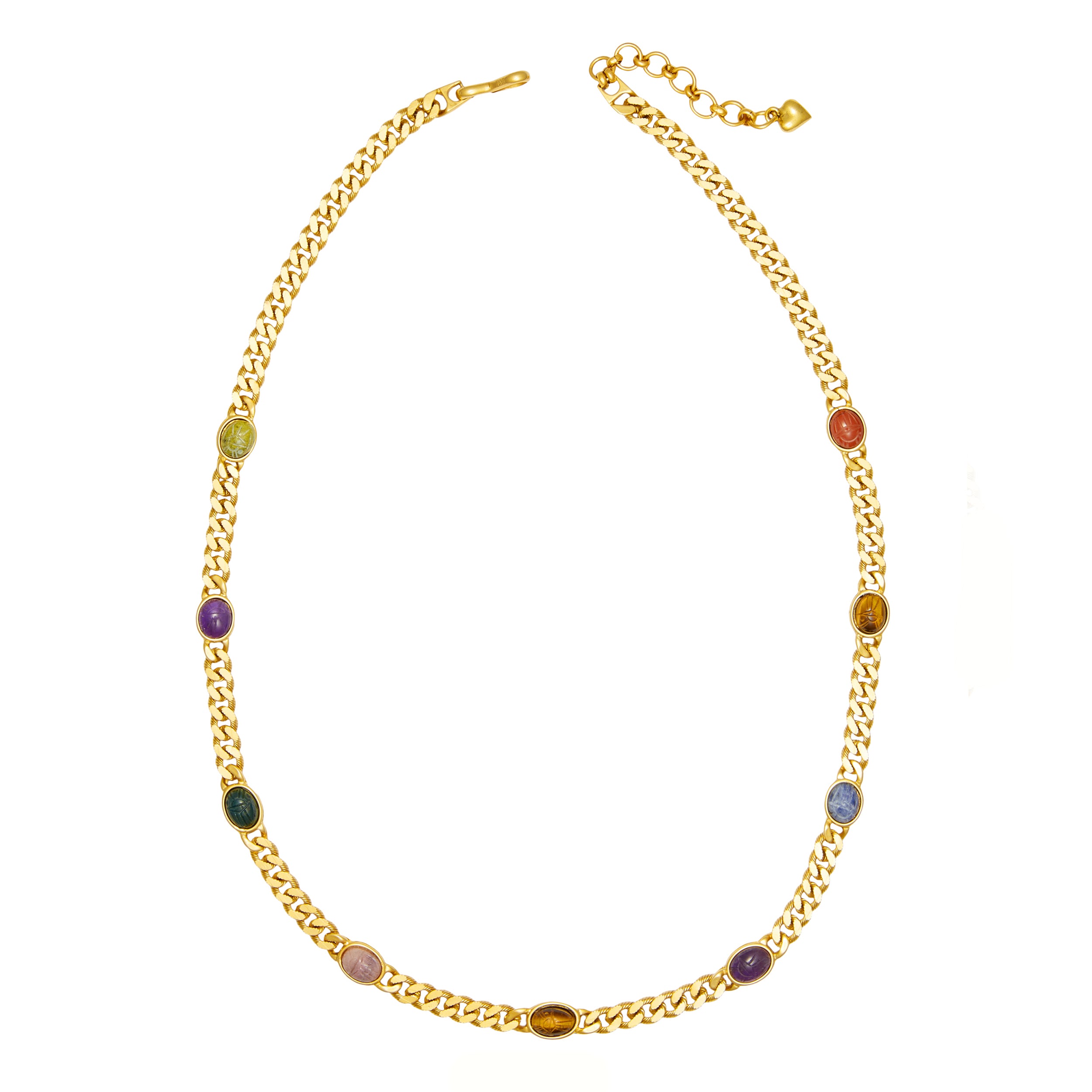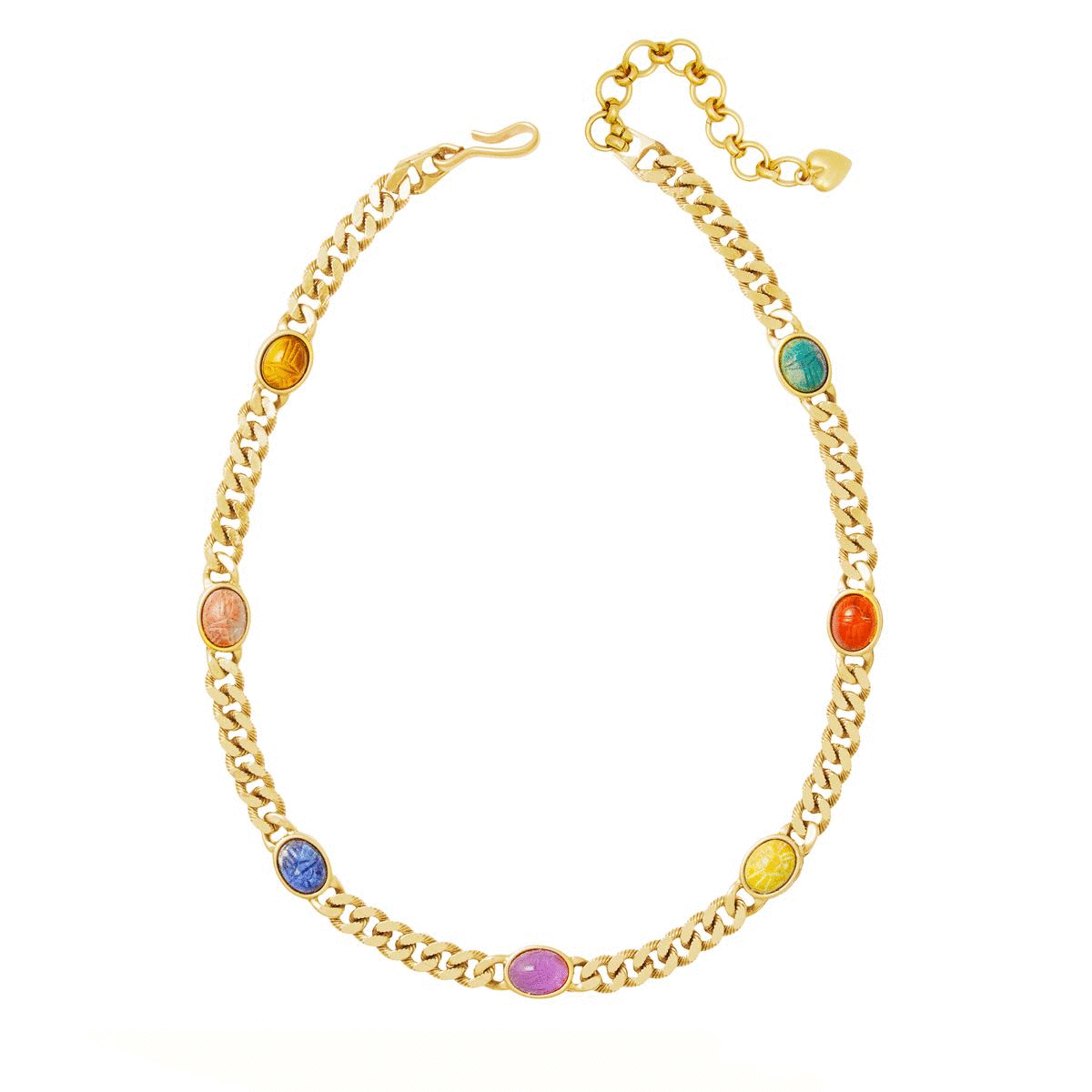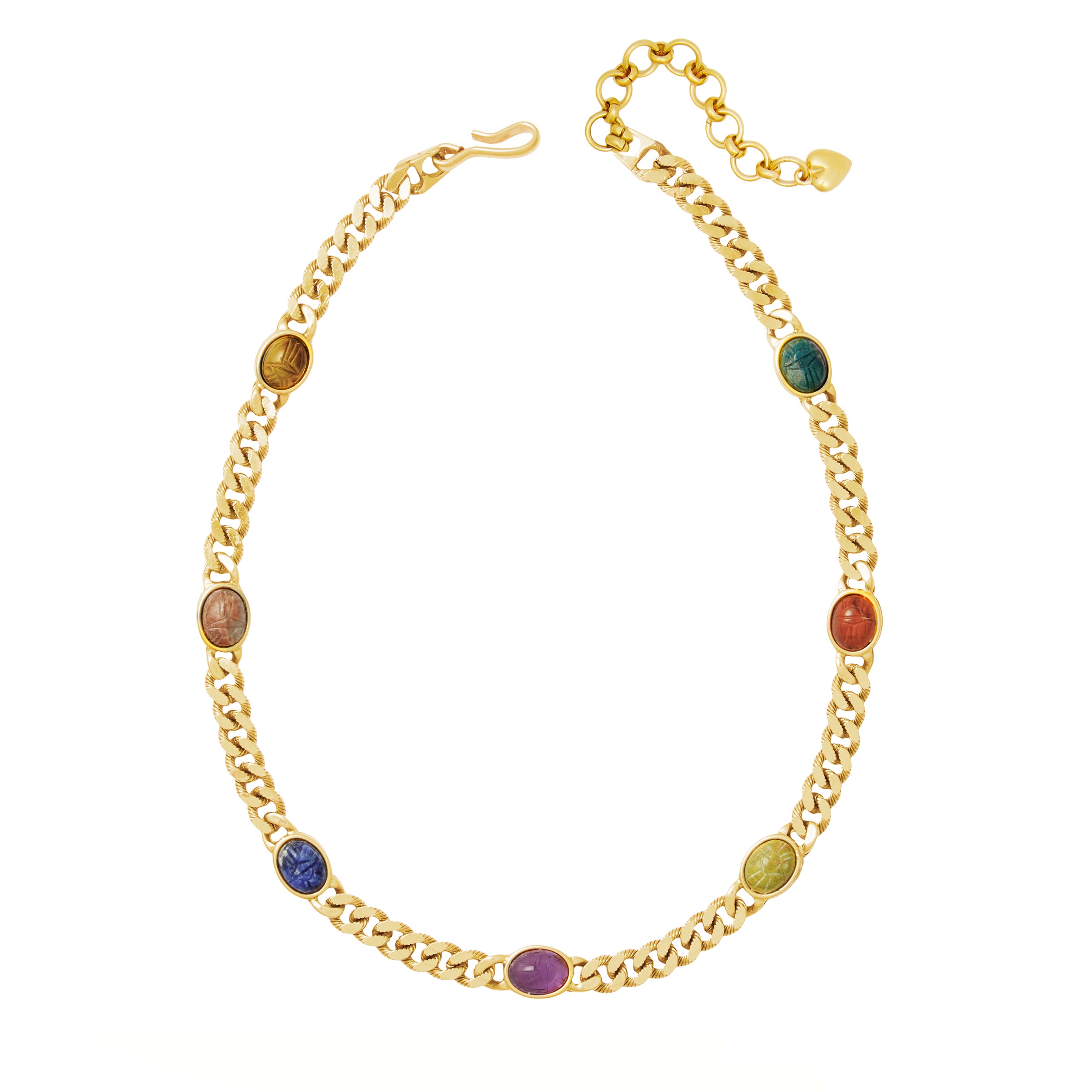 - Oval gemstone carved scarab cabochons set on 24k antique gold plated curb chain