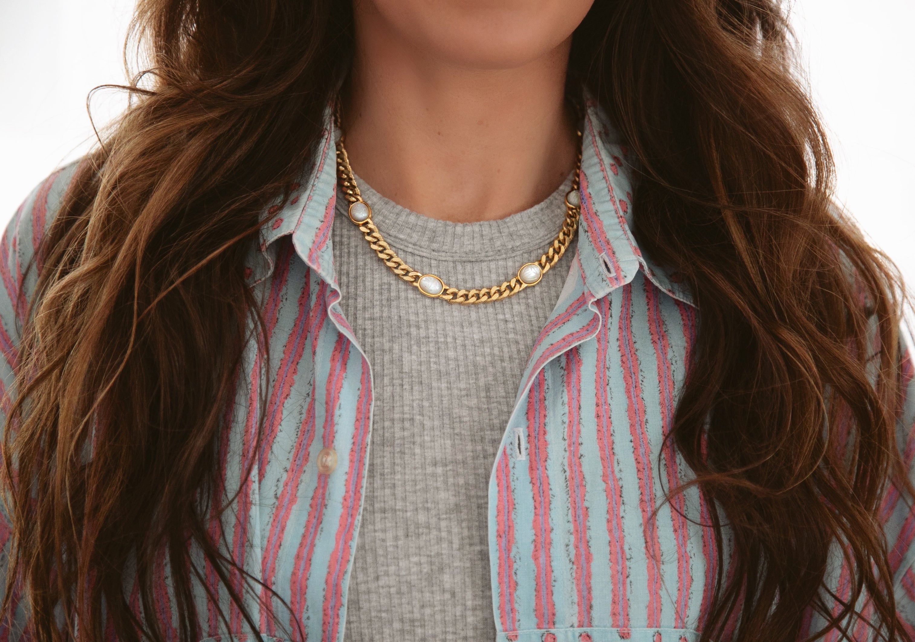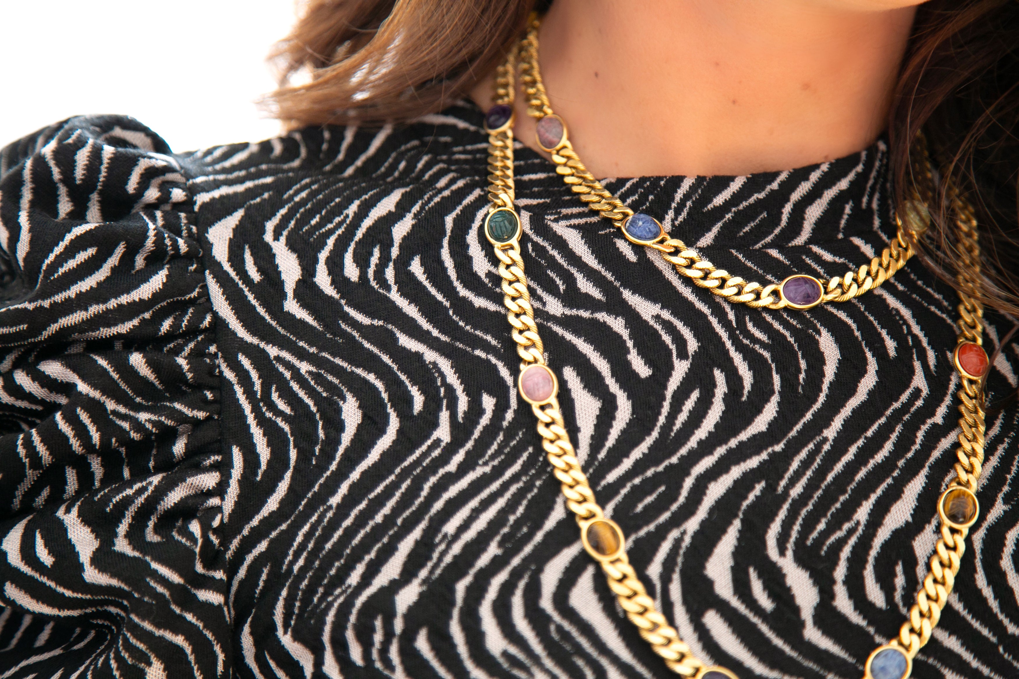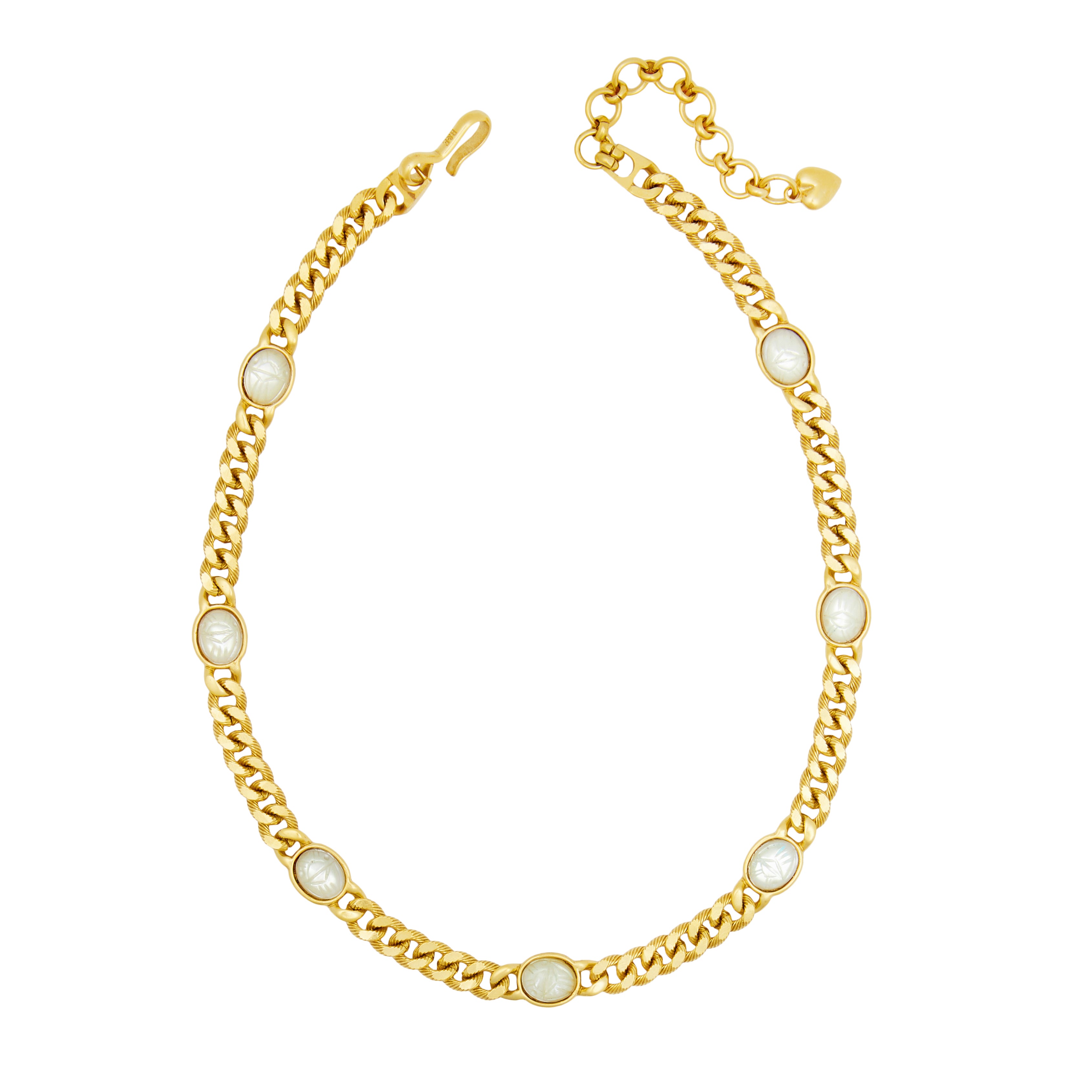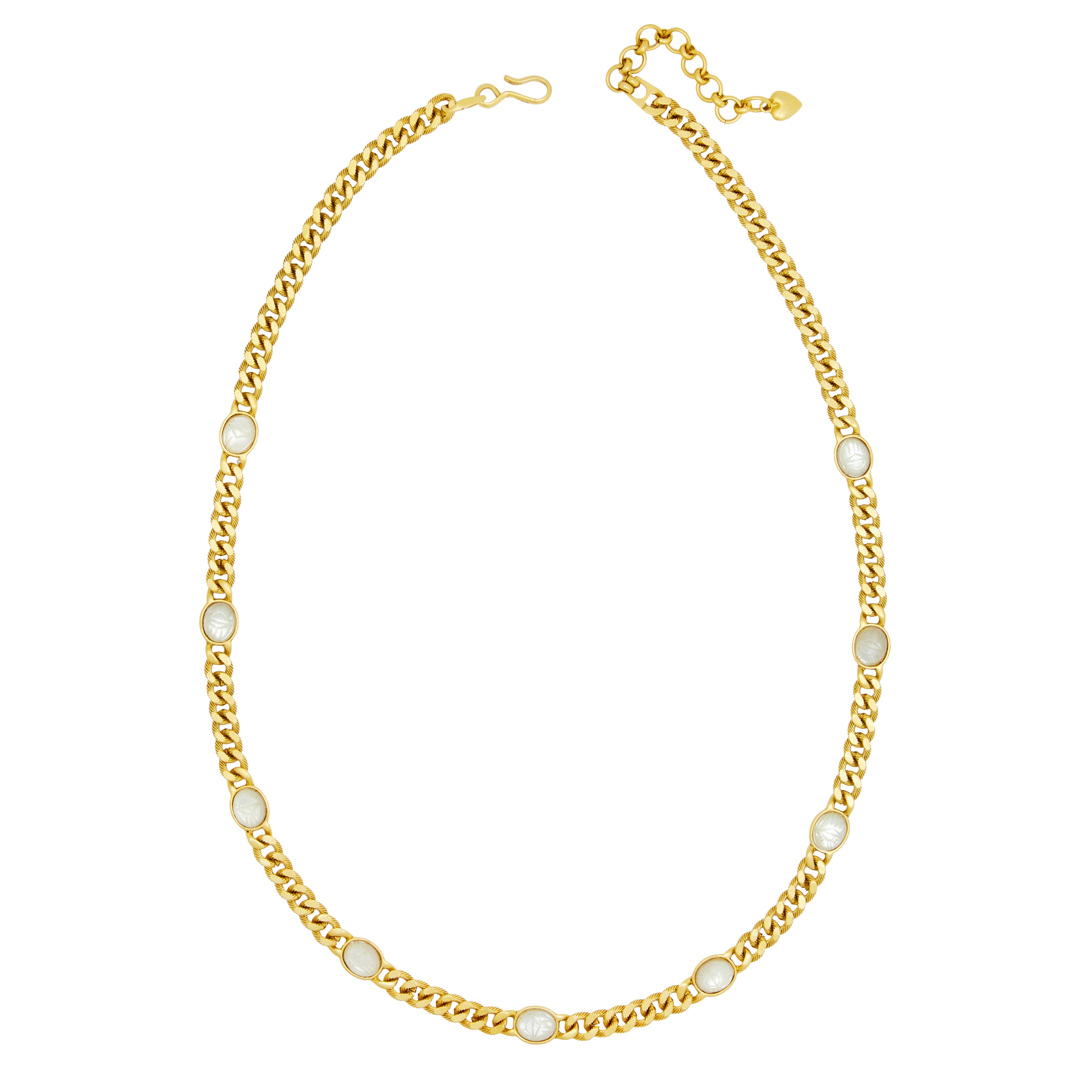 - Oval gemstone carved scarab cabochons set on 24k antique gold plated curb chain