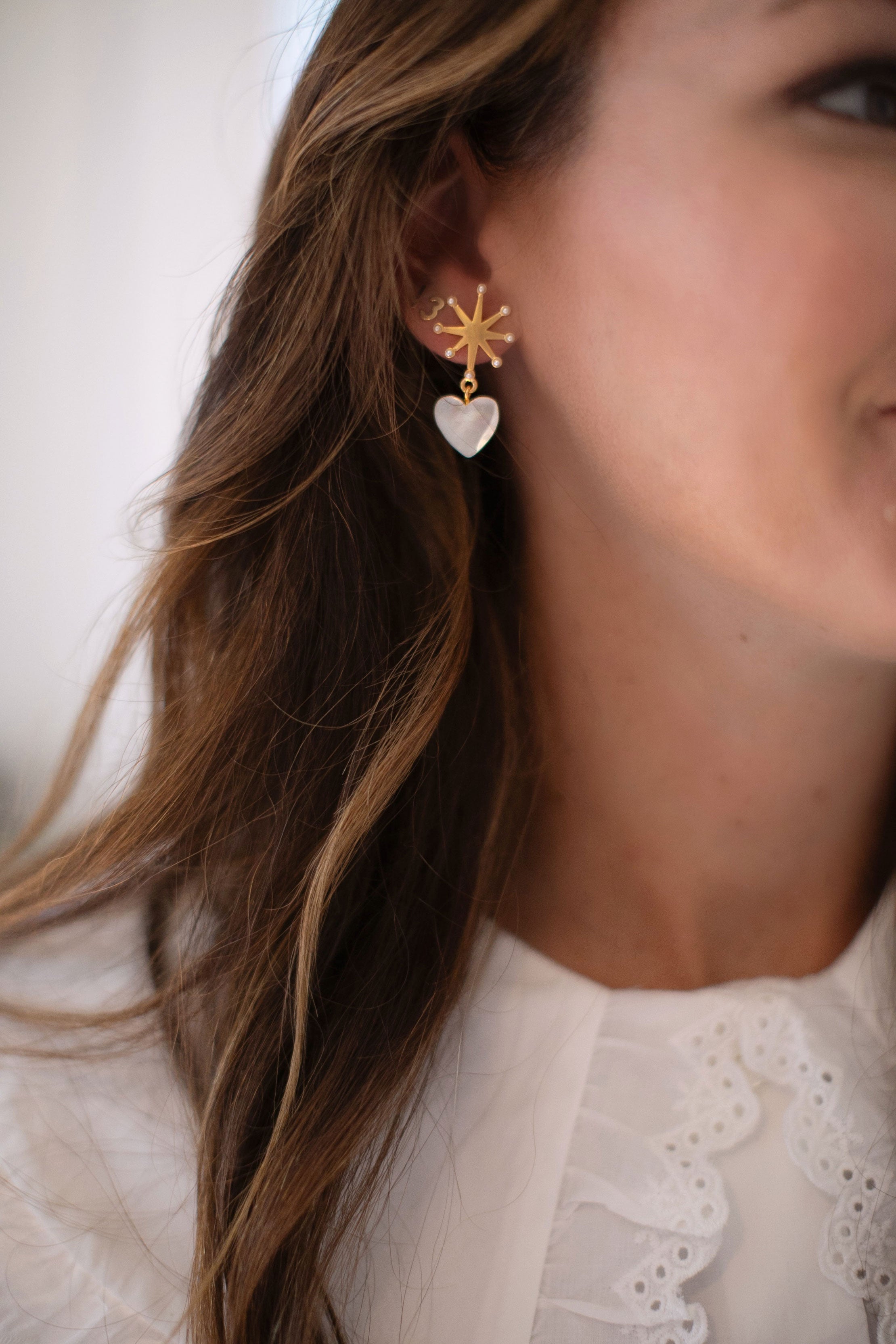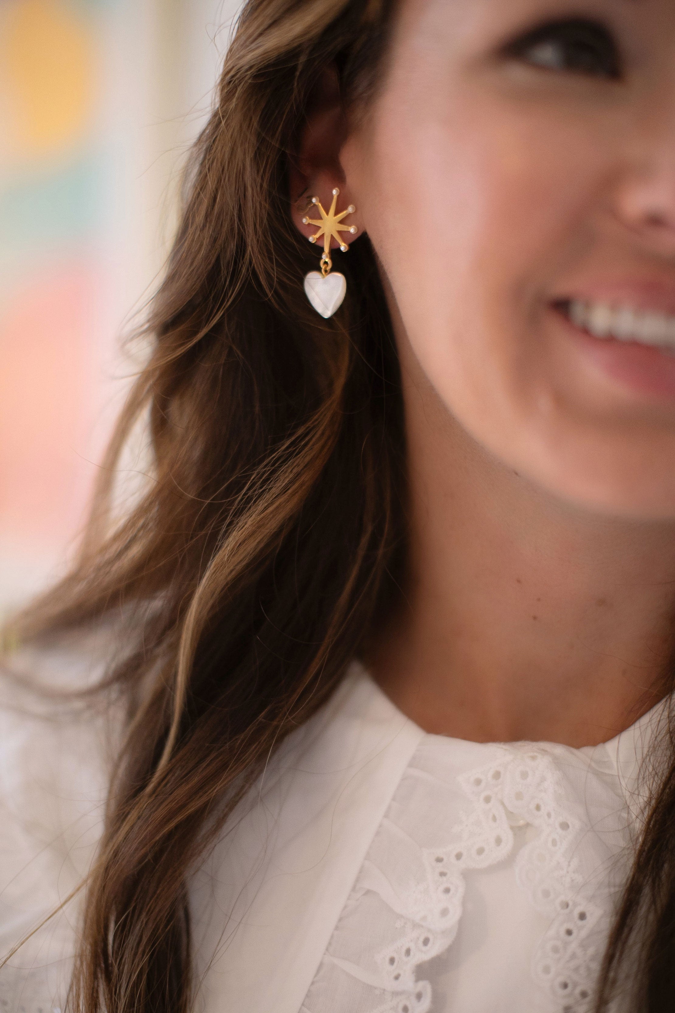 - MOP hearts hang from 24k antique gold plated star toppers adorned with mini freshwater pearls on stainless steel hypoallergenic posts