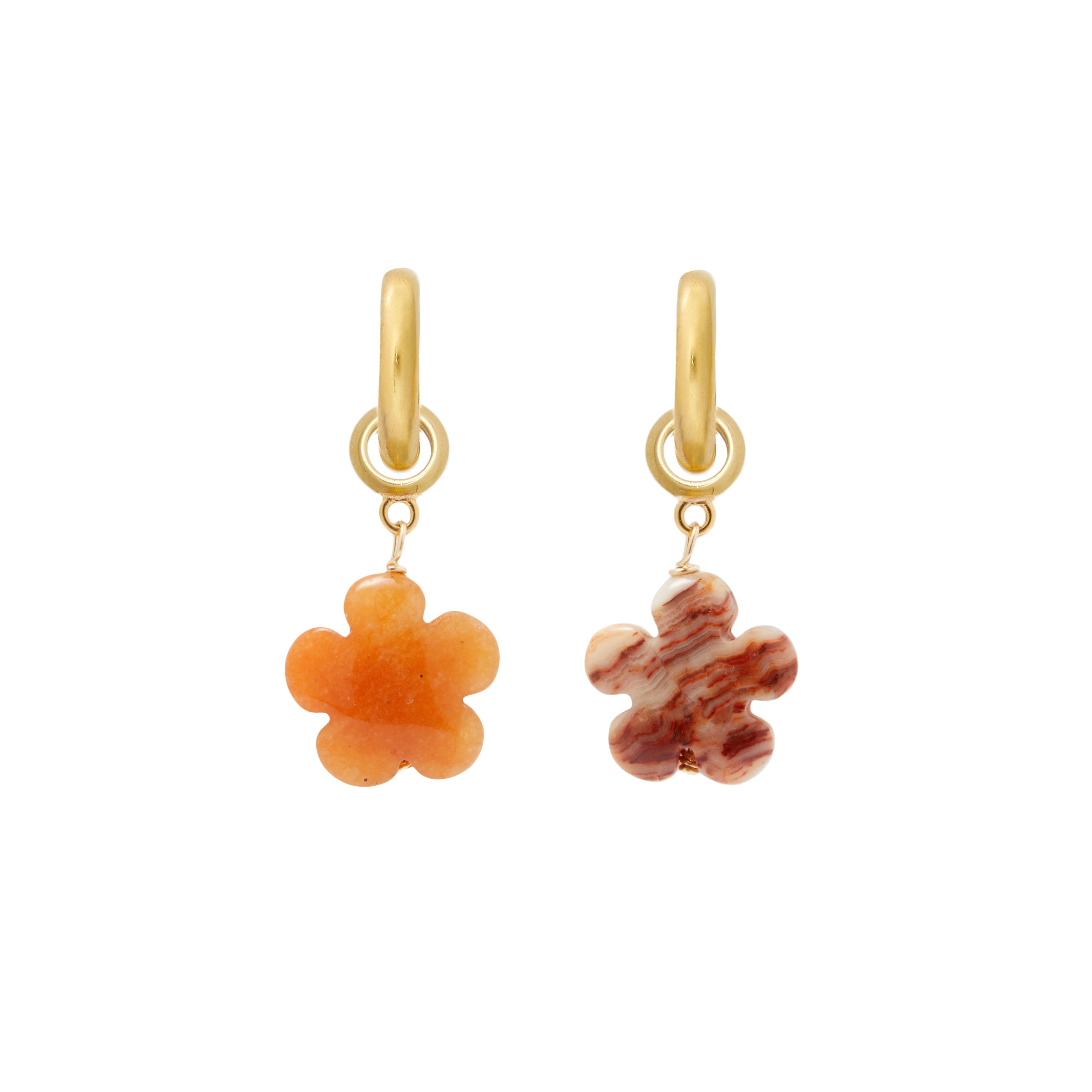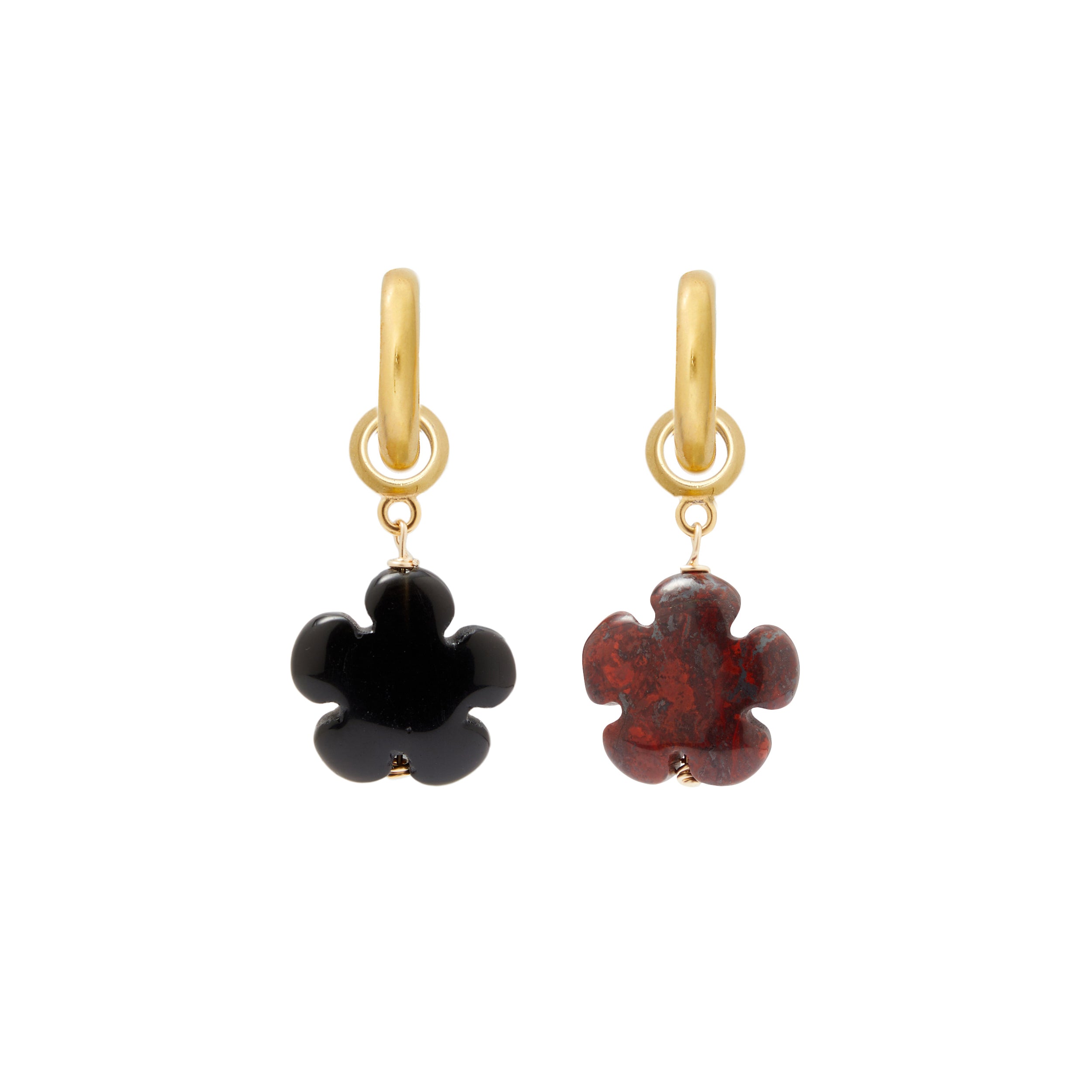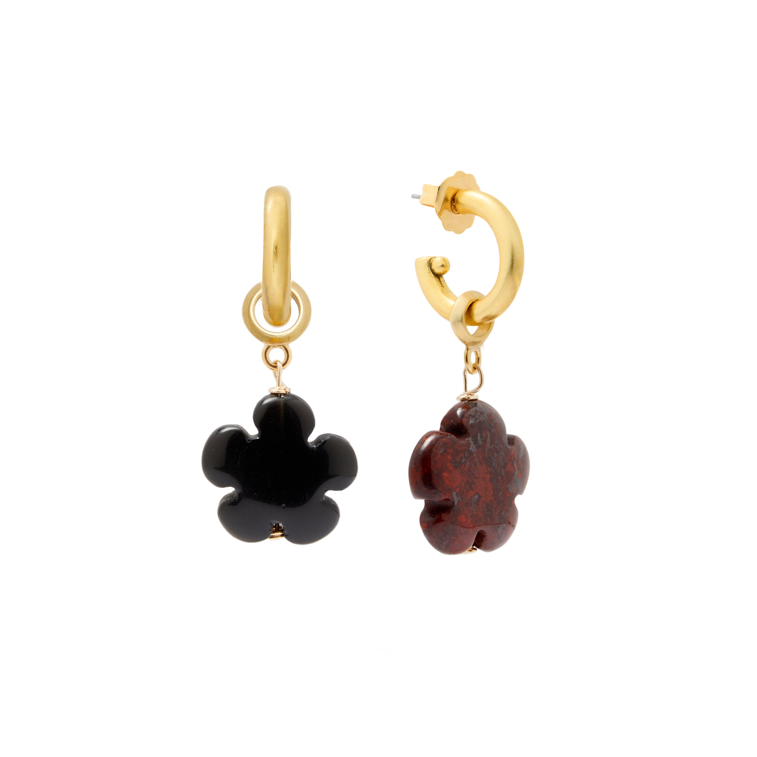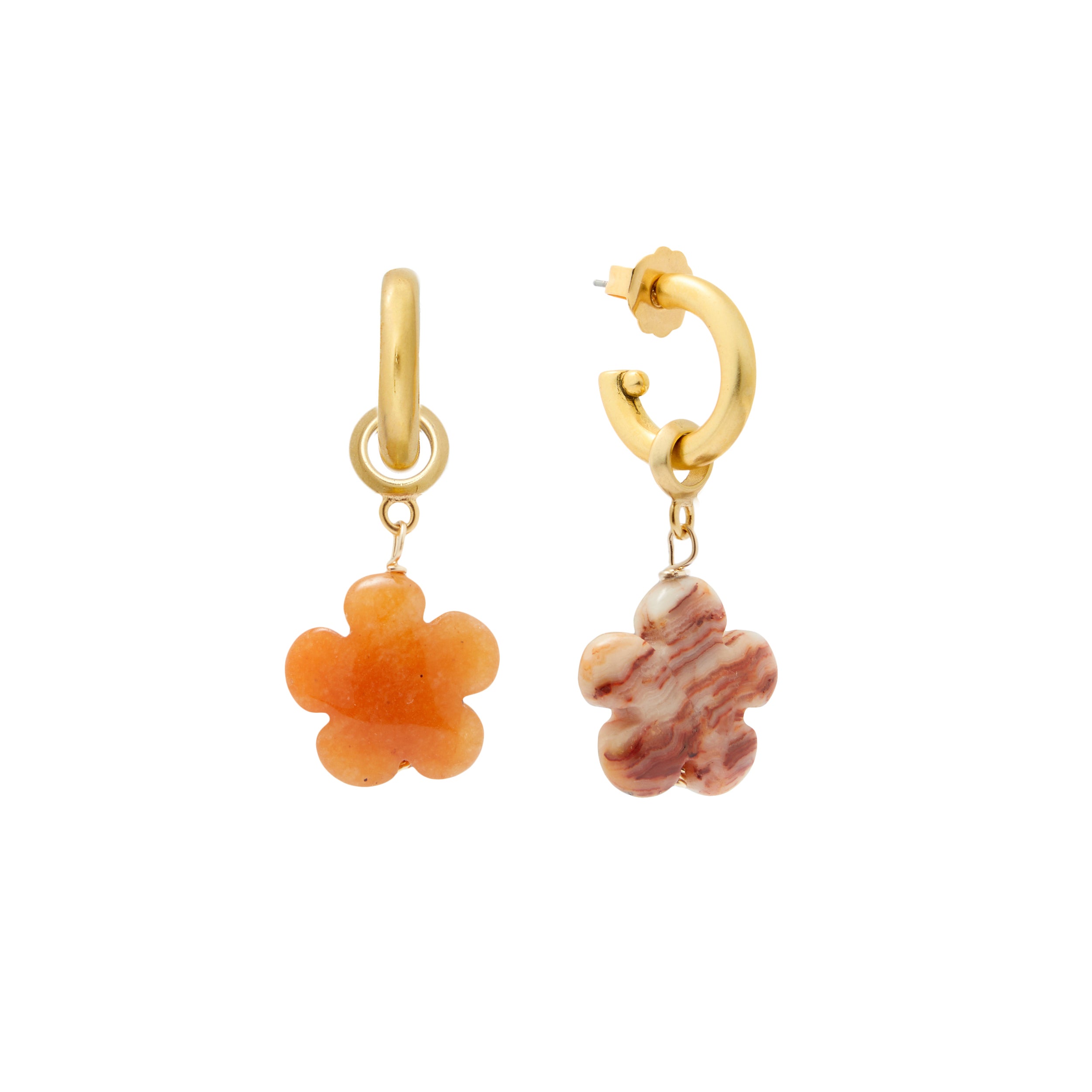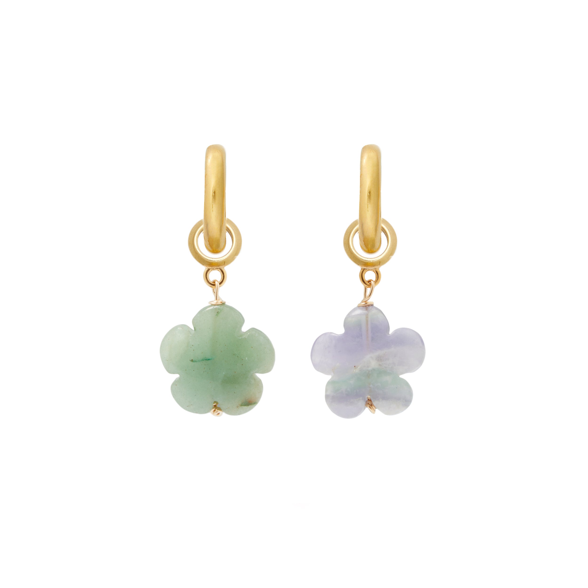 - Semi-precious gemstone flowers hang from 24k antique gold plated hoops on stainless steel hypoallergenic posts