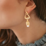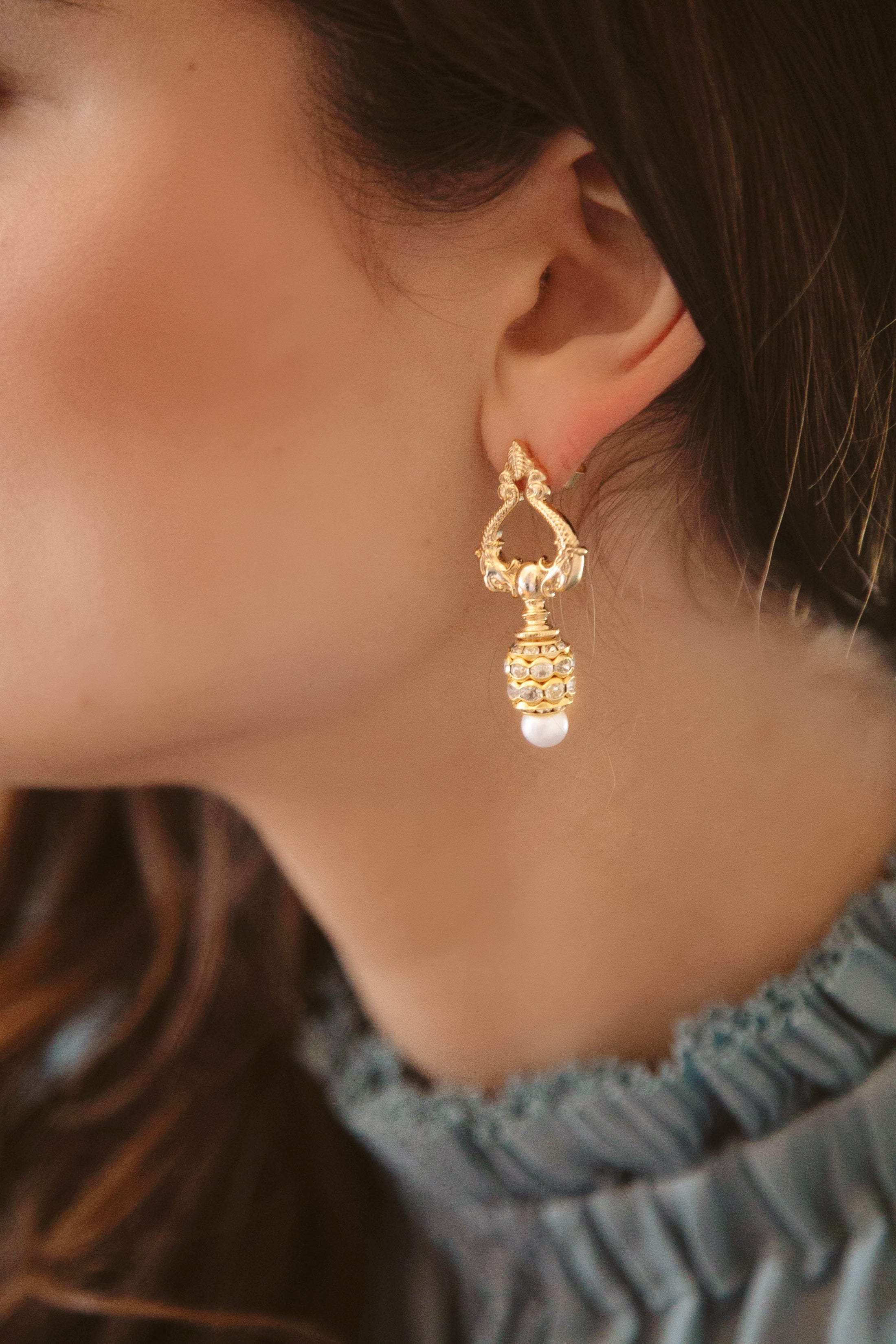 - A 24k antique gold plated tete-a-tete dolphin topper featuring a four tiered crystal rondelle and a freshwater pearl on stainless steel hypoallergenic posts