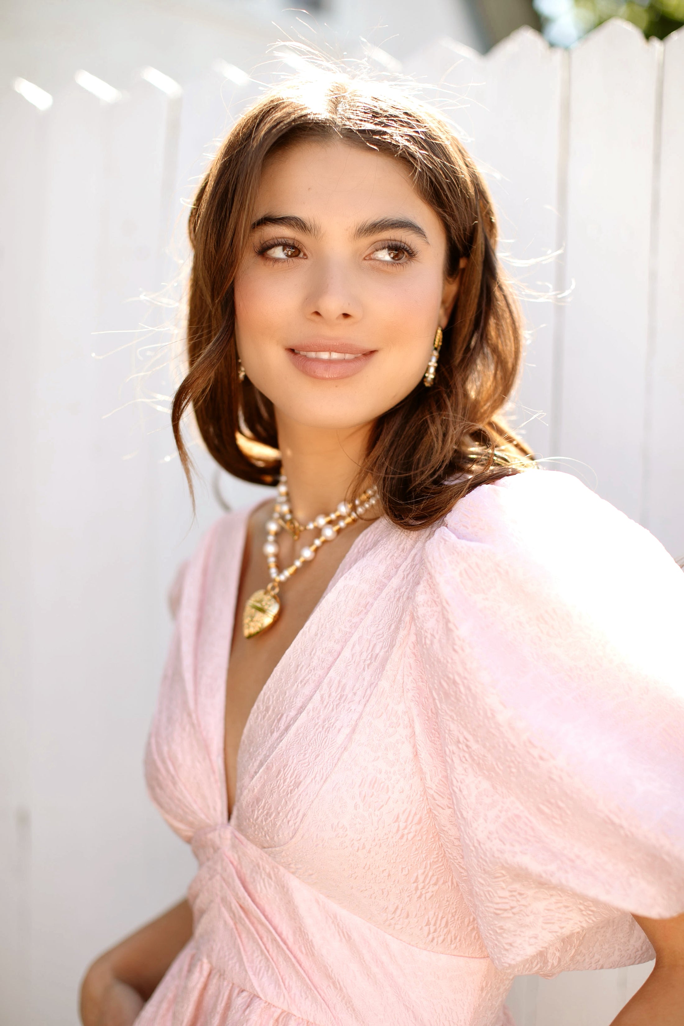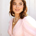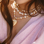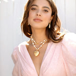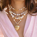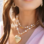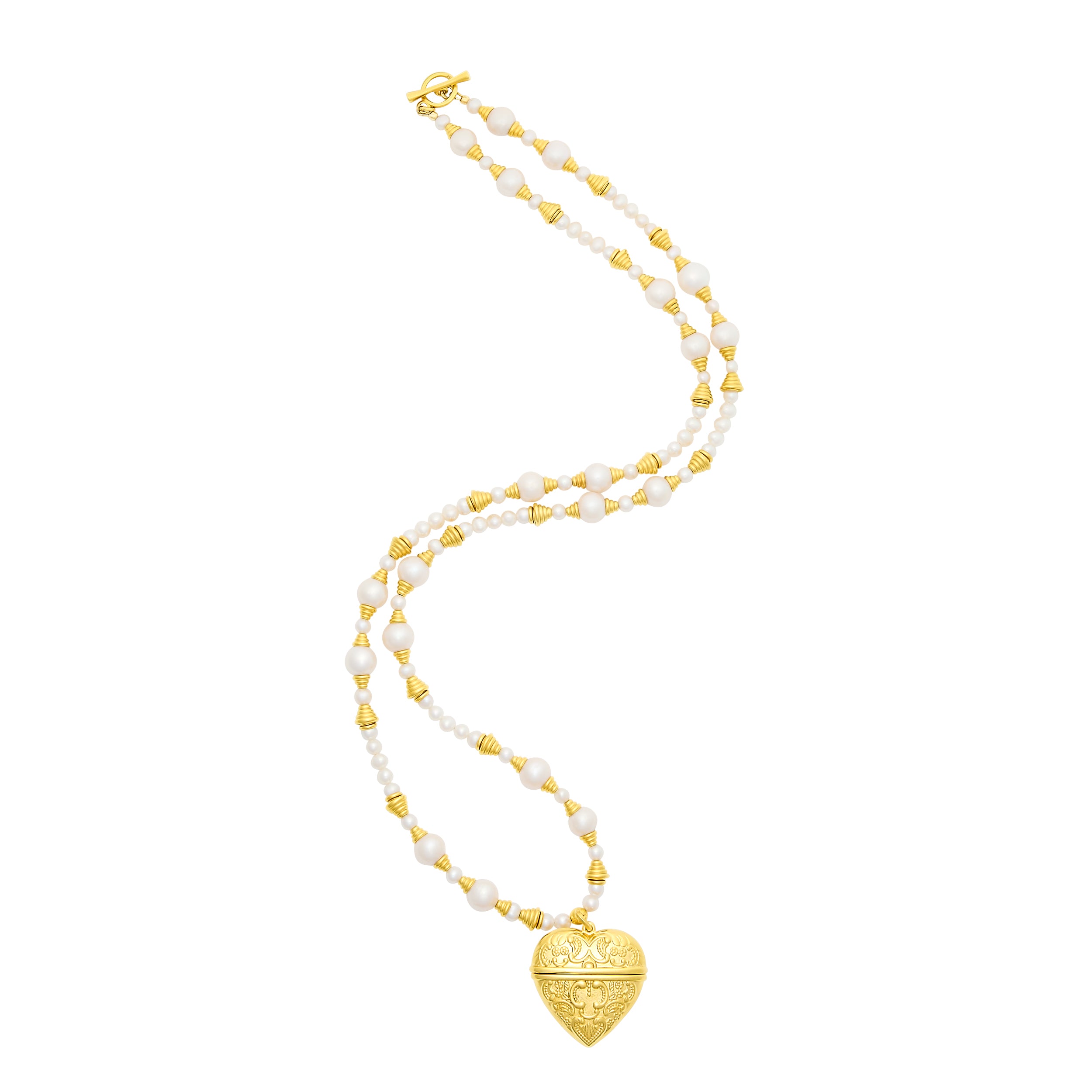 - A 24k antique gold plated intricate heart locket hangs from a strand of freshwater pearls and 24k antique gold plated brass cone beads