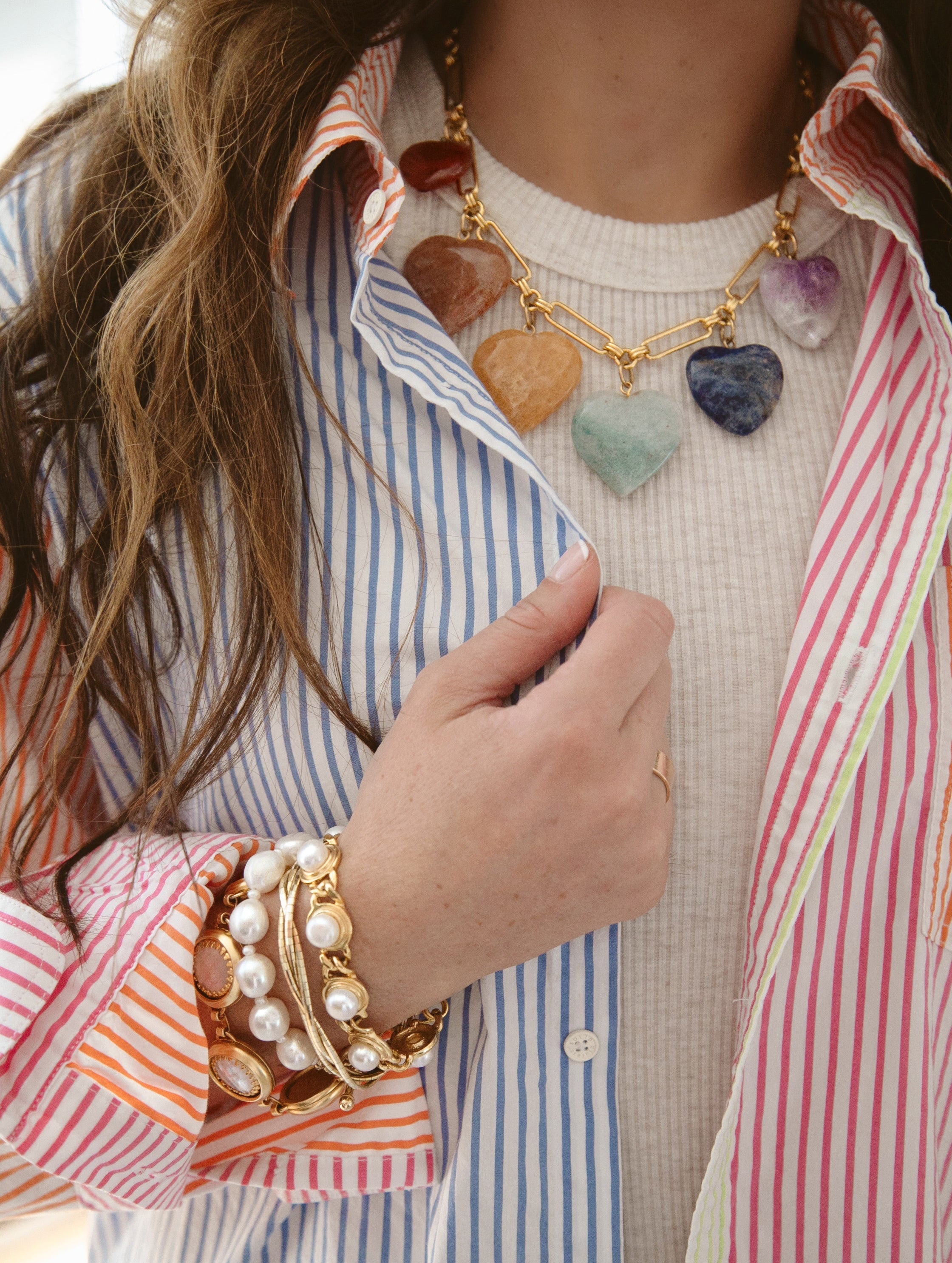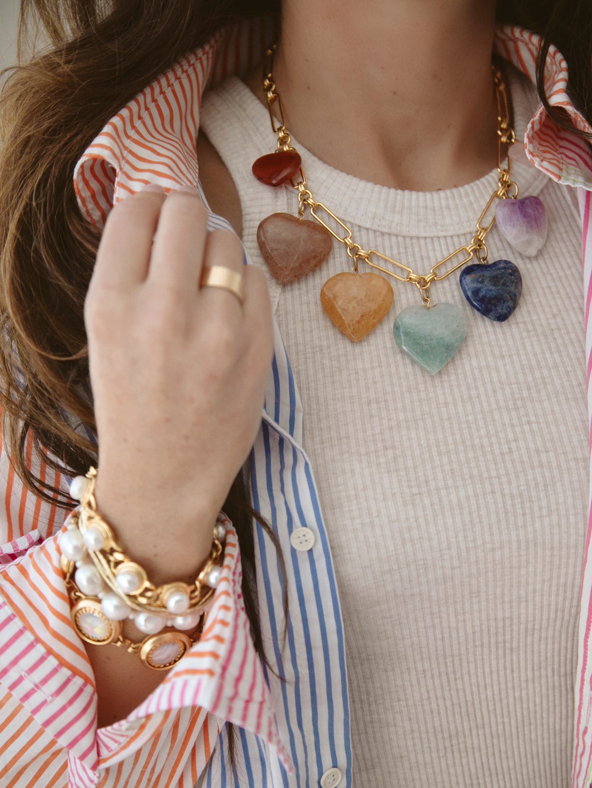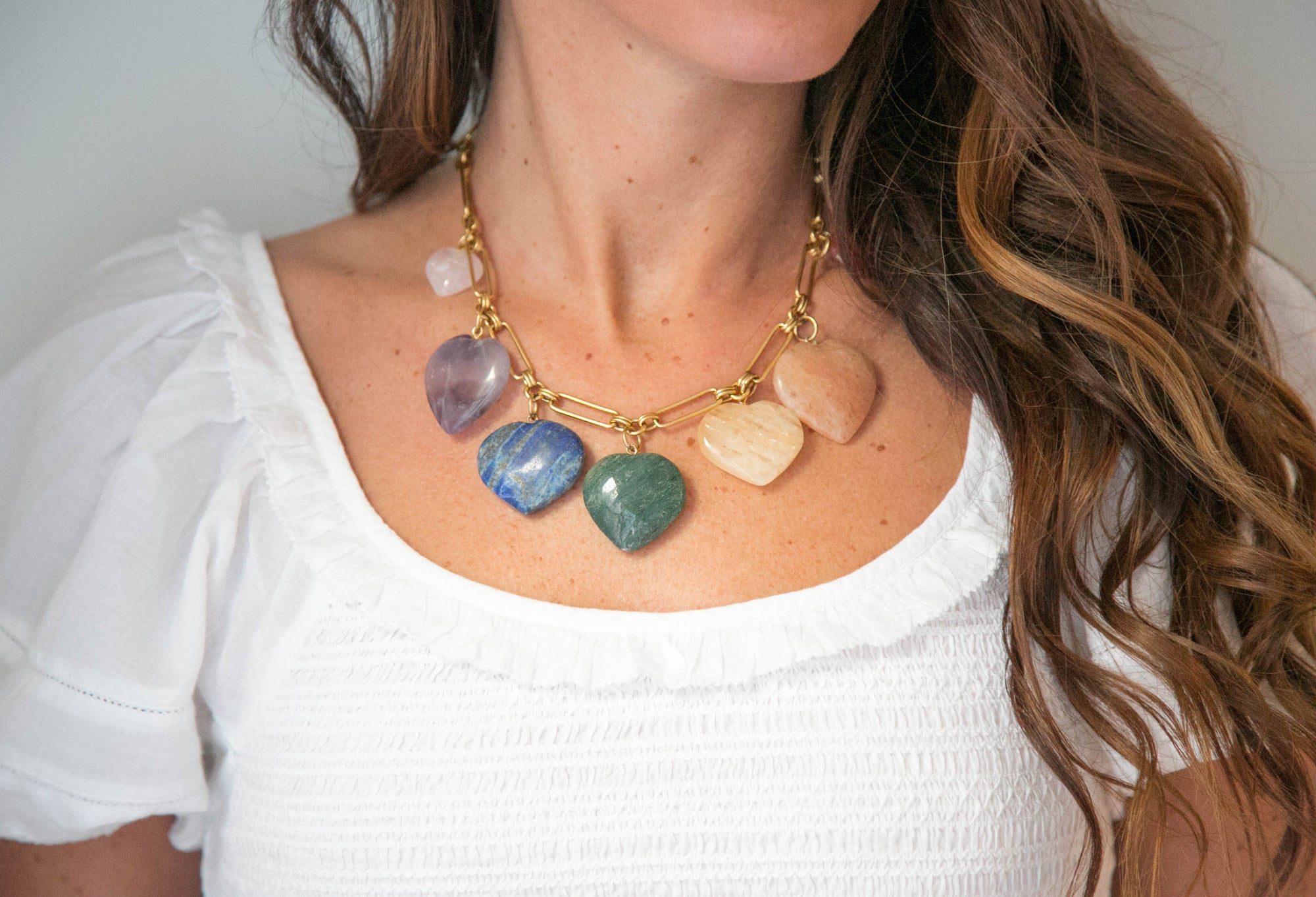 - 24k antique gold plated brass chain adorned with semi-precious hearts