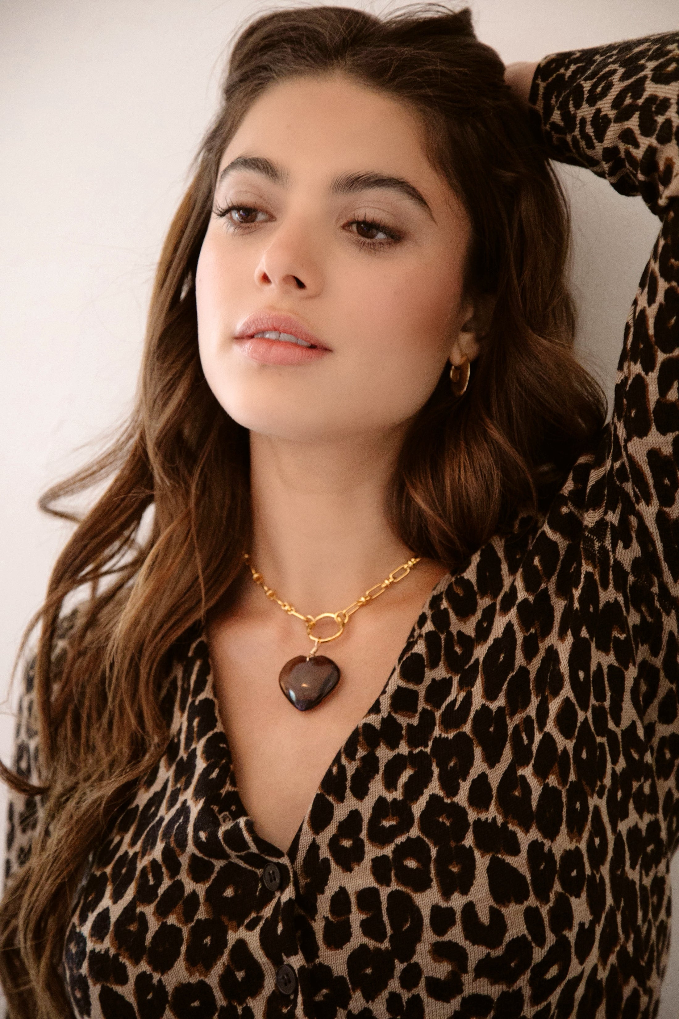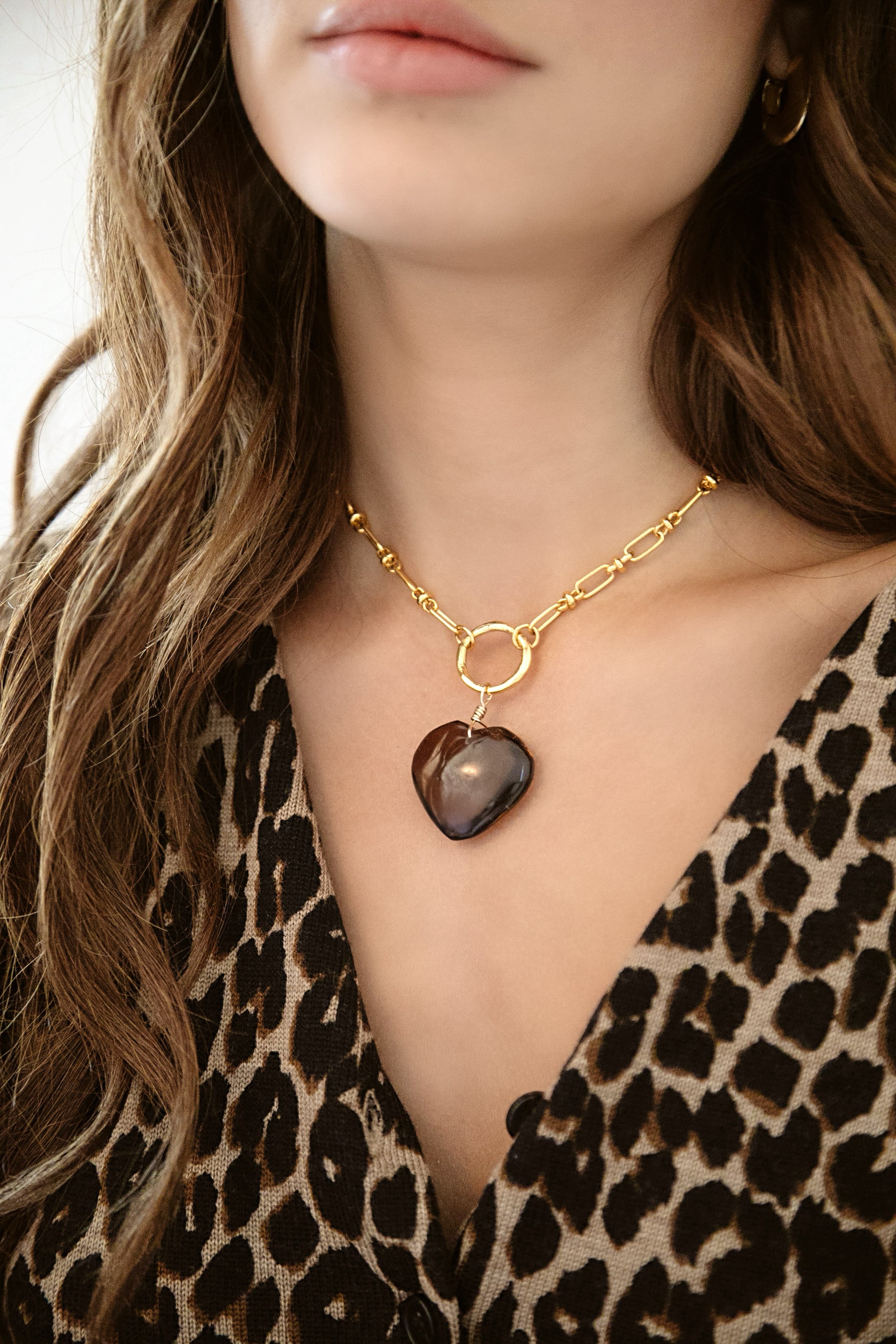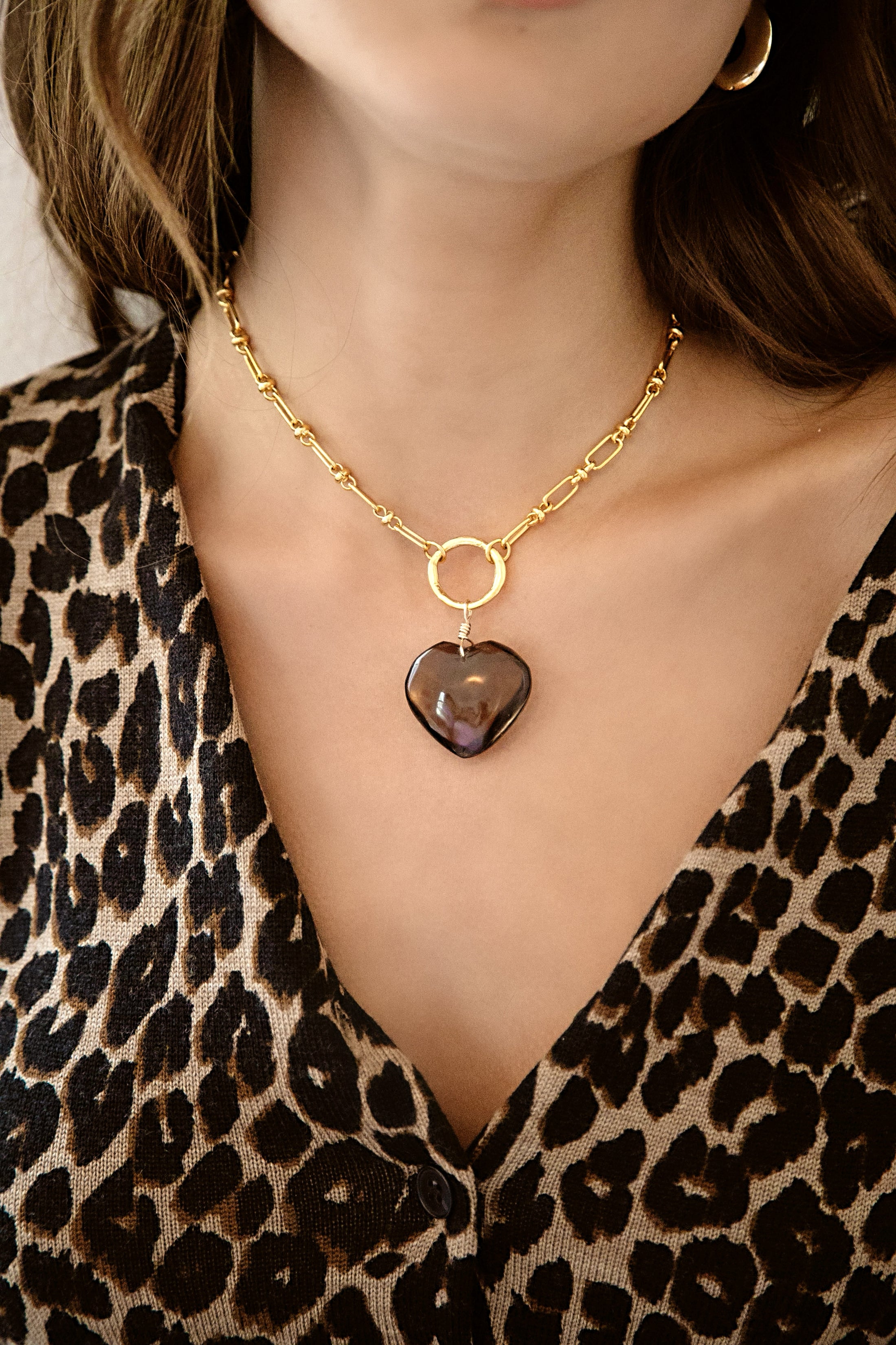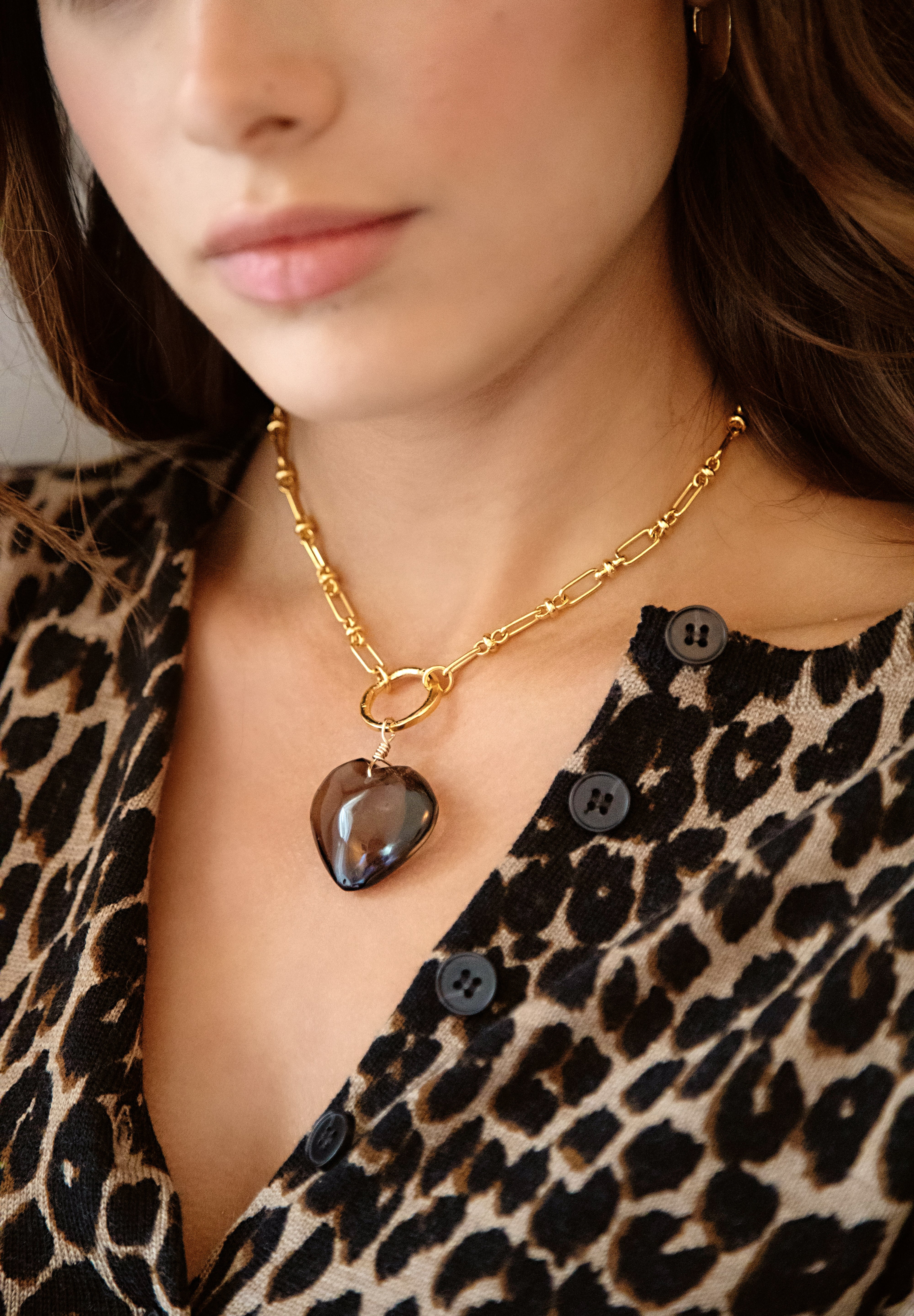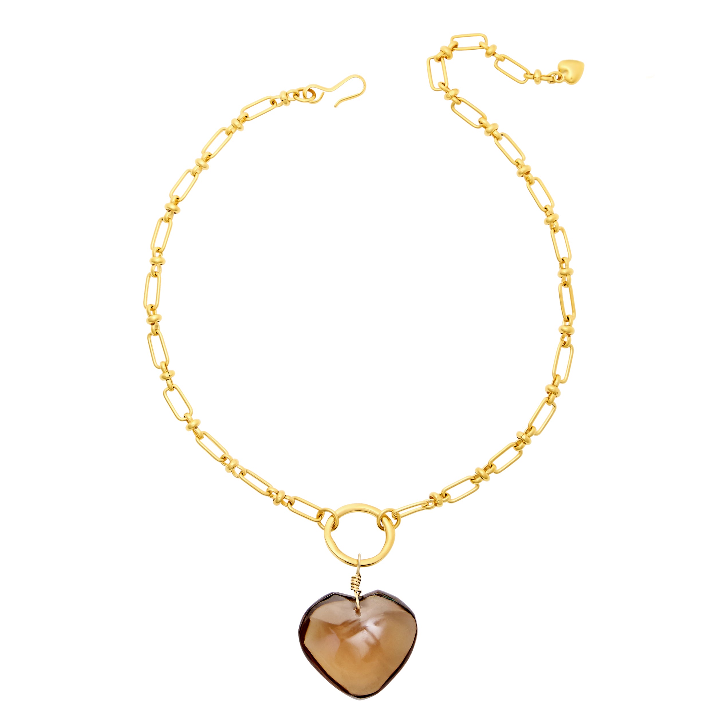 - 24k antique gold plated brass chain adorned with a smoky quartz heart