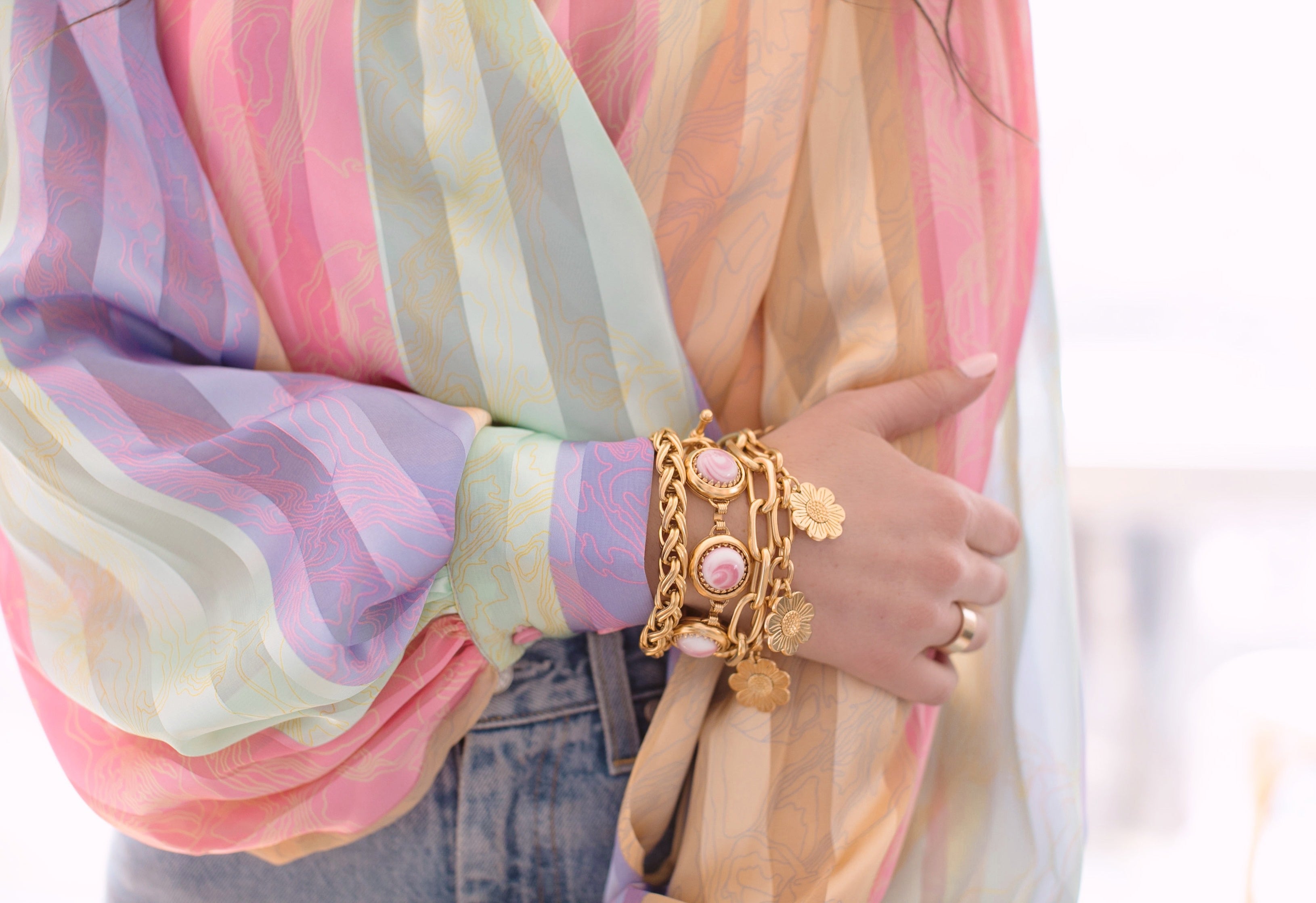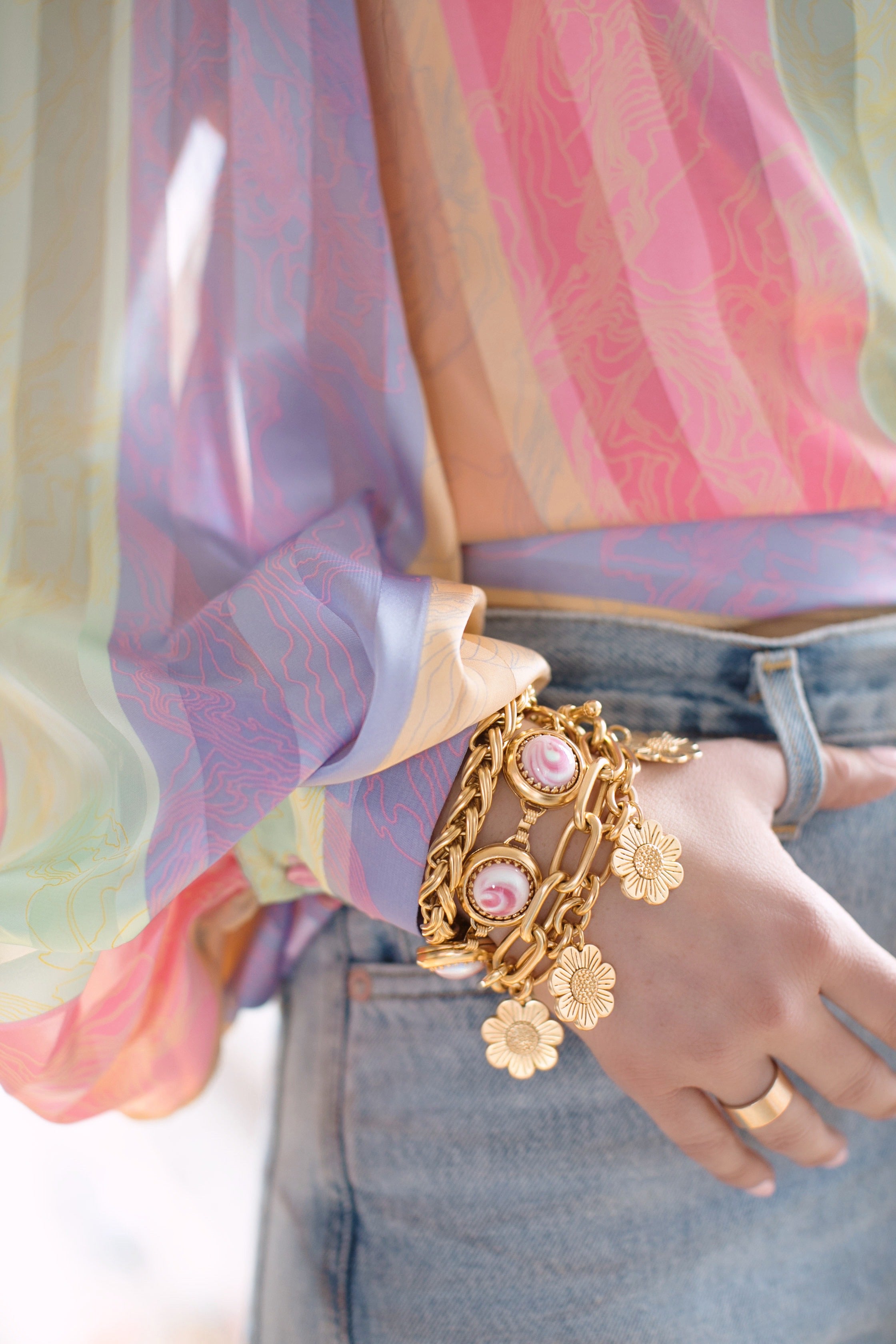 - 24k antique gold plated brass flower charms hang from a 24k antique gold plated chain