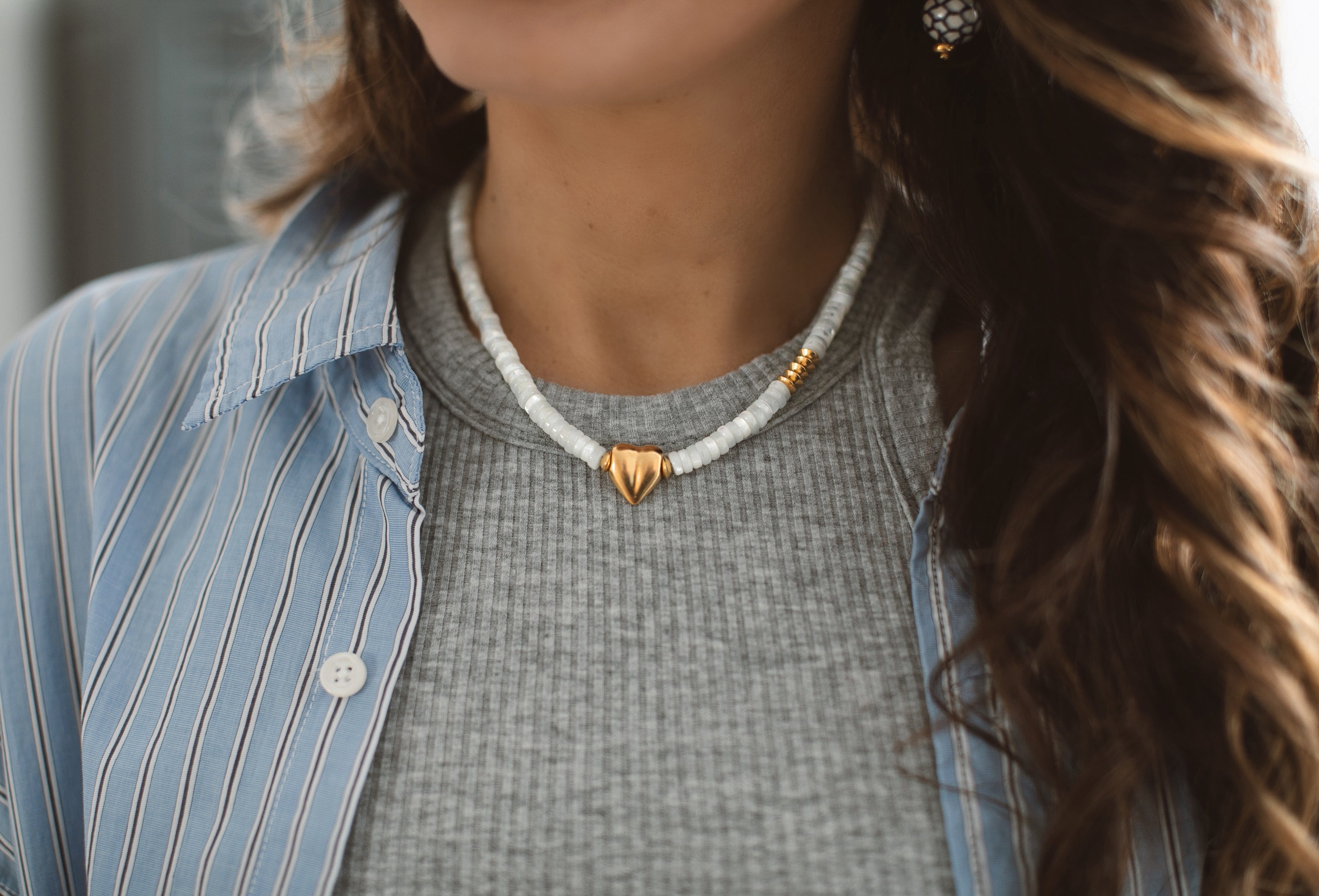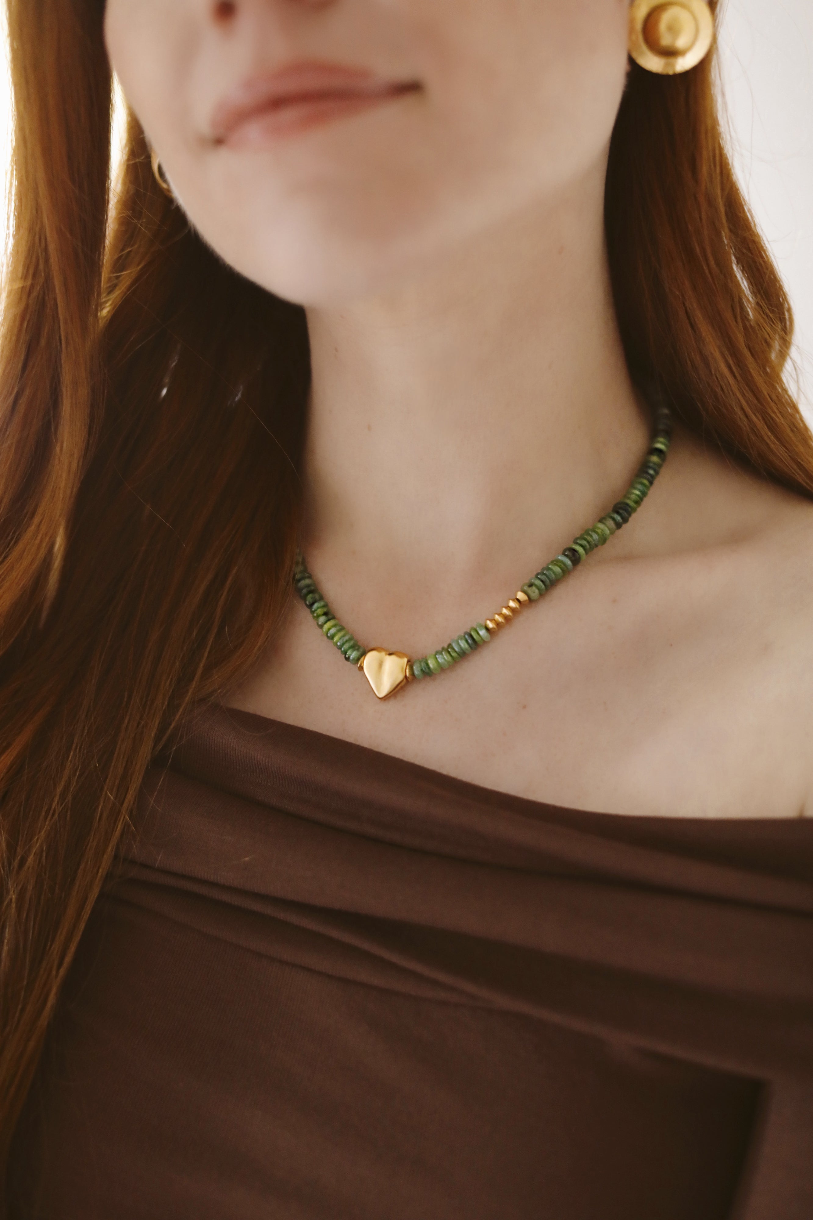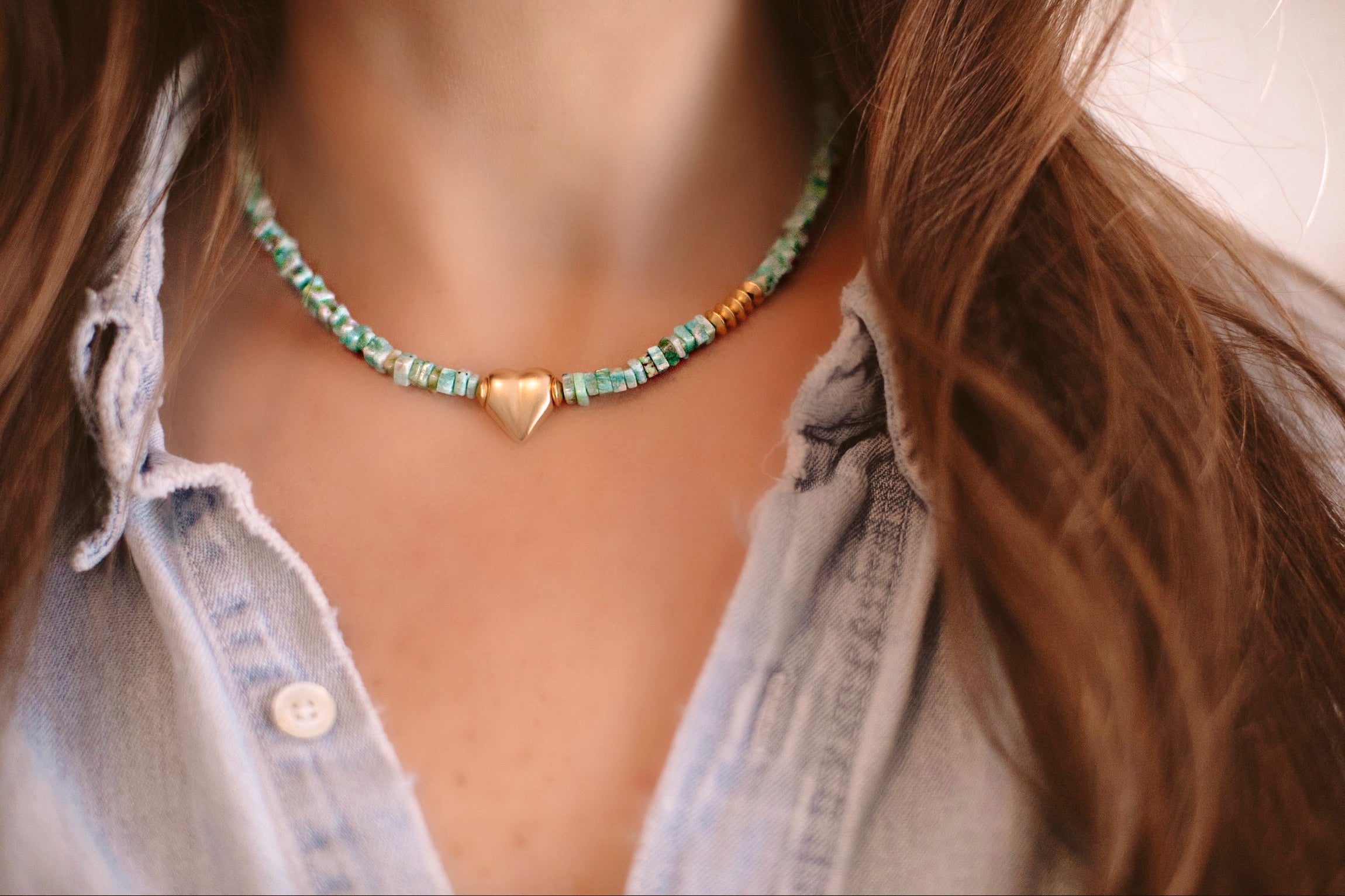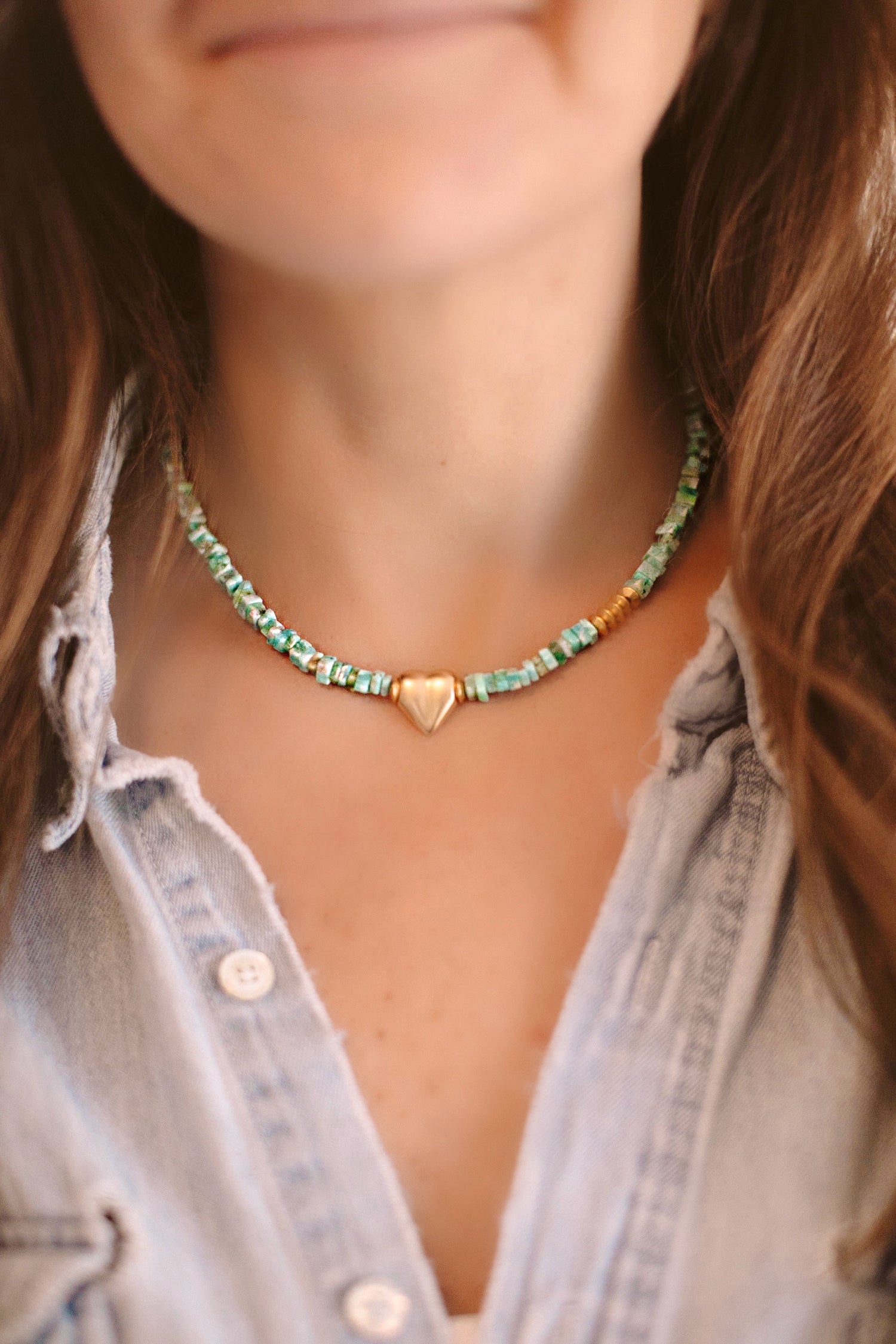 - A strand of hand cut multi gemstone rondelle beads, MOP Heishi beads, Amazonite gemstone beads or Jade gemstone beads adorned with a 24k antique gold plated heart bead and disc beads