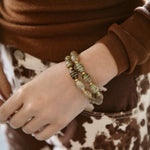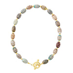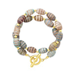 - A double wrap bracelet of striped Tibetan agate oval beads and 24k antique gold plated spacer beads