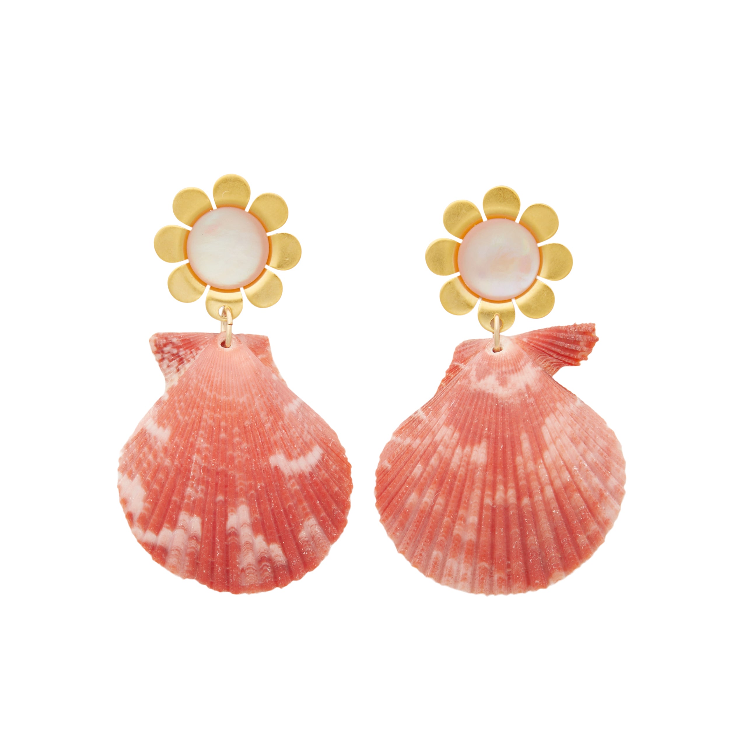 - Pectin shells hang from 24k antique gold plated flower toppers with Mother of Pearl cabochons on stainless steel hypoallergenic posts