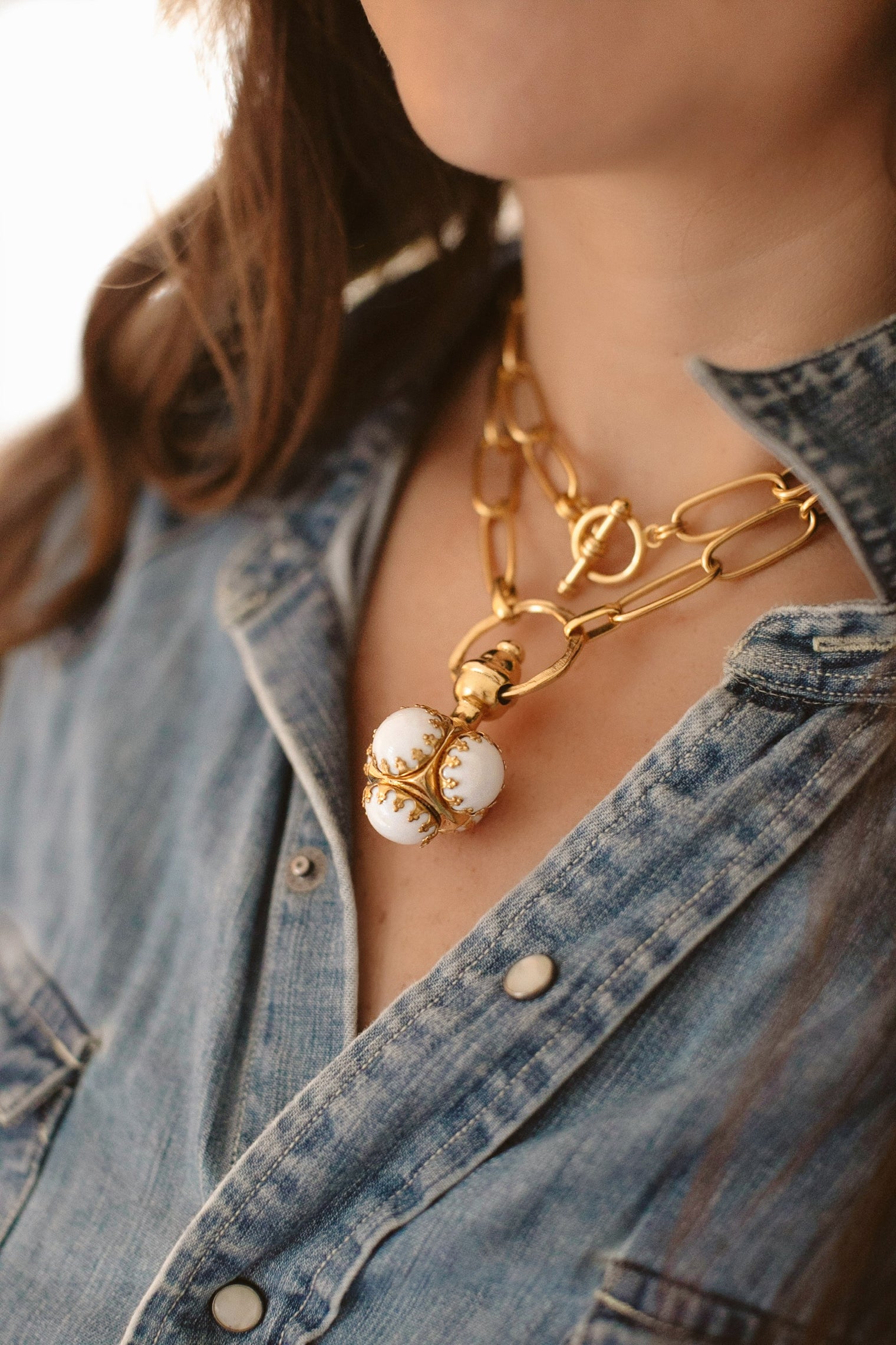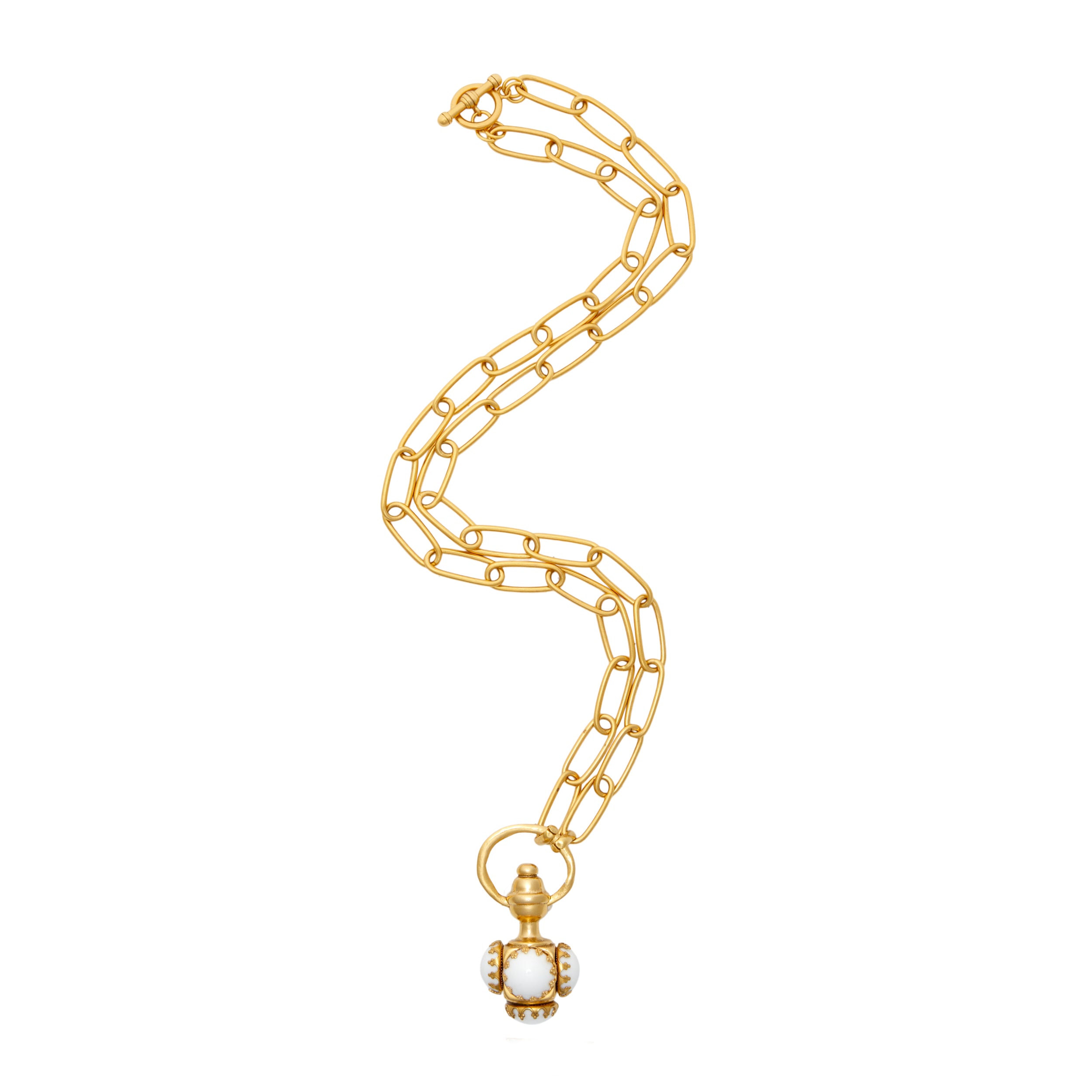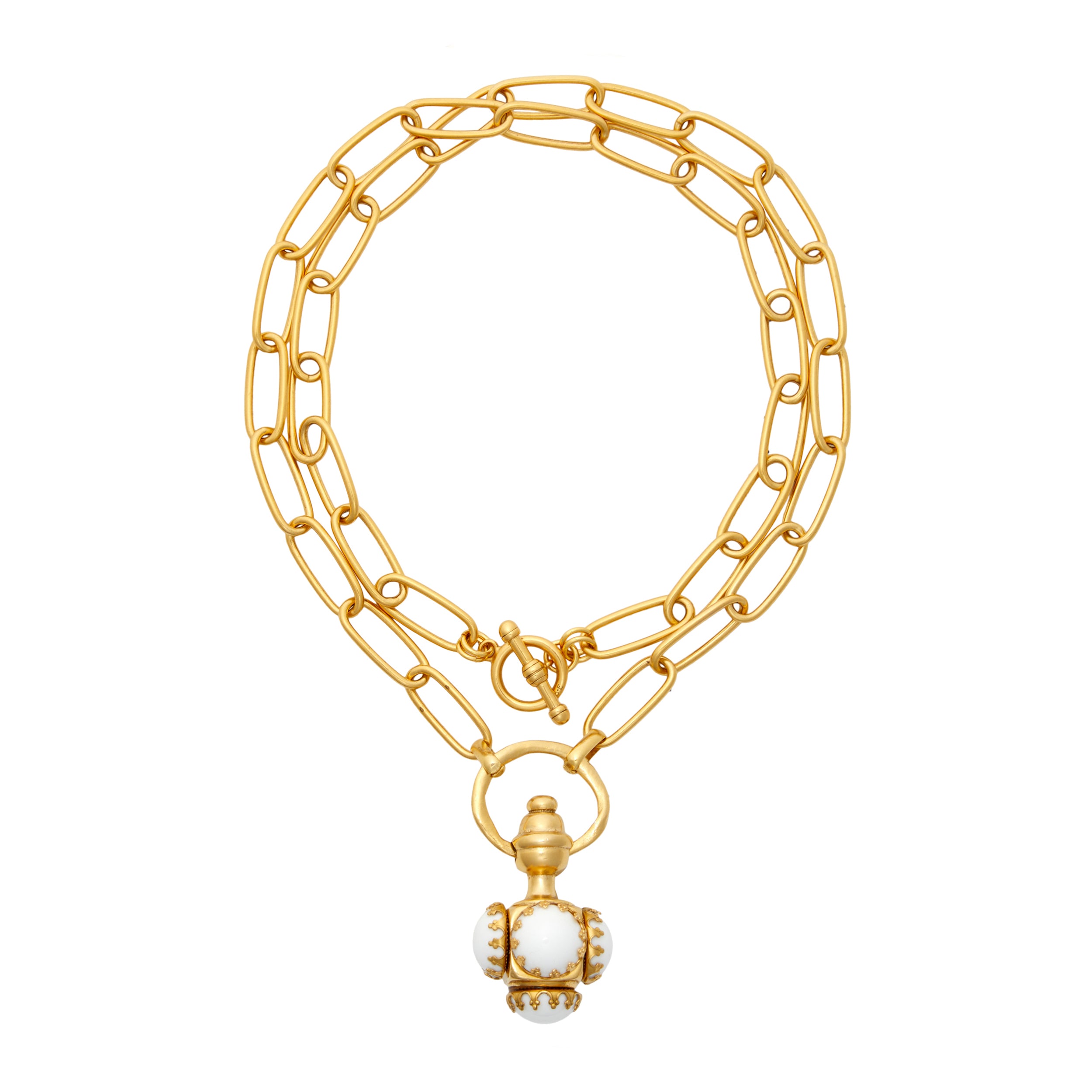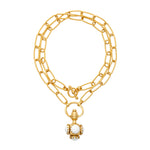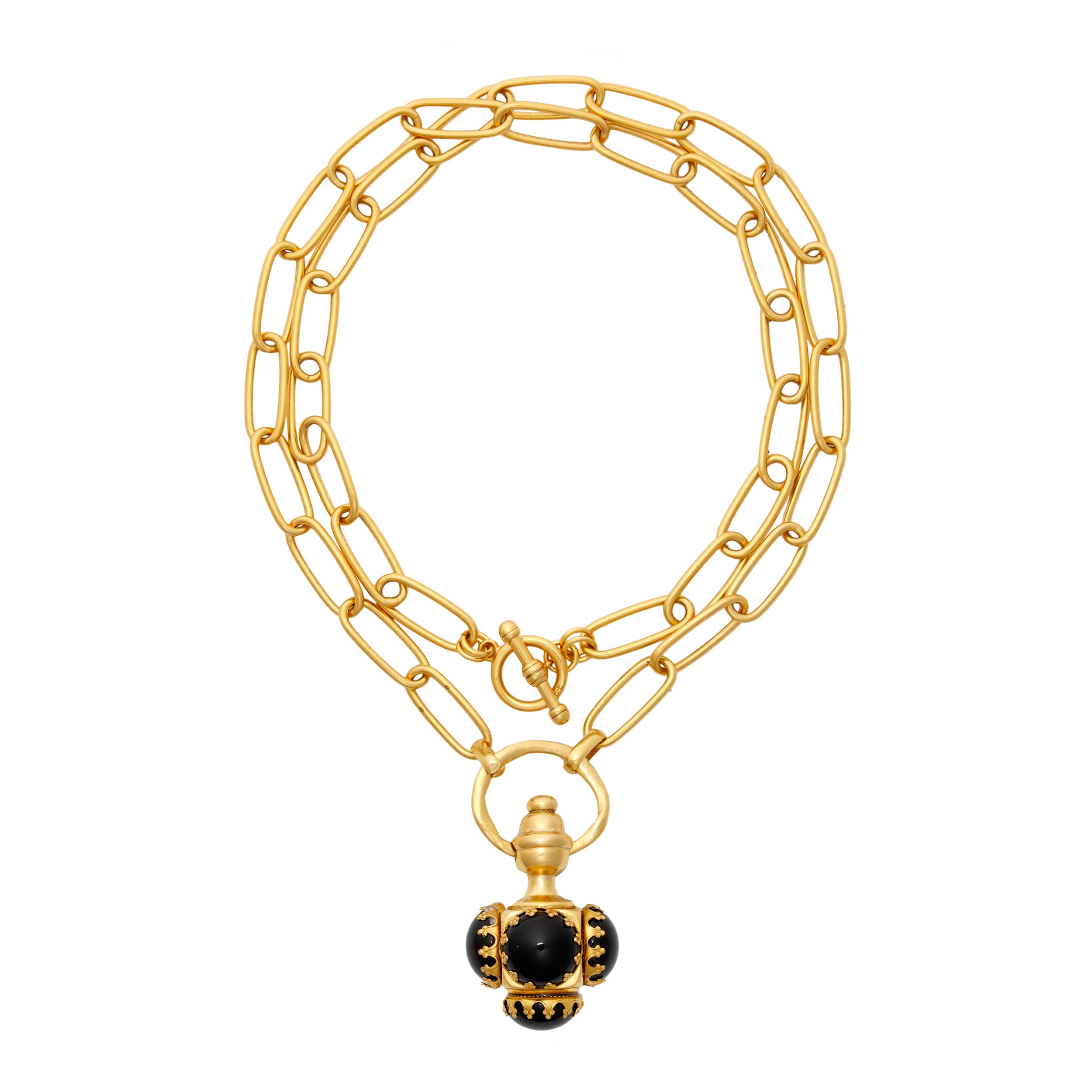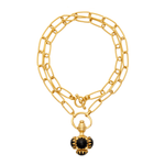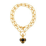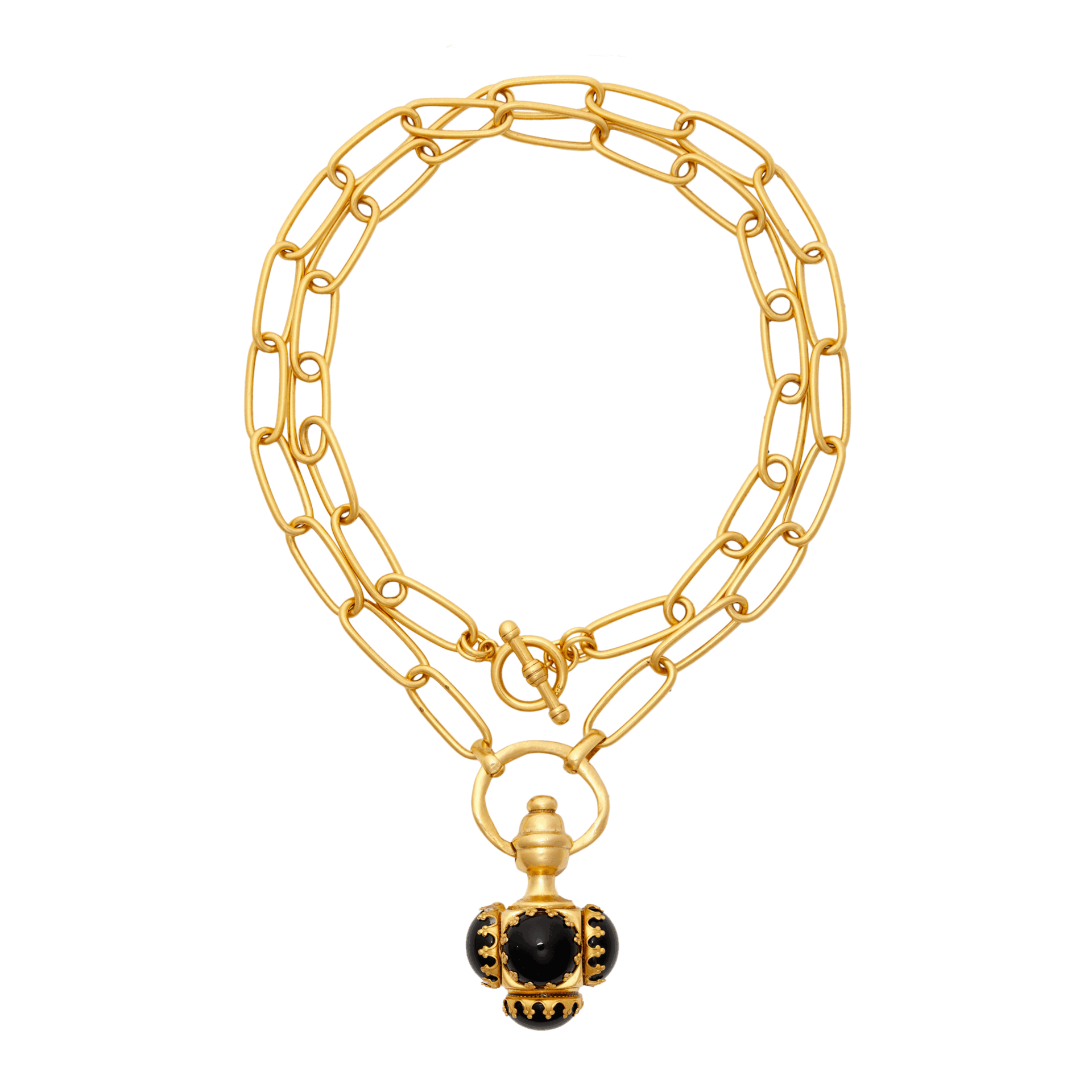 - 24k antique gold plated pendant adorned with vintage glass cabochons hangs from 24K antique gold plated chain