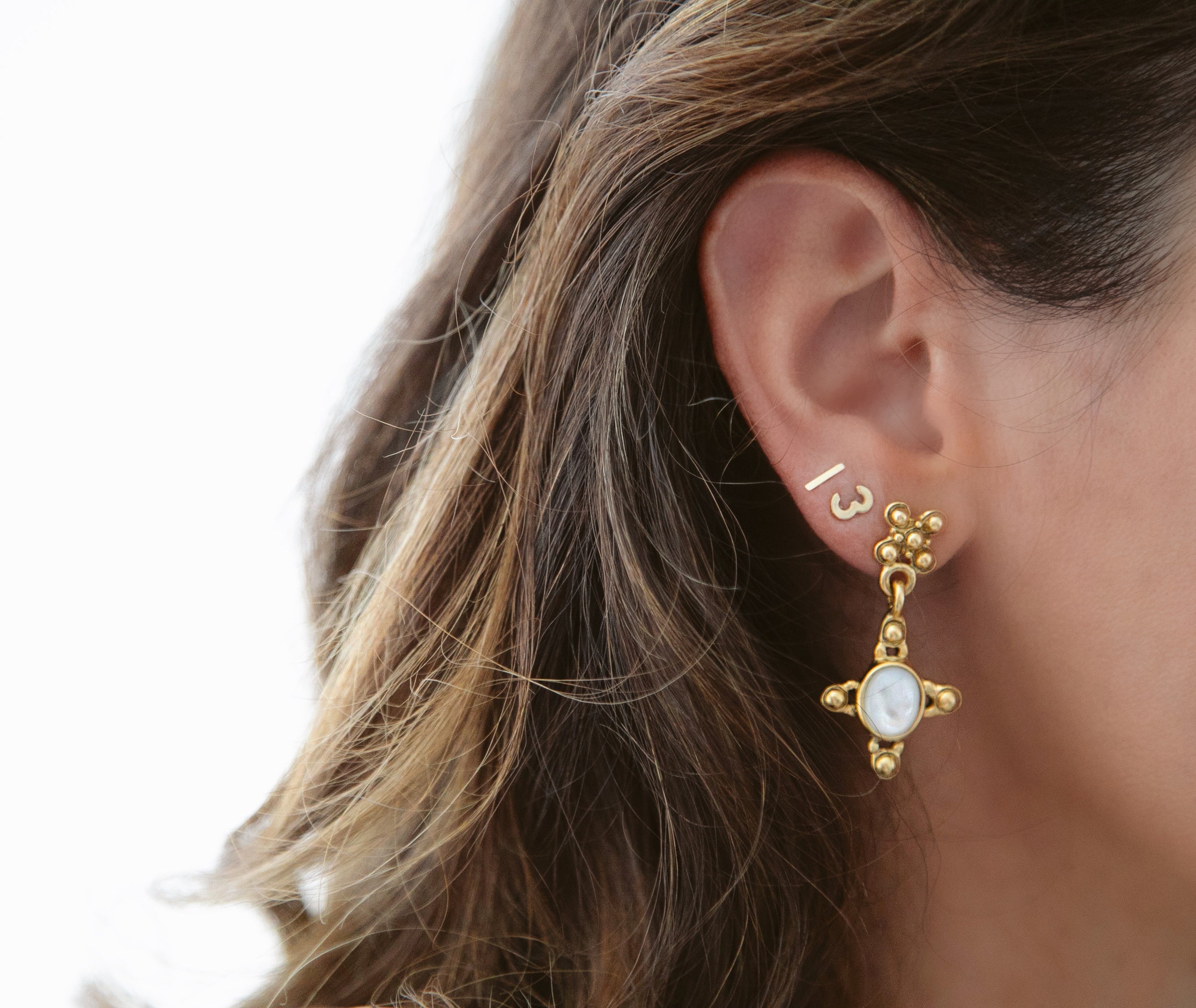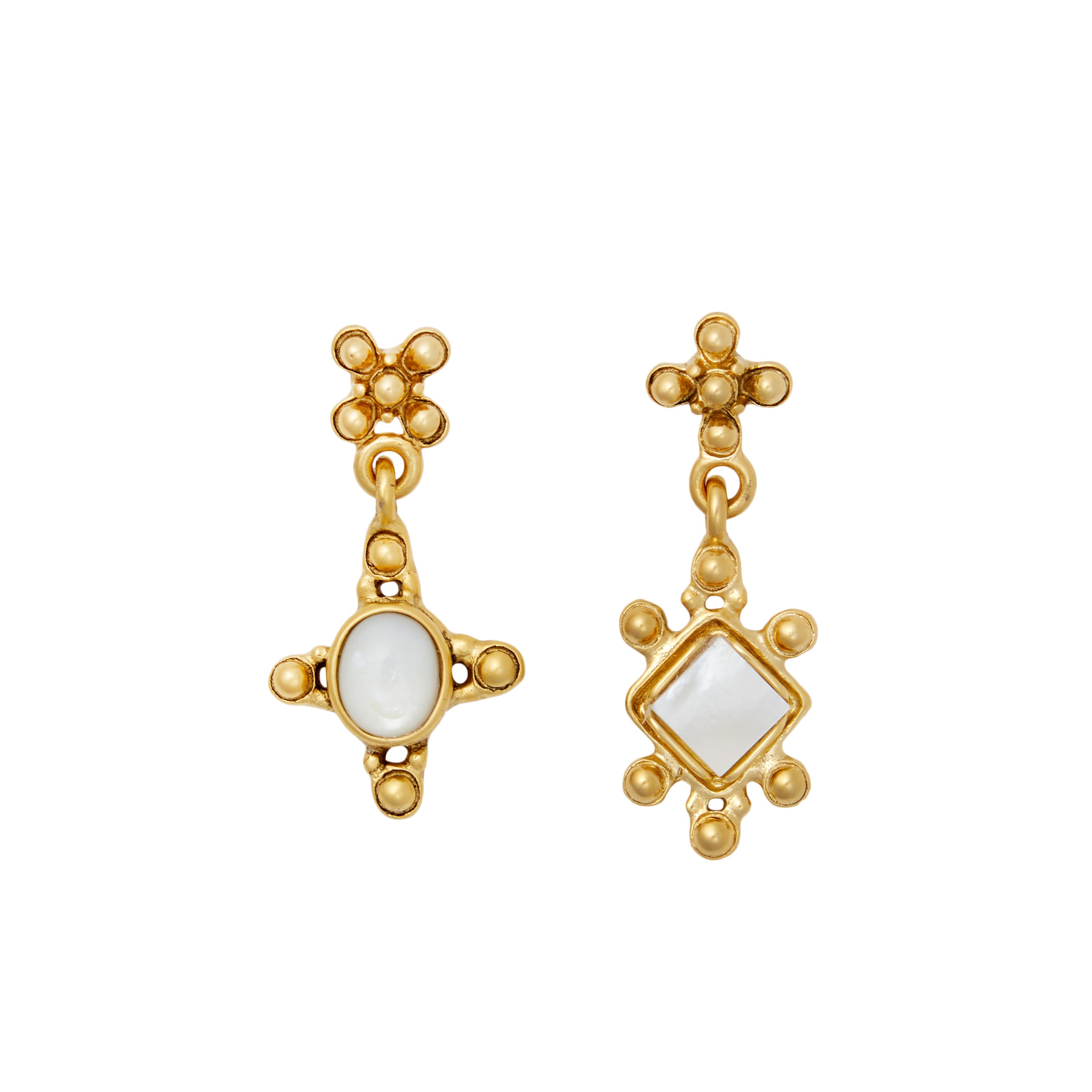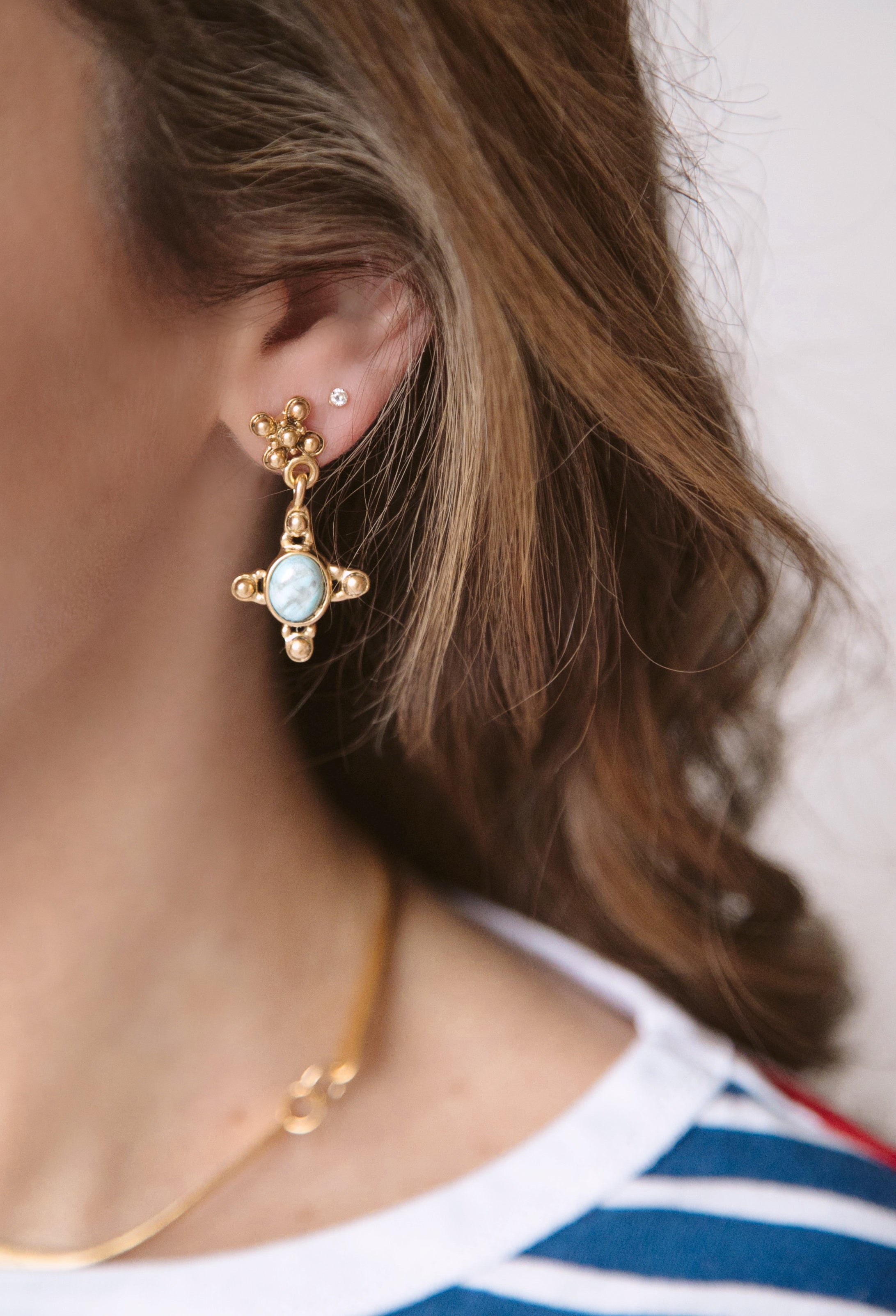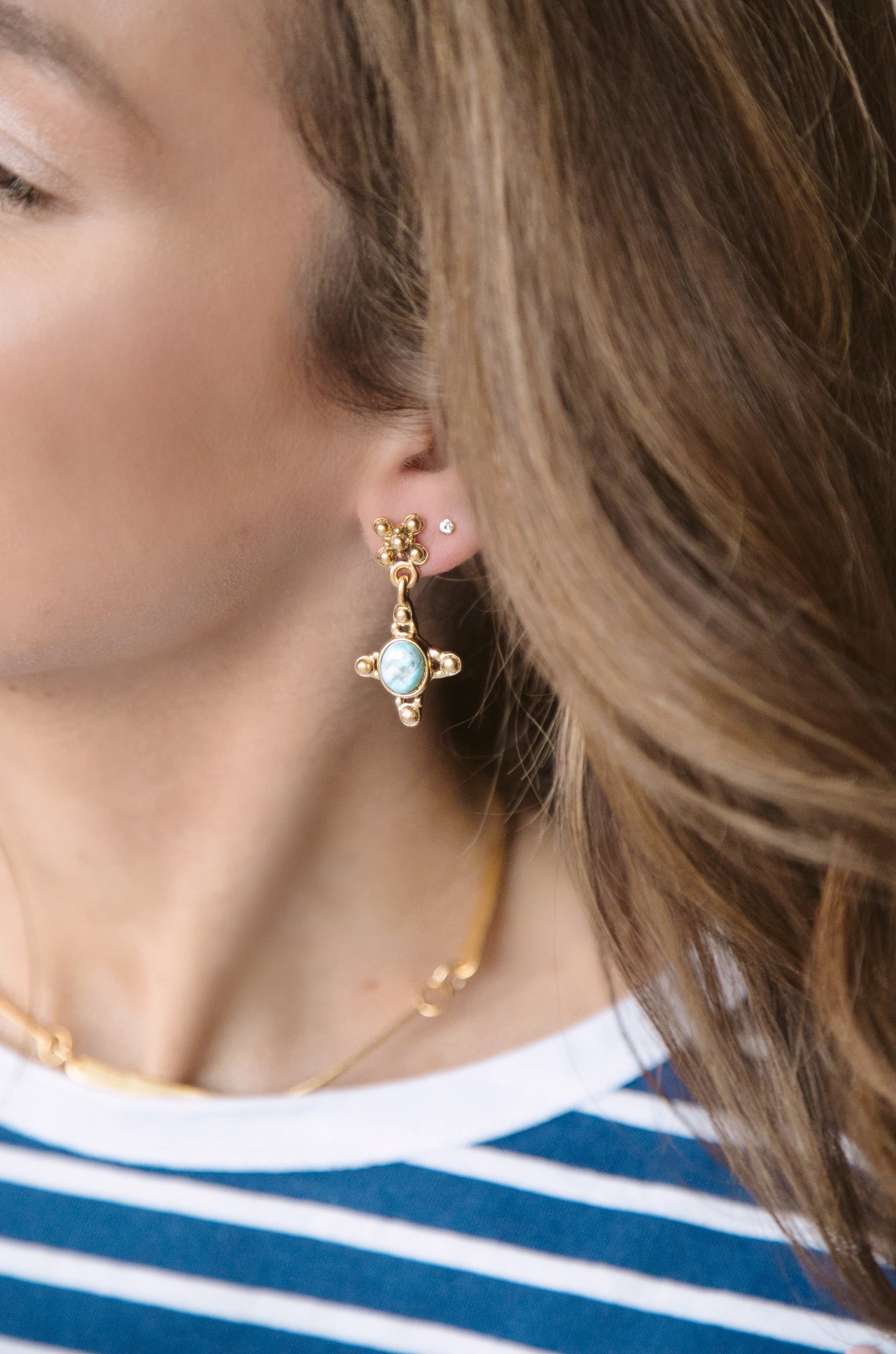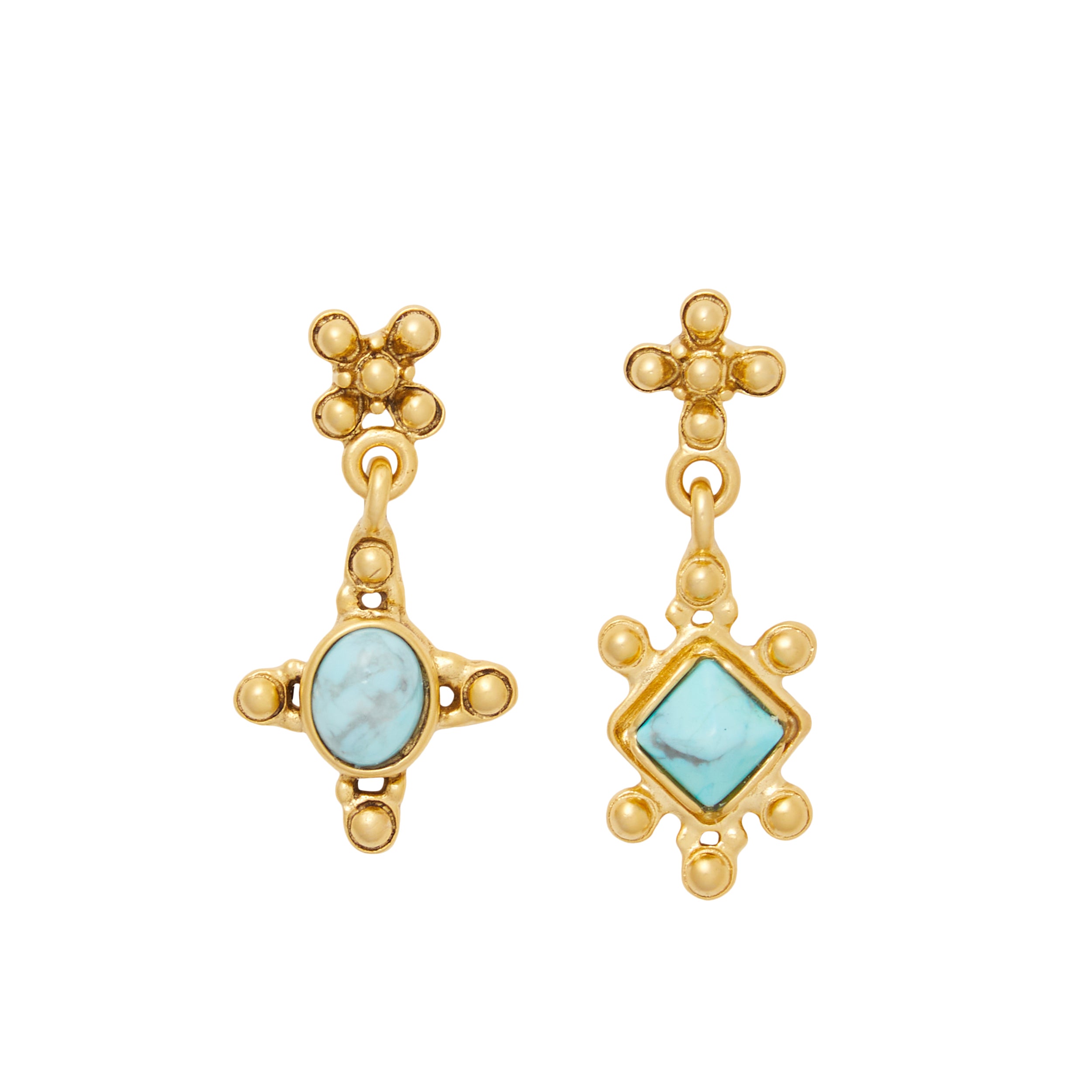 - 24k antique gold plated geometric charms set with MOP or Turquoise Howlite hang from our signature 24k antique gold plated toppers on stainless steel hypoallergenic posts