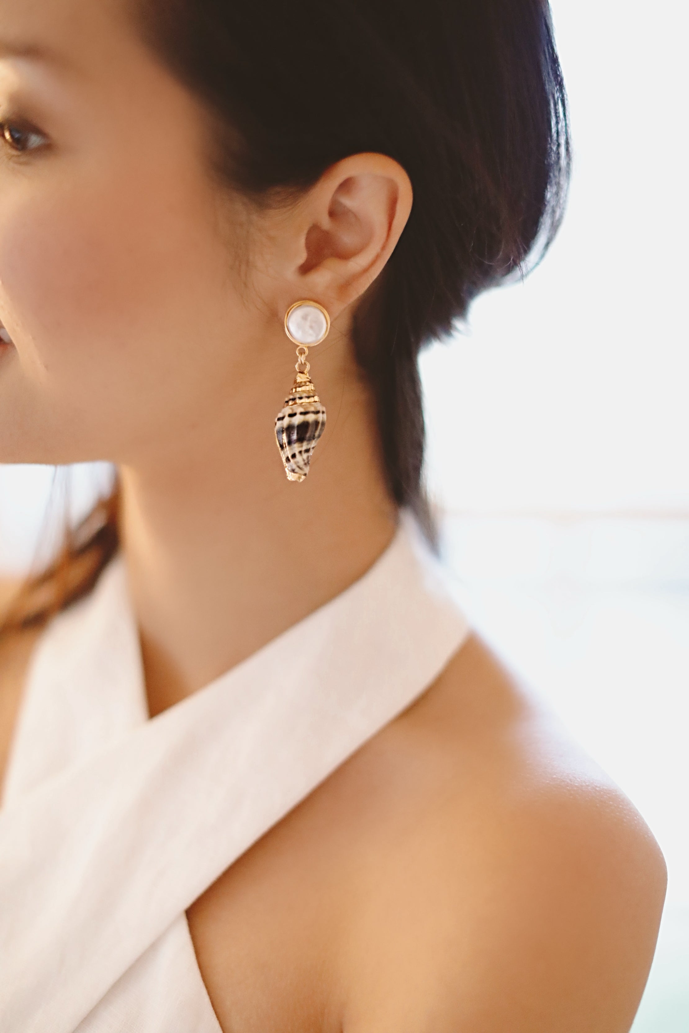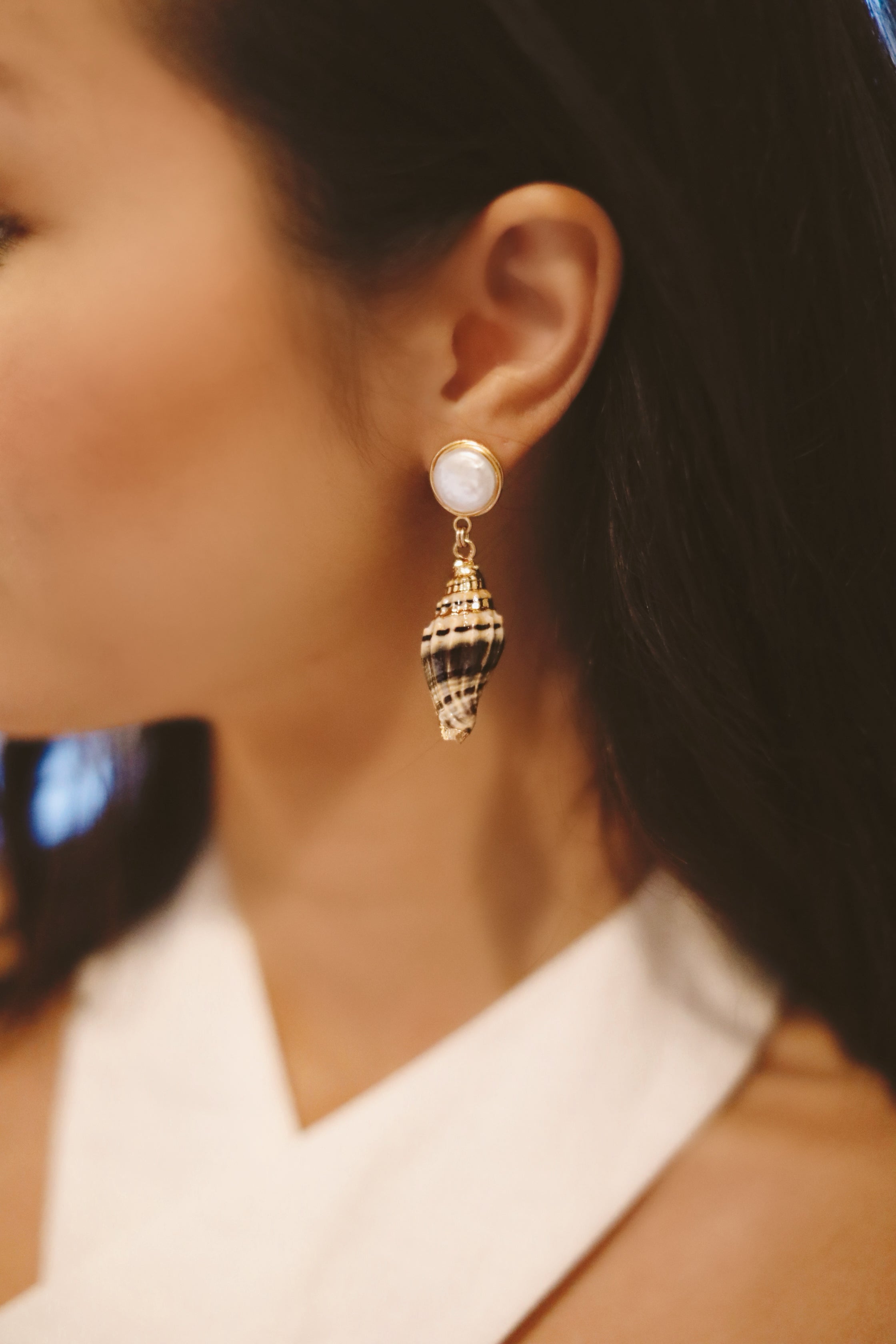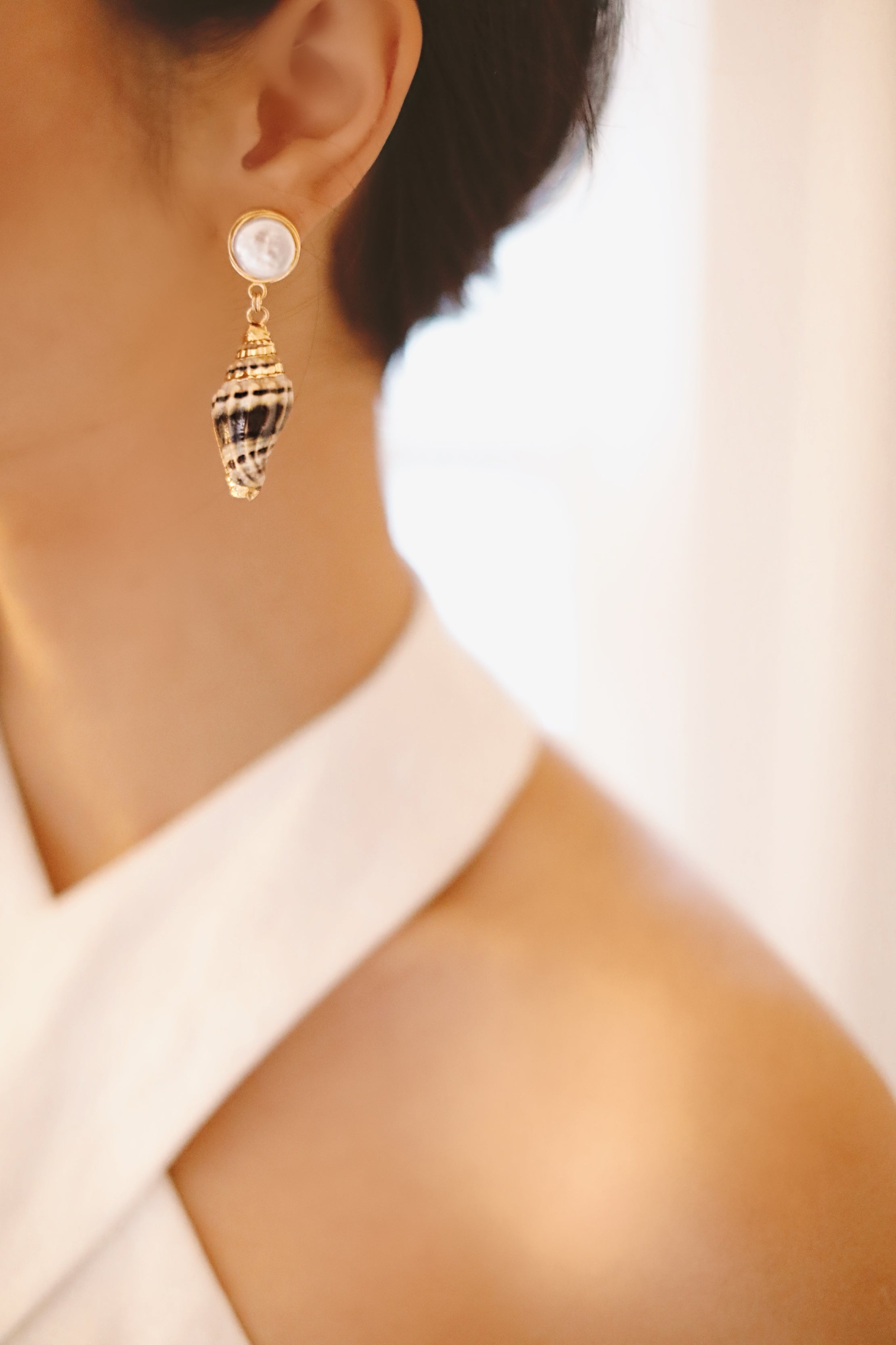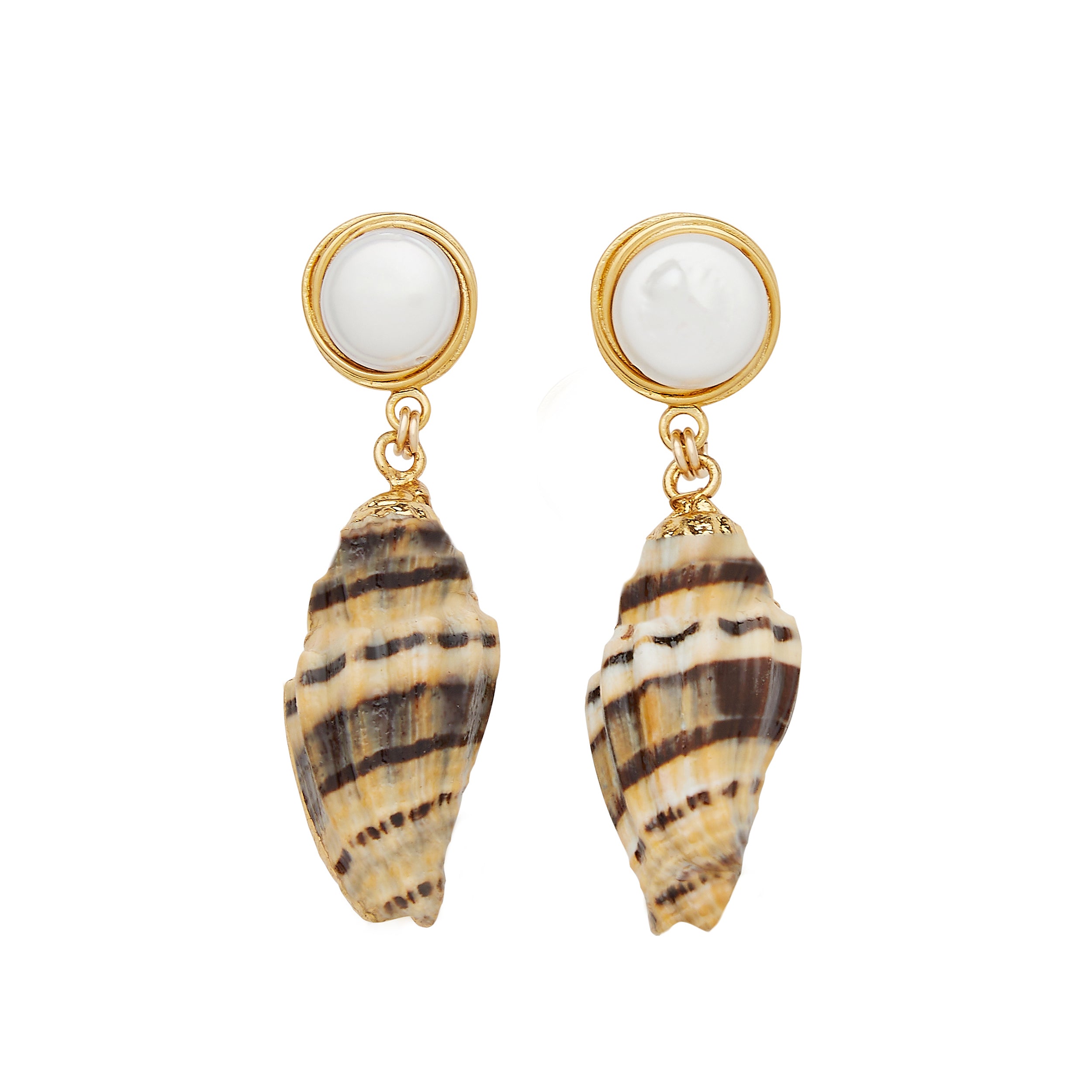 - Trumpet shells hang from 24k antique gold plated toppers set with freshwater pearls on stainless steel hypoallergenic posts