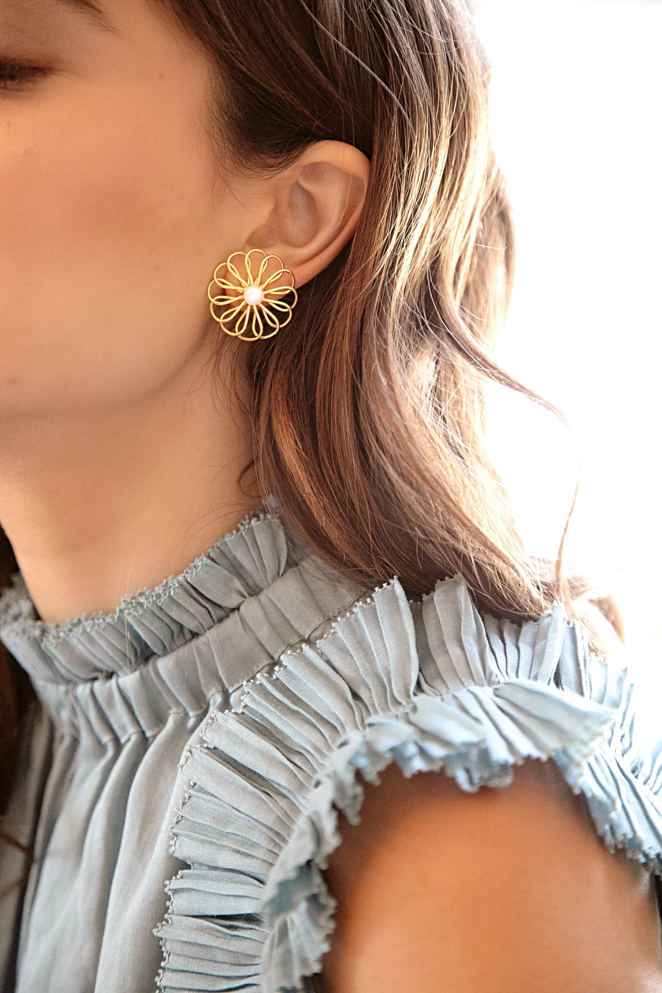 - 24k antique gold plated 3D flower stud set with a freshwater pearl