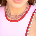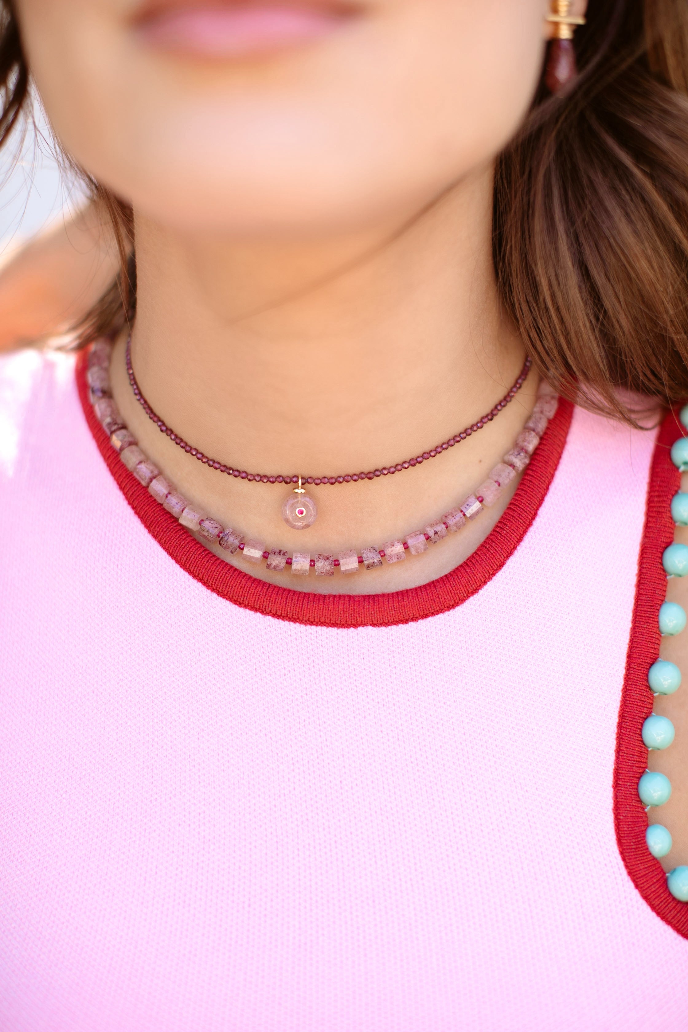 - A strand of strawberry quartz cube beads and faceted fuchsia zircon beads