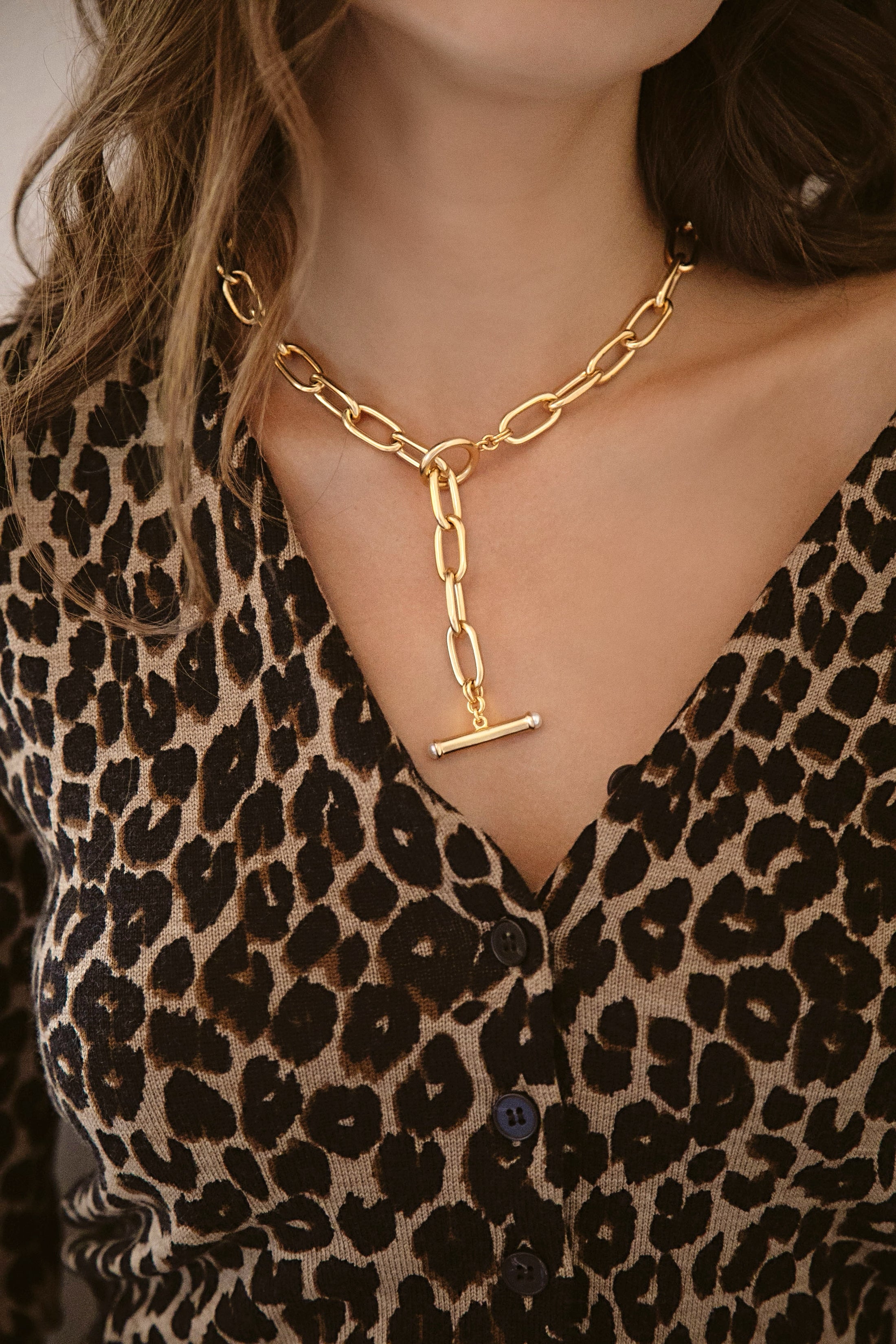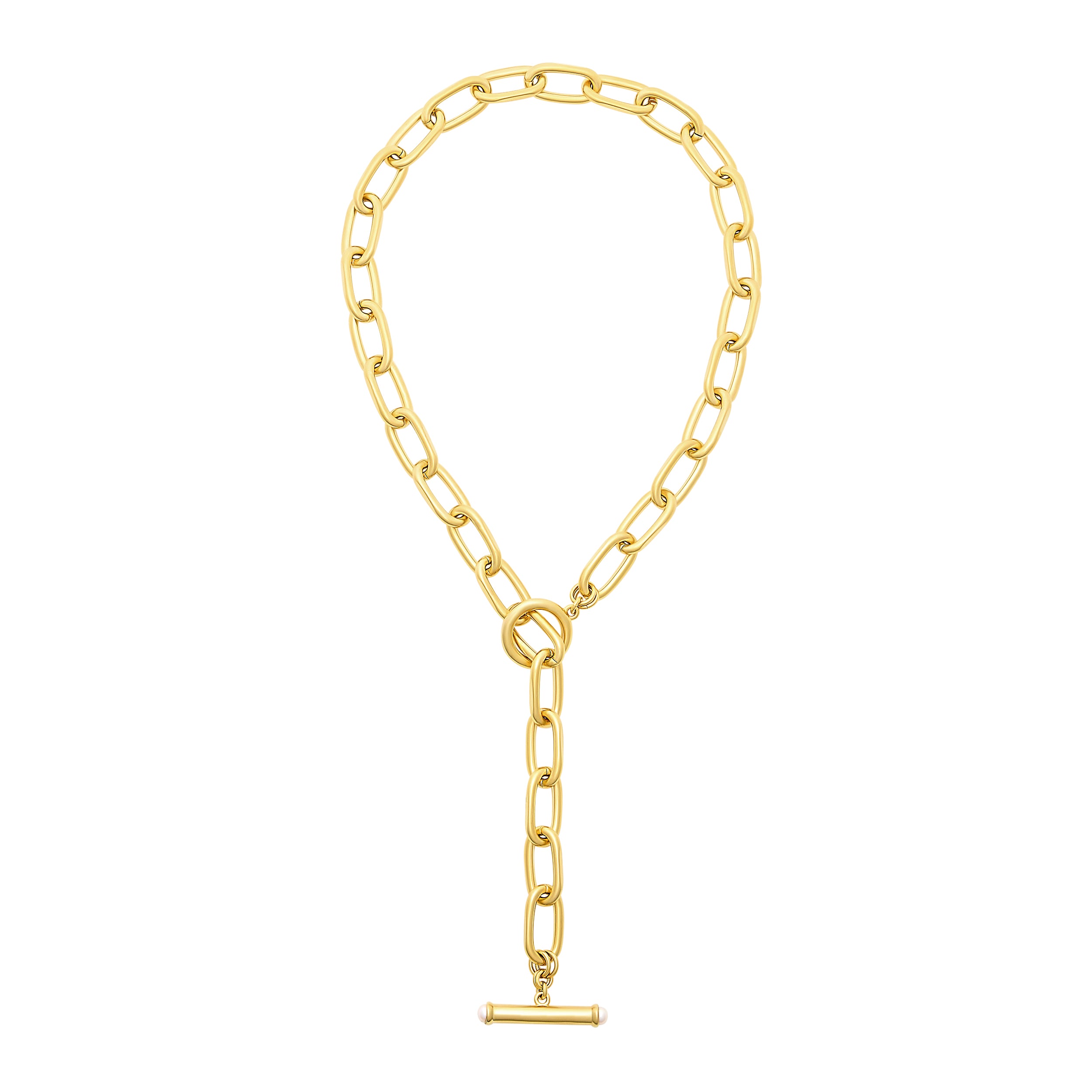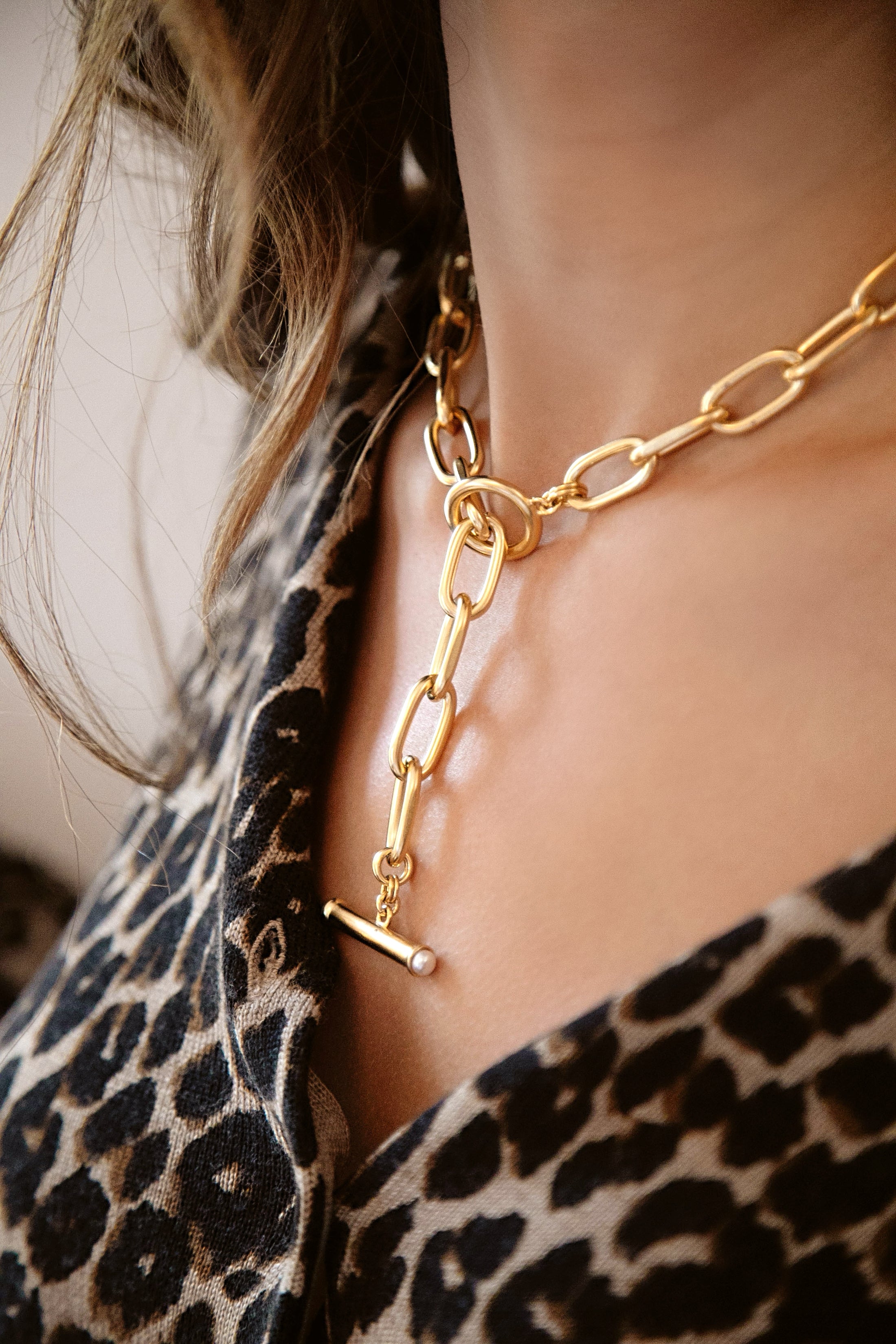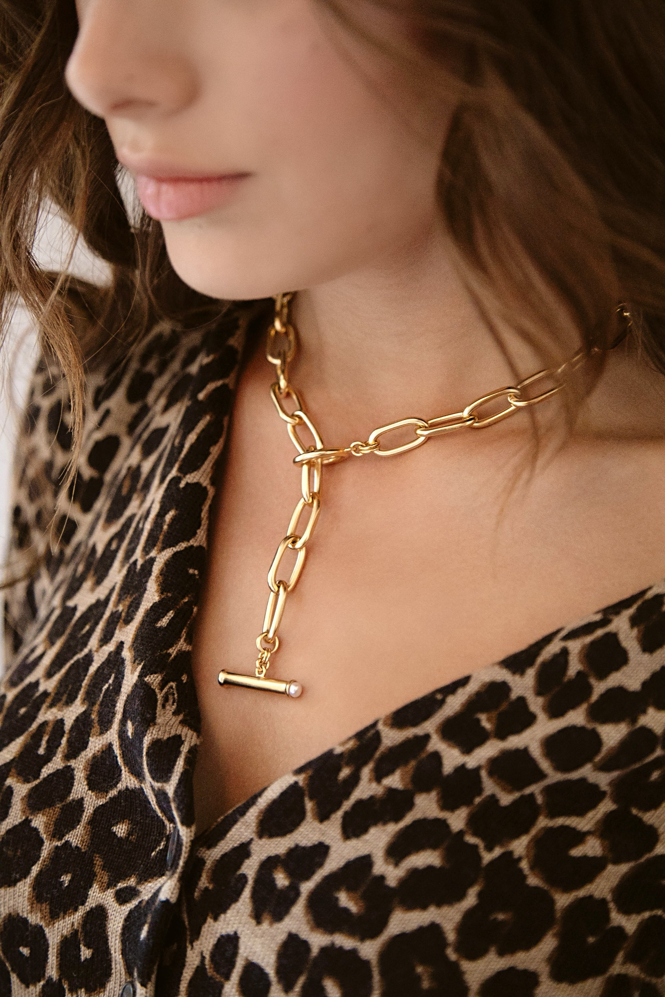 - A 24k antique gold plated heavy brass link chain with a toggle closure set with two freshwater pearl cabochons