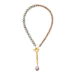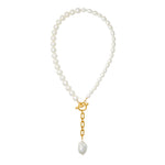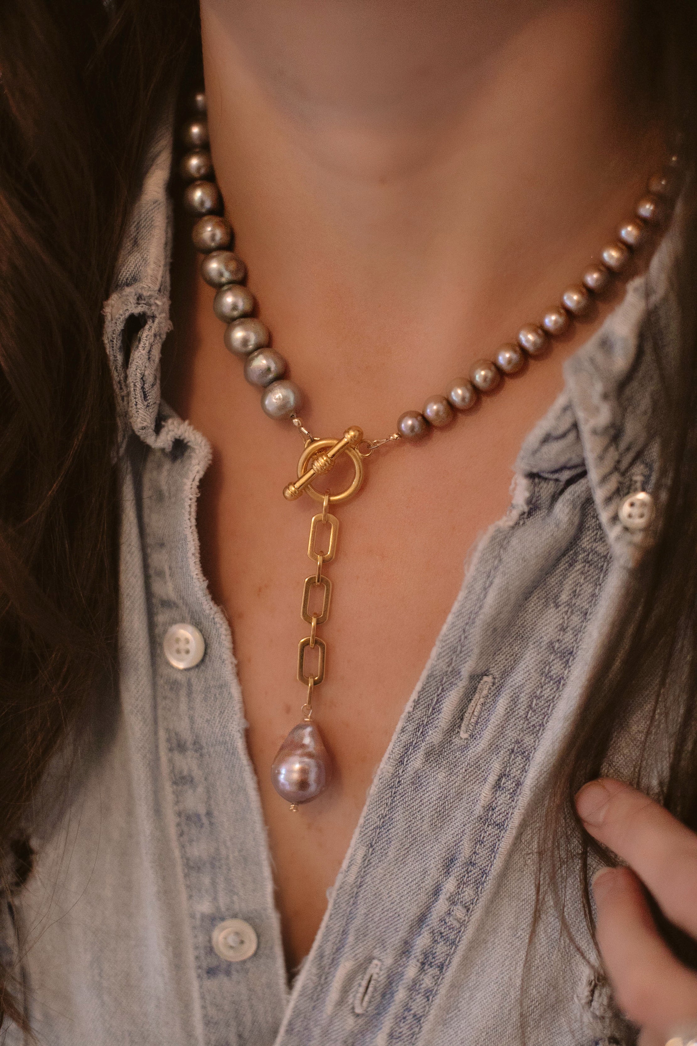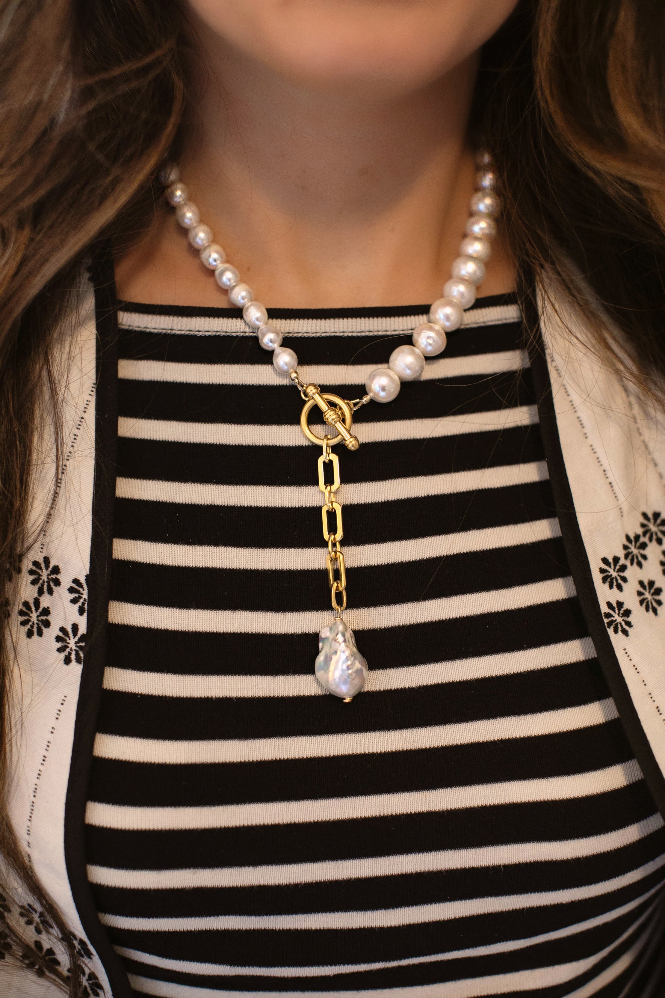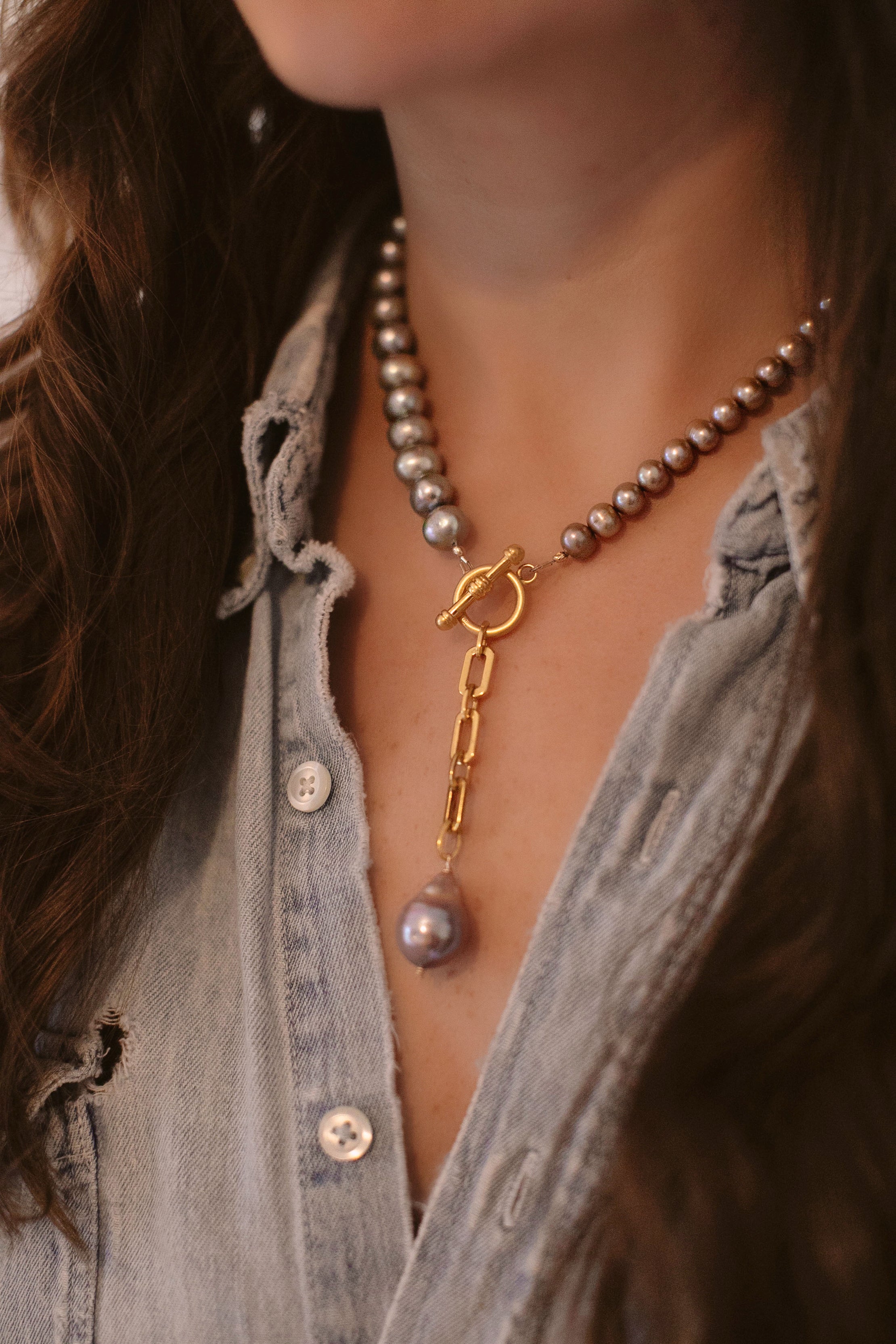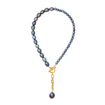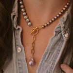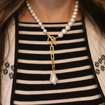- A strand of freshwater pearls in a variety of sizes adorned with a 24k gold plated chain and large baroque pearl drop