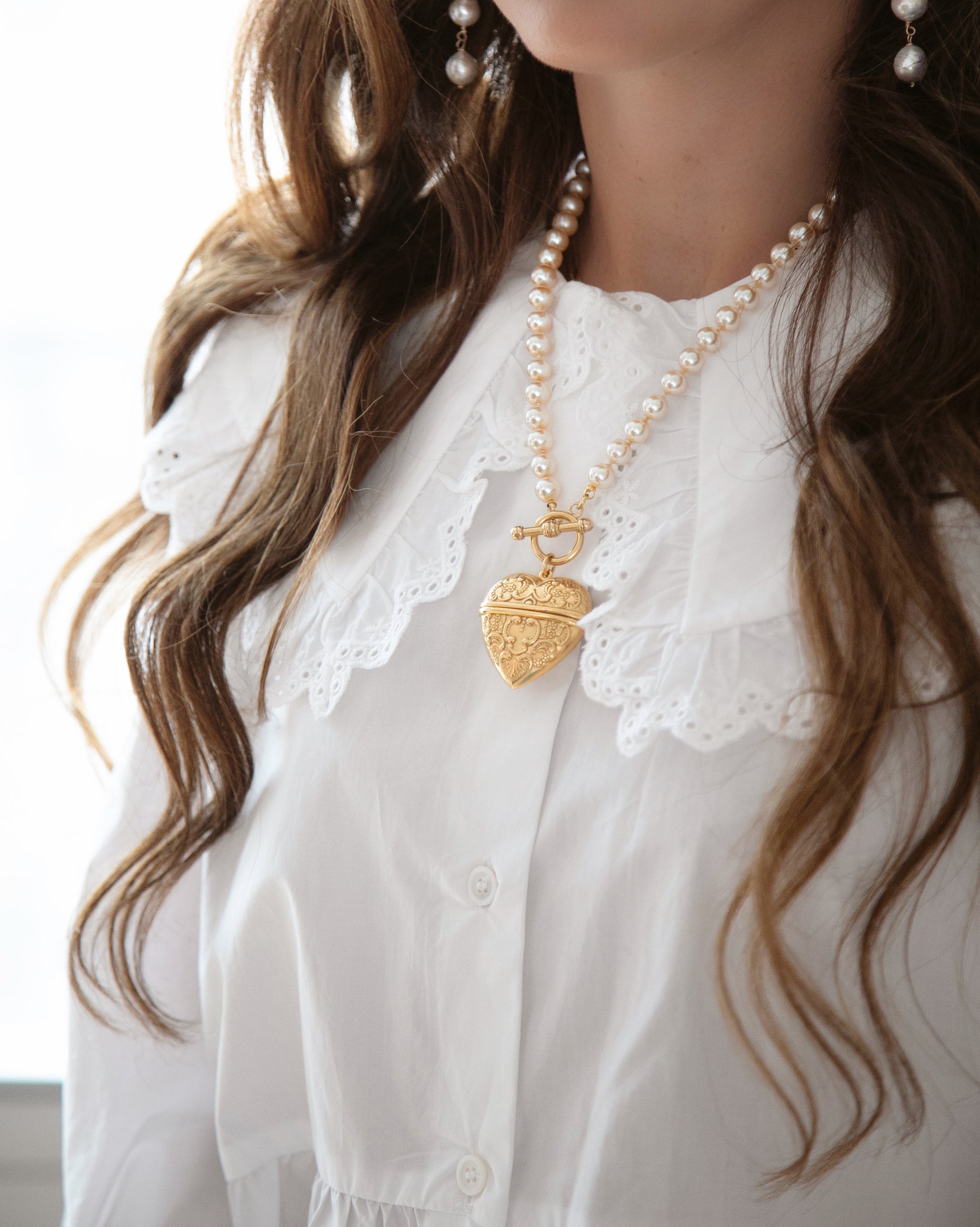- A 24k antique gold plated intricate heart locket hangs from a strand of knotted glass pearls