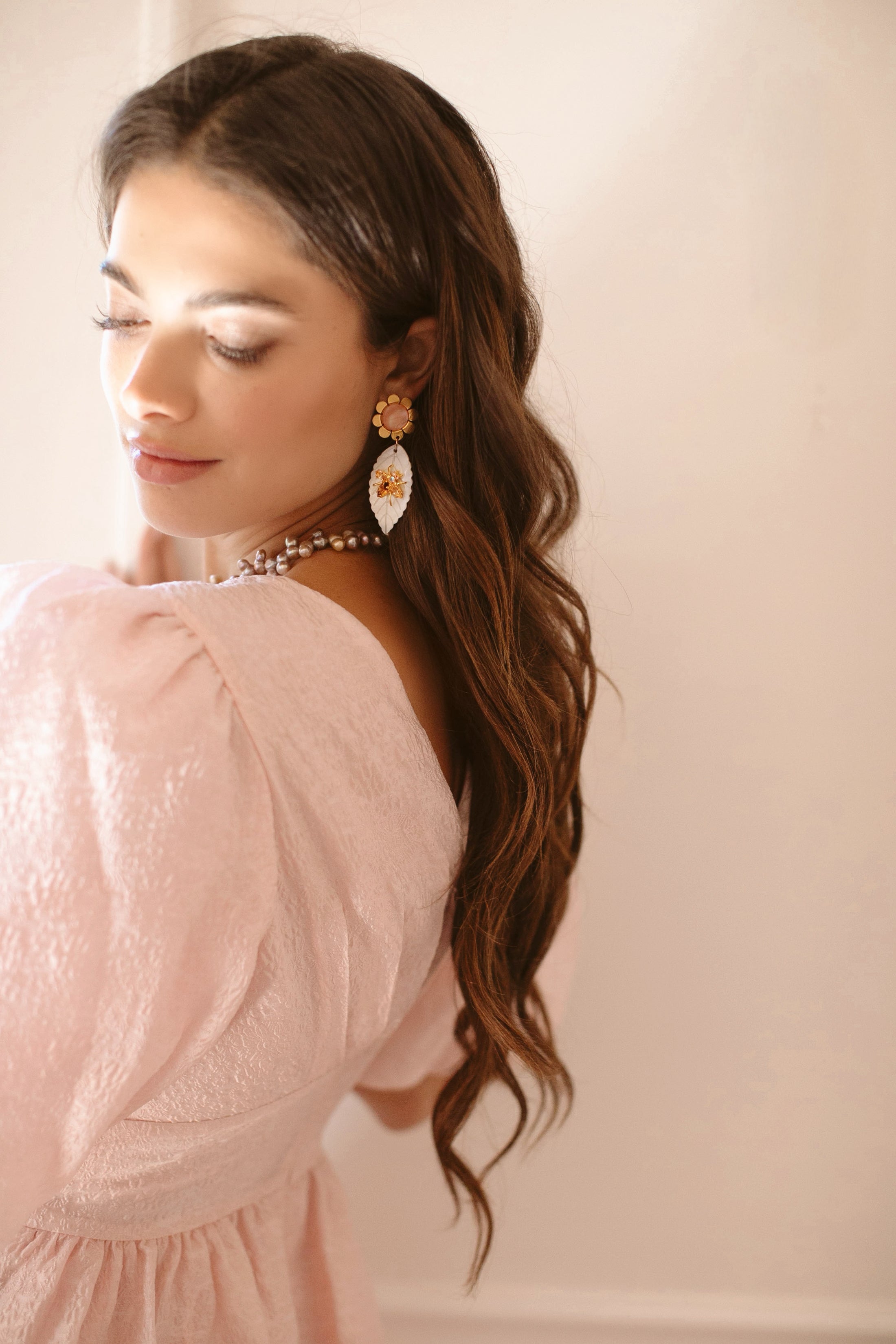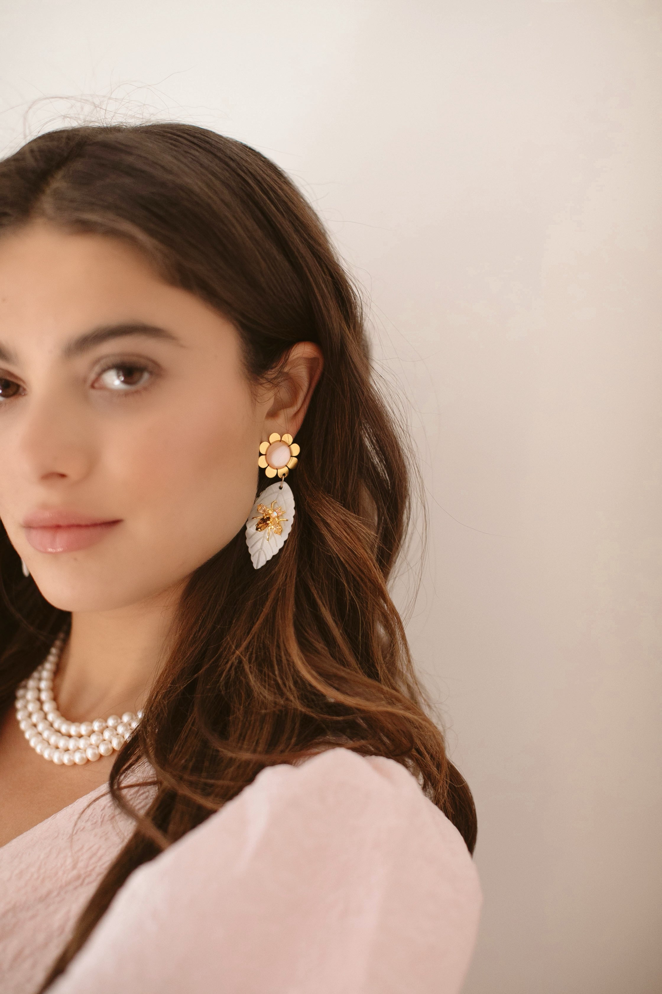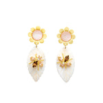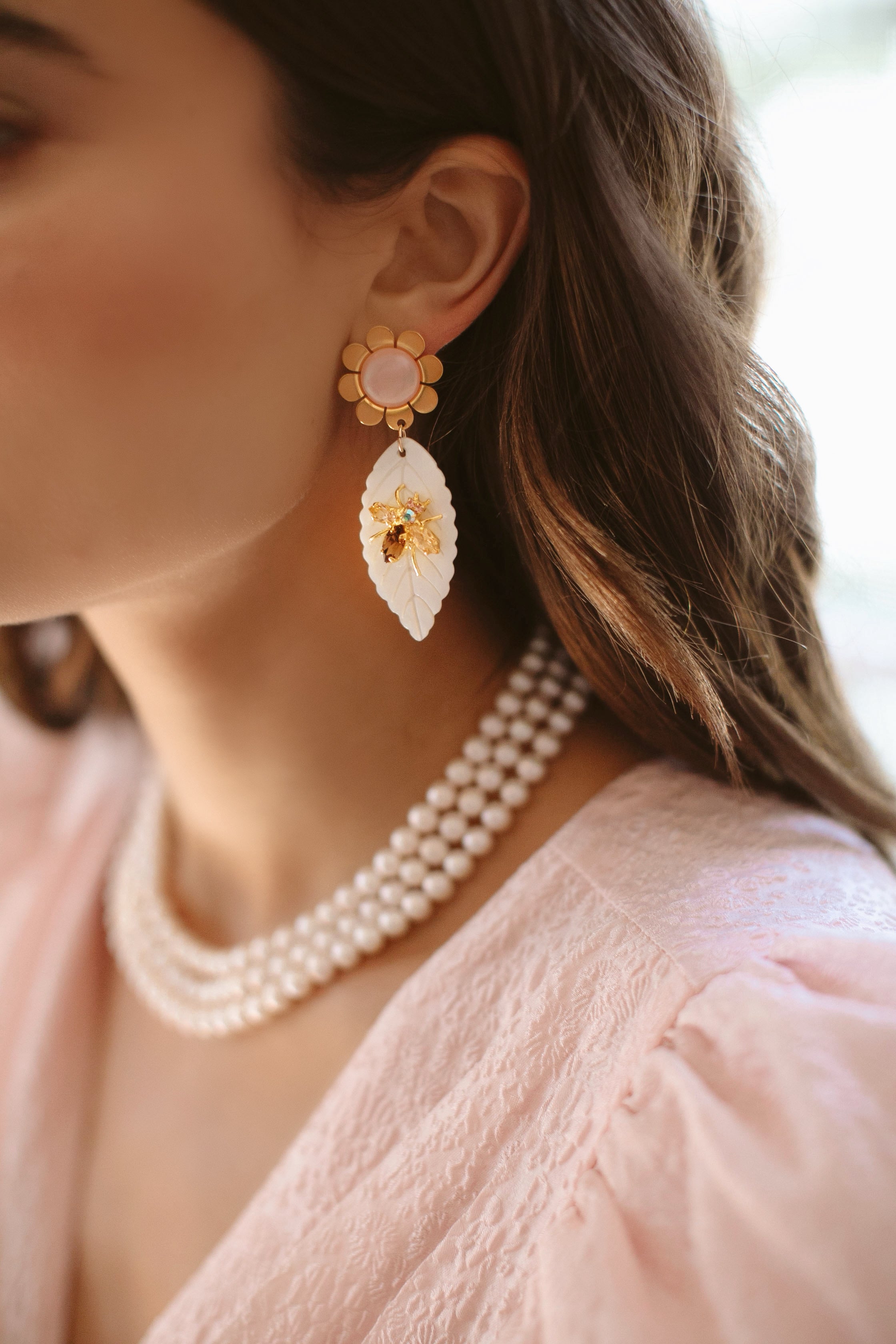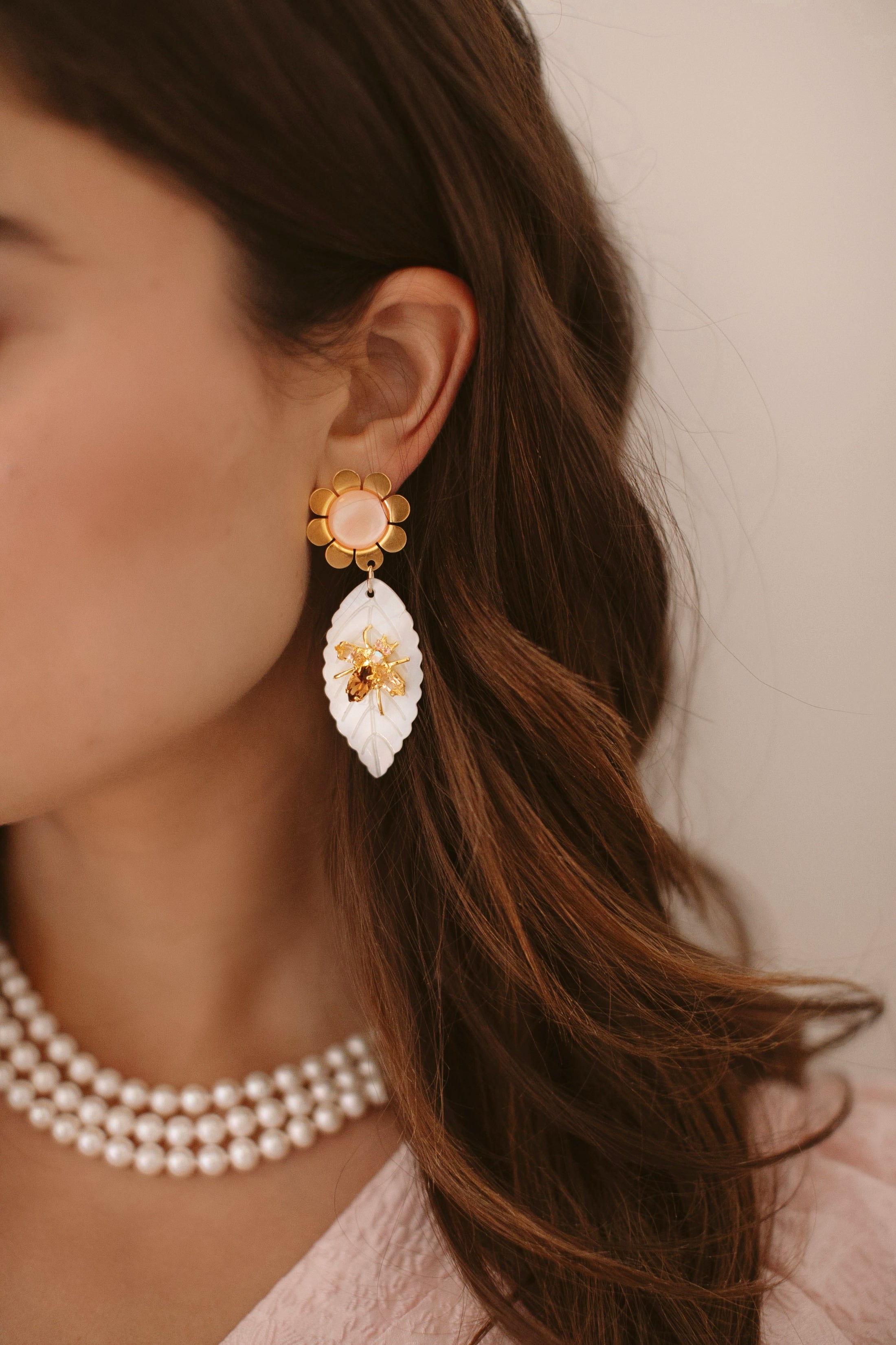 - A Mother of Pearl etched leaf adorned with a Czech crystal bug hang from 24k antique gold plated flower toppers with pink Mother of Pearl cabochons on stainless steel hypoallergenic posts