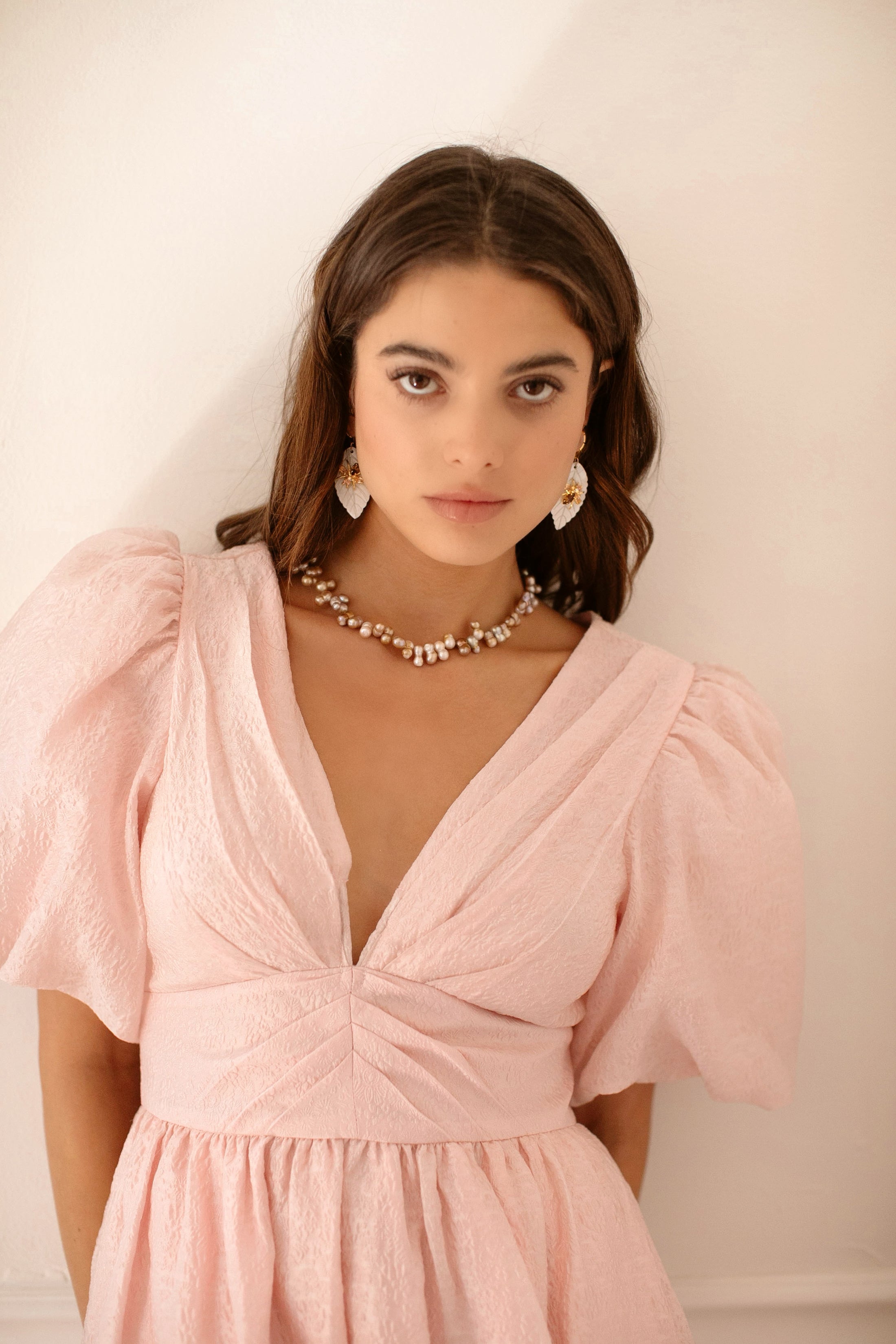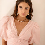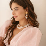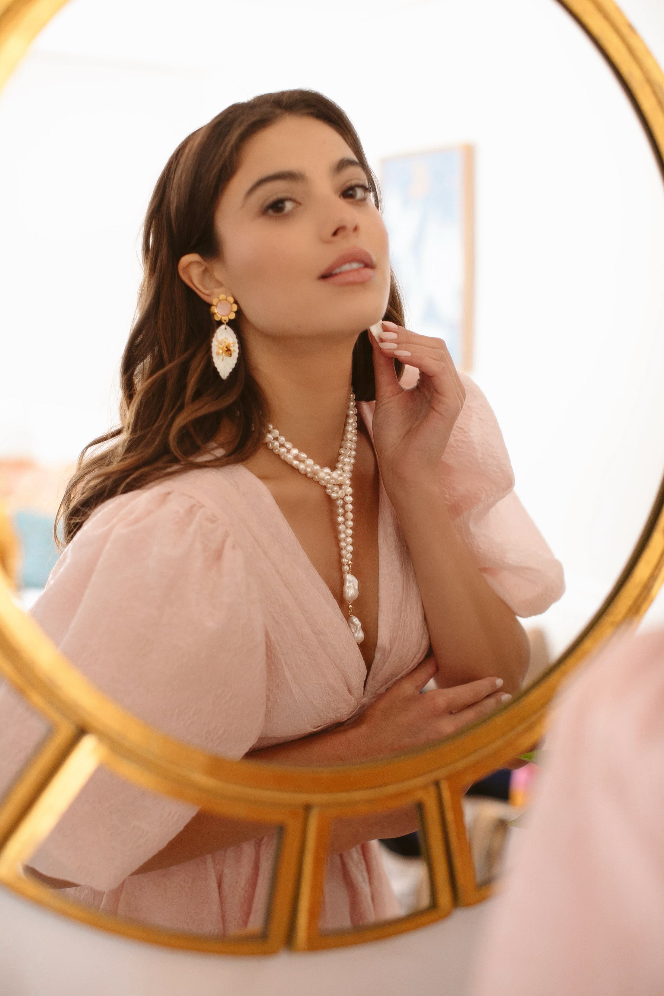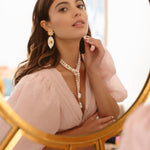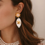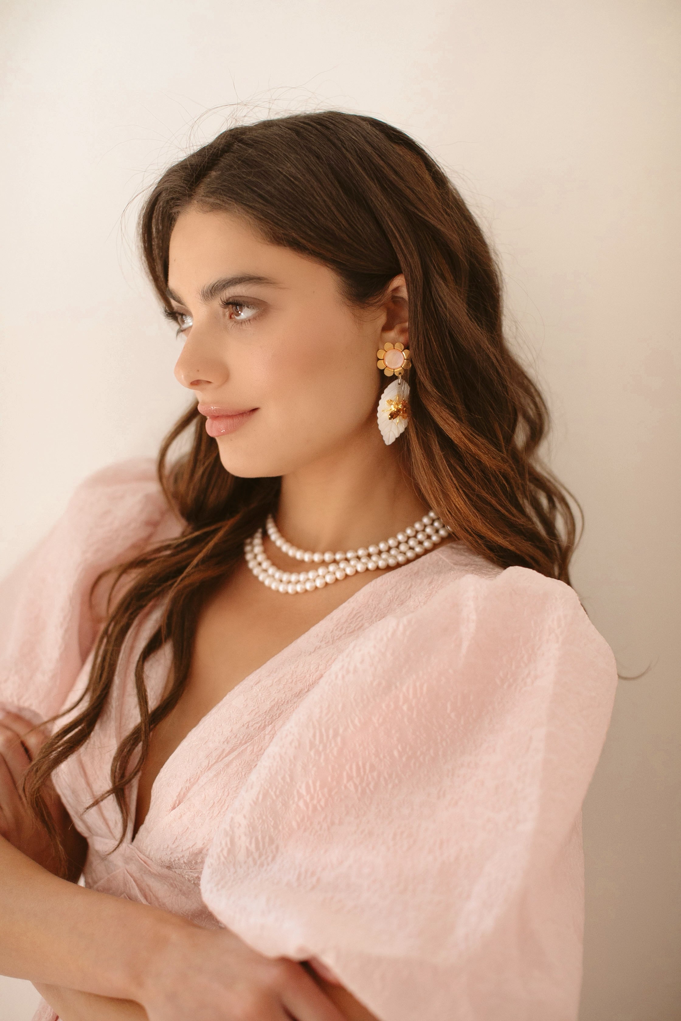 - A Mother of Pearl etched leaf adorned with a Czech crystal bug hang from 24k antique gold plated flower toppers with pink Mother of Pearl cabochons on stainless steel hypoallergenic posts