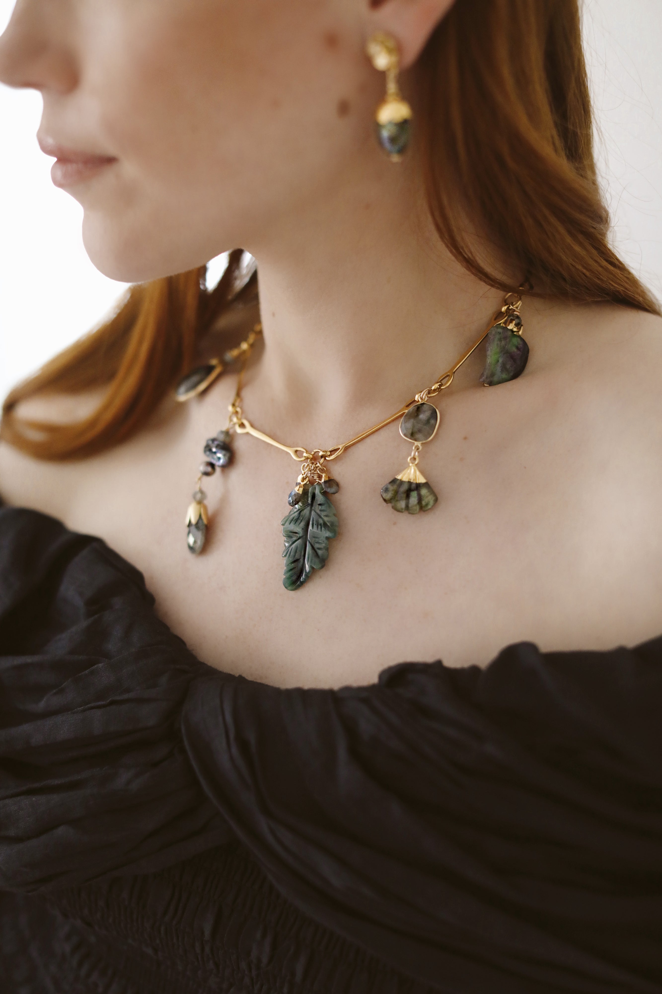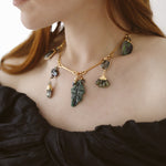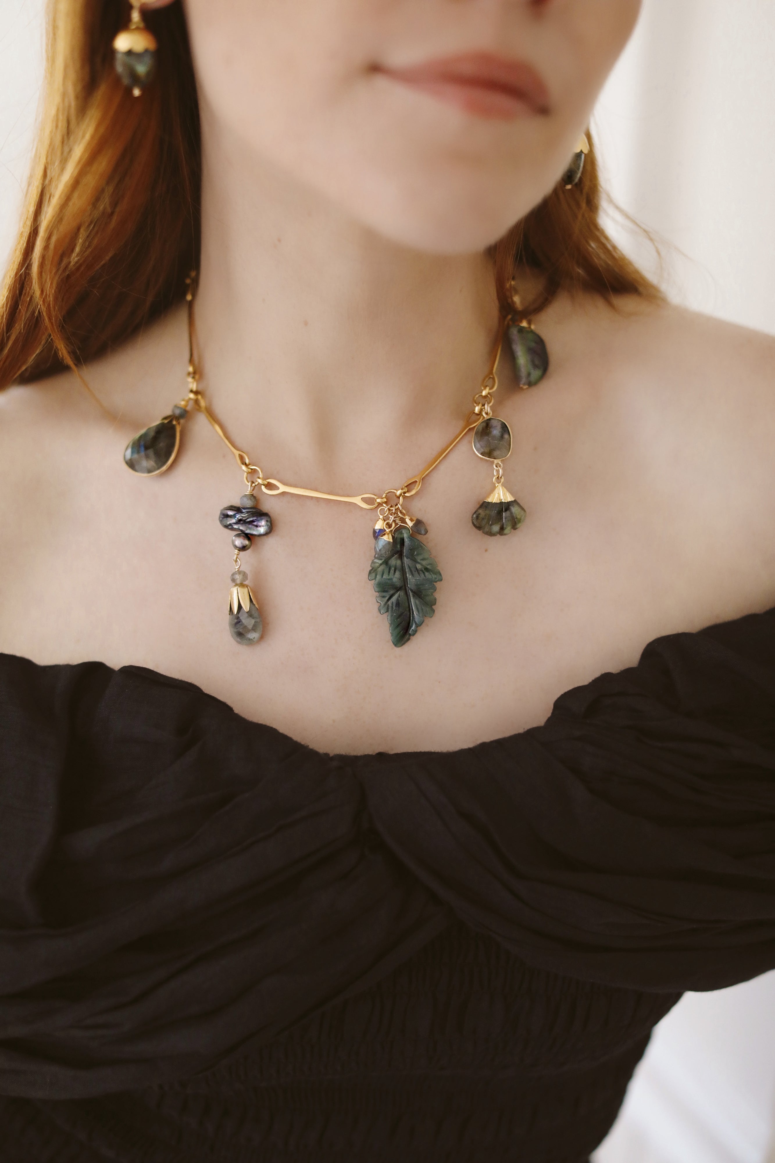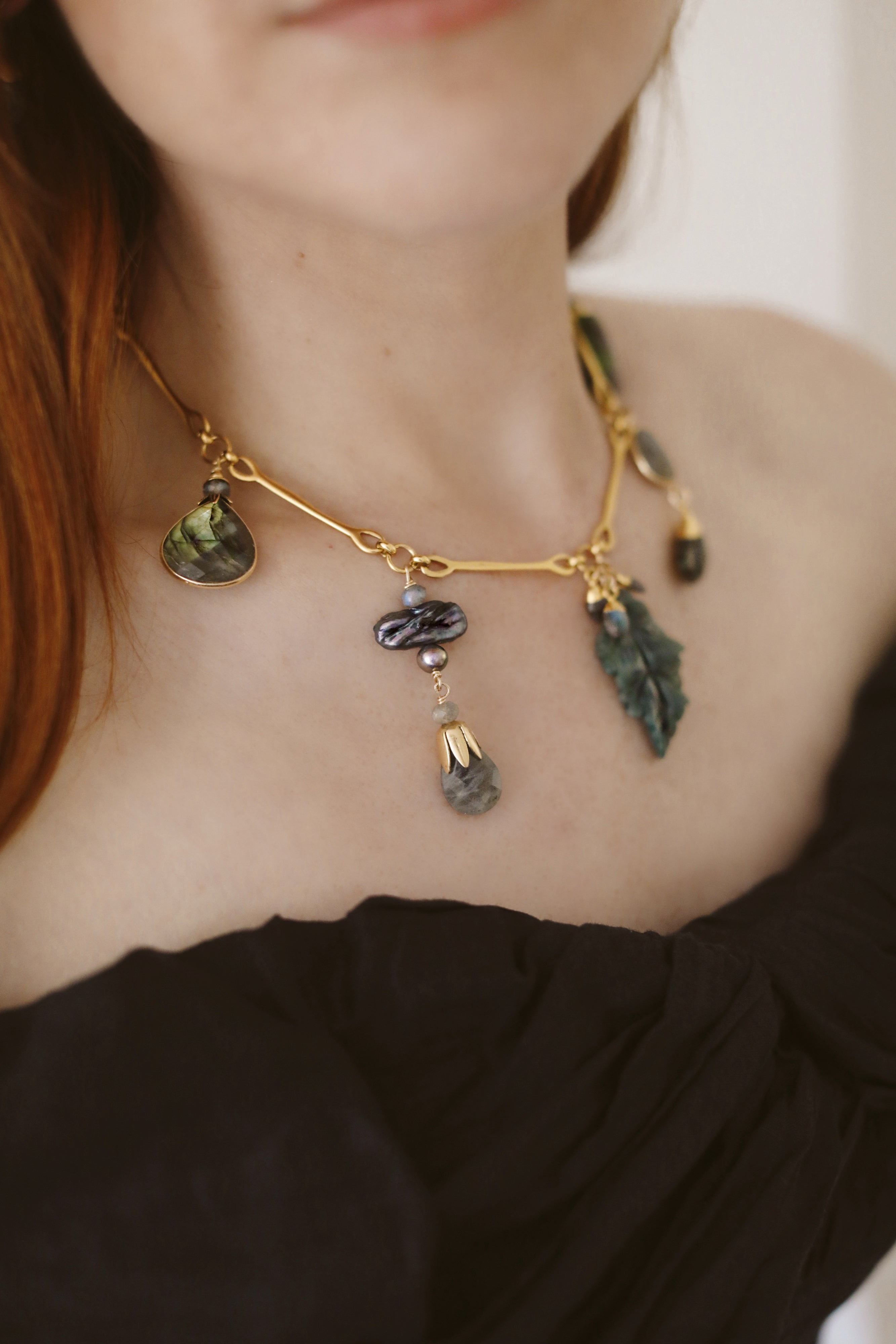 - 24k antique gold plated brass chain adorned with our favorite assortment of charms, - many made from semi-precious stones including Moss Agate and Labradorite
