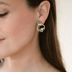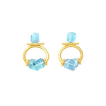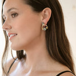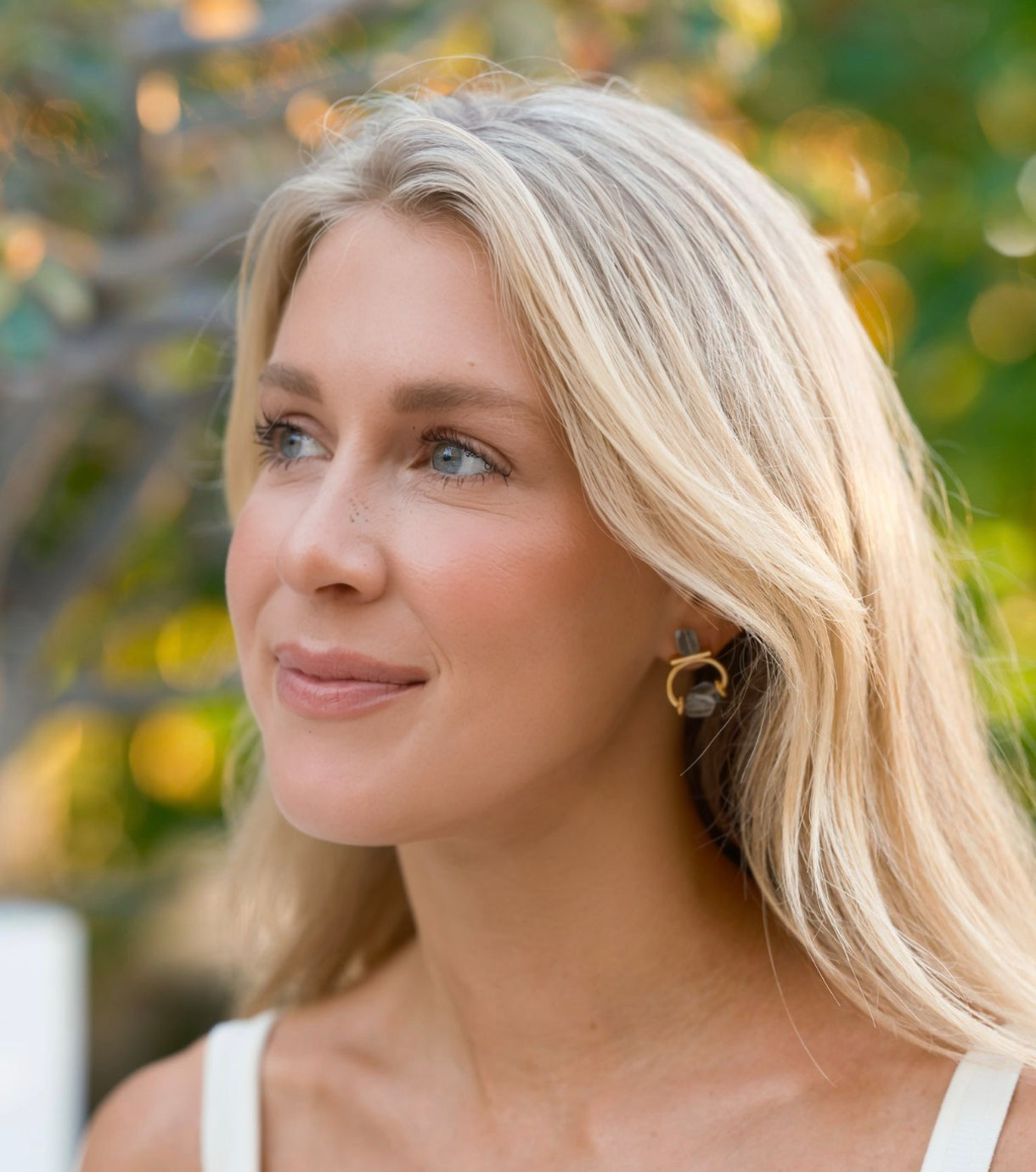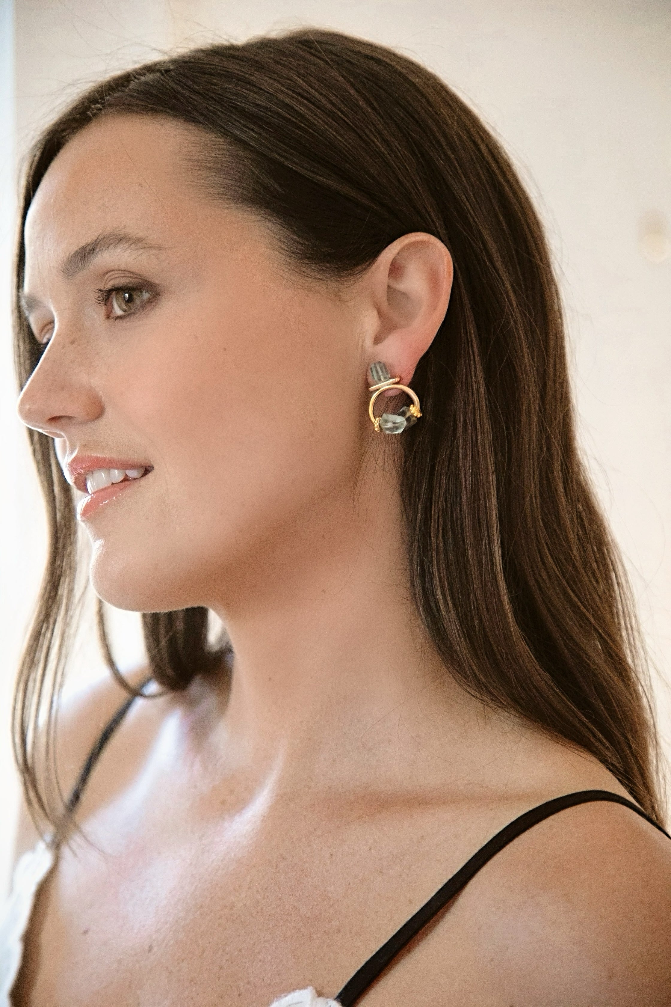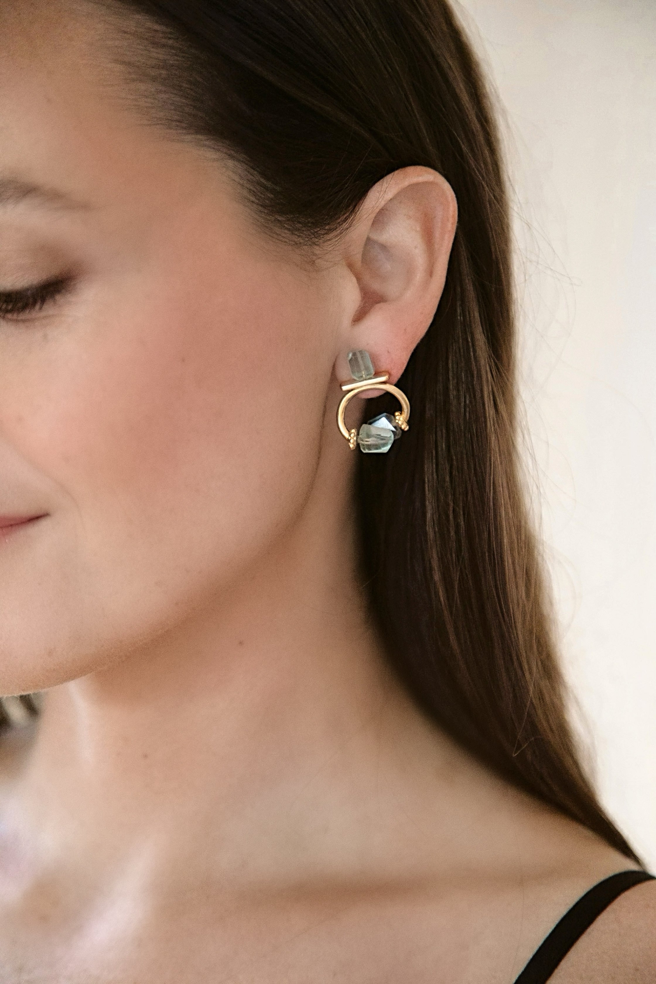 - 24k antique gold plated off kilter crescent toppers with faceted green Fluorite stones set on stainless steel hypoallergenic posts
