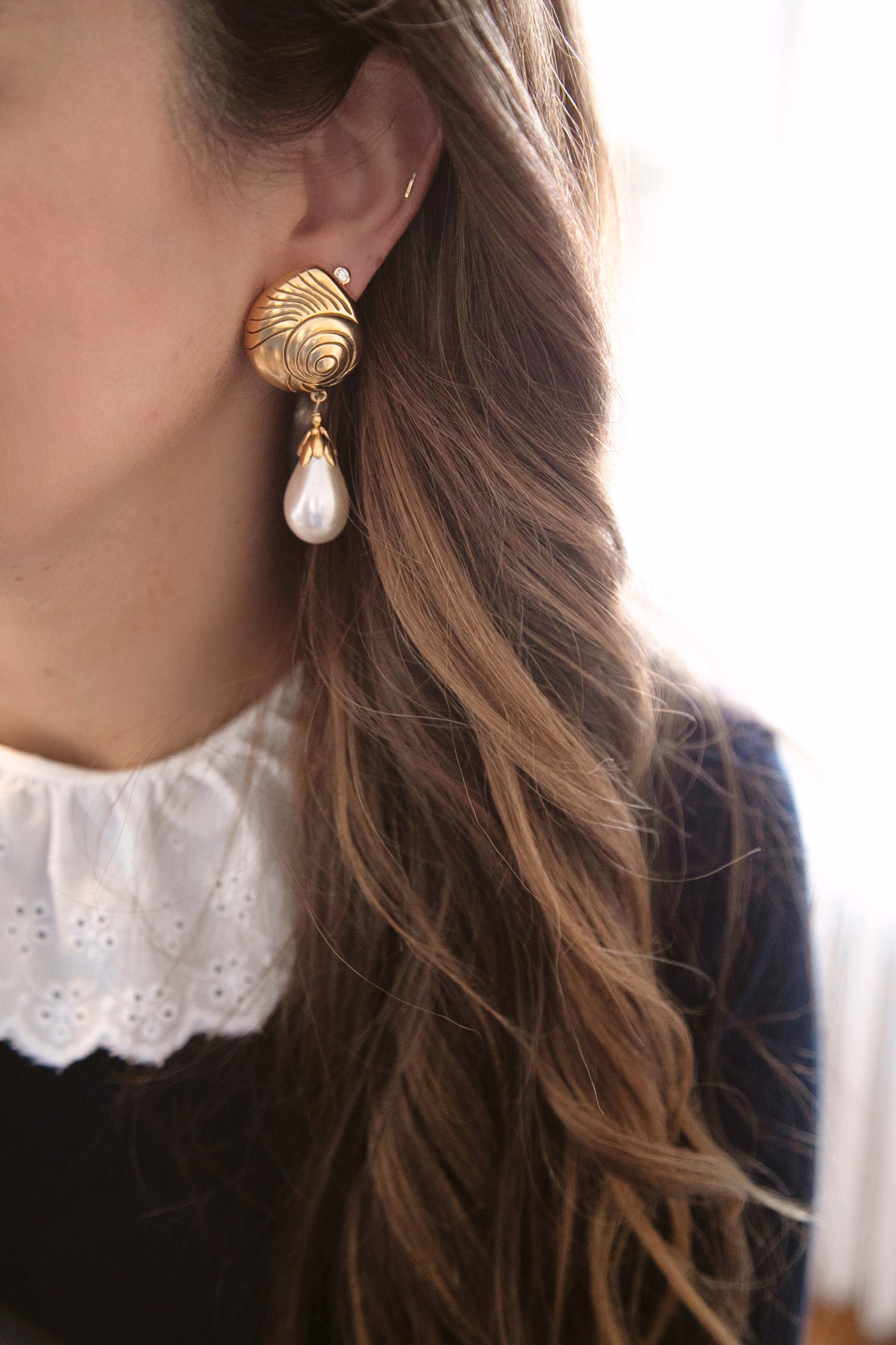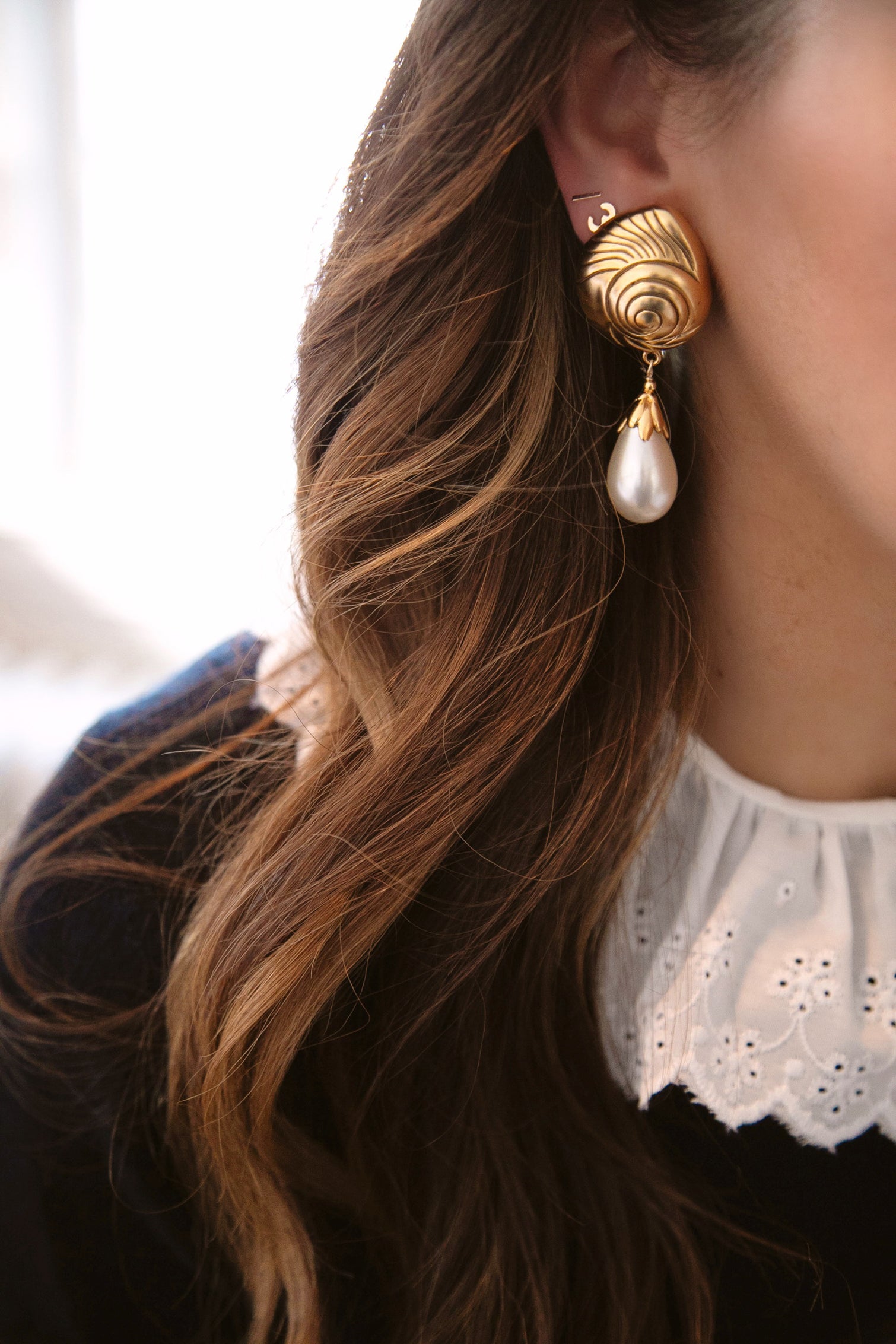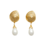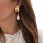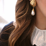 - Vintage glass pearls hang from 24k antique gold plated engraved shell toppers on stainless steel hypoallergenic posts
