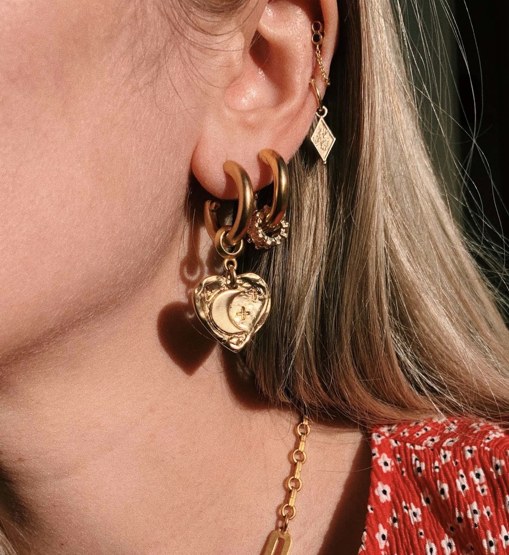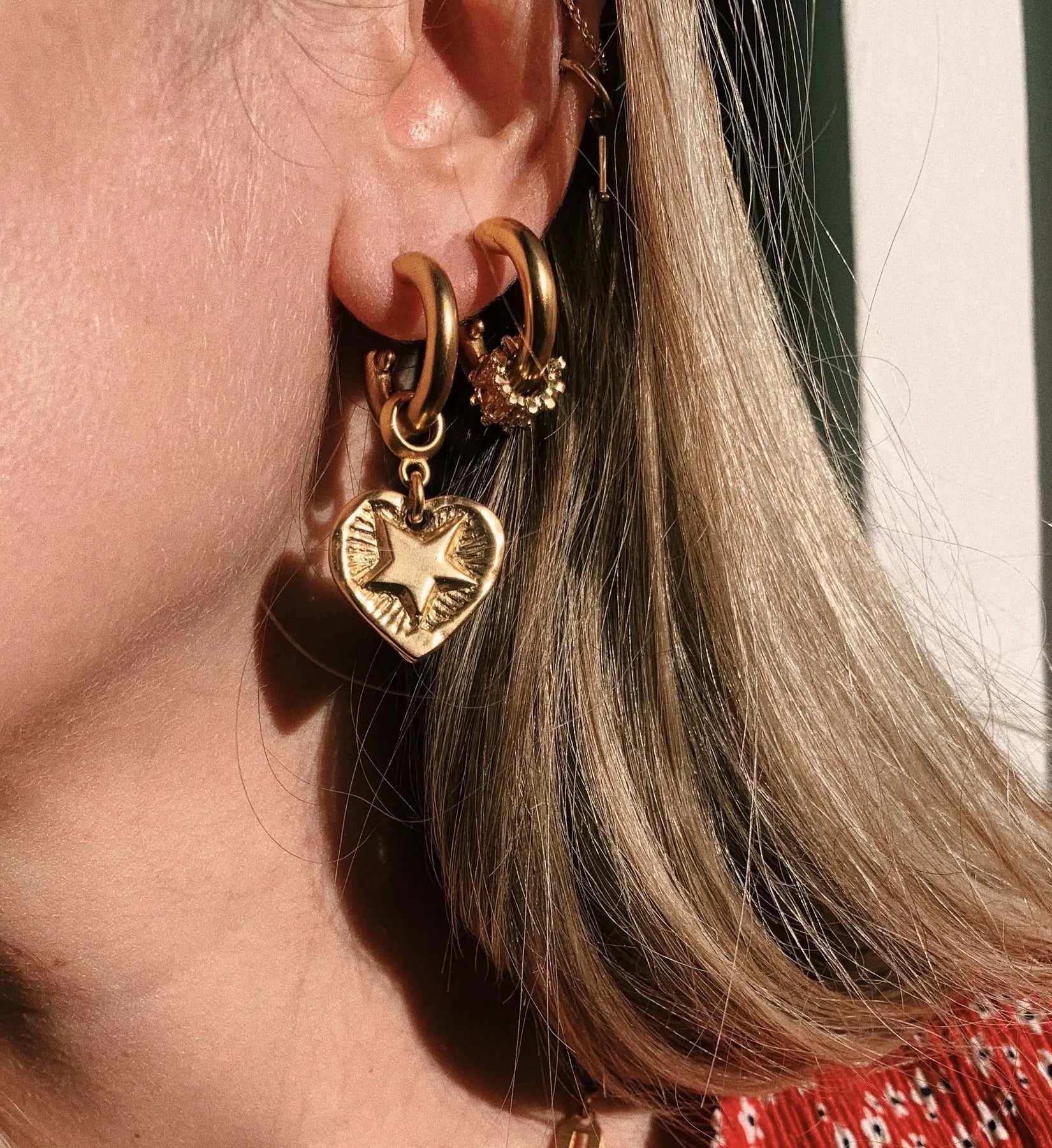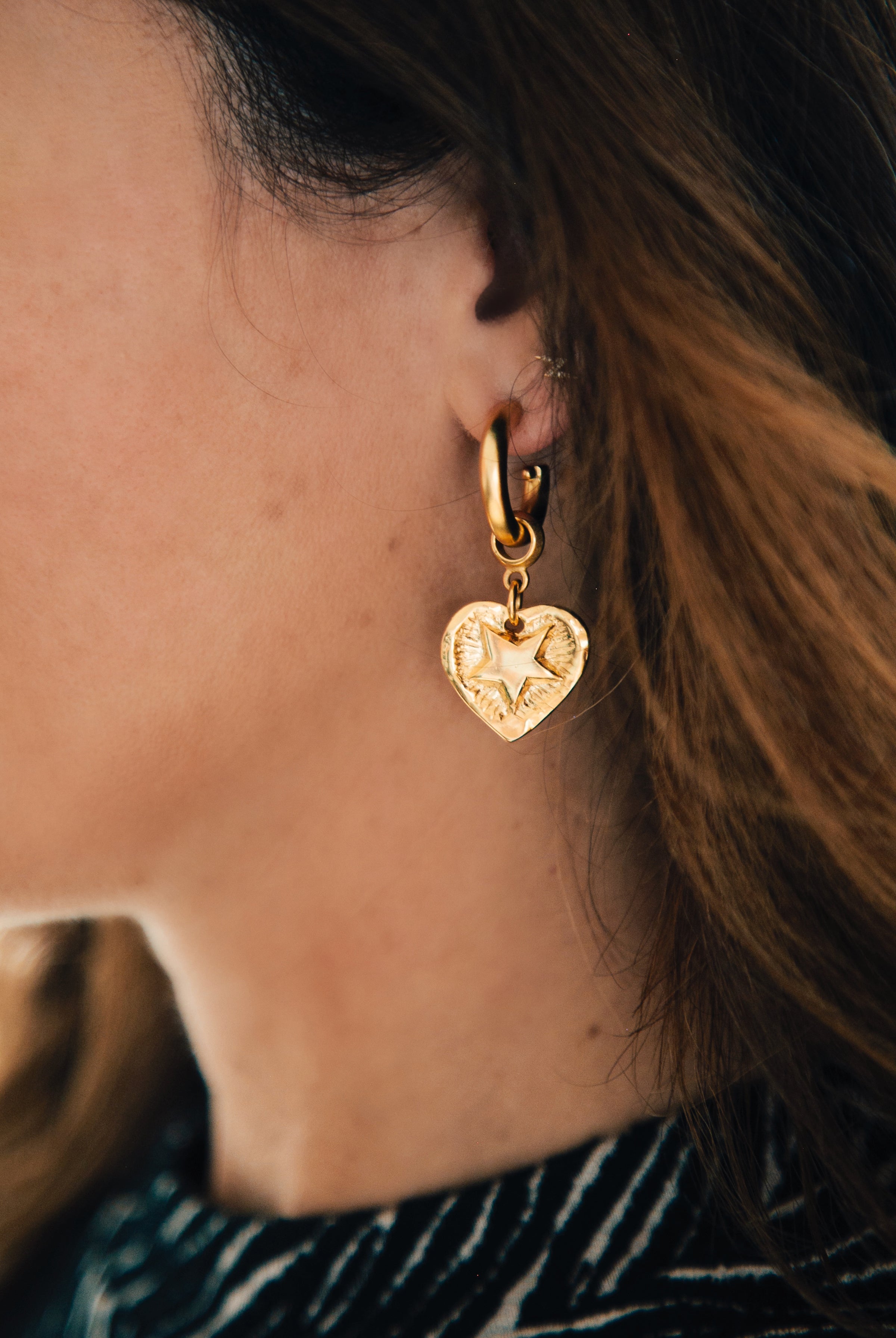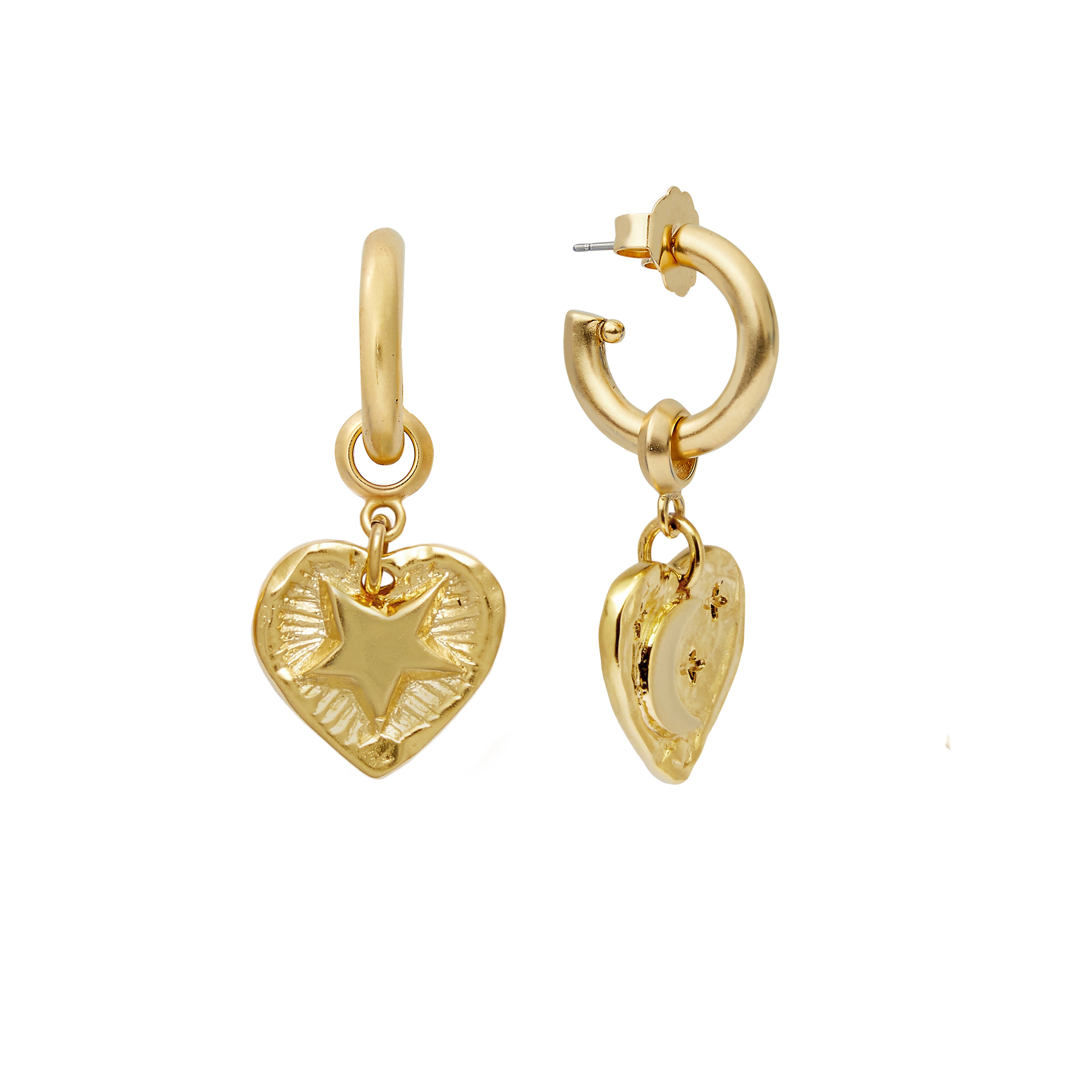 - 24k antique gold plated two sided heart charms etched with stars and moons hang from gold plated hoops on stainless steel hypoallergenic posts
