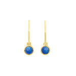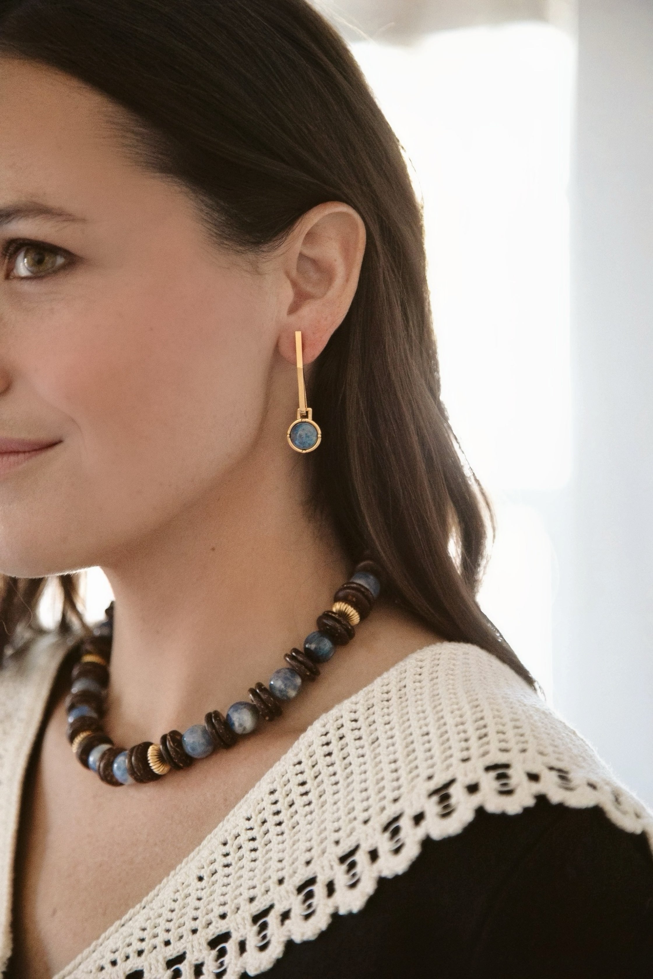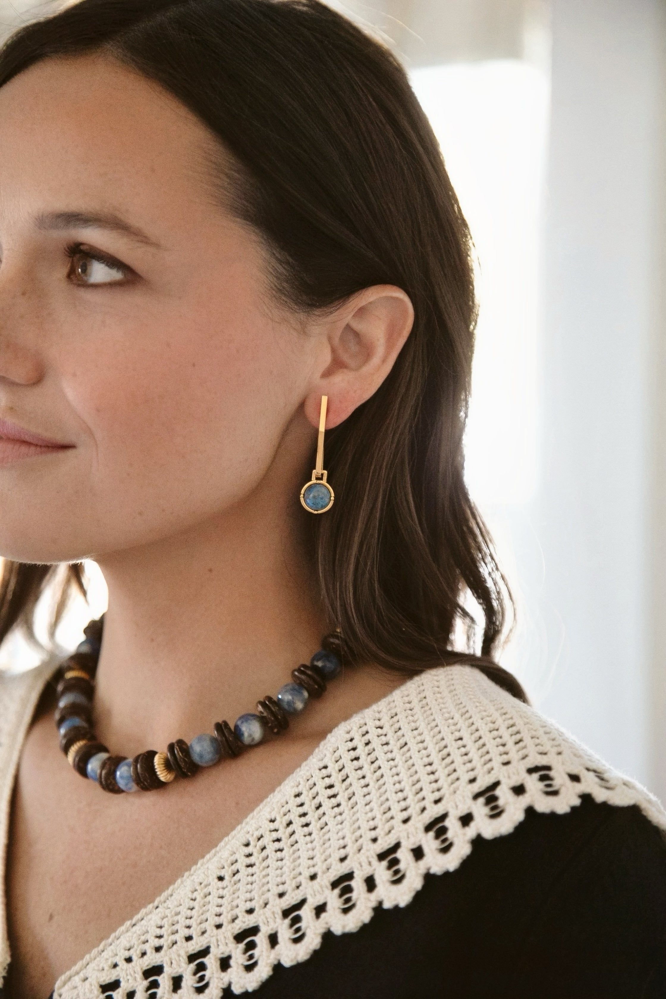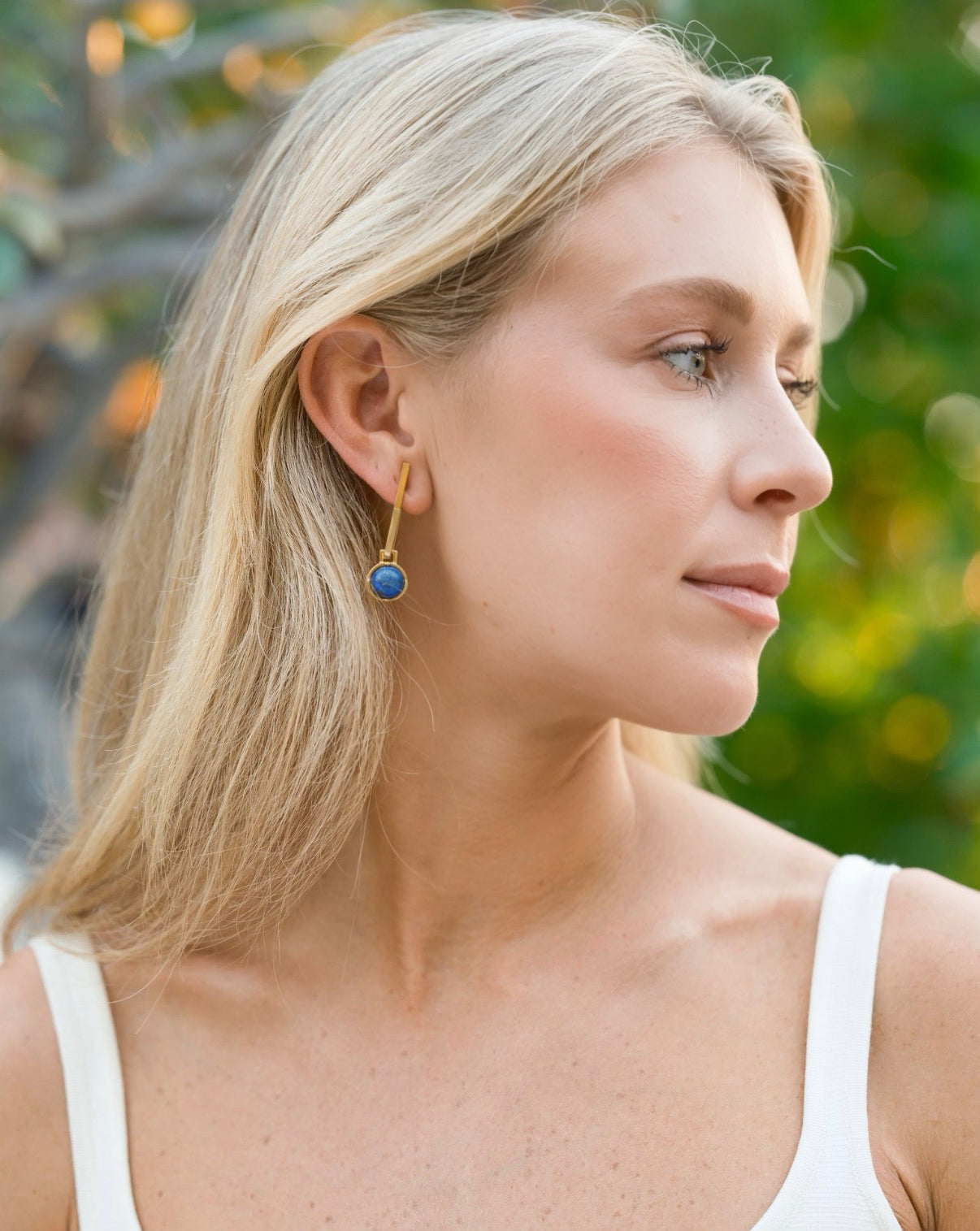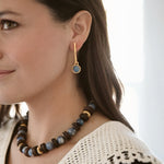 - Semi-precious gemstone cabochons hang from 24k antique gold plated sleek geometric sticks posts