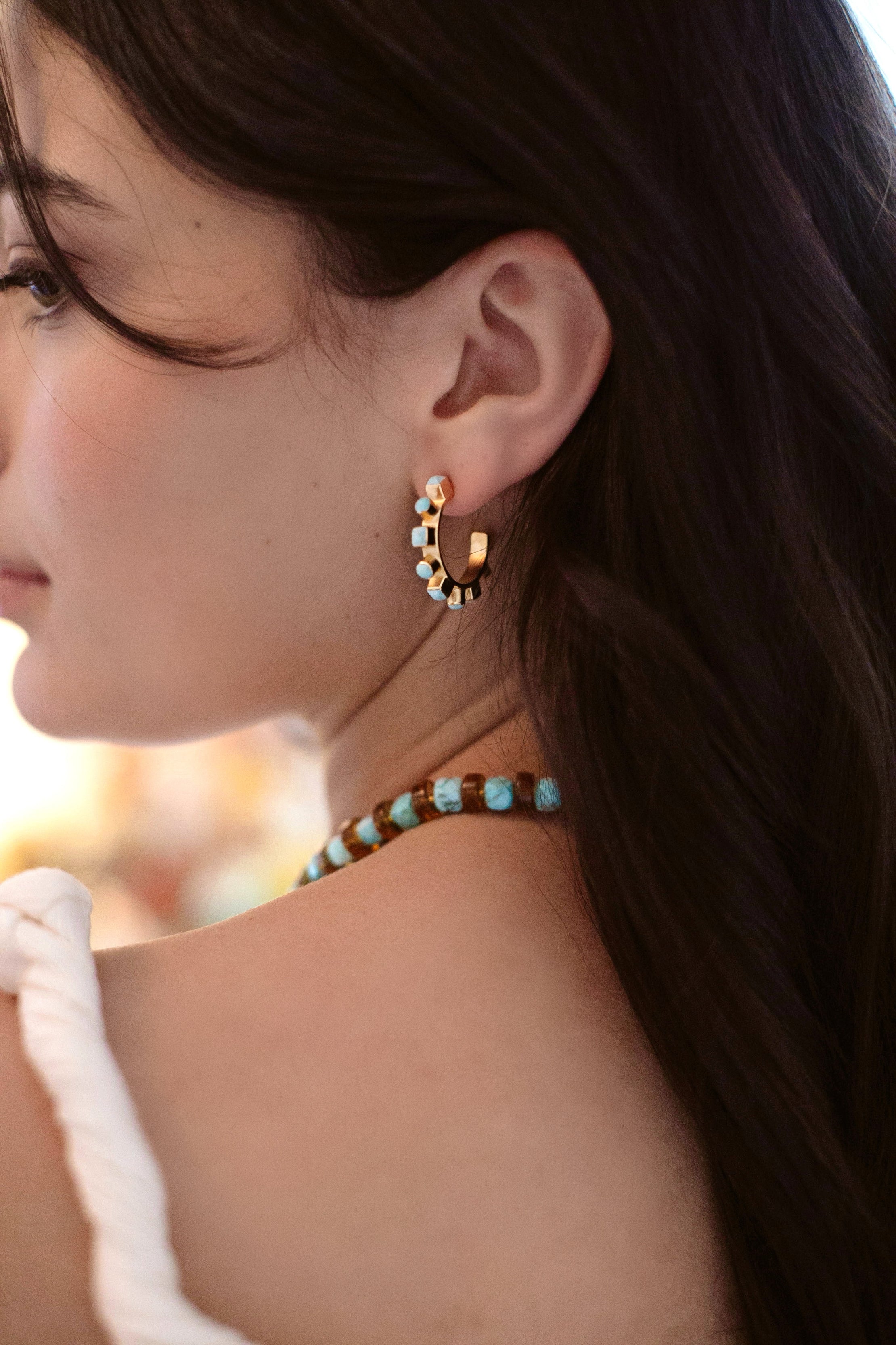 - 24k gold plated sterling hoops featuring turquoise cabochons on sterling silver hypoallergenic posts