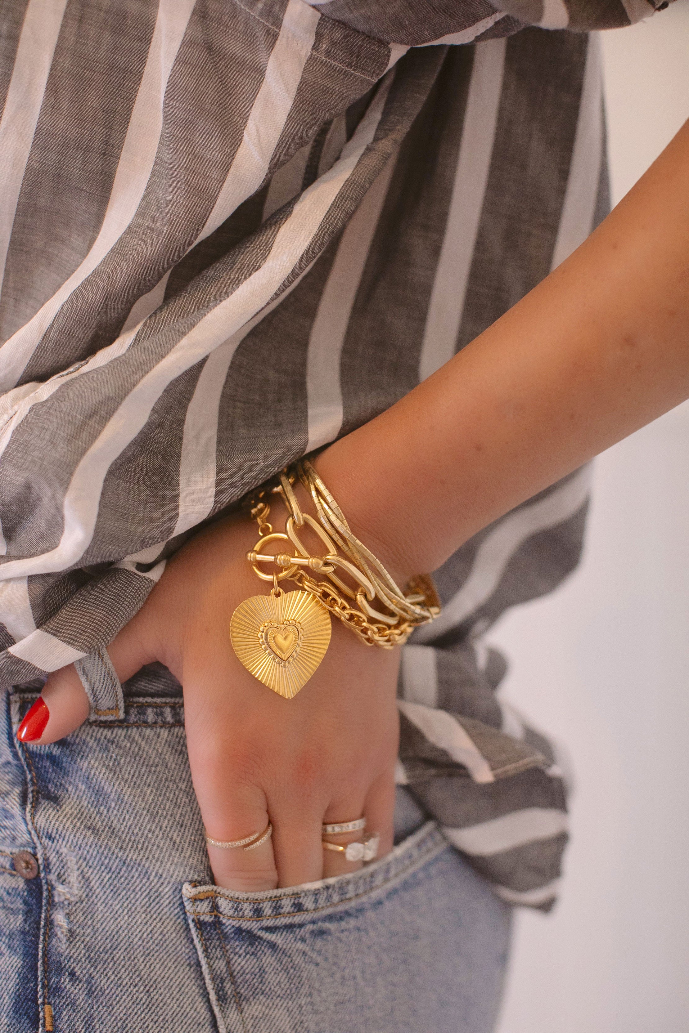 - A 24k antique gold plated brass heart medallion hangs from a 24k antique gold plated brick chain