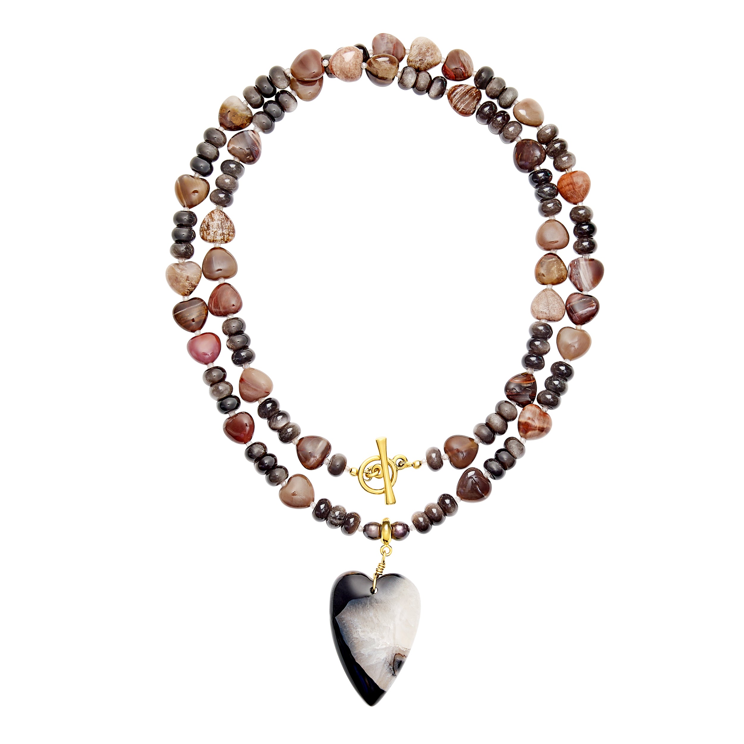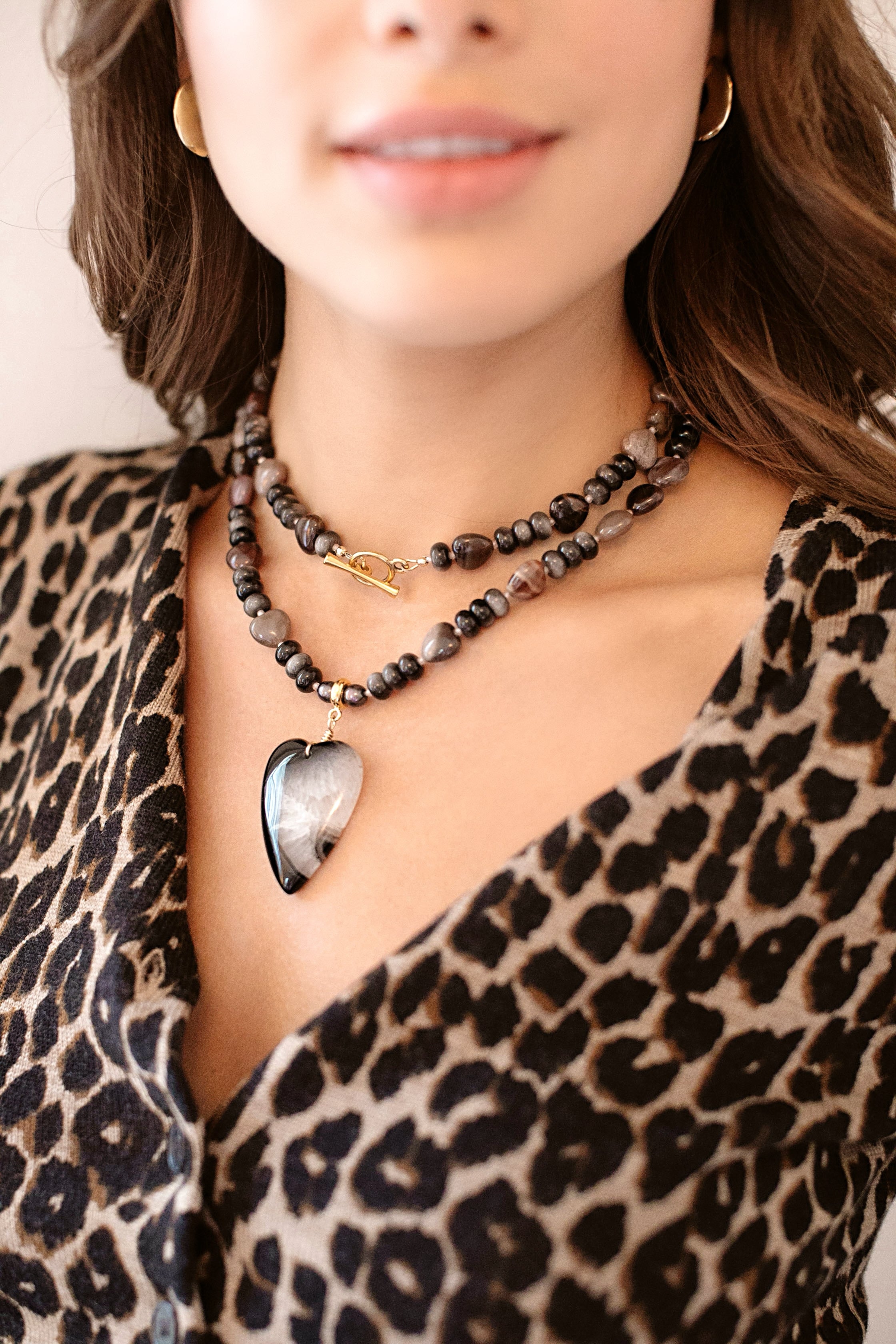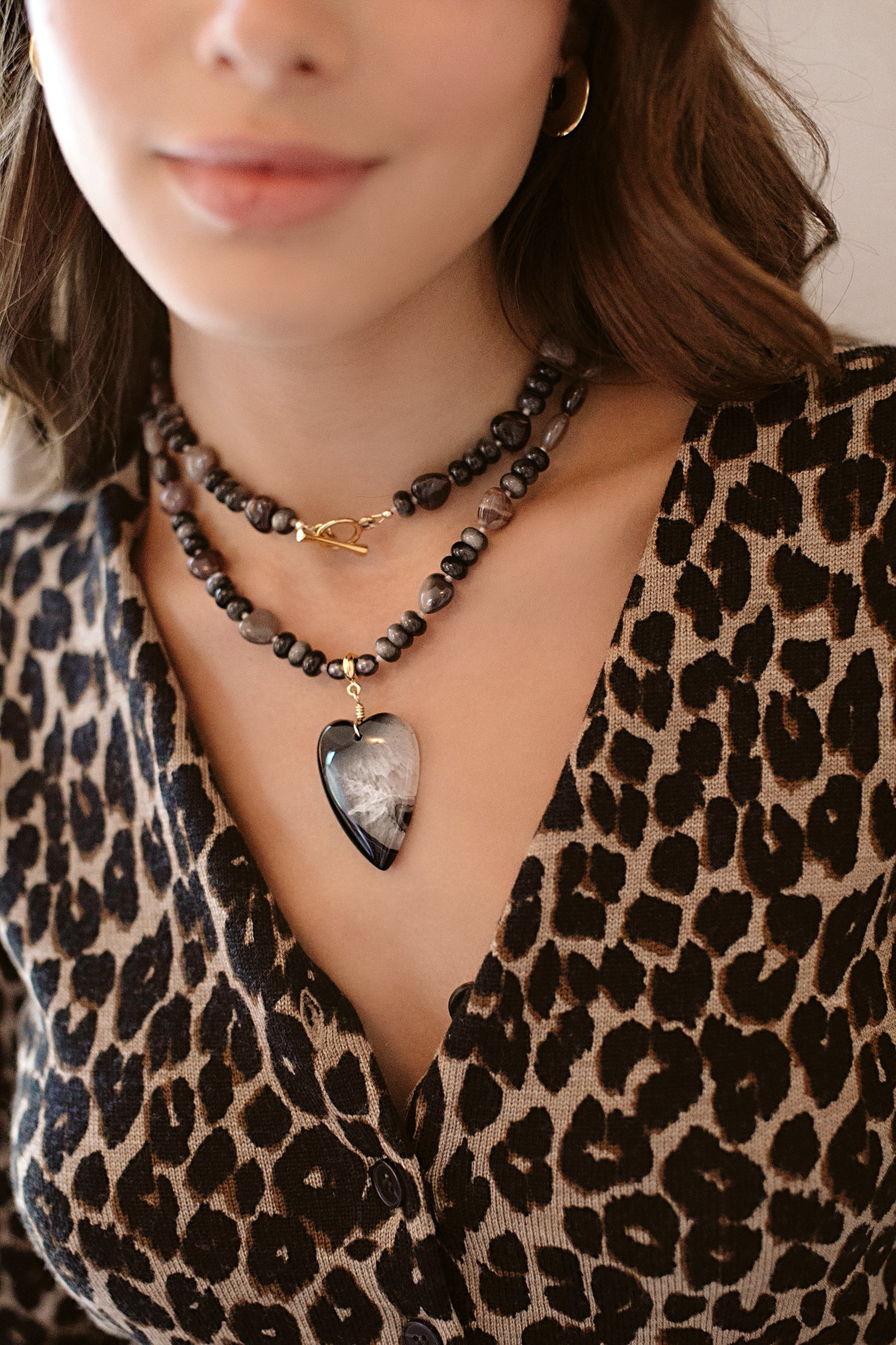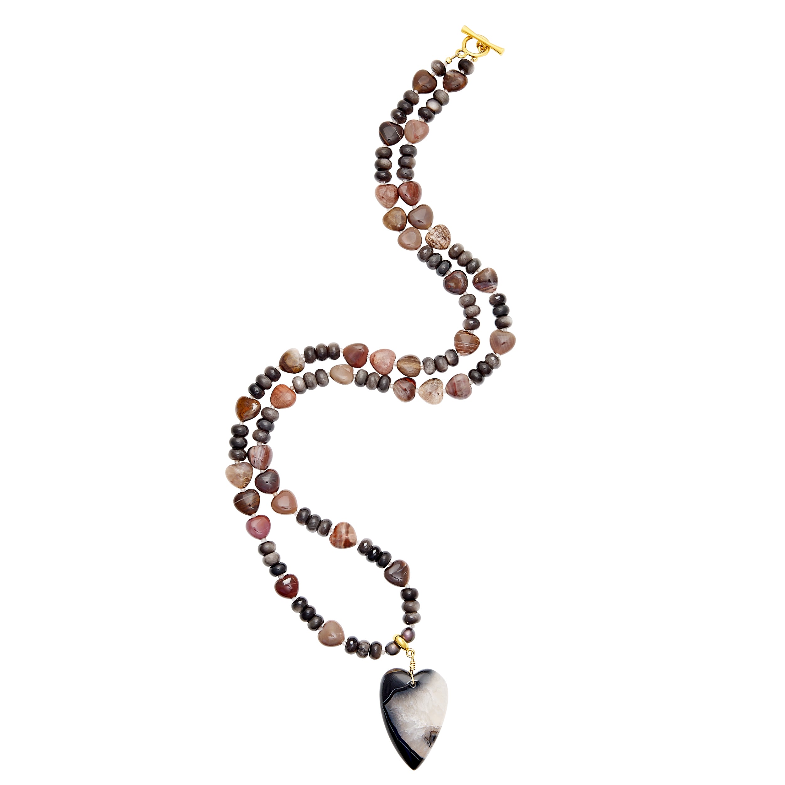 - A strand of black obsidian rondelle beads and petrified wood hearts adorned with a black agate and crystal quartz heart