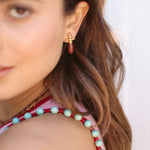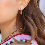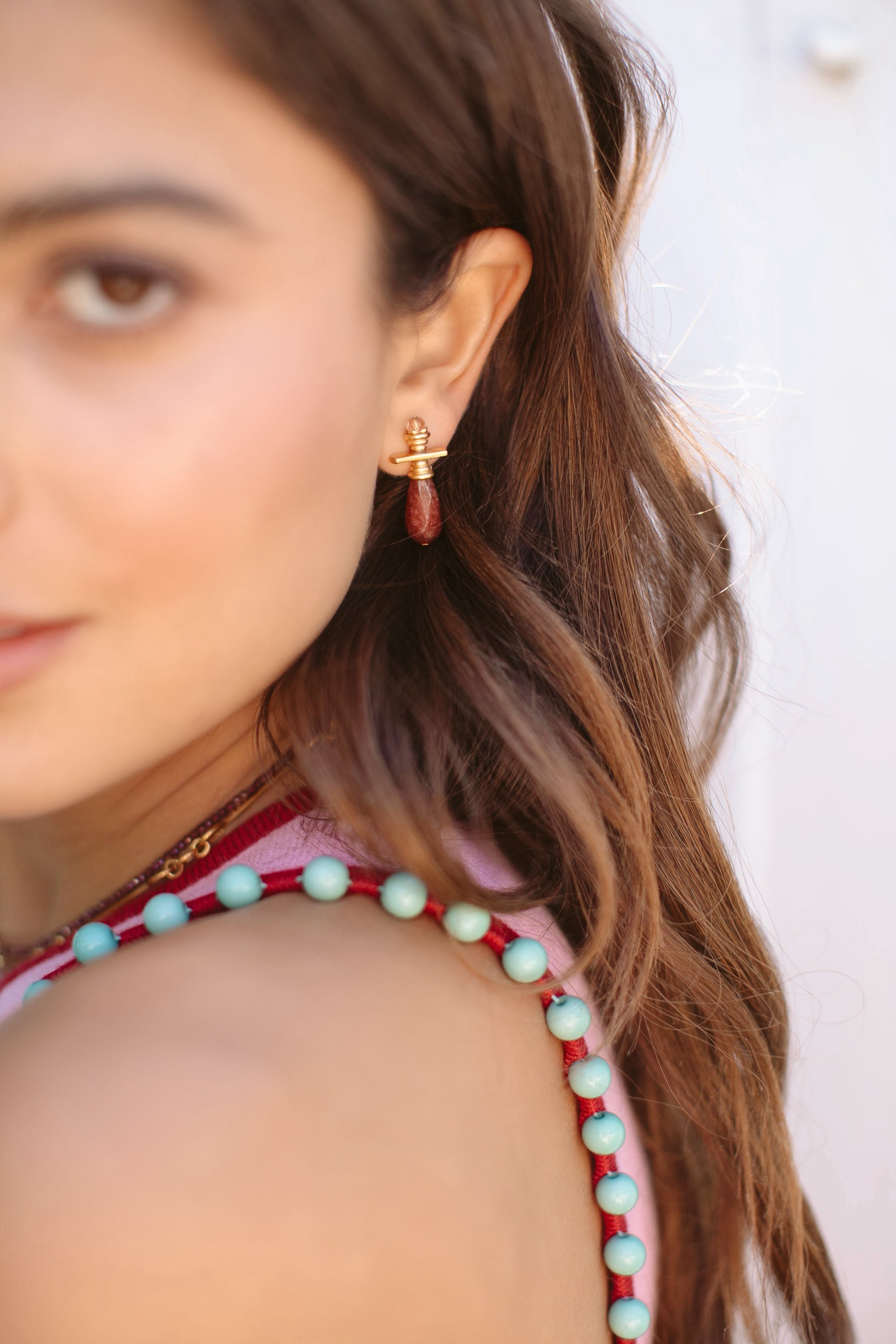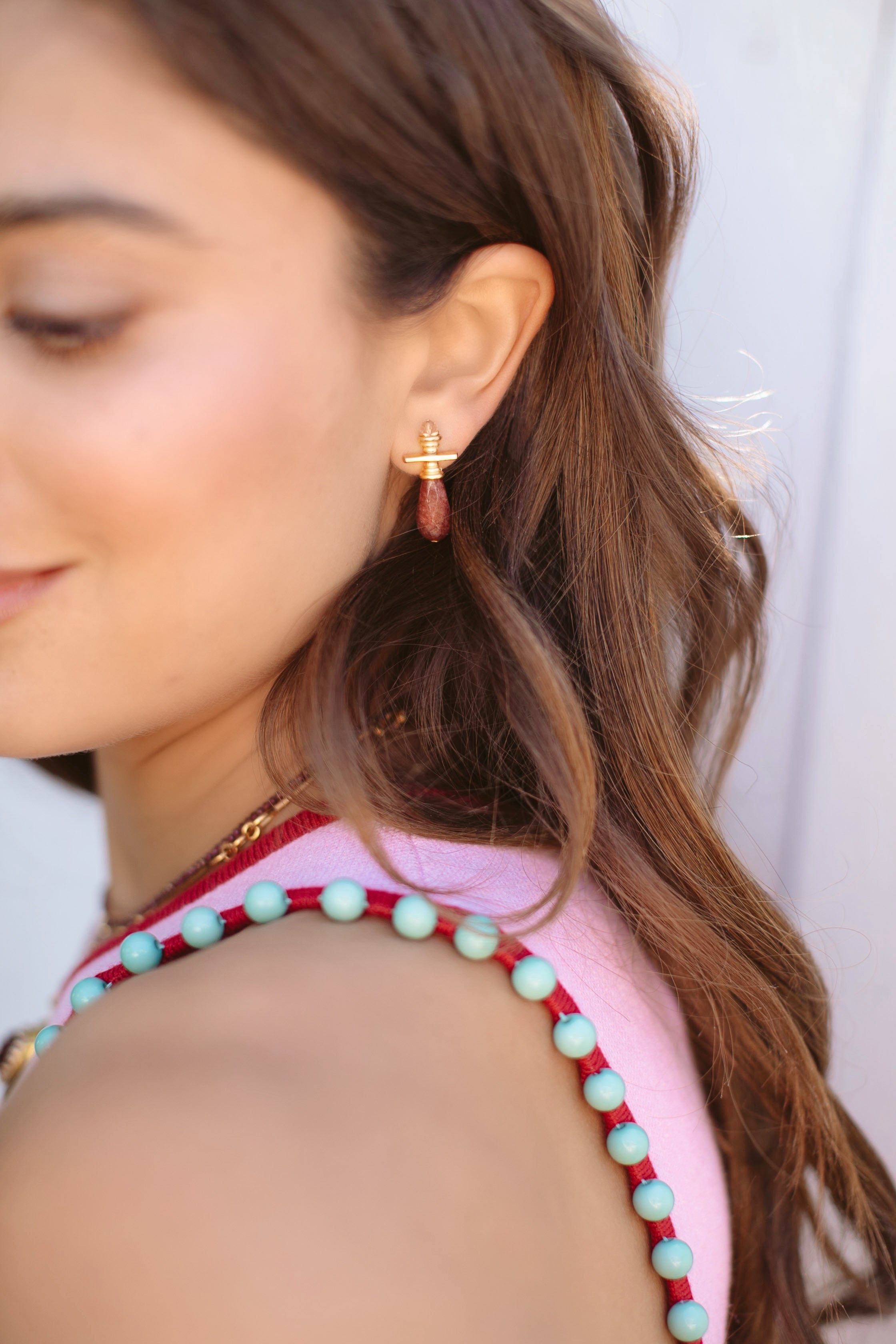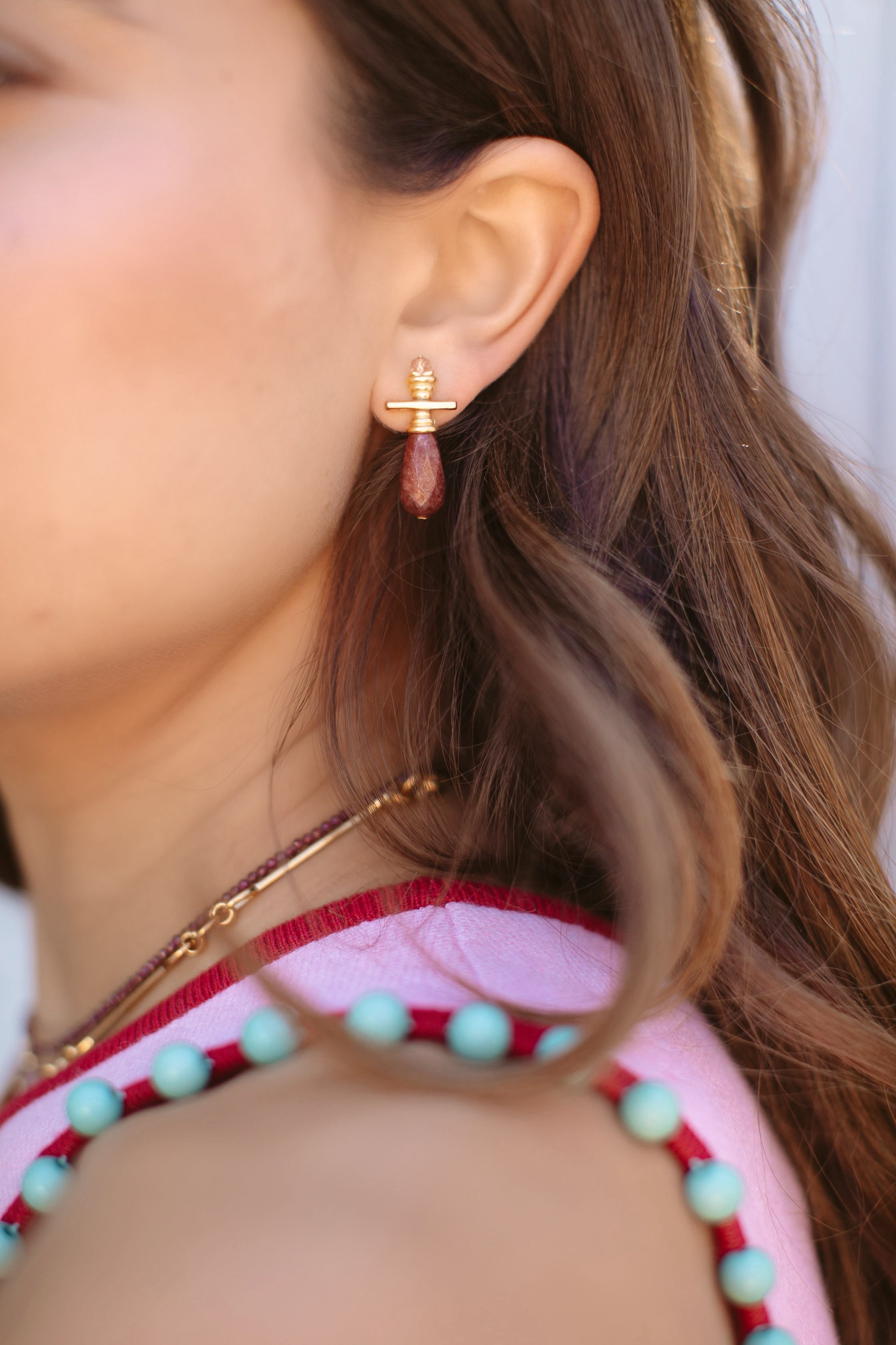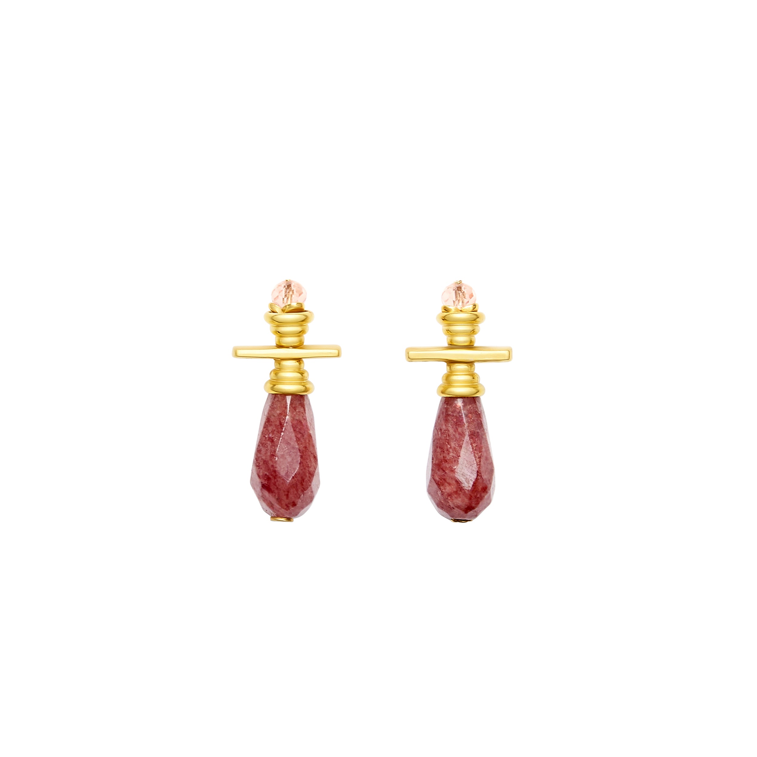 - 24k antique gold plated bar posts featuring a faceted strawberry quartz teardrop and a rose quartz bead